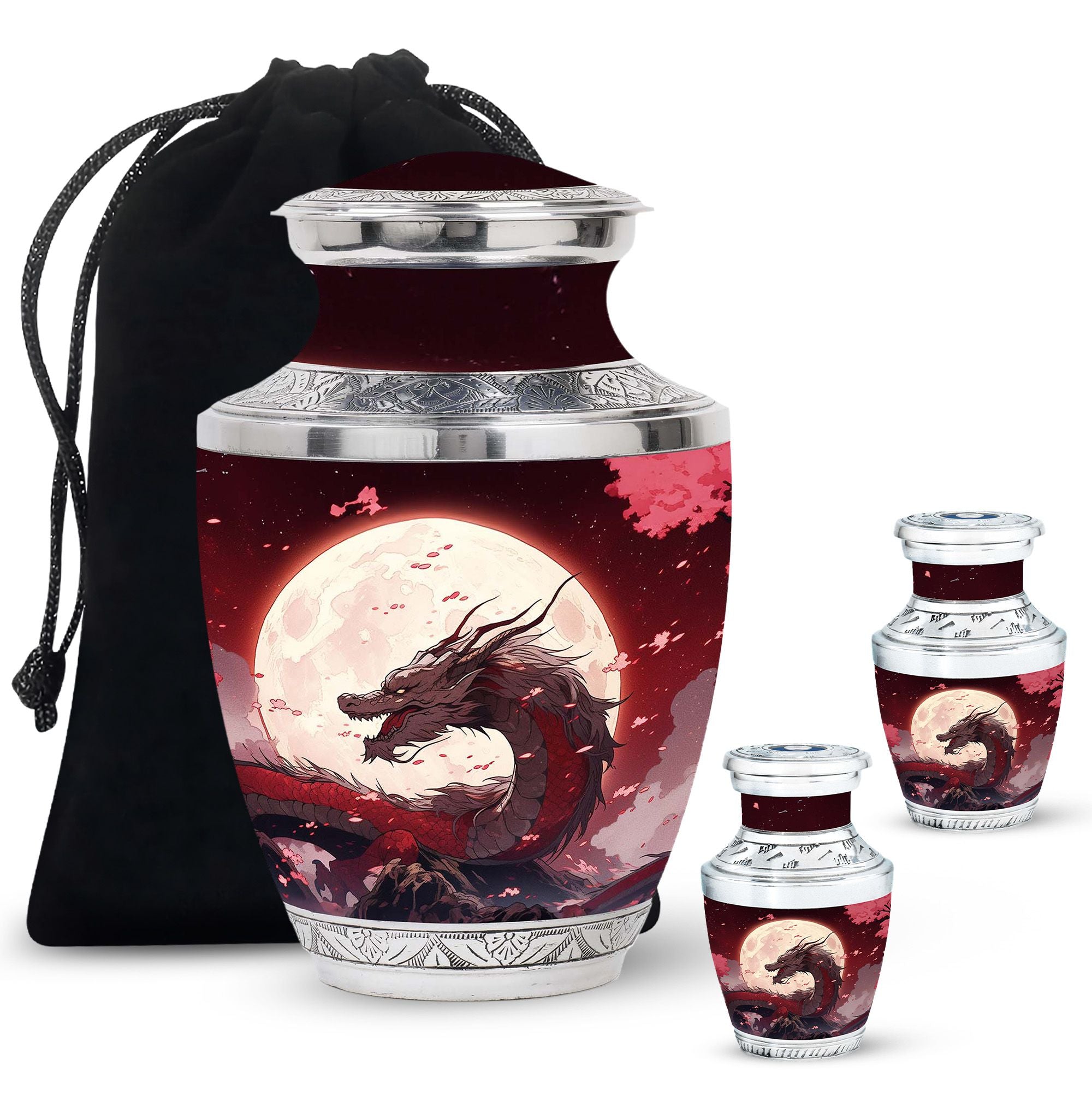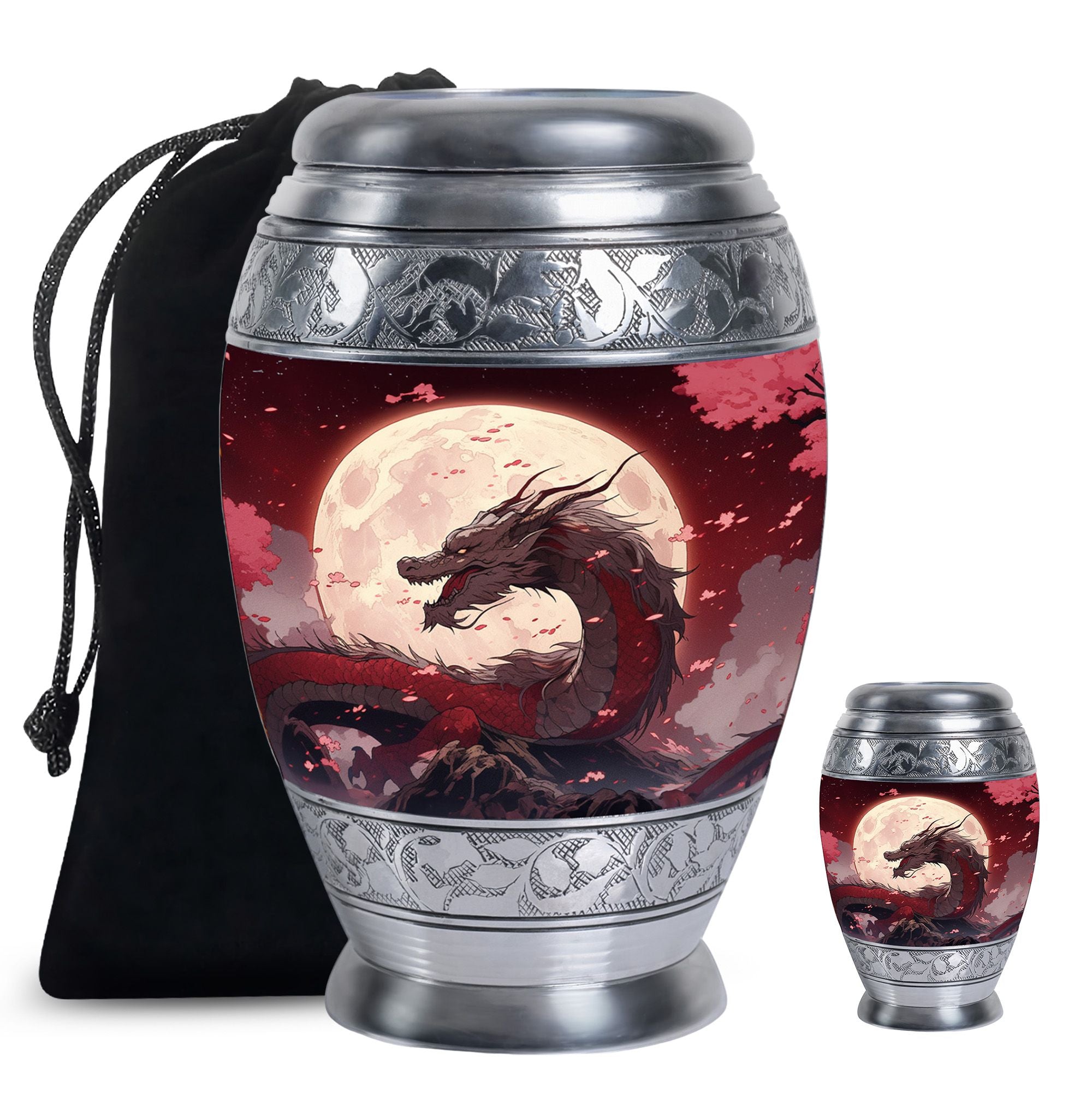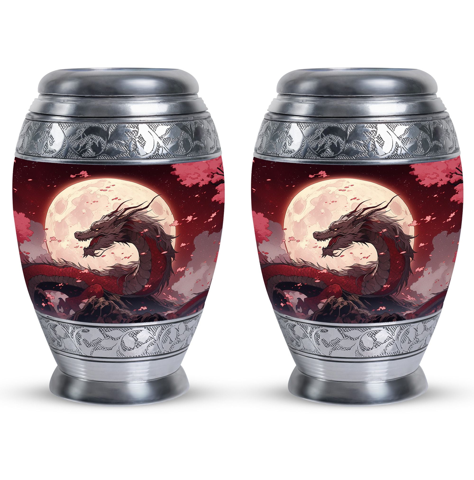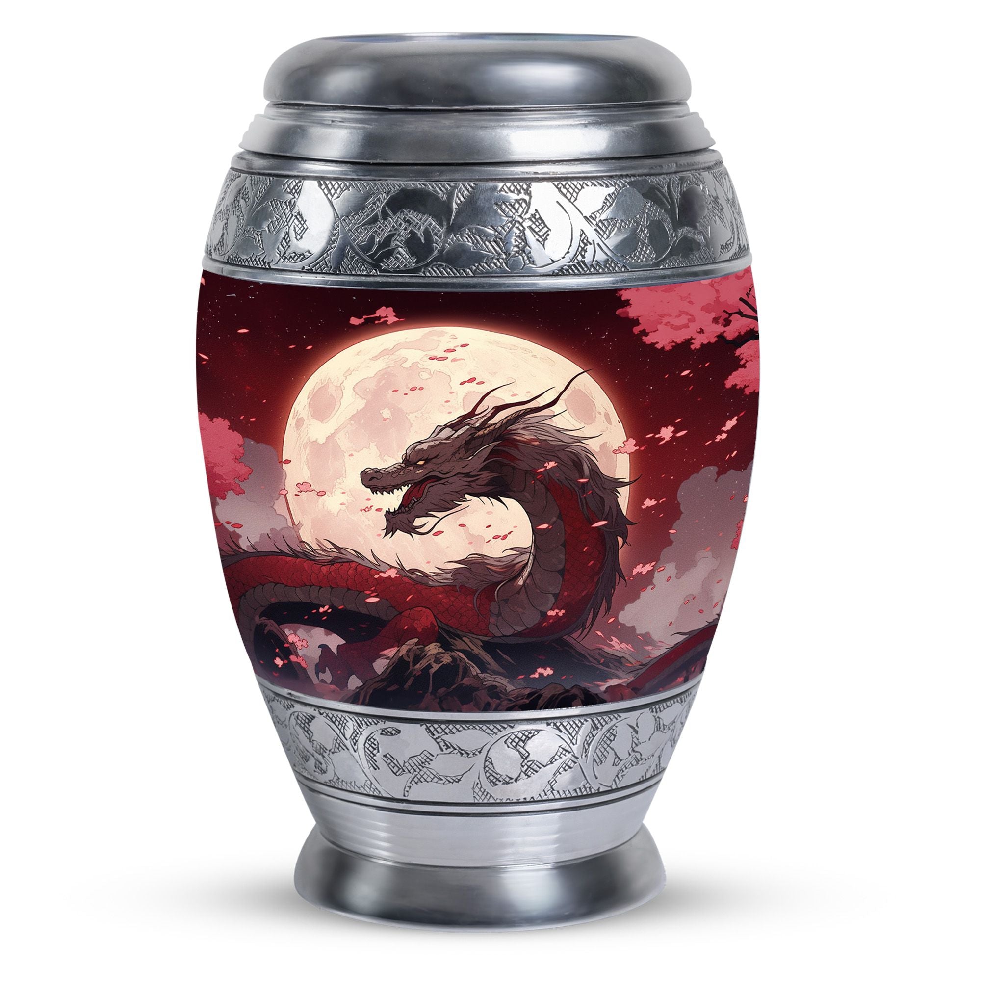 Designed with exquisite craftsmanship, this large decorative urn showcases a majestic dragon circling a glowing moon — a representation of strength guarding serenity. Made from durable aluminium, it ensures long-lasting protection for your loved one’s remains. This cremation urn large adult piece serves as both a memorial and a striking piece of art, suitable for home display or burial.