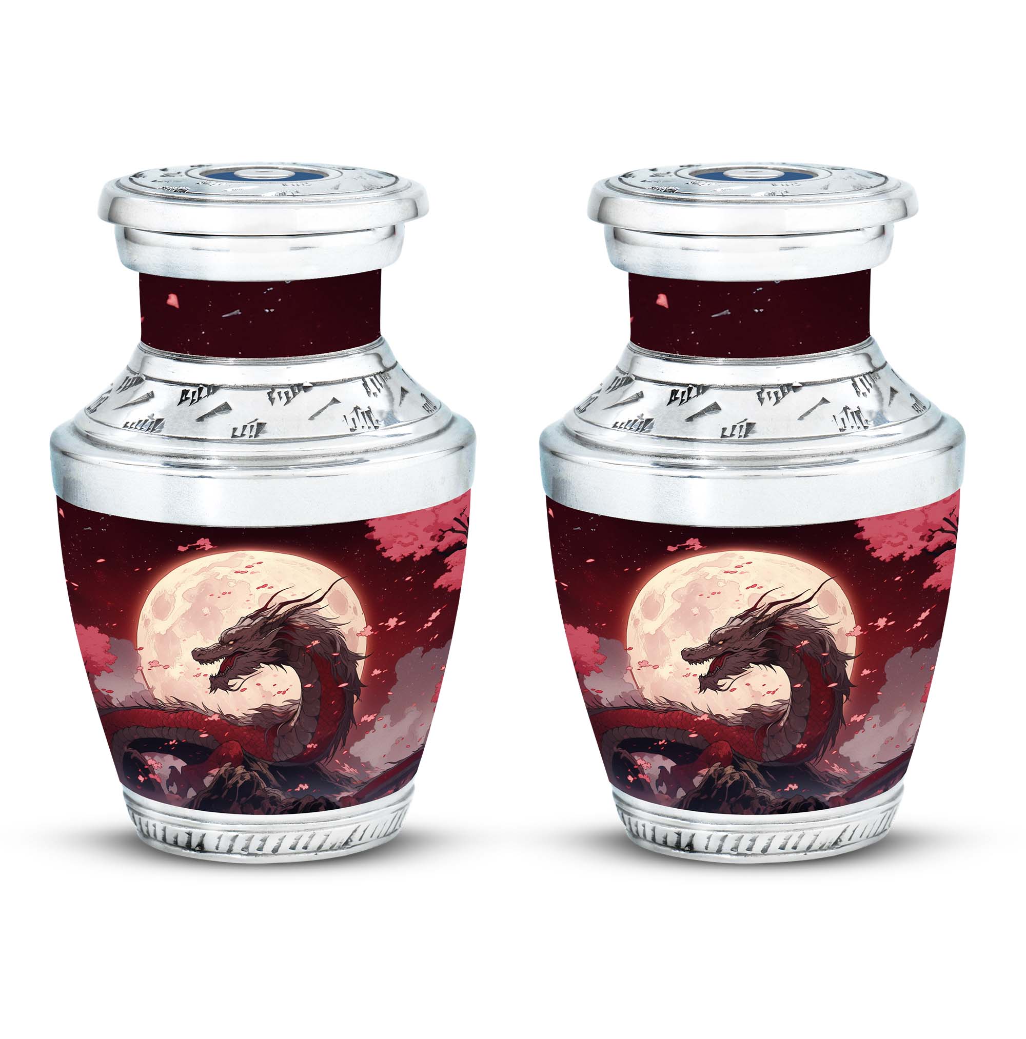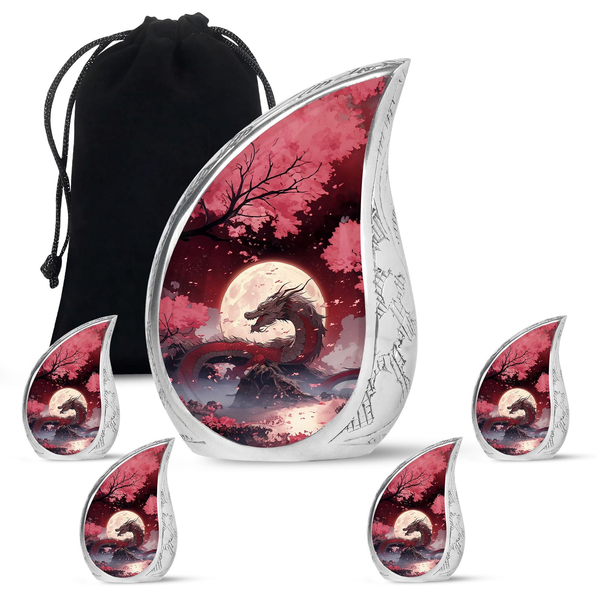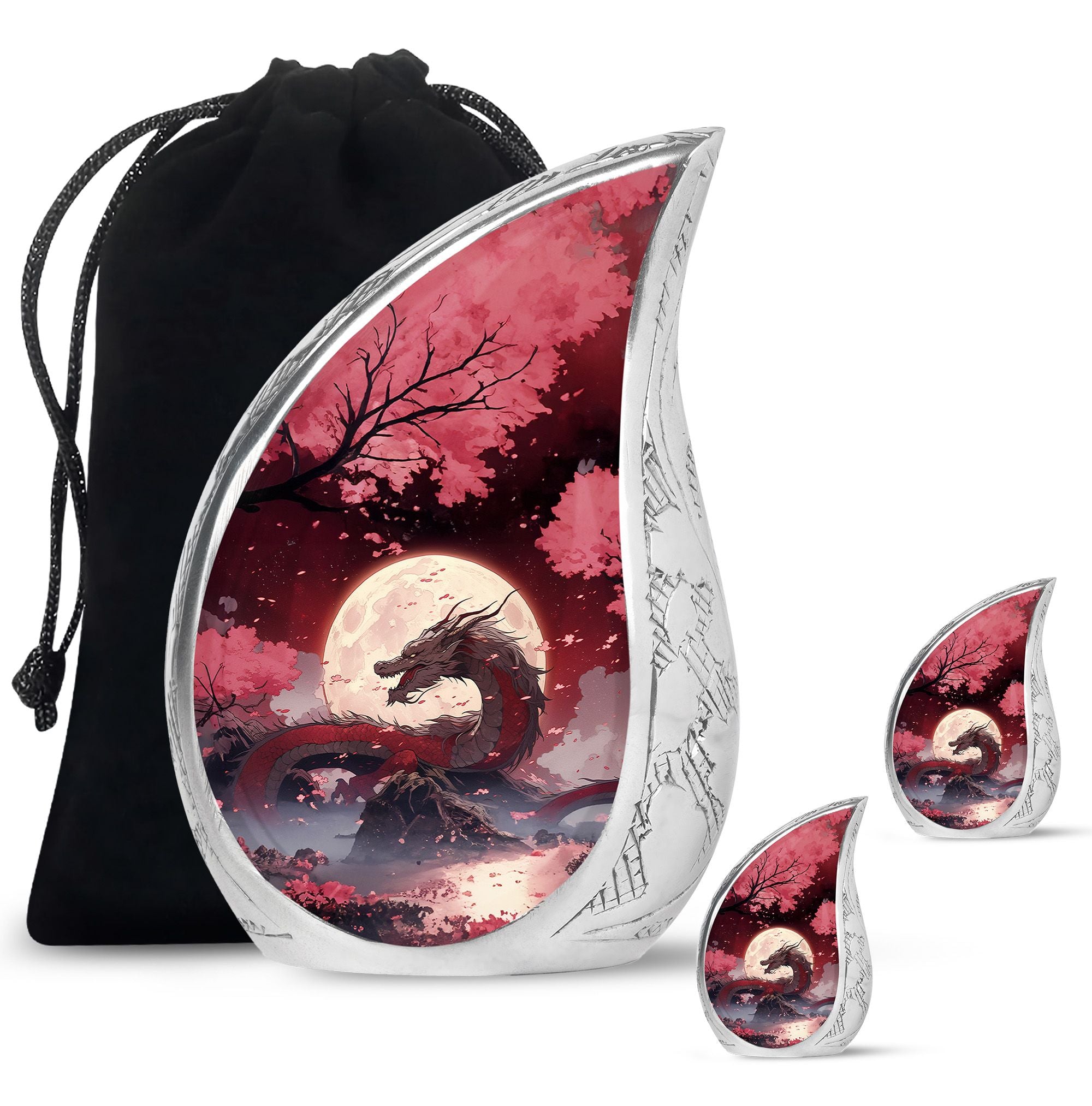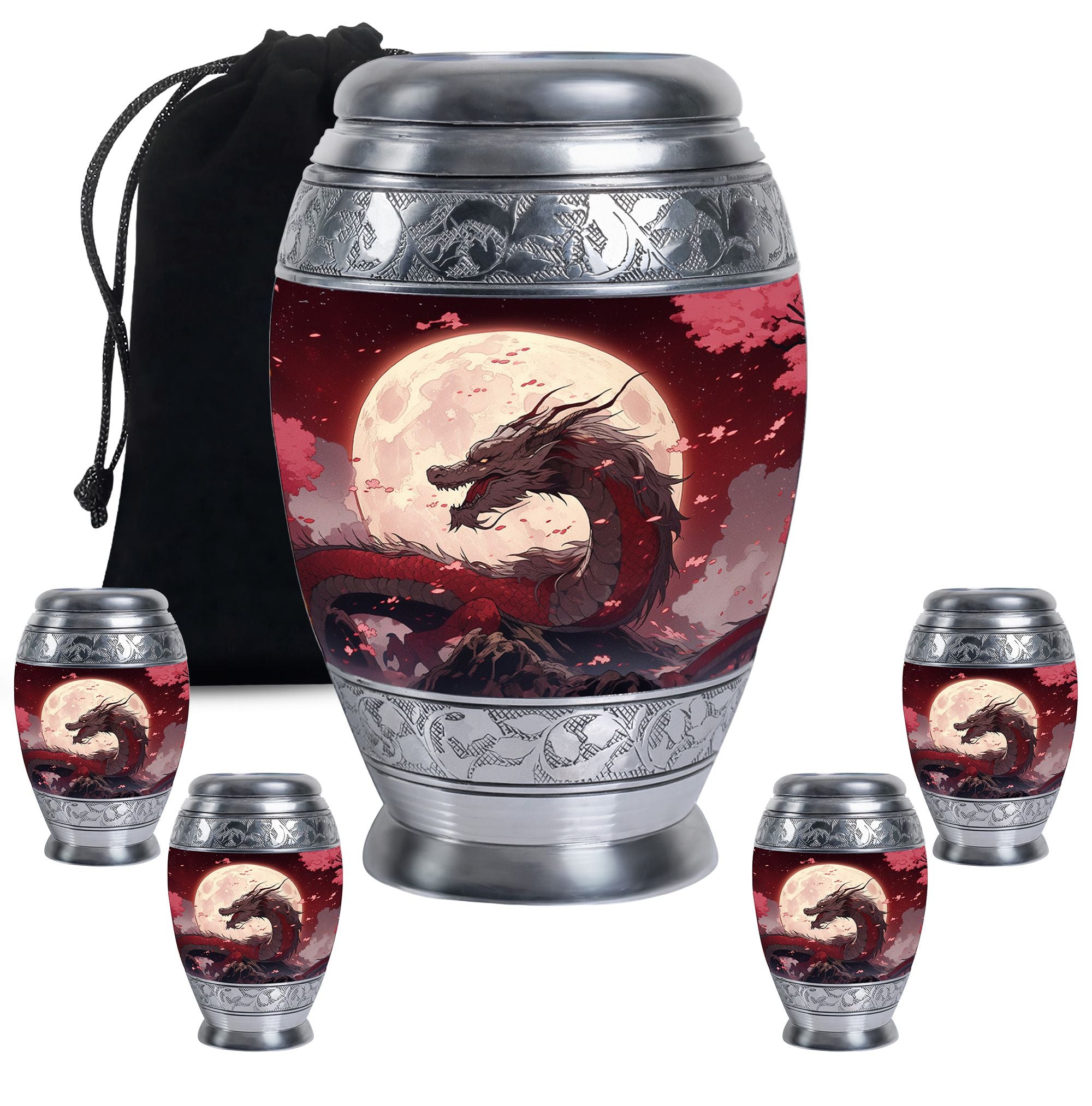 Designed with exquisite craftsmanship, this large decorative urn showcases a majestic dragon circling a glowing moon — a representation of strength guarding serenity. Made from durable aluminium, it ensures long-lasting protection for your loved one’s remains. This cremation urn large adult piece serves as both a memorial and a striking piece of art, suitable for home display or burial.