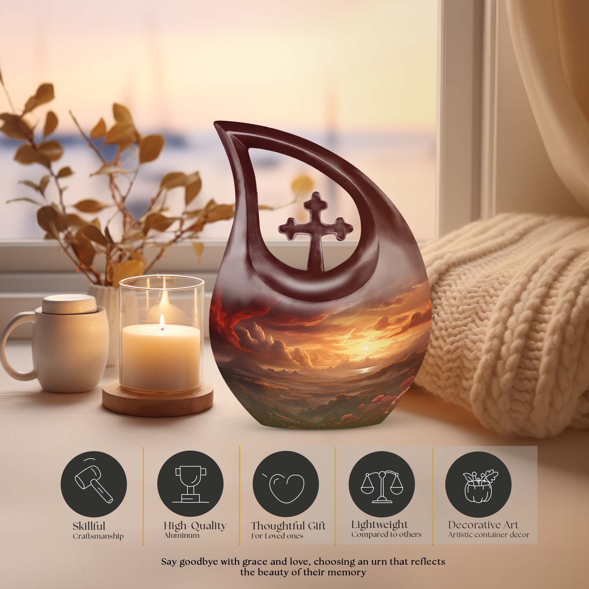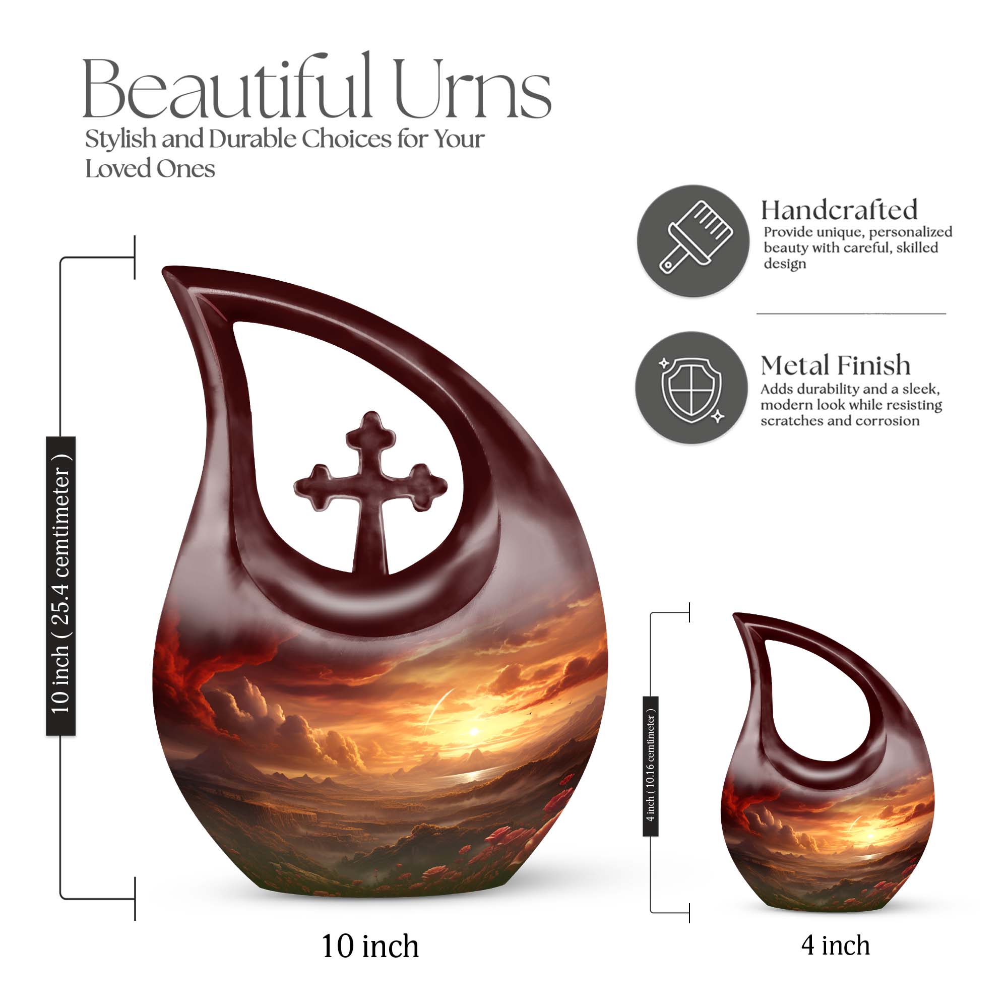 Expertly crafted from durable aluminium, this 10 inch urn features a rich blend of orange and brown sunset tones symbolizing peace, grounding, and everlasting light. Its polished surface and secure screw-top lid ensure long-lasting protection, making it ideal for families wanting a dependable urn for human ashes adult women, cremation urns for adult ashes women, or a versatile urn for women & men memorial. The warm gradient and classic silhouette complement any remembrance space, whether displayed at home, used in a ceremony, or chosen for burial.