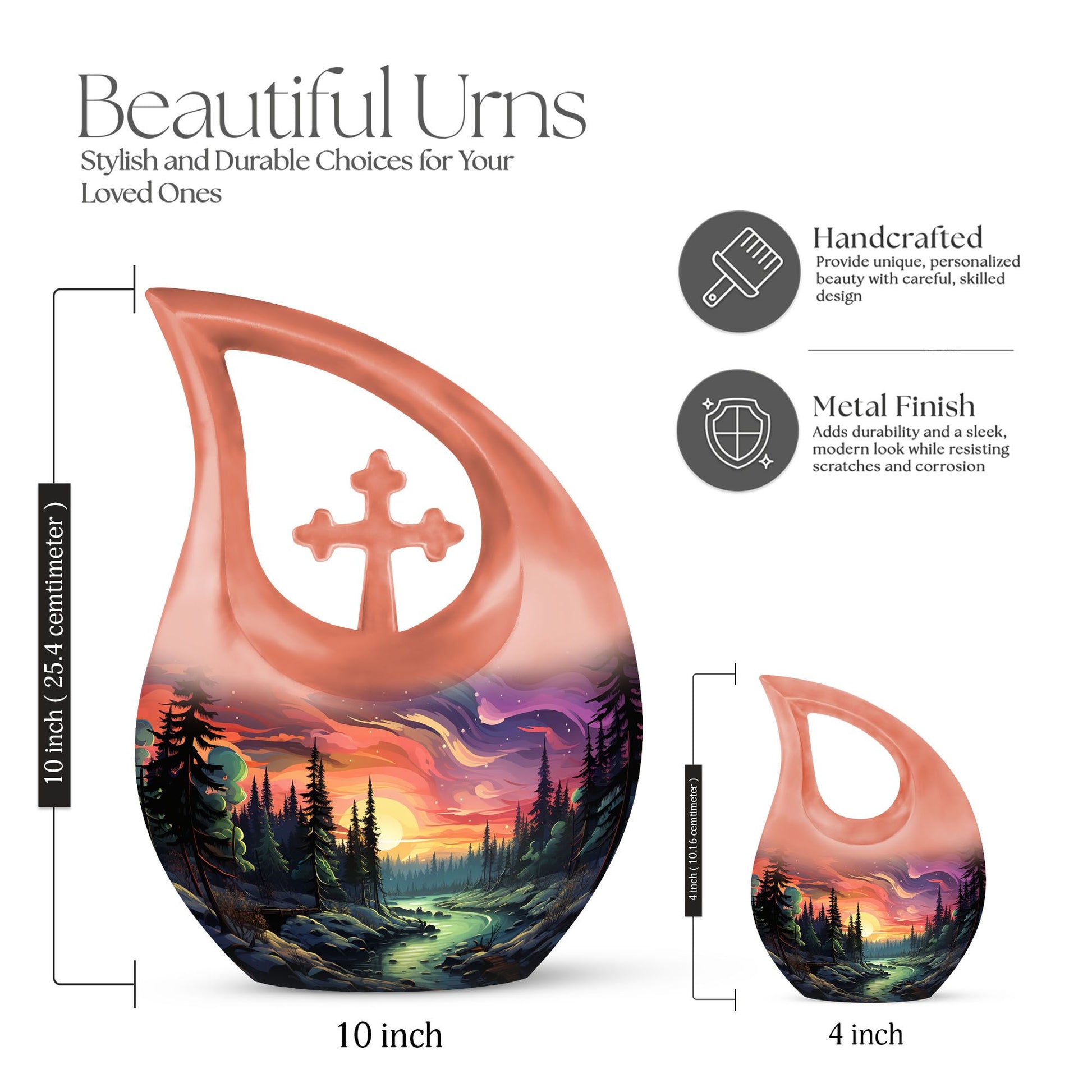 Crafted from premium-grade aluminium, this urn exemplifies fine craftsmanship and long-lasting durability. Its vibrant forest landscape represents the peaceful passage of life, while the soft hues of sunset bring warmth to the heart. Ideal for urns adult male dad or urns for human ashes male, this design blends artistry and compassion. The secure screw-top lid ensures that ashes are safely preserved, making it a perfect choice for funeral urns for human ashes that reflect respect and serenity.
