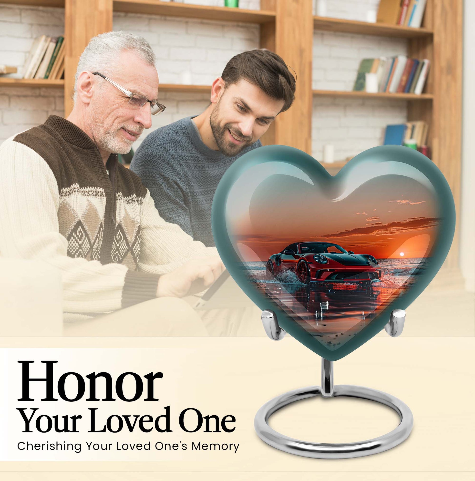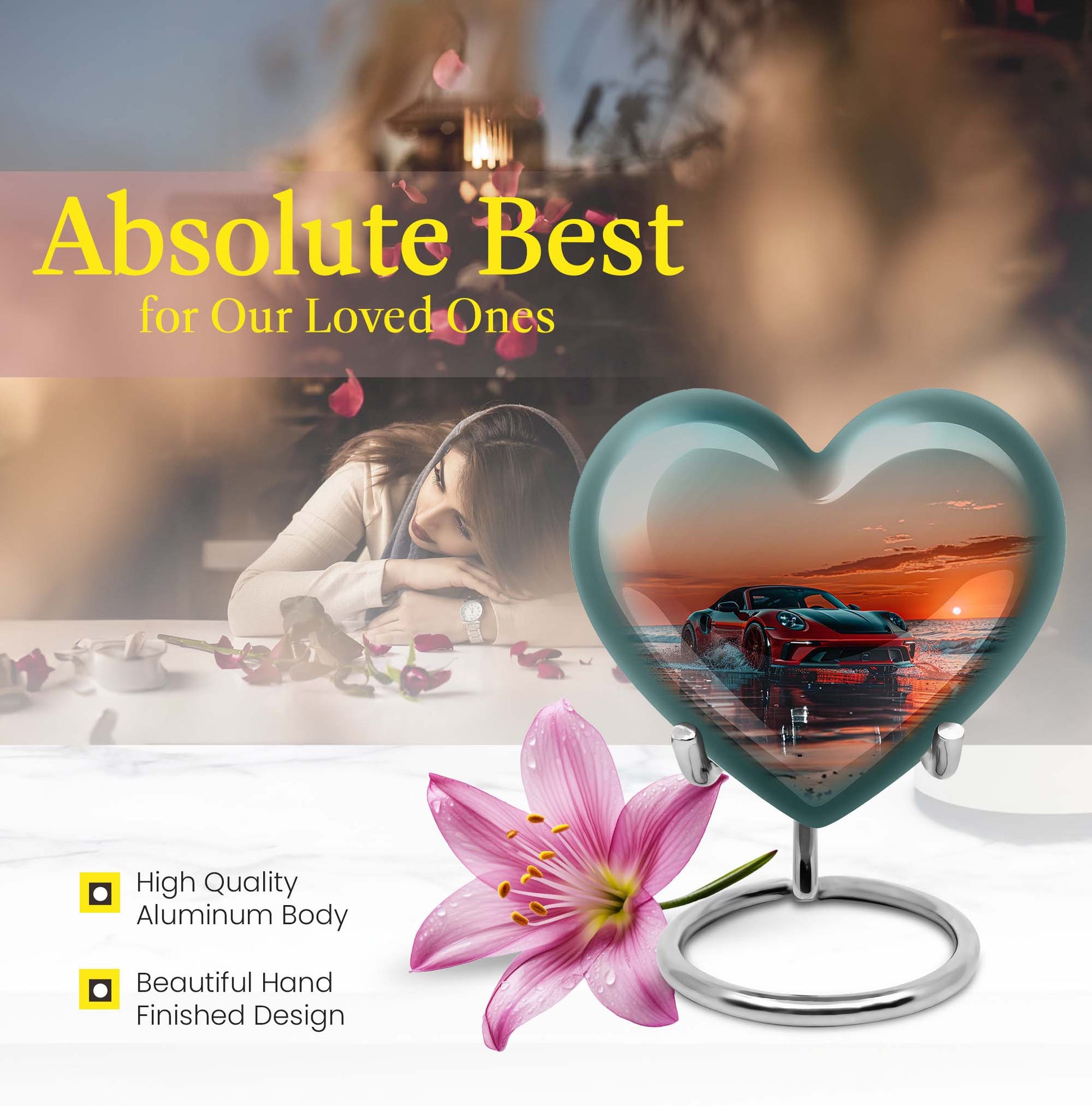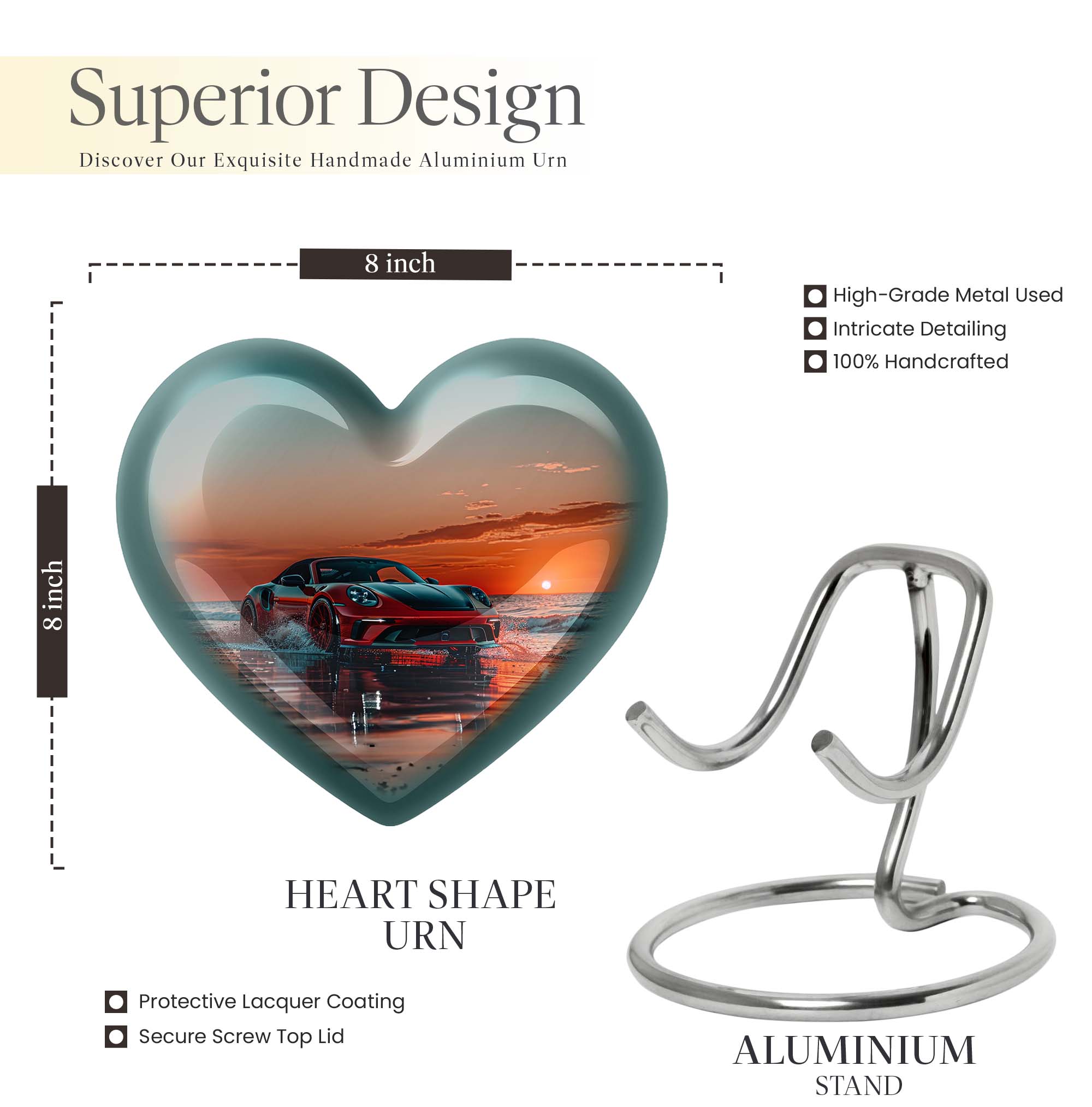 Discover the perfect tribute to a loved one with our uniquely designed Heart Urn. This outstanding piece, measuring 10 inches in height, is designed to preserve the memory of your dearly departed. Thanks to its generous 200 cubic inches capacity, it's ideal for storing the remains of adults and seniors. Crafted from robust aluminum, this urn not only offers a solid and secure containment for the ashes but is also elegant and refined in its aesthetic. The urn's Car At Beach theme adds a soft, peaceful touch evoking the freedom and beauty of a life well-lived. Add a personal note to the urn by engraving names - a beautiful way to cherish your memory of them. The package comes with a velvet pouch, designed for respectful and dignified containment of the ashes. Keywords that best describe this product are 'car Urn', 'cremation large urn', 'memorial urns', 'Burial ashes urn', 'human ash urns', 'funeral urns', and 'cremation urn for human ashes'.