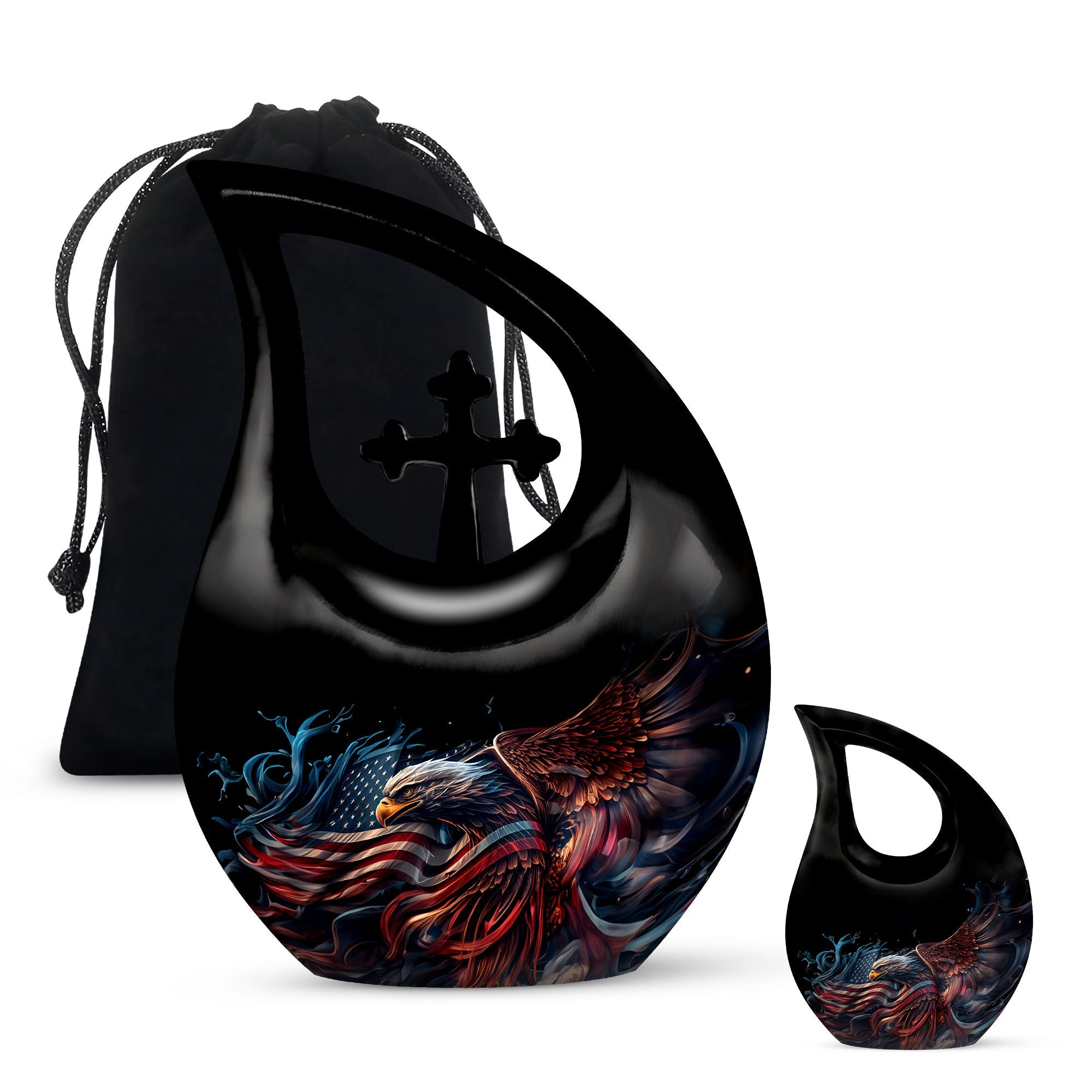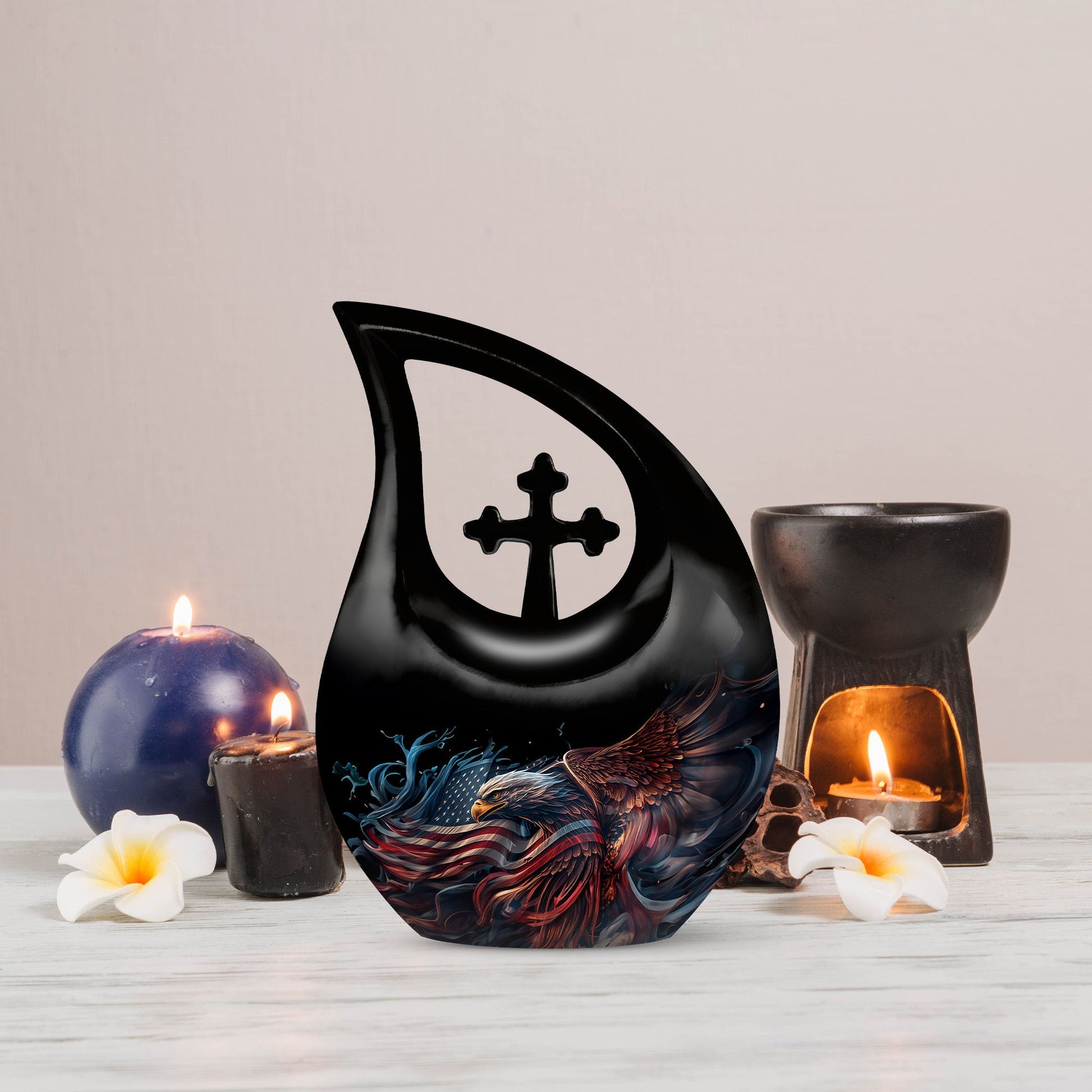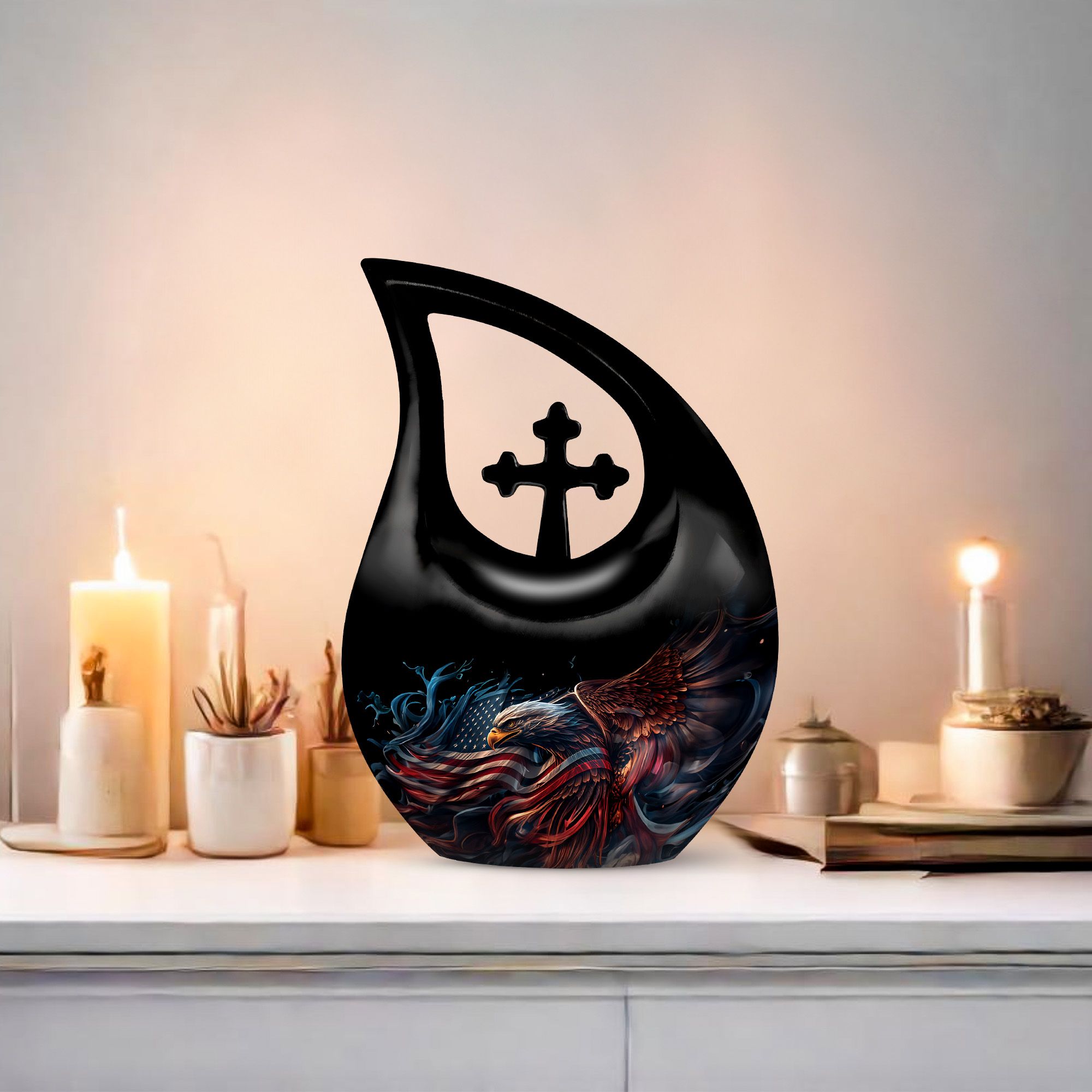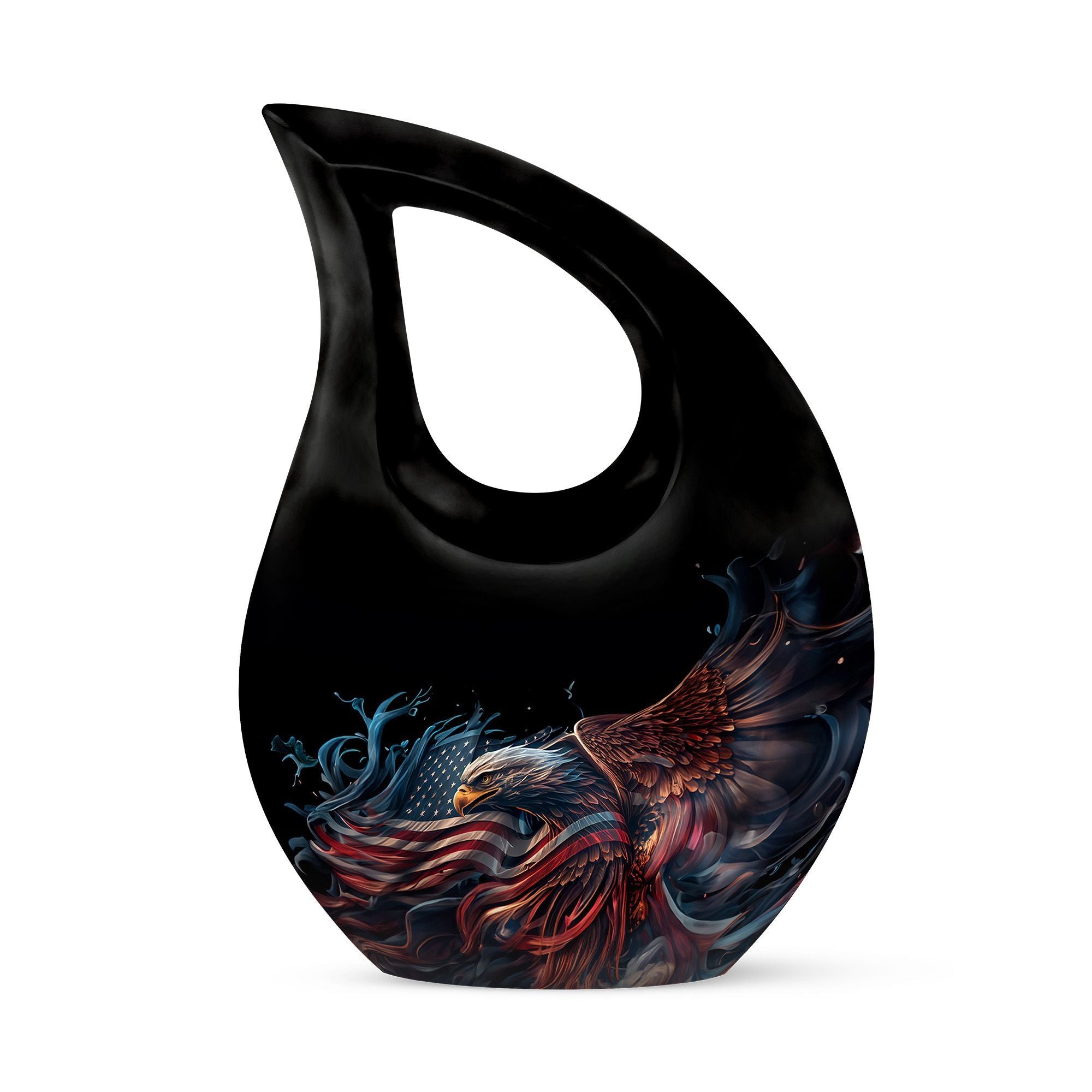 Honor the memory of a loved one who lived with pride, strength, and devotion to country with this Eagle With American Flag Urn For Human Ashes Adult Male. The soaring eagle wrapped in the American flag embodies courage, liberty, and eternal respect. This patriotic urn for adult male serves as a meaningful tribute for fathers, veterans, or any man who cherished his nation and family. Crafted to keep memories alive, it’s a heartfelt way to celebrate a remarkable life well-lived.
