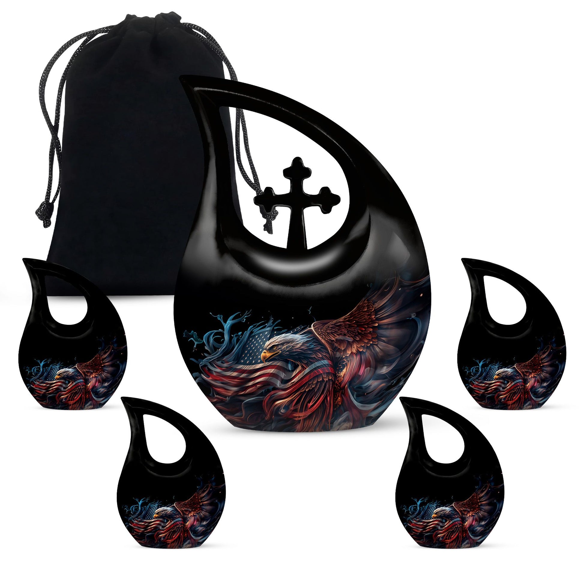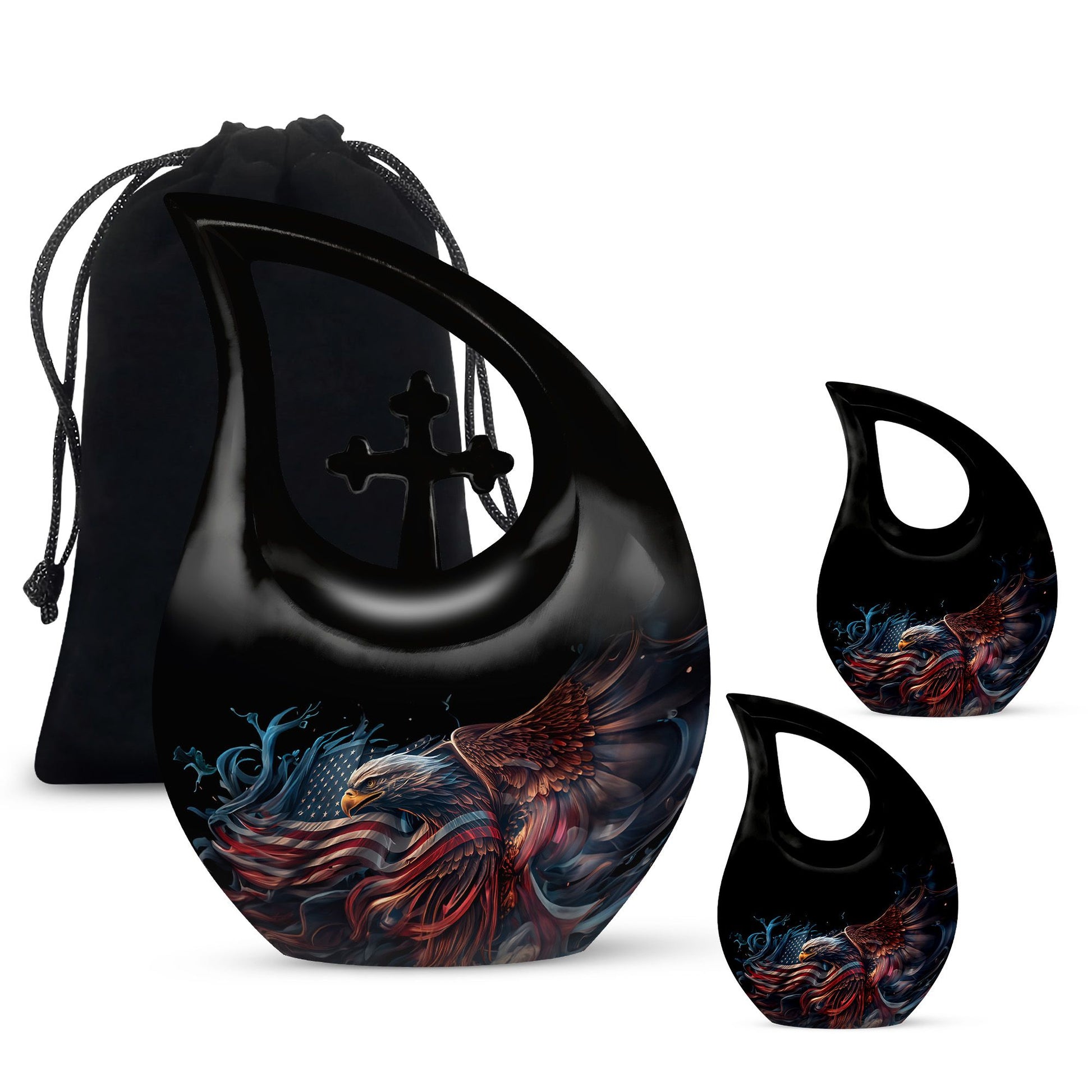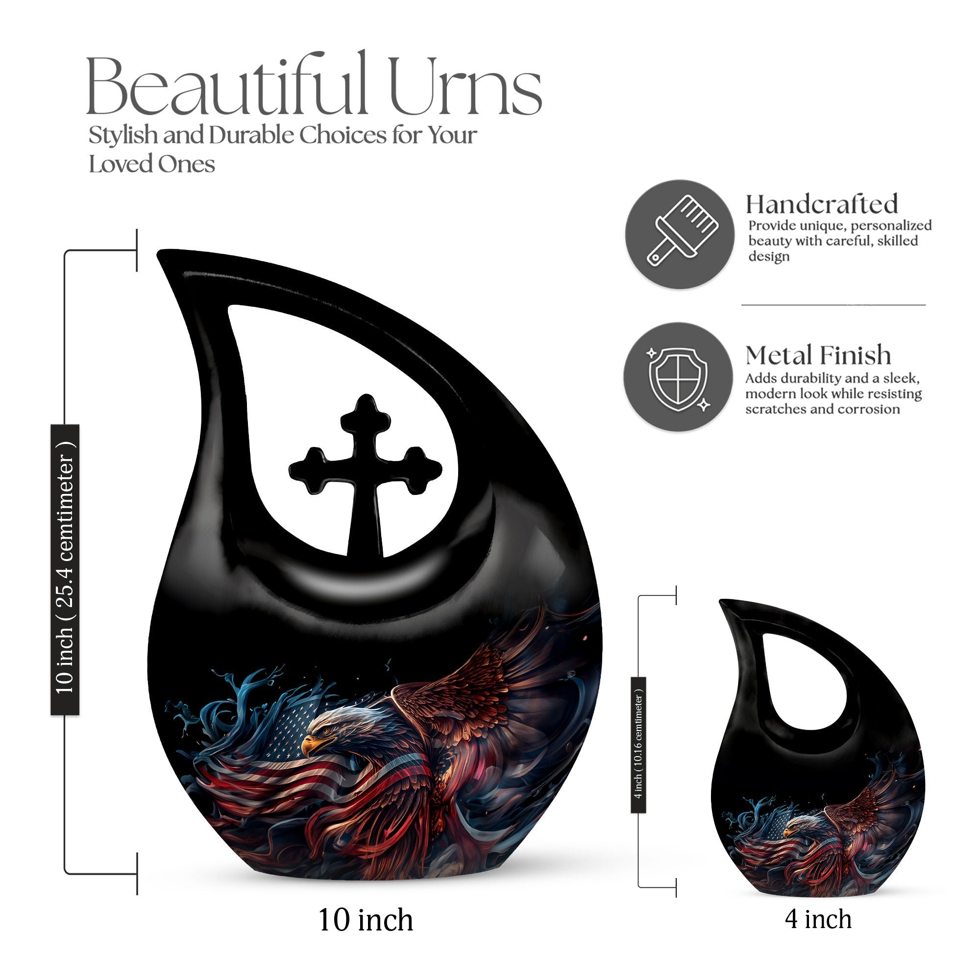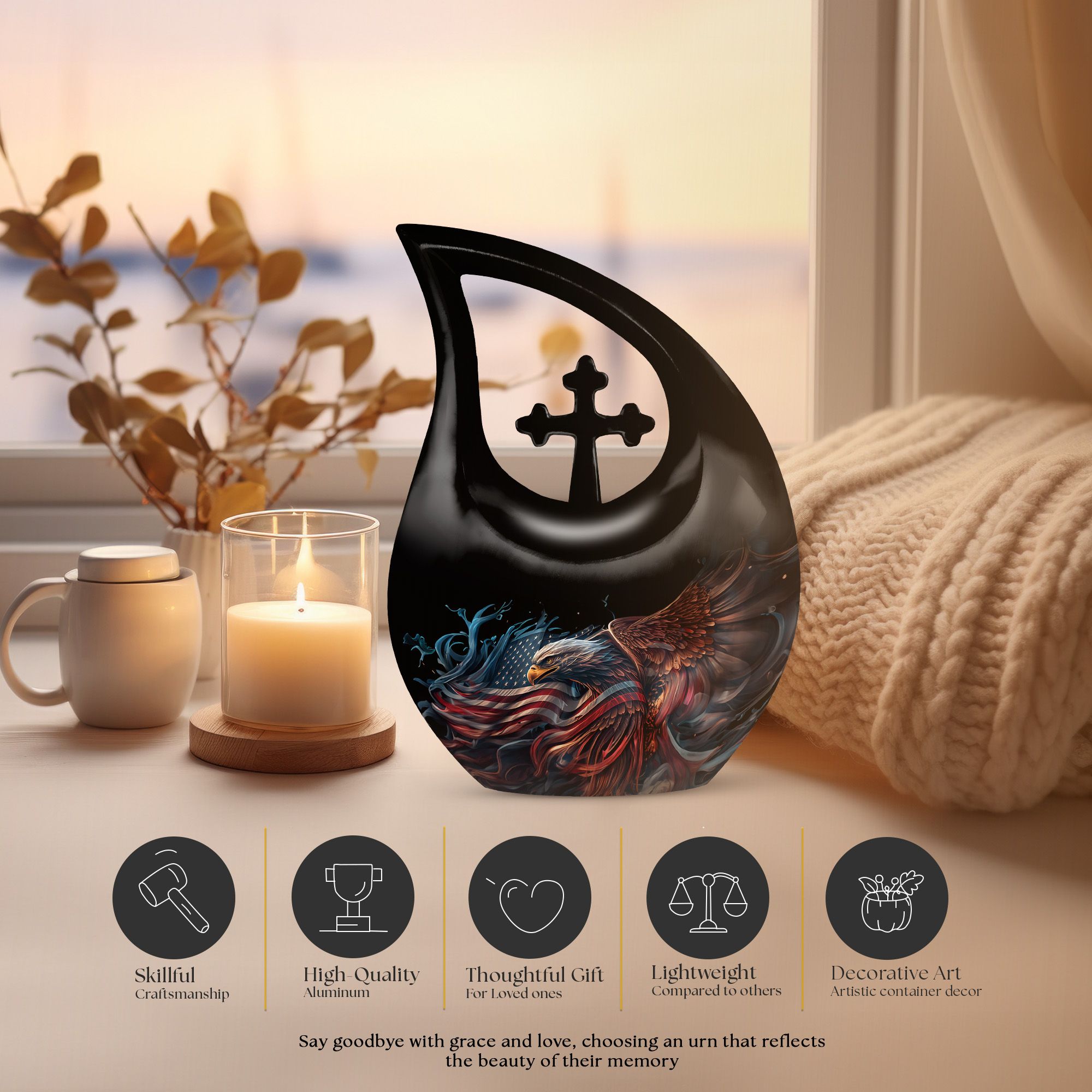 Honor the memory of a loved one who lived with pride, strength, and devotion to country with this Eagle With American Flag Urn For Human Ashes Adult Male. The soaring eagle wrapped in the American flag embodies courage, liberty, and eternal respect. This patriotic urn for adult male serves as a meaningful tribute for fathers, veterans, or any man who cherished his nation and family. Crafted to keep memories alive, it’s a heartfelt way to celebrate a remarkable life well-lived.