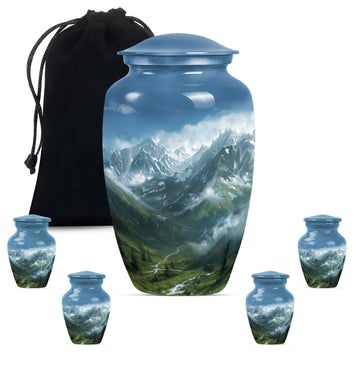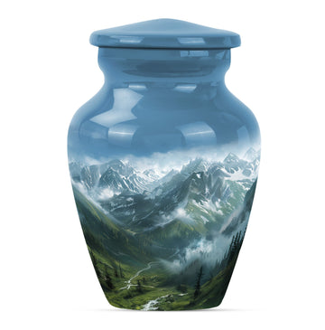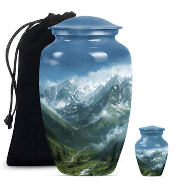 Paying tribute to a departed loved one feels exceptionally heartfelt with our 'Mountains Urn', from our funeral burial urns collection. Carefully crafted from durable aluminium, this large urn stands 10 inches in height and is substantial, weighing in at 3.3 pounds. It possesses a stately presence and a comforting weight. Our classic urn is designed to securely hold up to 200 cubic inches of ashes. This cremation urn effortlessly combines practicality with sentimentality through its 'Purple Meadow' theme, illustrating serenity and peace. Your purchase includes a velvet pouch, adding an extra layer of protection for your loved one's ashes. The urn provides an option to engrave names, offering a more personalized touch. Please note, the 'Mountains Urn' is one of our memorial large urns for human ashes, effortlessly balancing elegance and durability for a lasting tribute.