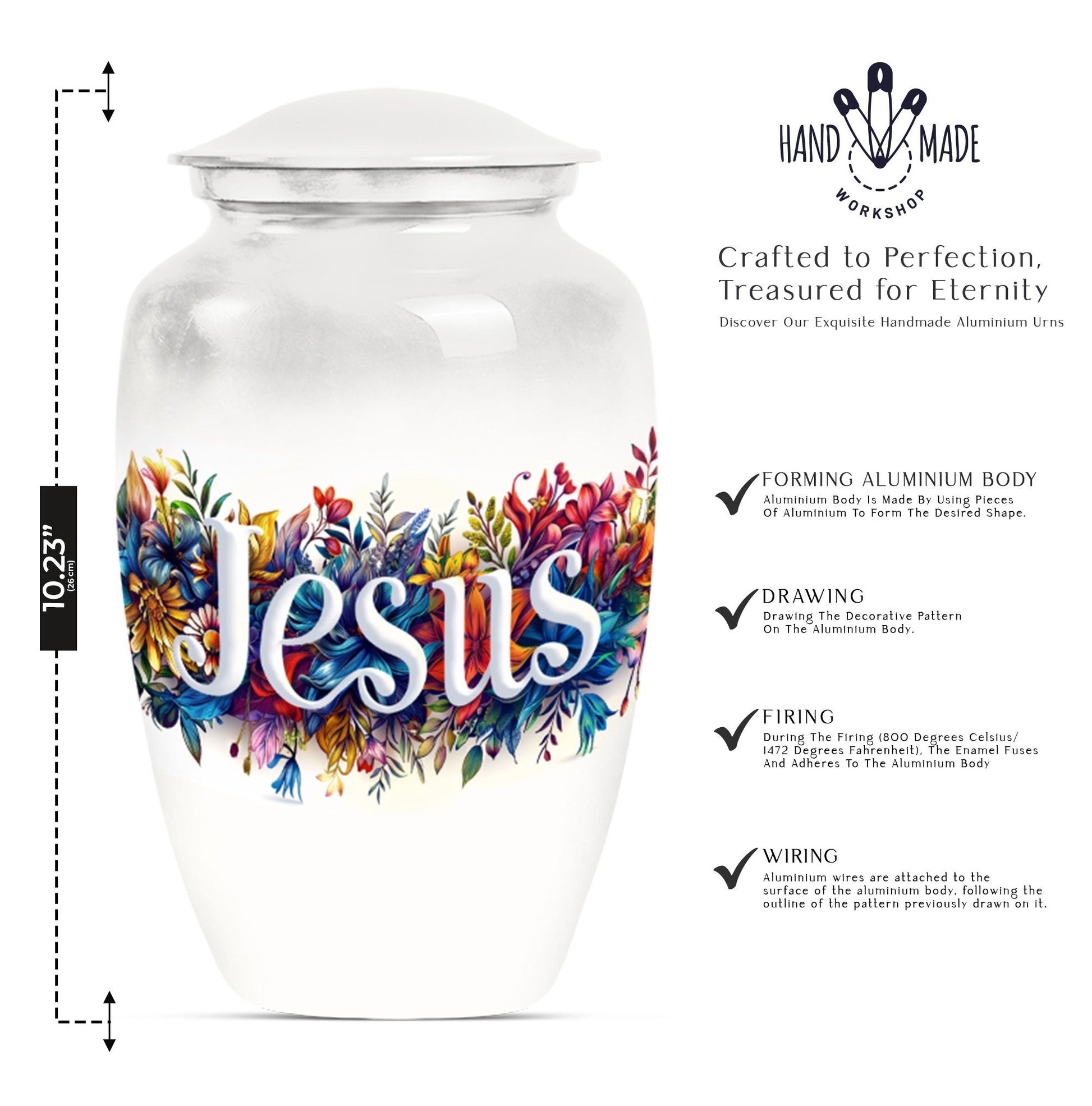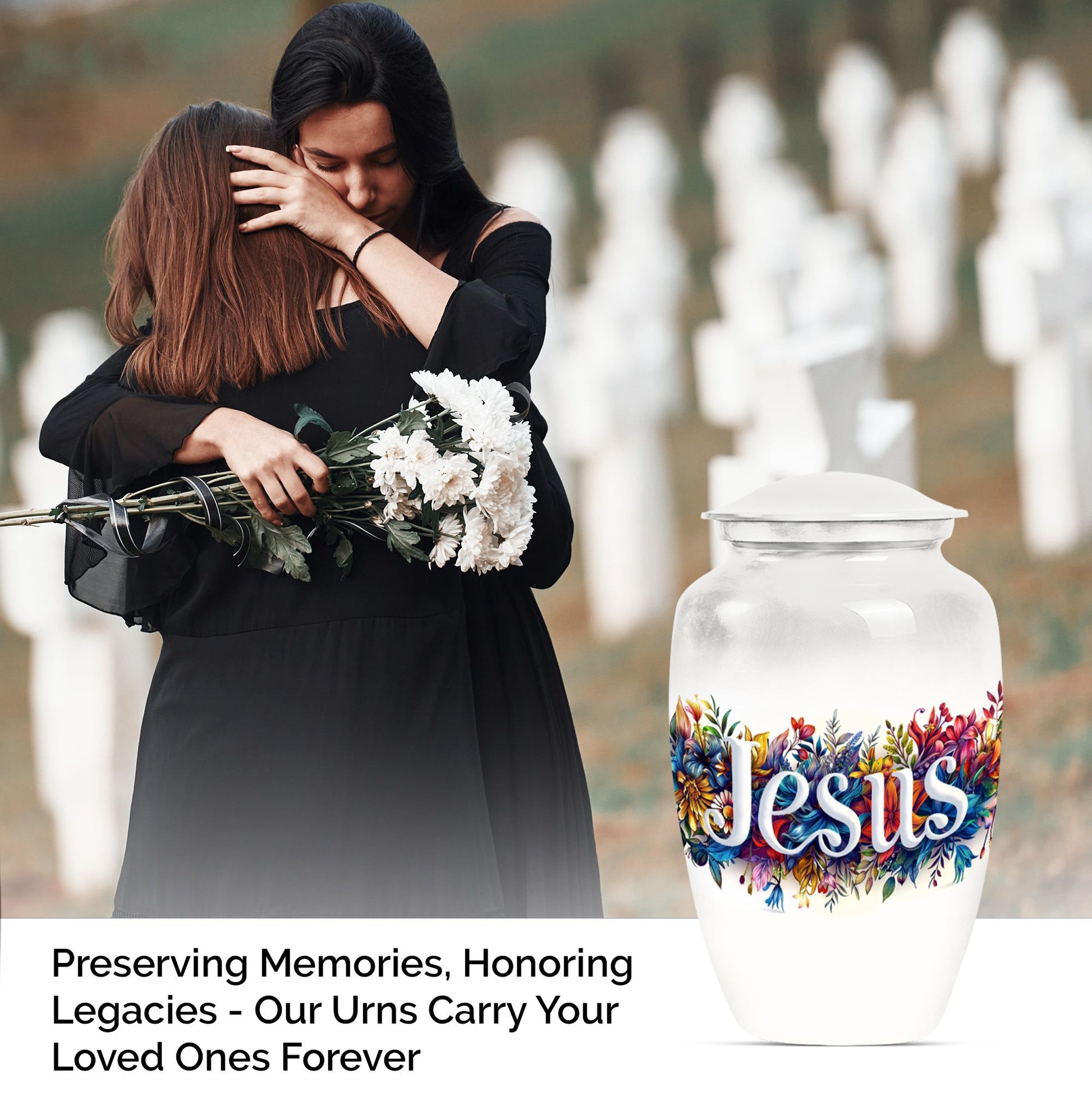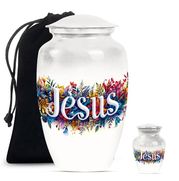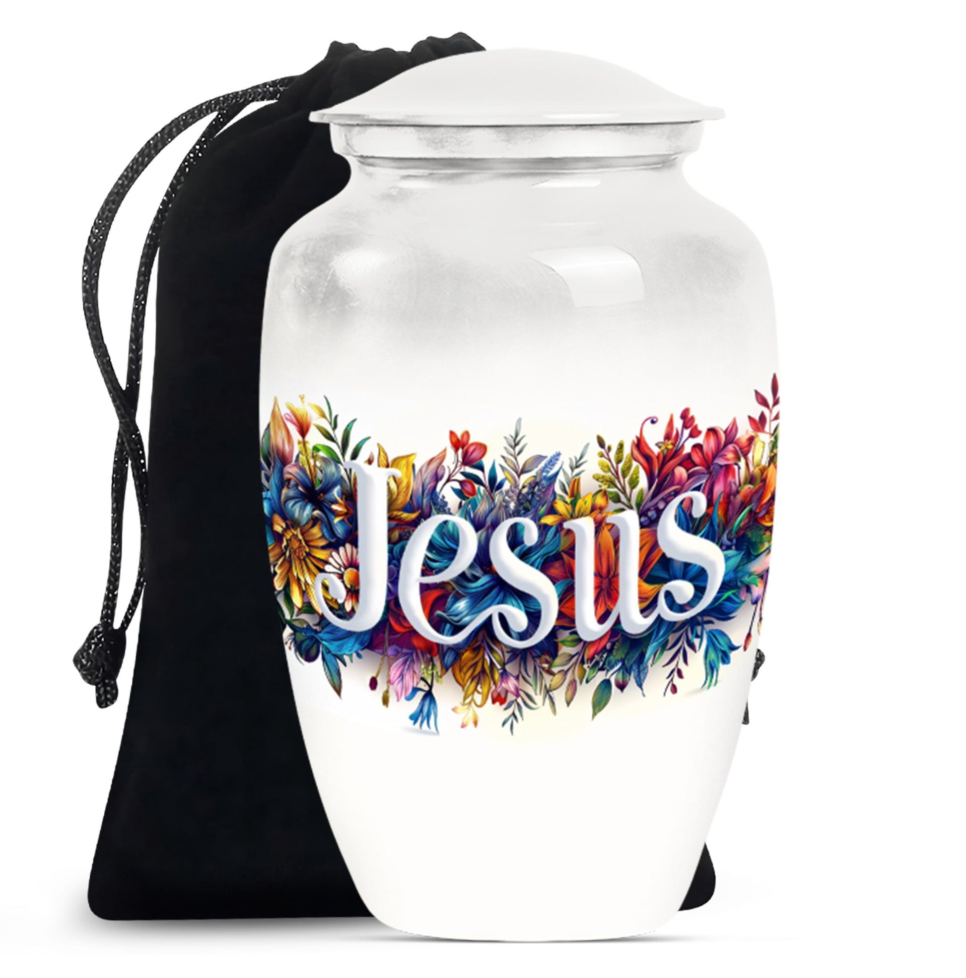 The Jesus Urn is an exquisite piece, curated for adults and seniors looking for a dignified and elegant way to remember their loved ones. Fashioned expertly and with attention to detail from robust aluminium, this large cremation urn is not only striking but also durable. Standing at a size of 10 inches and weighing subtly at 3.3 pounds, it has the capacity to hold up to 200 cubic inches of ashes. This makes it a perfect choice for anyone on the search for 'cremation adult urns for human ashes men'. The urn is an ideal blend of simplicity meets sophistication with its abstract theme. It includes a velvet pouch for the containment and care of ashes in the package. Taking it a step further, there is also an option to personalize it with engraved names, giving it a unique and heart-touching touch. In the quest for 'burial urns for cremation ashes' or 'human ash adult urns', this cremation urn emerges as an excellent option, offering a thoughtful blend of elegance, size, and personalised touches.