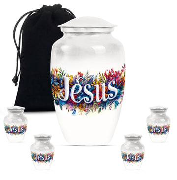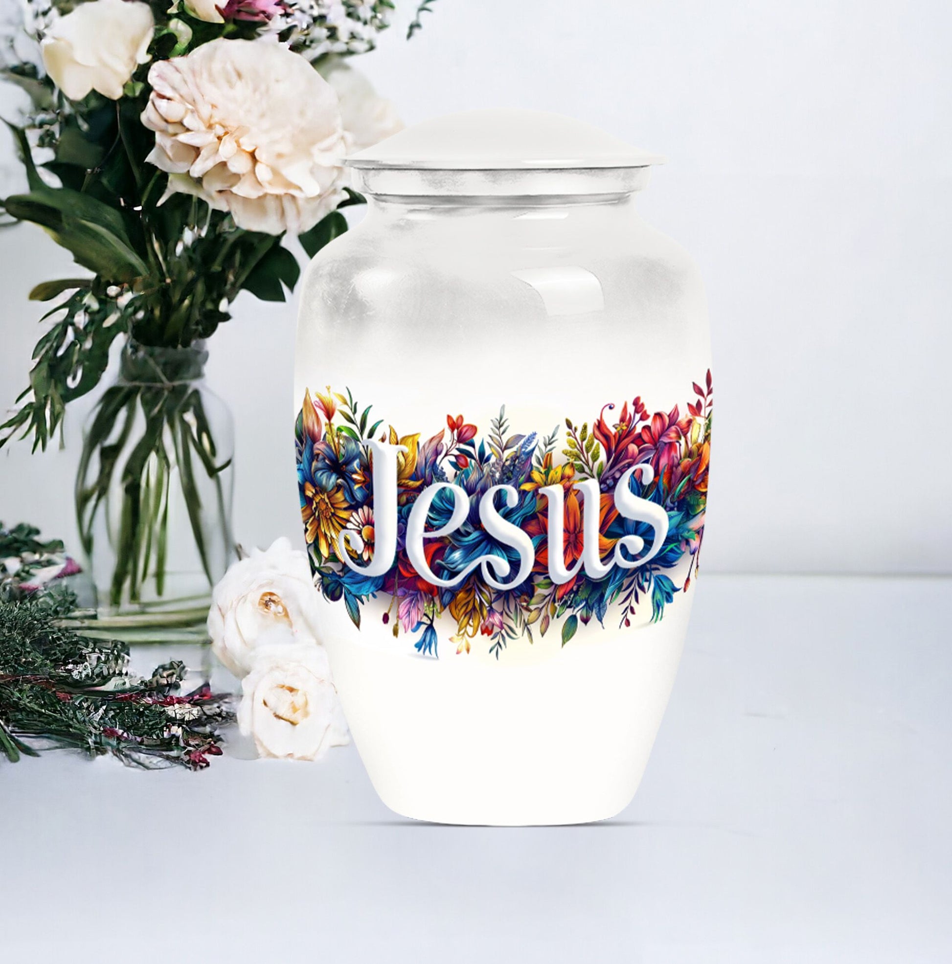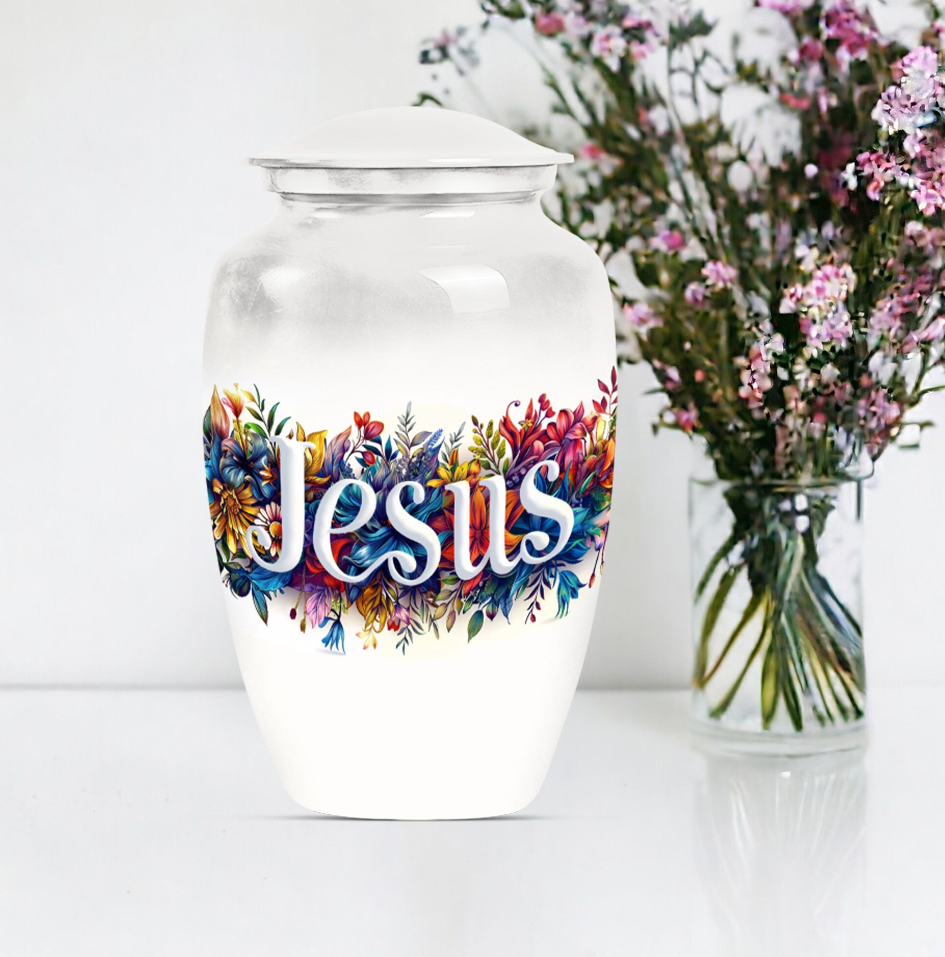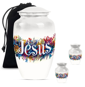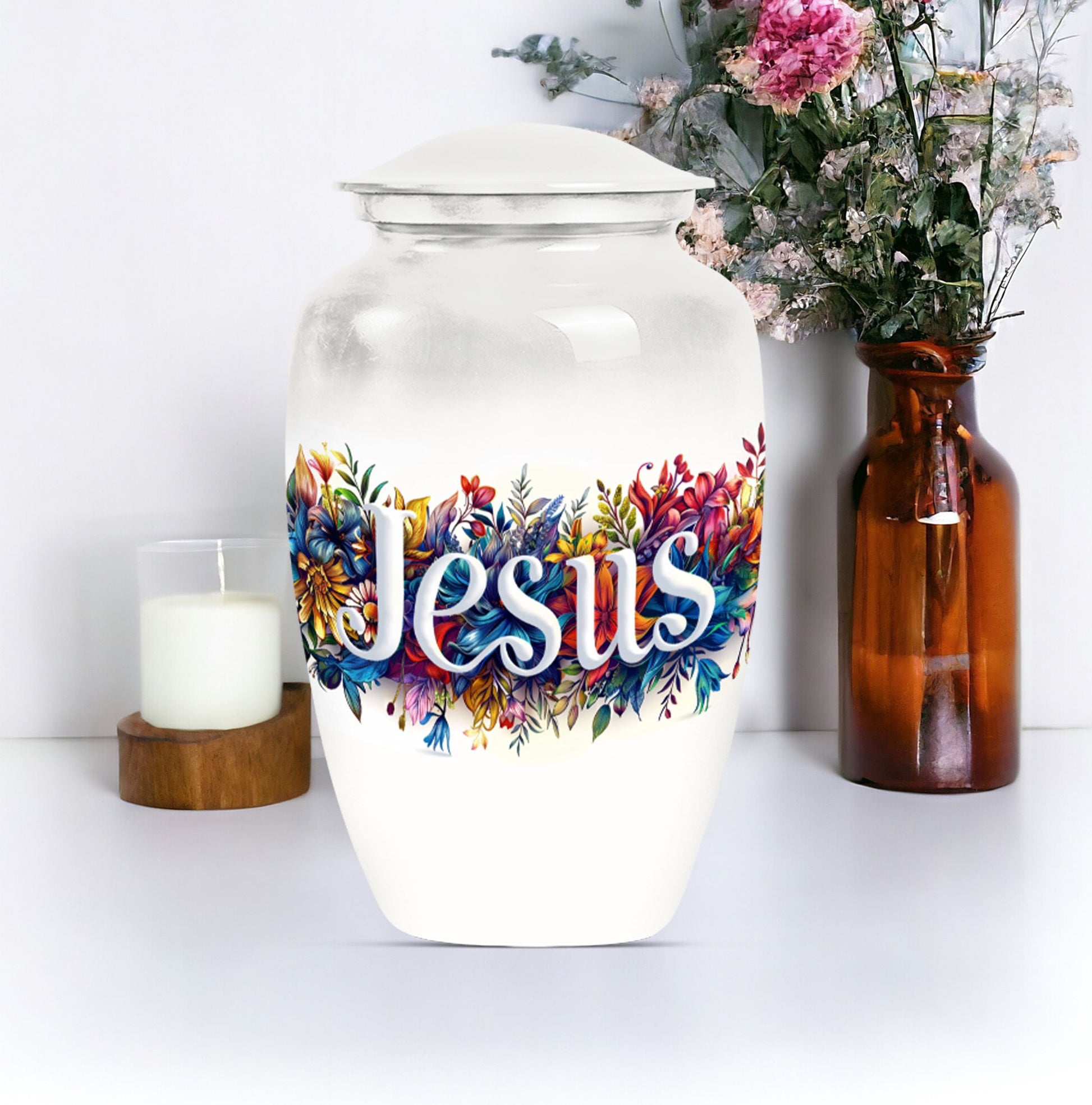 The Jesus Urn is an exquisite piece, curated for adults and seniors looking for a dignified and elegant way to remember their loved ones. Fashioned expertly and with attention to detail from robust aluminium, this large cremation urn is not only striking but also durable. Standing at a size of 10 inches and weighing subtly at 3.3 pounds, it has the capacity to hold up to 200 cubic inches of ashes. This makes it a perfect choice for anyone on the search for 'cremation adult urns for human ashes men'. The urn is an ideal blend of simplicity meets sophistication with its abstract theme. It includes a velvet pouch for the containment and care of ashes in the package. Taking it a step further, there is also an option to personalize it with engraved names, giving it a unique and heart-touching touch. In the quest for 'burial urns for cremation ashes' or 'human ash adult urns', this cremation urn emerges as an excellent option, offering a thoughtful blend of elegance, size, and personalised touches.