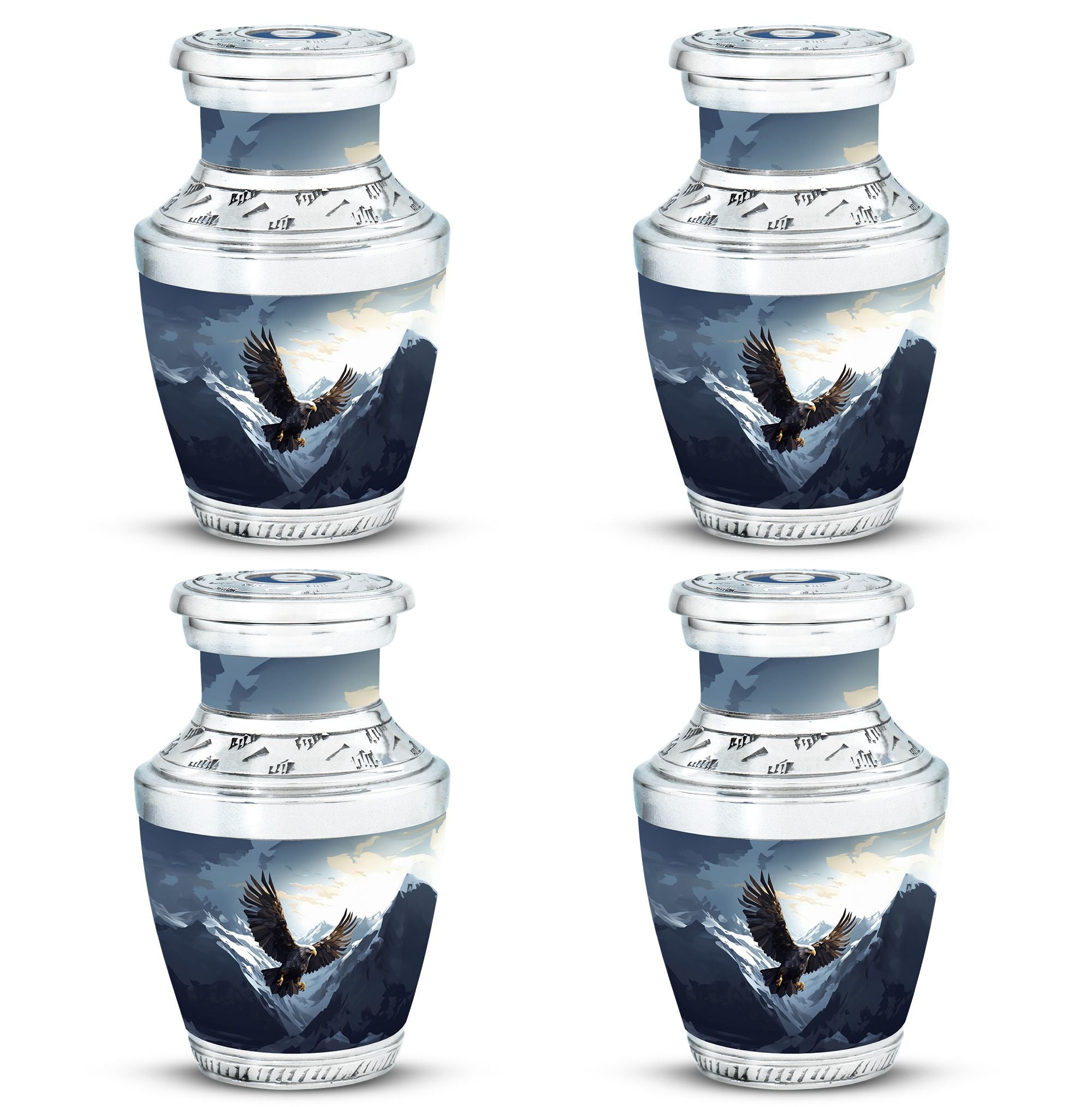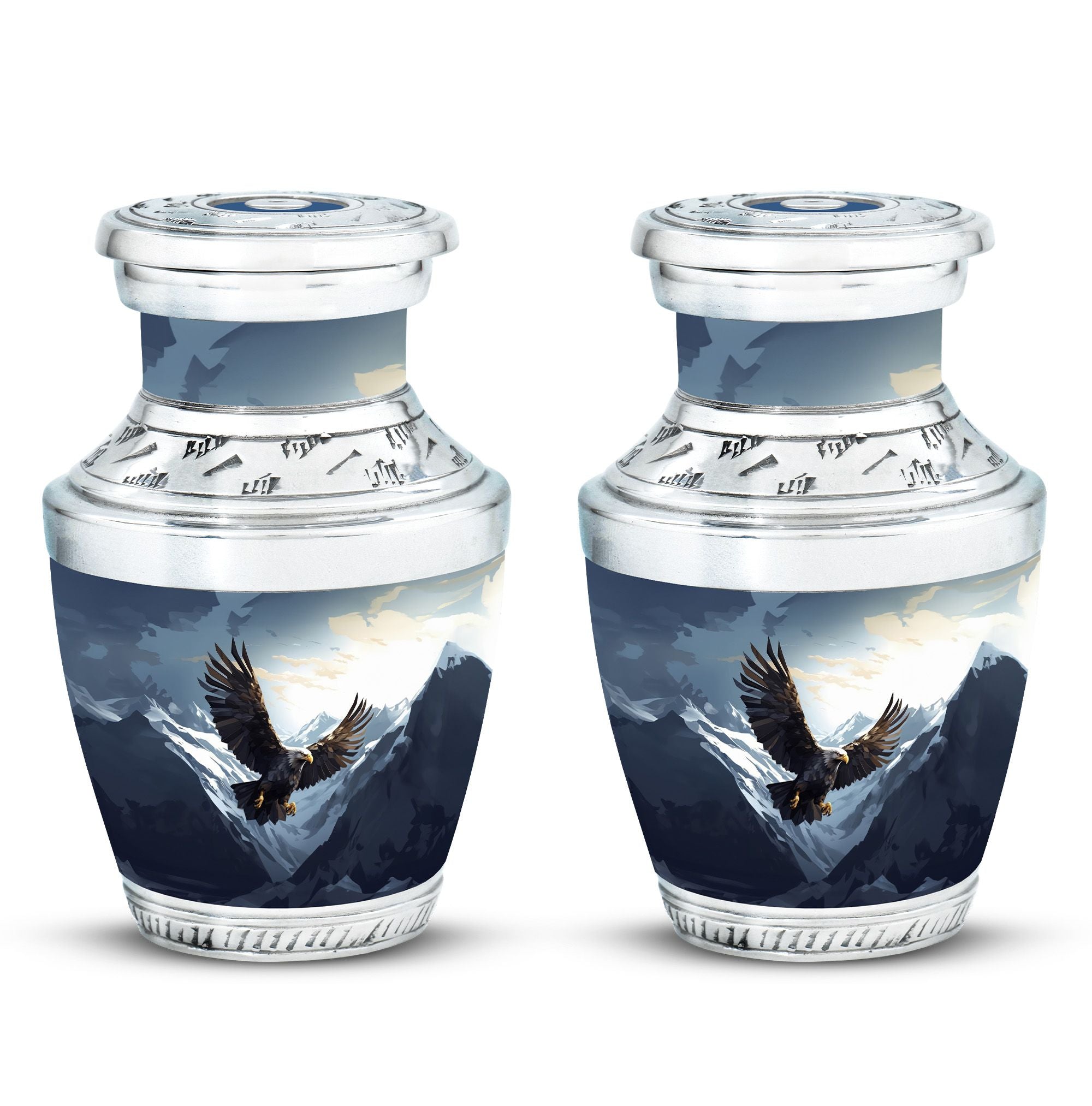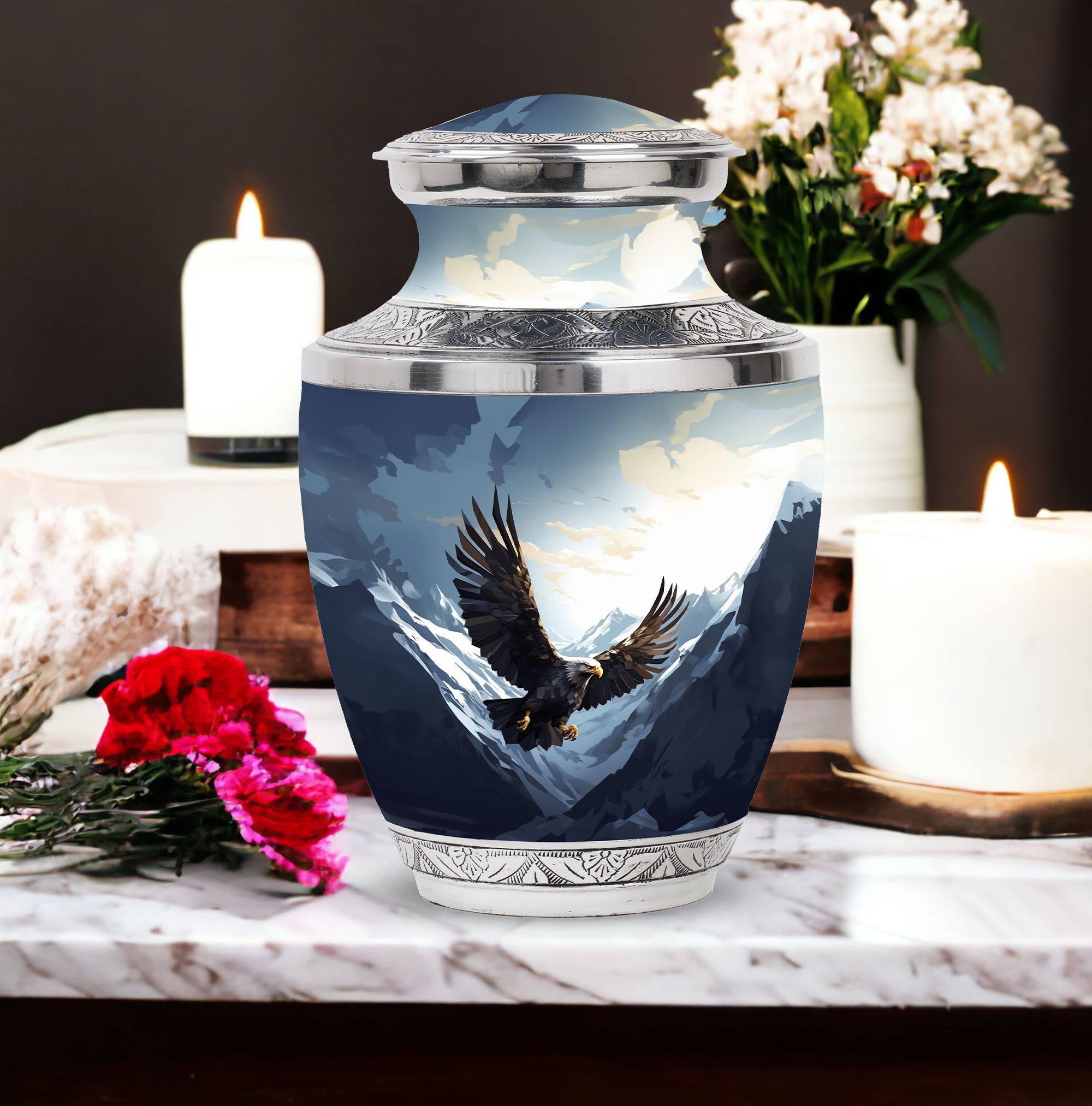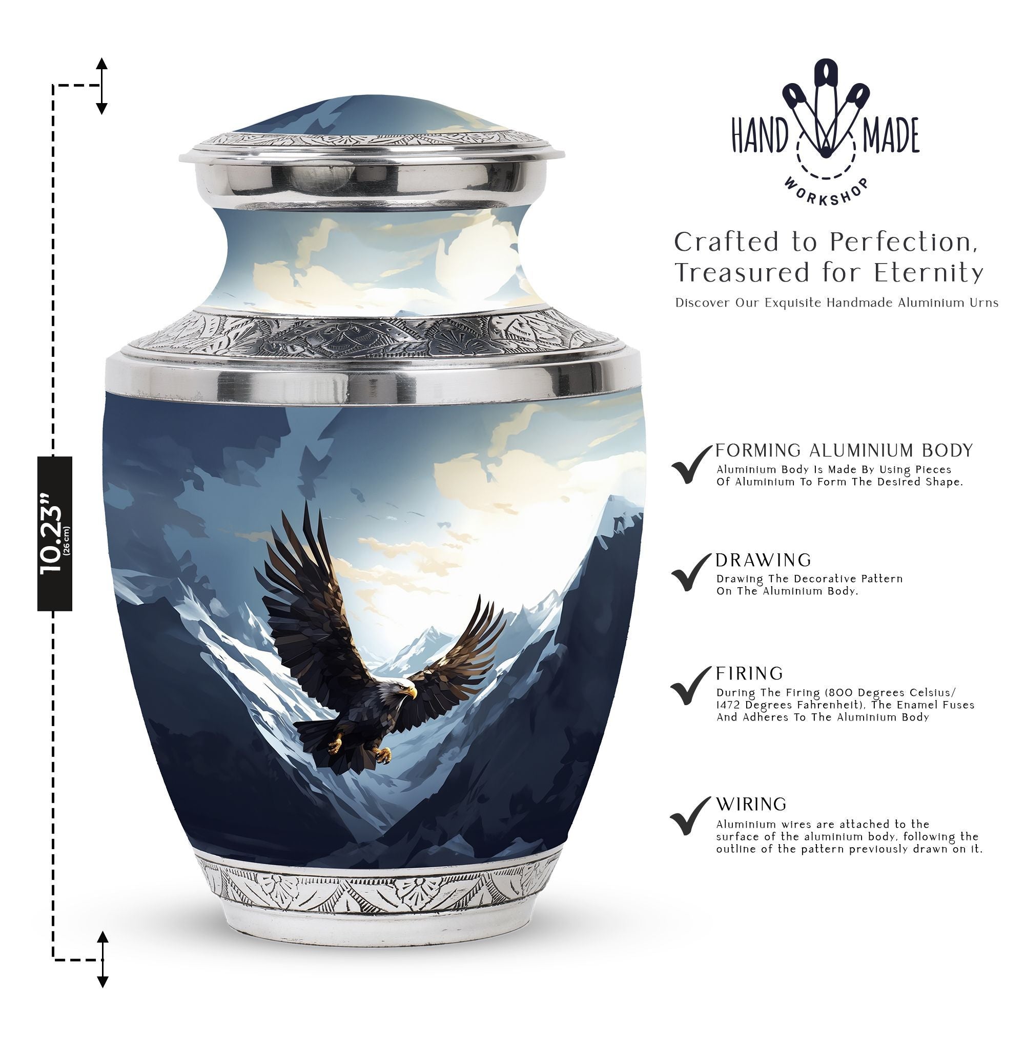 Experience the harmony of remembrance and serene beauty with the Flying Eagle Large Urns for Human ashes. Expertly crafted in high-quality aluminum, this classic 3-inch urn is notably heavy-duty, weighing 3.3 pounds, standing tall at 10 inches in height, and offering ample space with a capacity of 200 cubic inches for containing your loved one’s ashes. Its timeless construction offers an enduring tribute and forms an integral part of your memorial ceremony supplies. The urn comes conveniently with a velvet pouch, ensuring safe and respectful containment of ashes. This cremation urn can be further personalized, enriching the memoriam Tribute with engraved names, adding an intimate touch.
