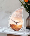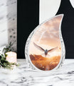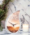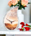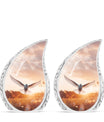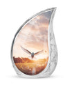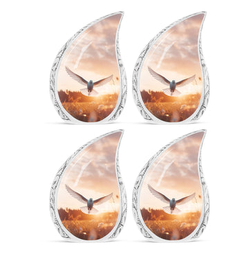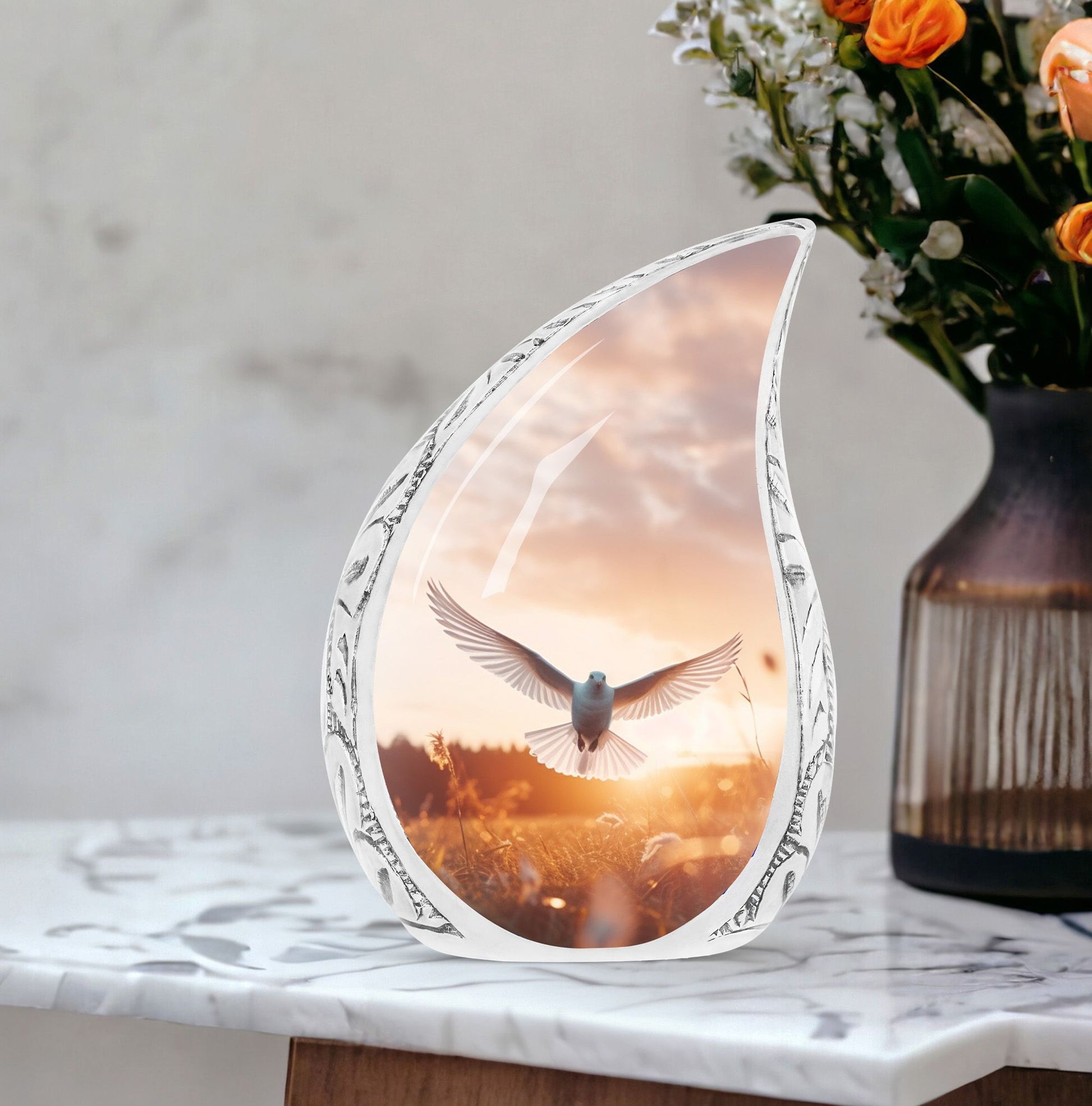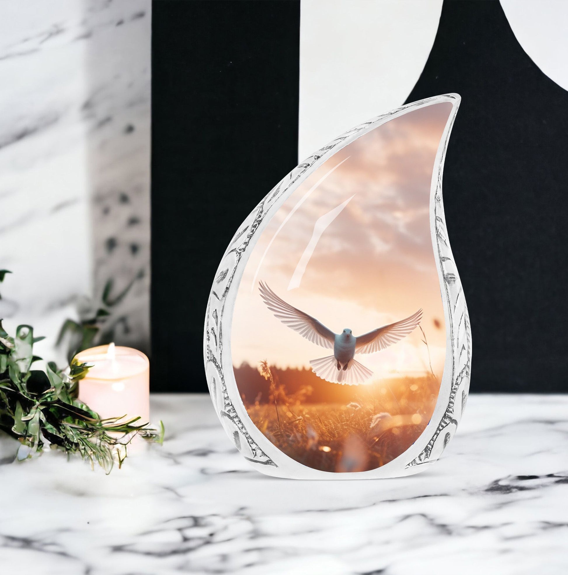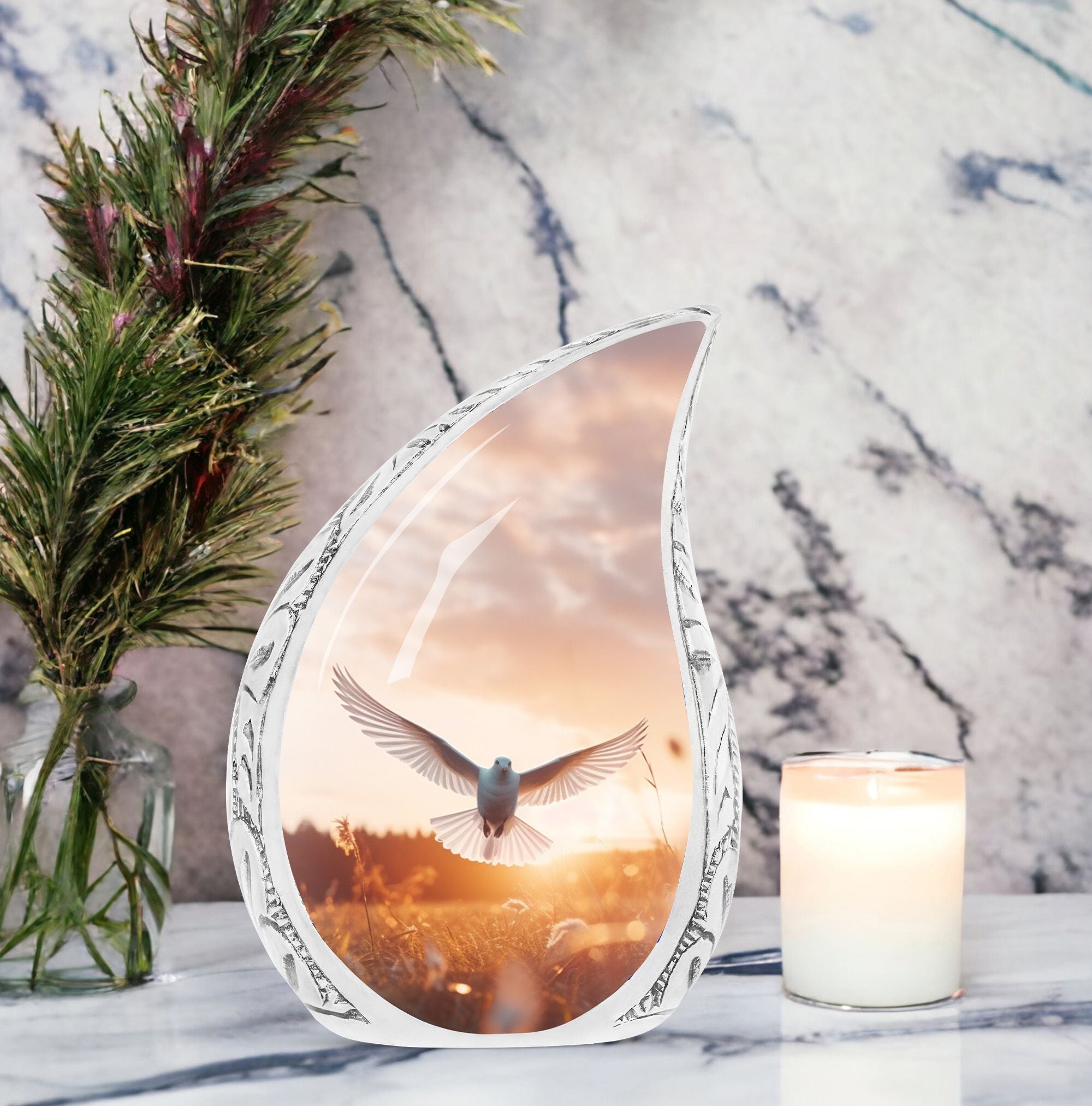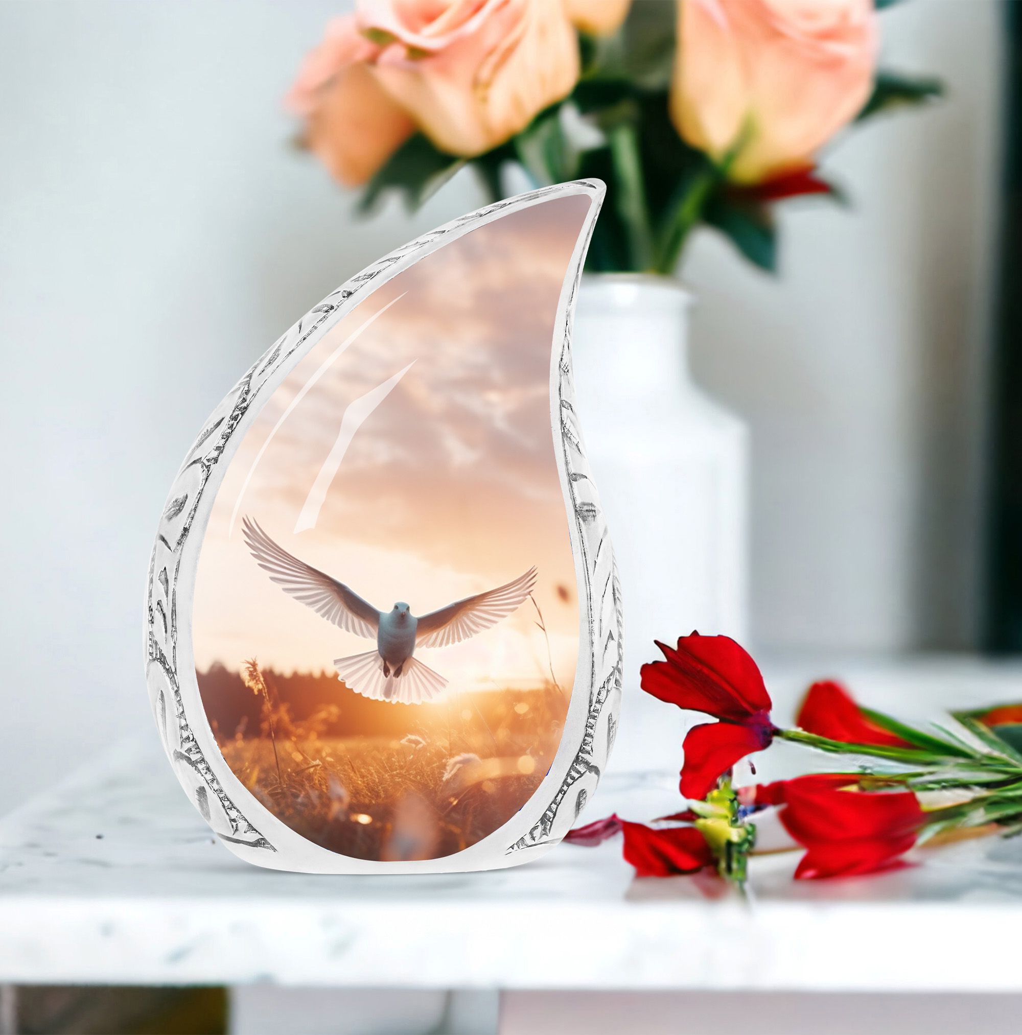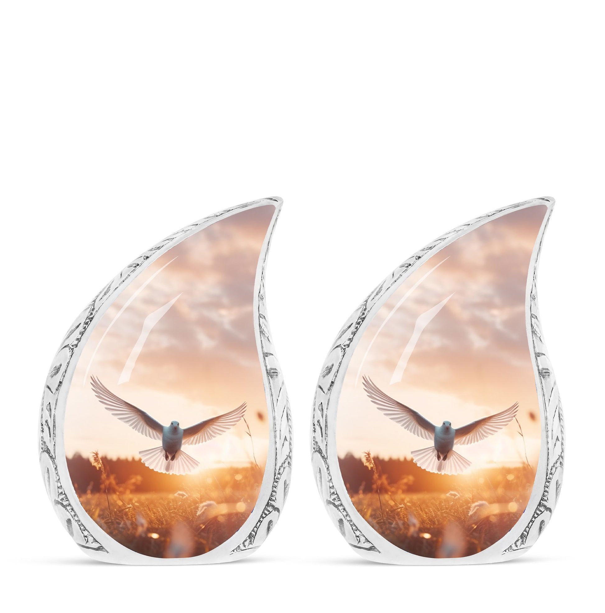 Immerse in the divine tranquility with our large dove urns for funeral ashes, a beautiful way to remember and celebrate lives lived. Crafted from sturdy aluminum, these urns for human ashes are both subtle and substantial, weighing 3.3 pounds, and standing at a stately height of 10 inches. Their capacity of 200 cubic inches offers an alluring accommodation for your loved one's ashes. Our 'Classic Urn' style captures the absolute simplicity of form, coupled with a touching sentiment of love and respect. Your purchase includes a refined velvet pouch, delicately designed for the containment of ashes. To enhance this personal resting place, we offer customizations where you can personalize the urn with engraved names. Size is crucial in such emotional purchases, and these urns measure a respectful 3 inches in width.