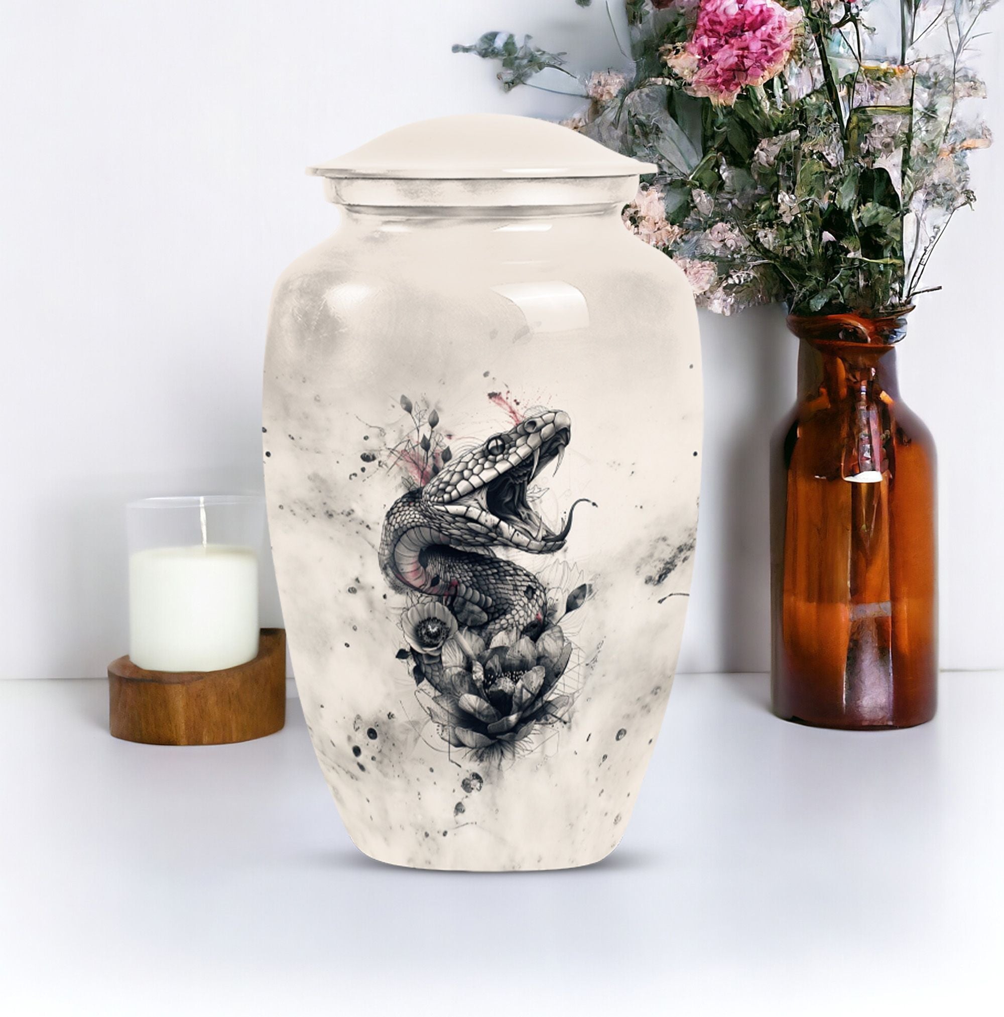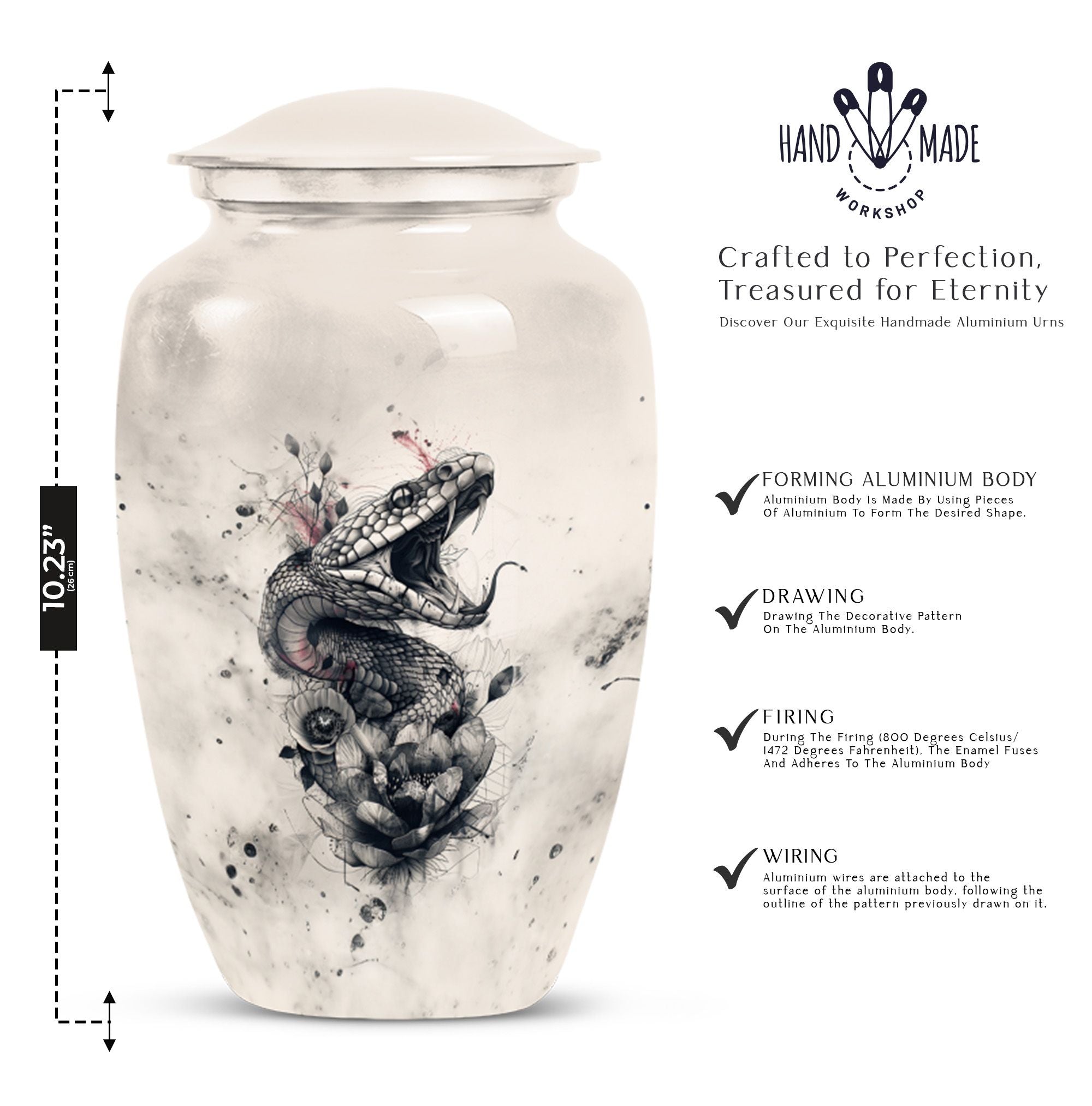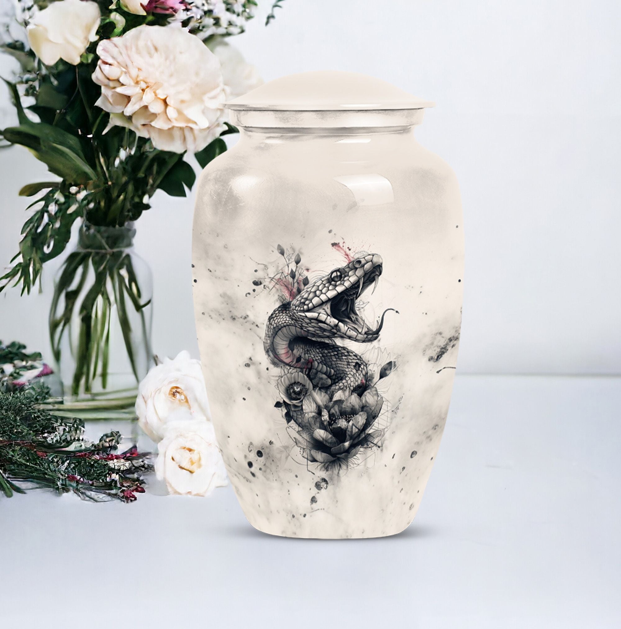 The 'snake urn' elegantly combines style and functionality to honor your dearly departed. This 10-inch cremation urn, handcrafted from durable aluminium, brings soothing abstract expressions to your thoughts to ease your heartbreak. Weighing only 3.3 pounds, it offers an impressive capacity of 200 cubic inches, ideal for providing the rightful resting place for adult ashes. The package includes a velvet pouch to secure the ashes discreetly. Beyond being a 'funeral urn for ashes adult,' this 'large urn' comfortably grazes the sophisticated tastes of 'urn ash men.' With options to 'Personalize with engraved names,' you can bring an intimate touch to your memorial. This 'funeral urn for adult male dad' is a beautiful tribute balancing the heavy emotions and tender memories perfectly. High in strength and lustrous in appearance, this metal urn adds a touch of timeless charm to your memorial space.