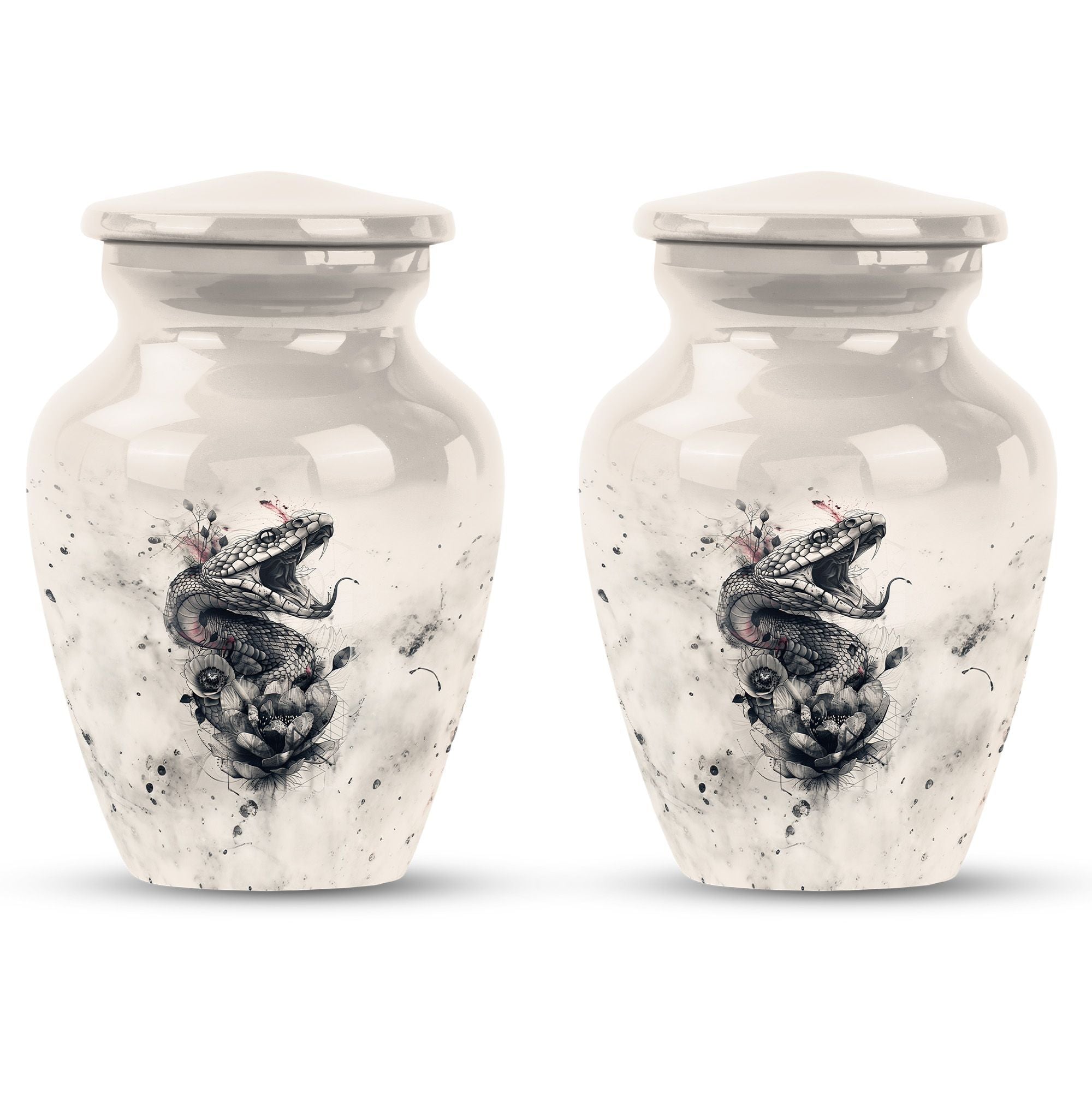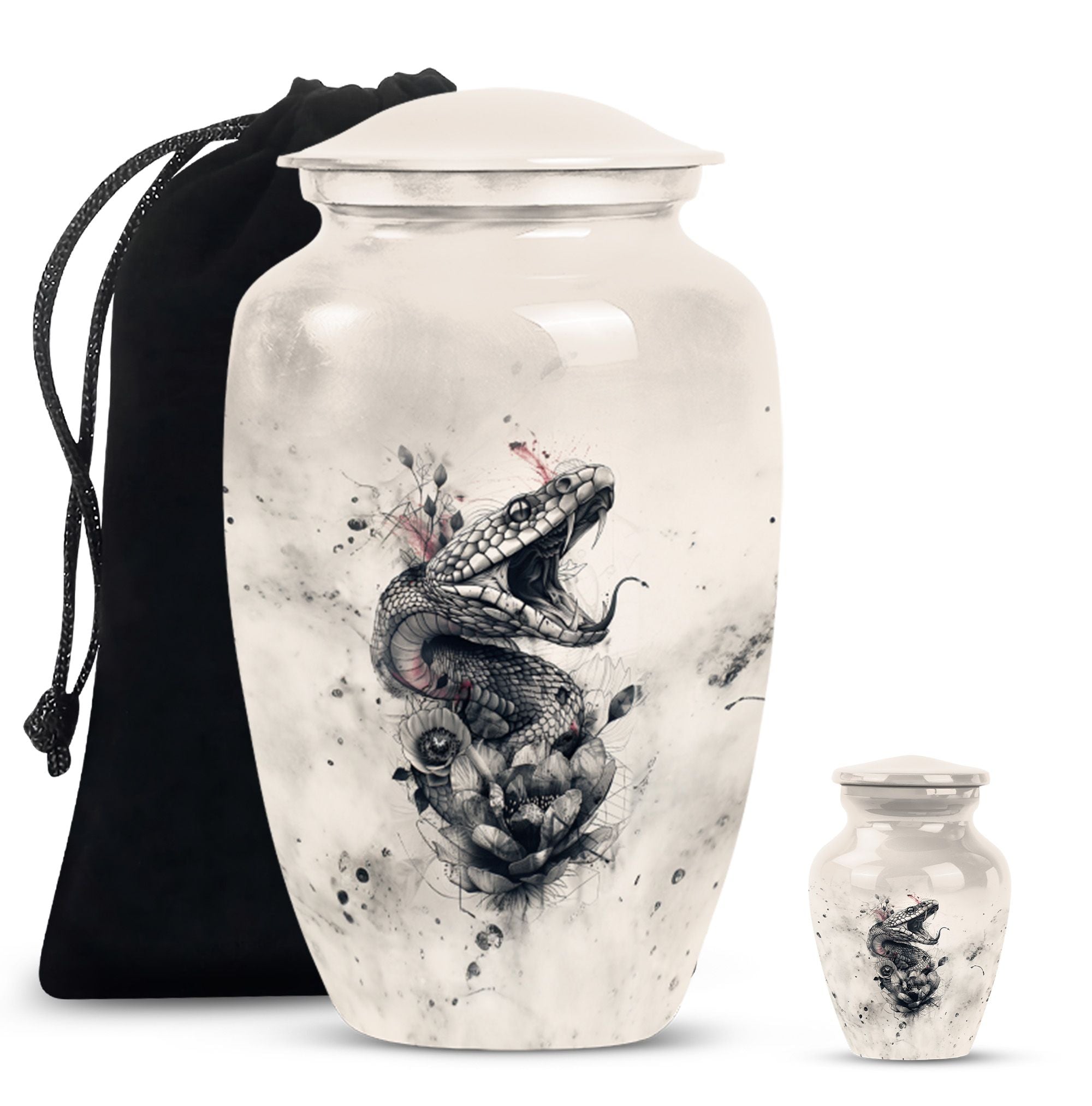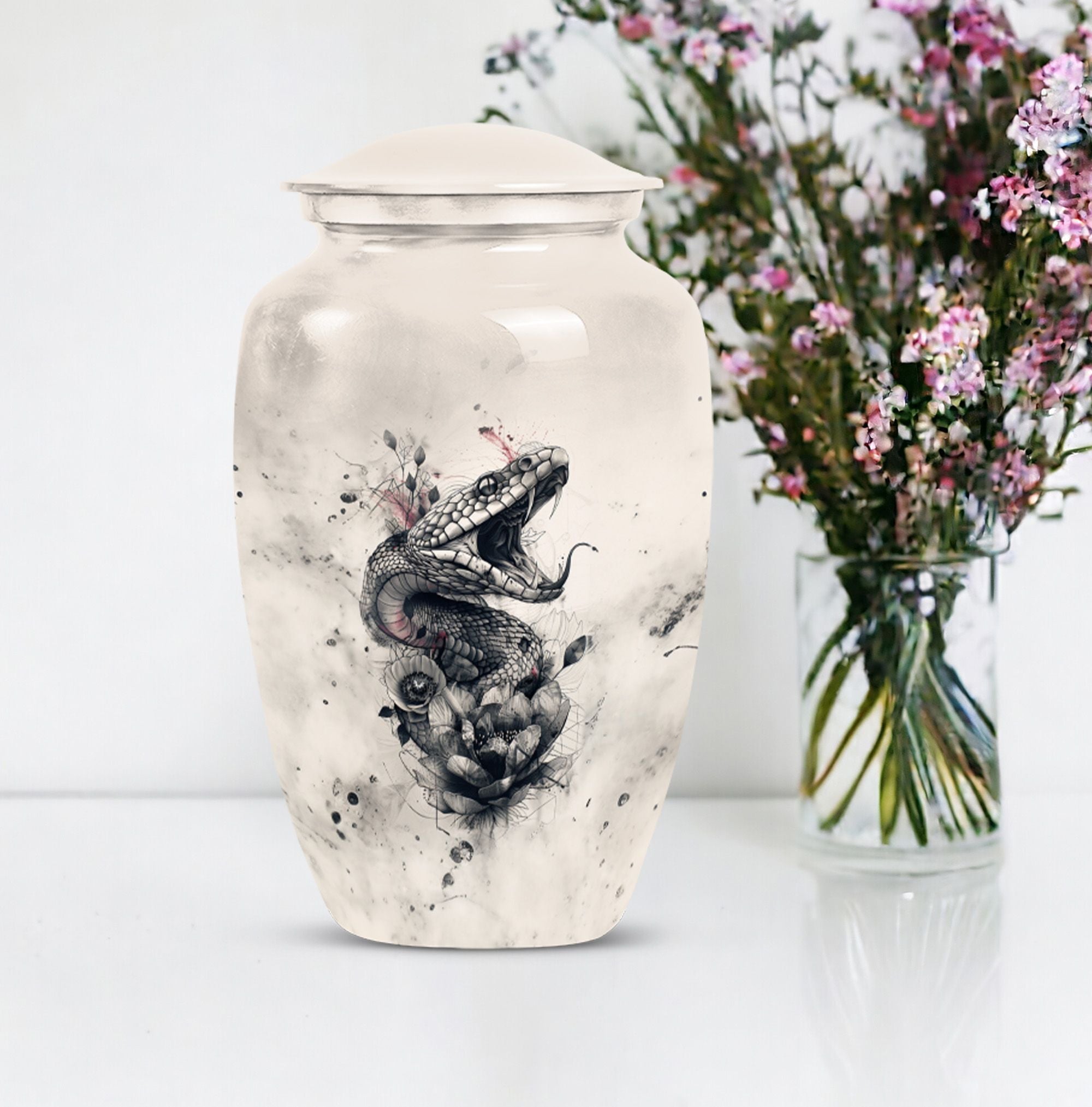 The 'snake urn' elegantly combines style and functionality to honor your dearly departed. This 10-inch cremation urn, handcrafted from durable aluminium, brings soothing abstract expressions to your thoughts to ease your heartbreak. Weighing only 3.3 pounds, it offers an impressive capacity of 200 cubic inches, ideal for providing the rightful resting place for adult ashes. The package includes a velvet pouch to secure the ashes discreetly. Beyond being a 'funeral urn for ashes adult,' this 'large urn' comfortably grazes the sophisticated tastes of 'urn ash men.' With options to 'Personalize with engraved names,' you can bring an intimate touch to your memorial. This 'funeral urn for adult male dad' is a beautiful tribute balancing the heavy emotions and tender memories perfectly. High in strength and lustrous in appearance, this metal urn adds a touch of timeless charm to your memorial space.