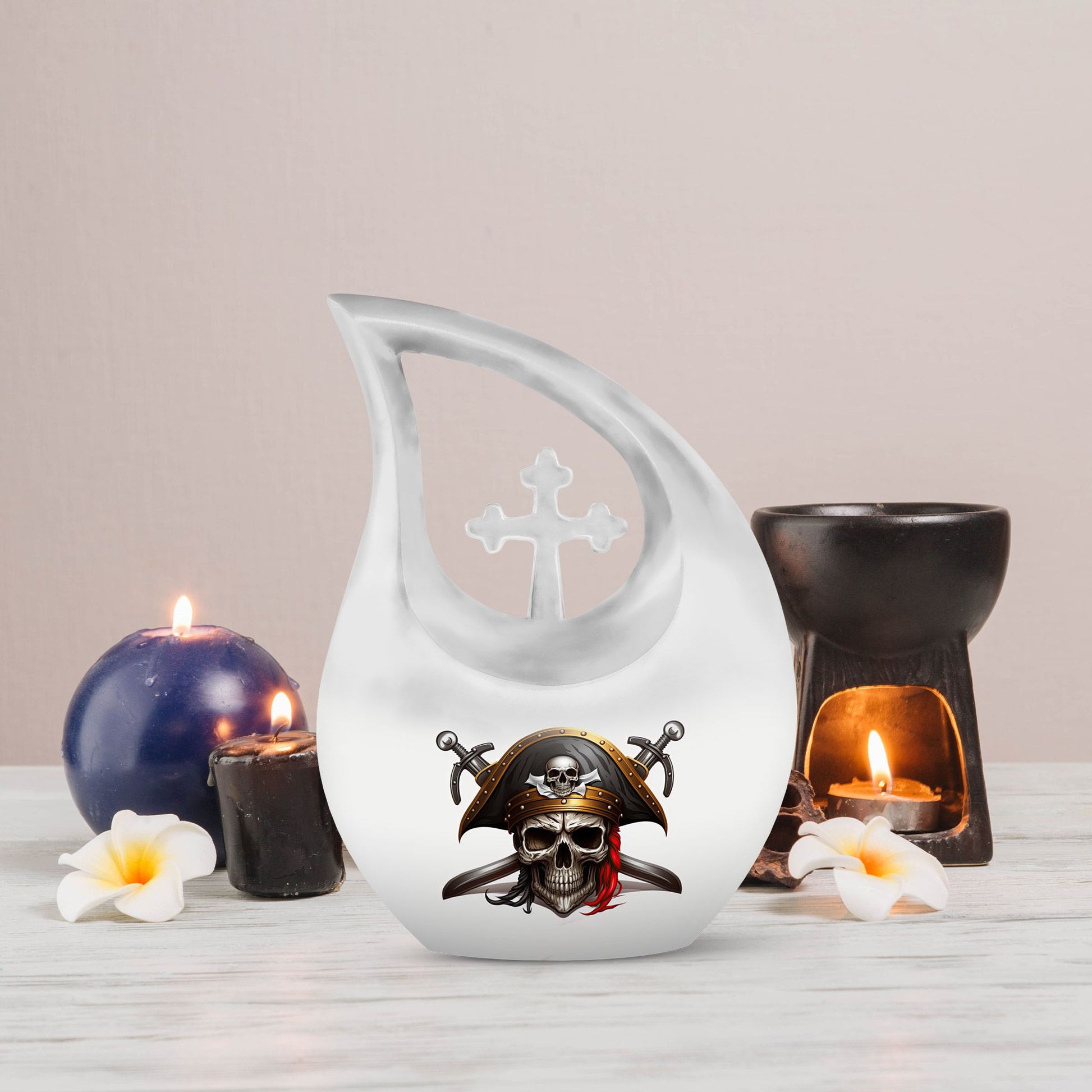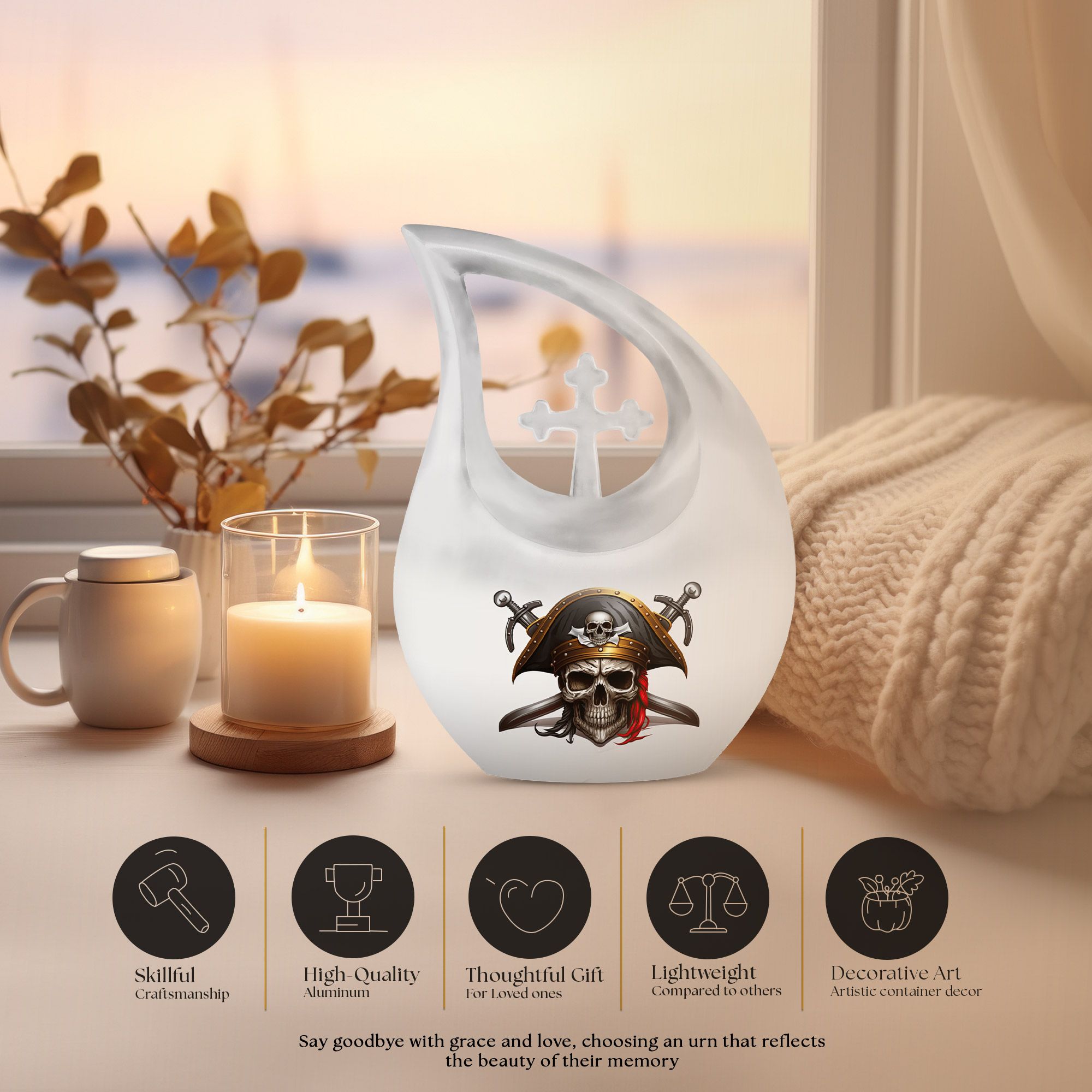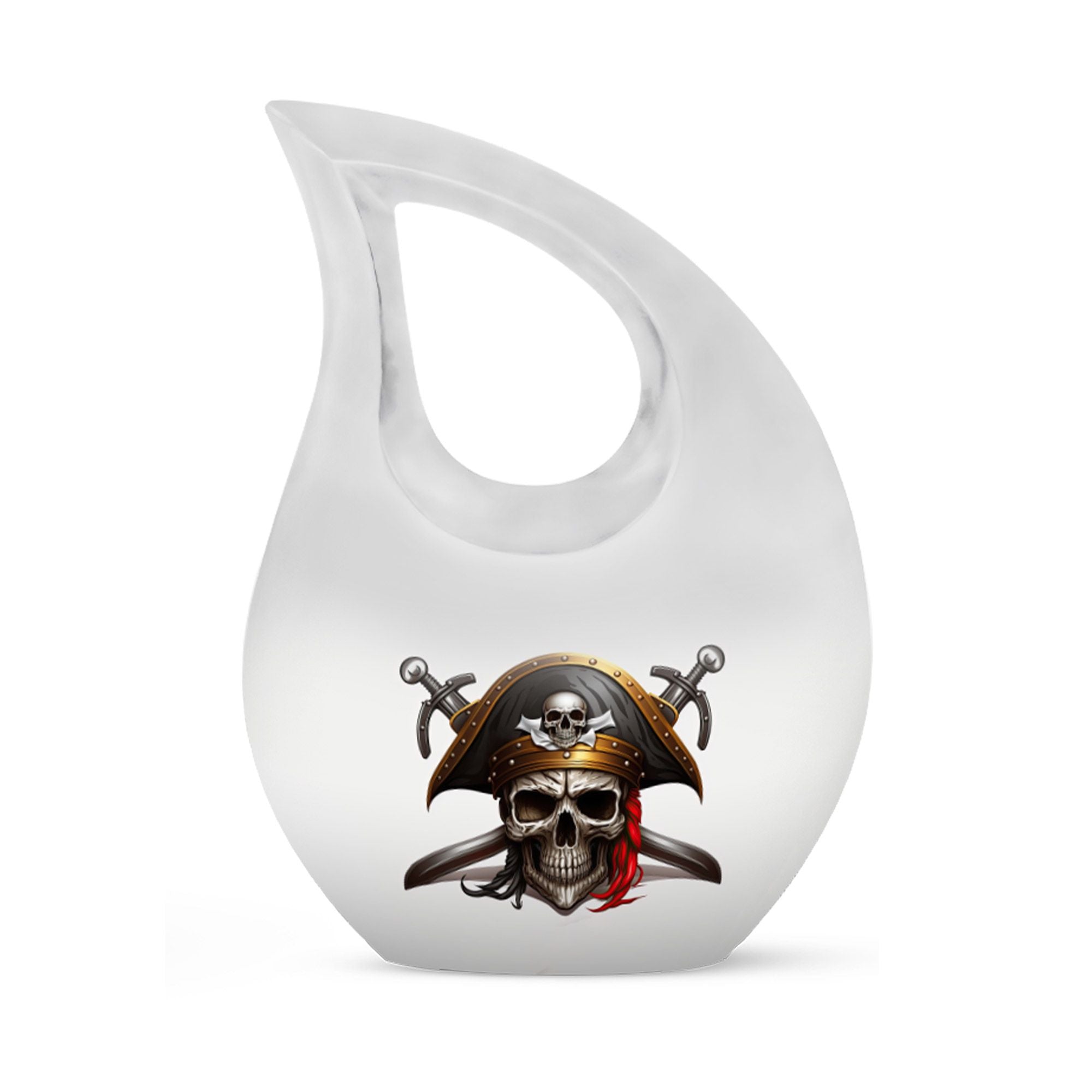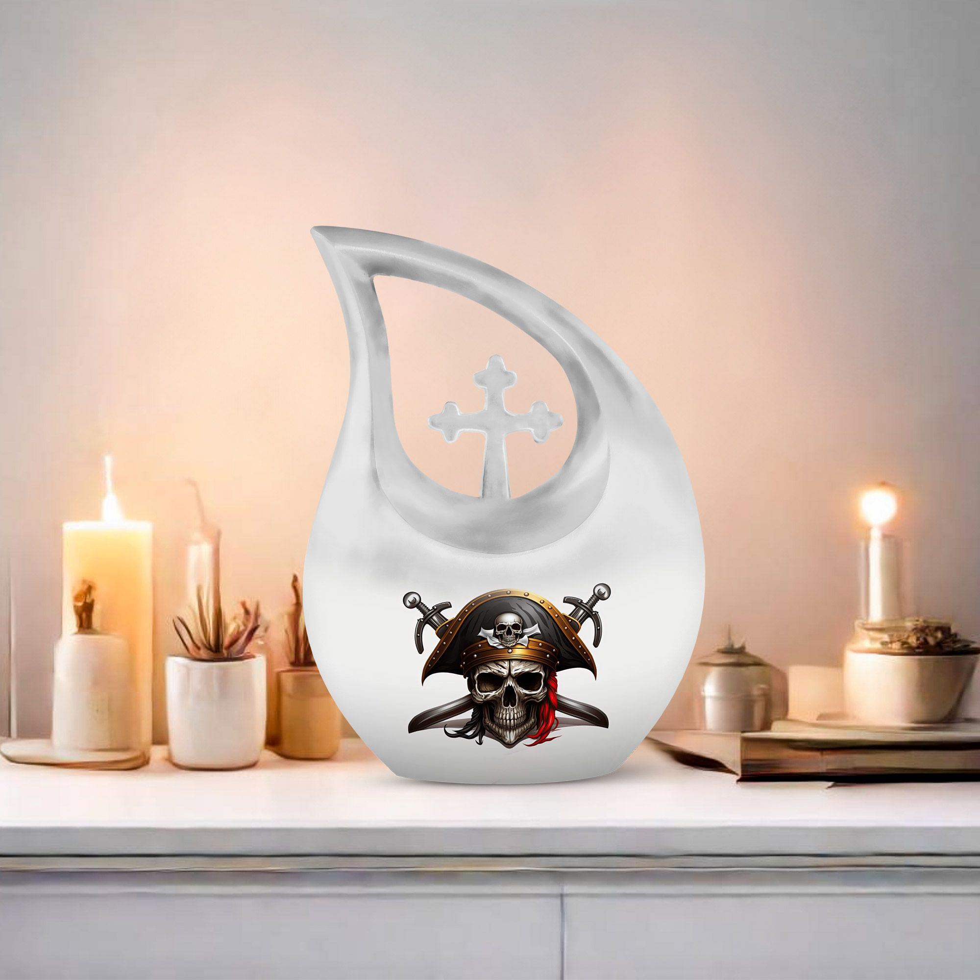 The pirate skull symbolizes the journey beyond, where the soul sails freely across eternal waters. This white funeral urn stands as a reminder that every adventure continues, even after life’s horizon.