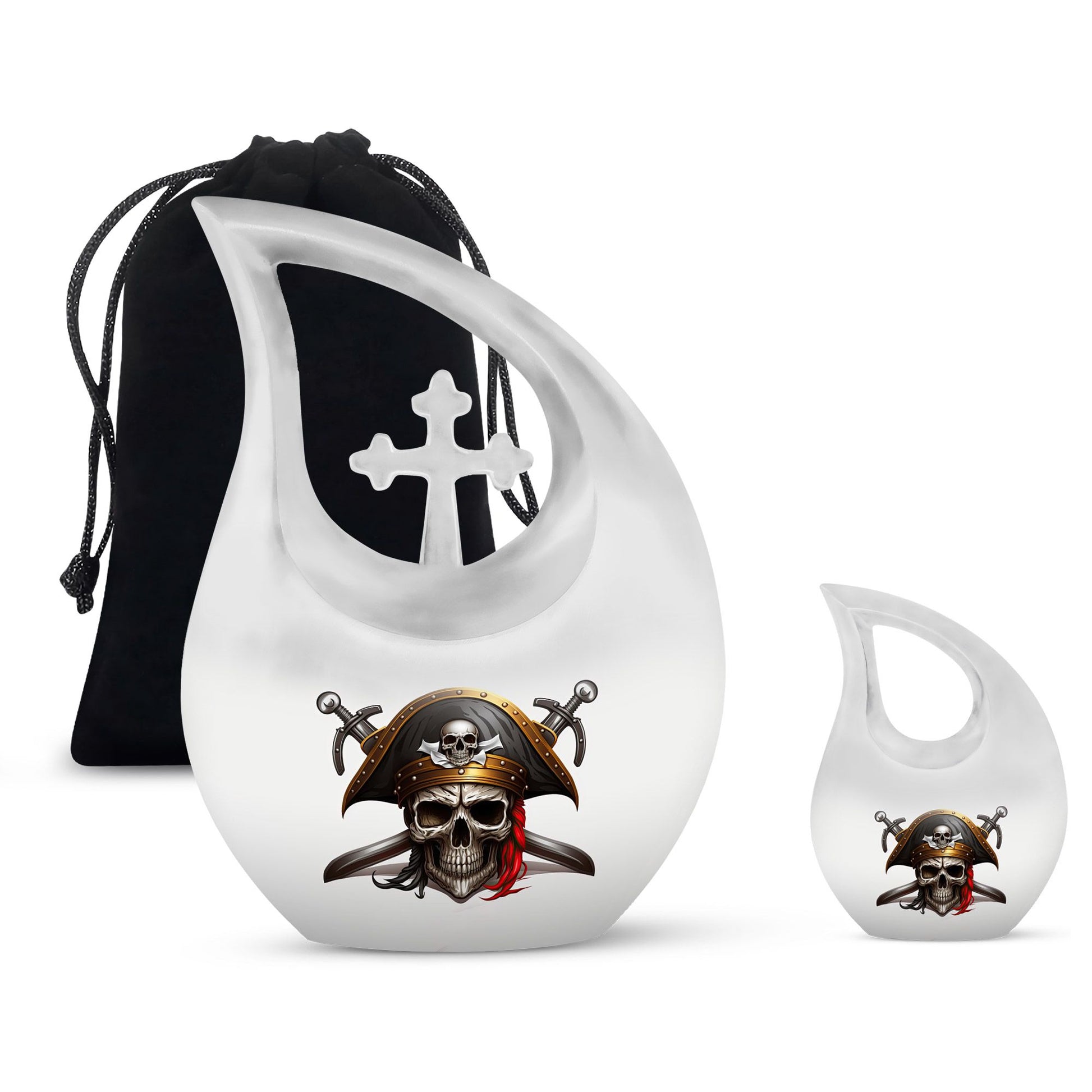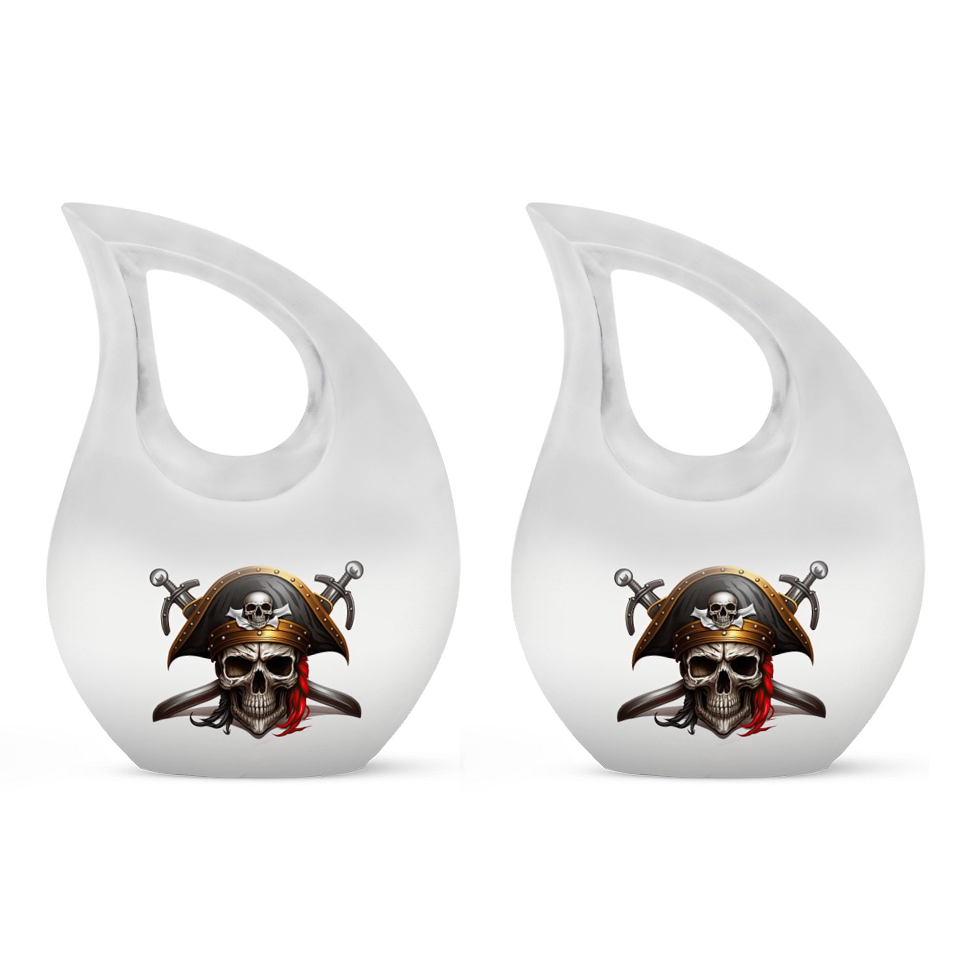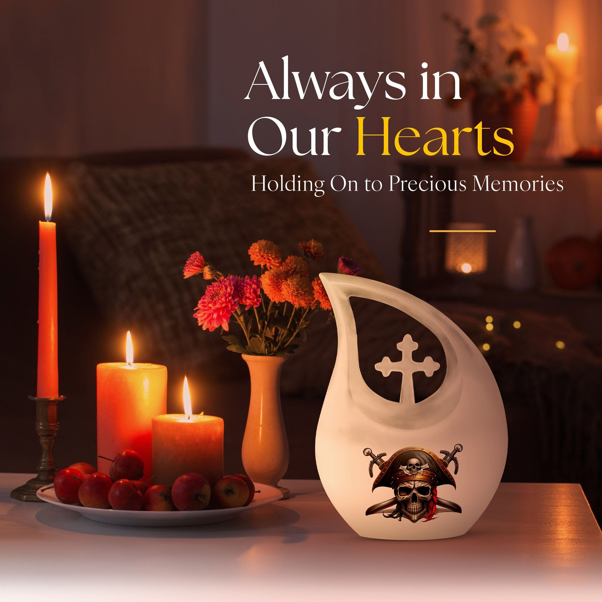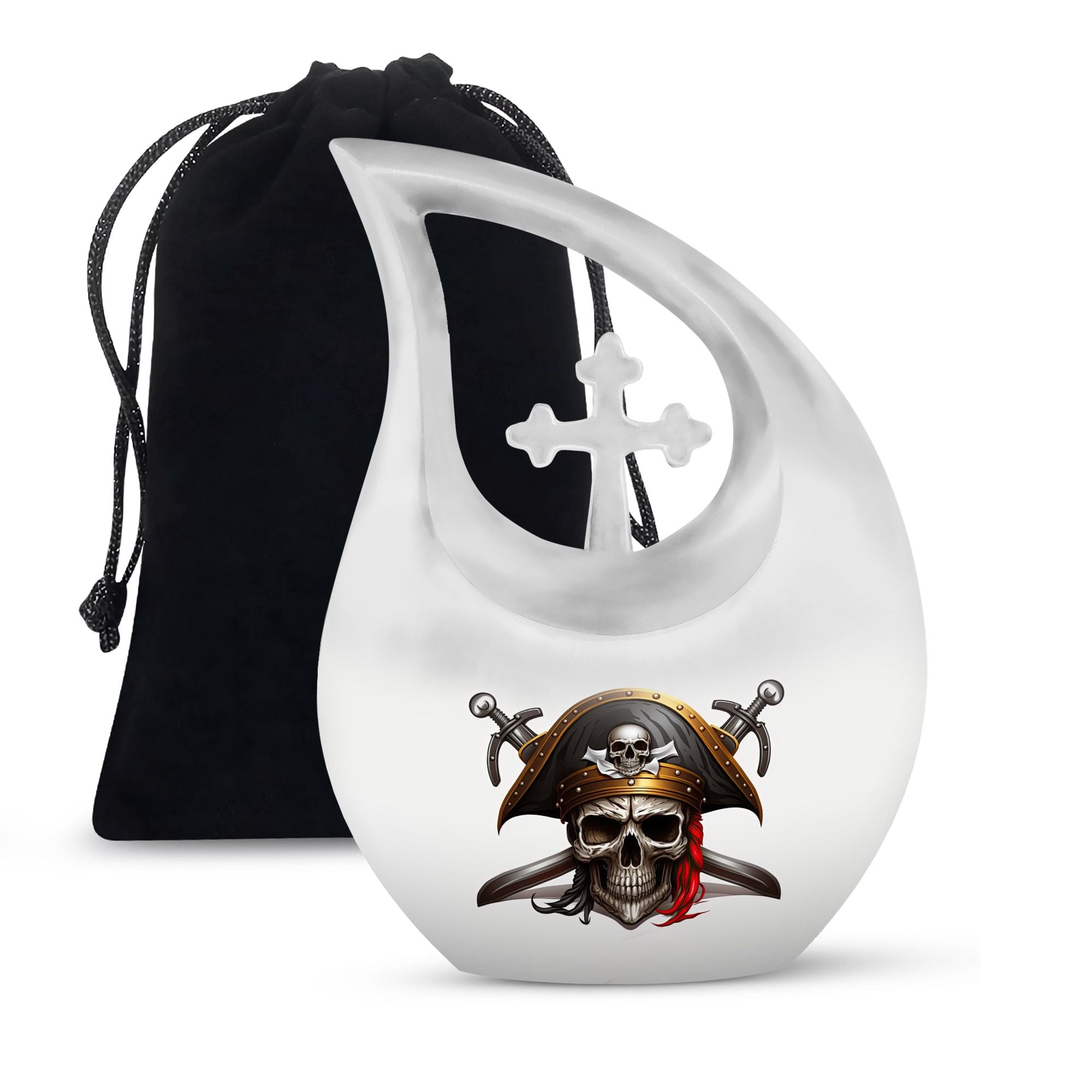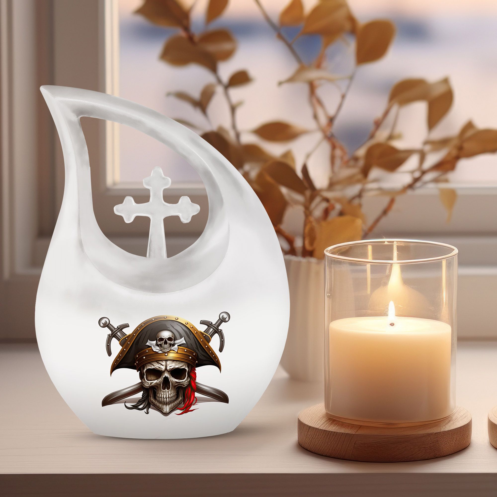 The pirate skull symbolizes the journey beyond, where the soul sails freely across eternal waters. This white funeral urn stands as a reminder that every adventure continues, even after life’s horizon.