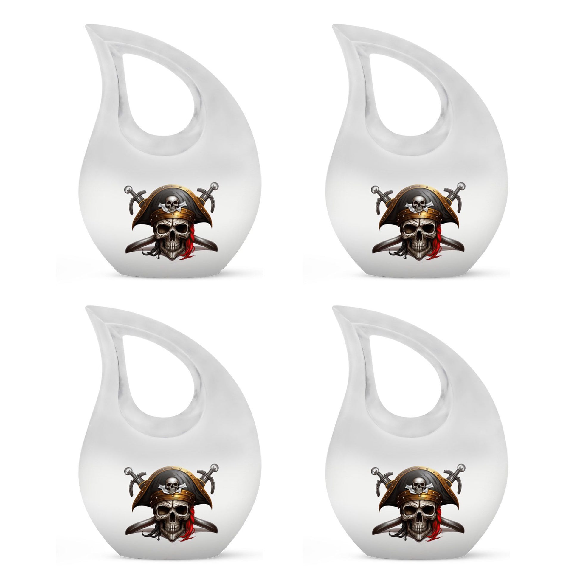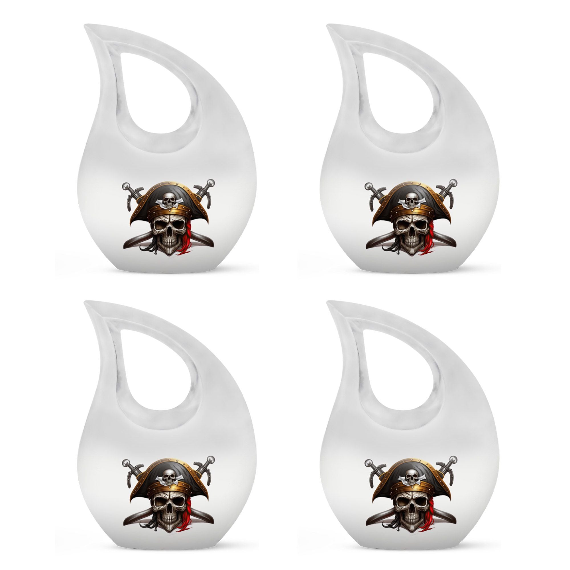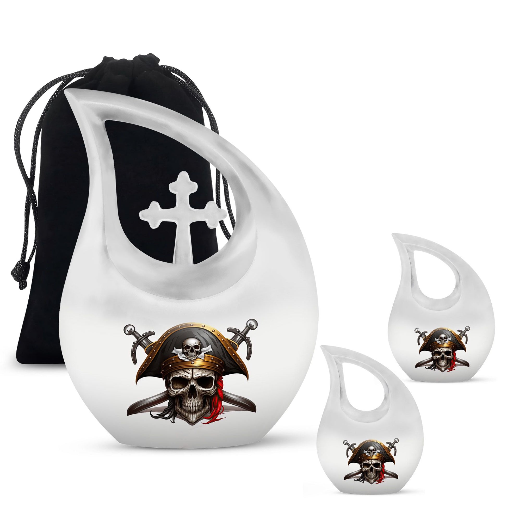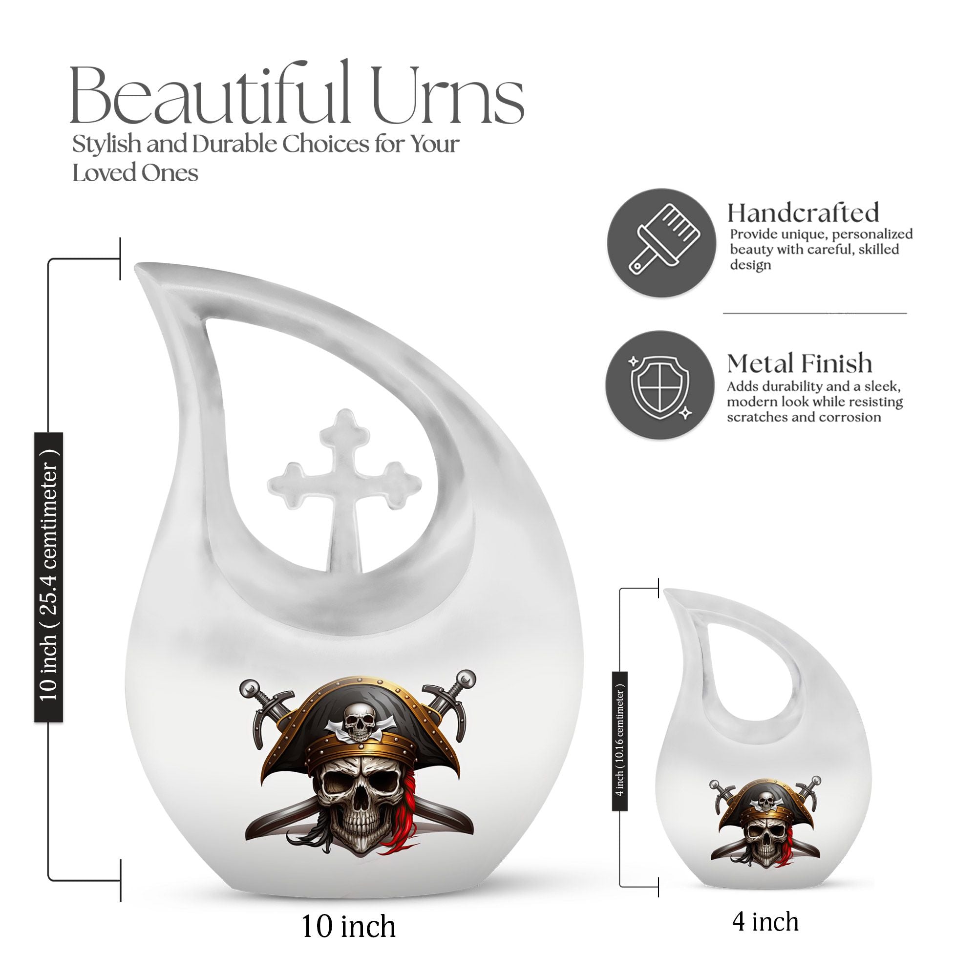 The pirate skull symbolizes the journey beyond, where the soul sails freely across eternal waters. This white funeral urn stands as a reminder that every adventure continues, even after life’s horizon.