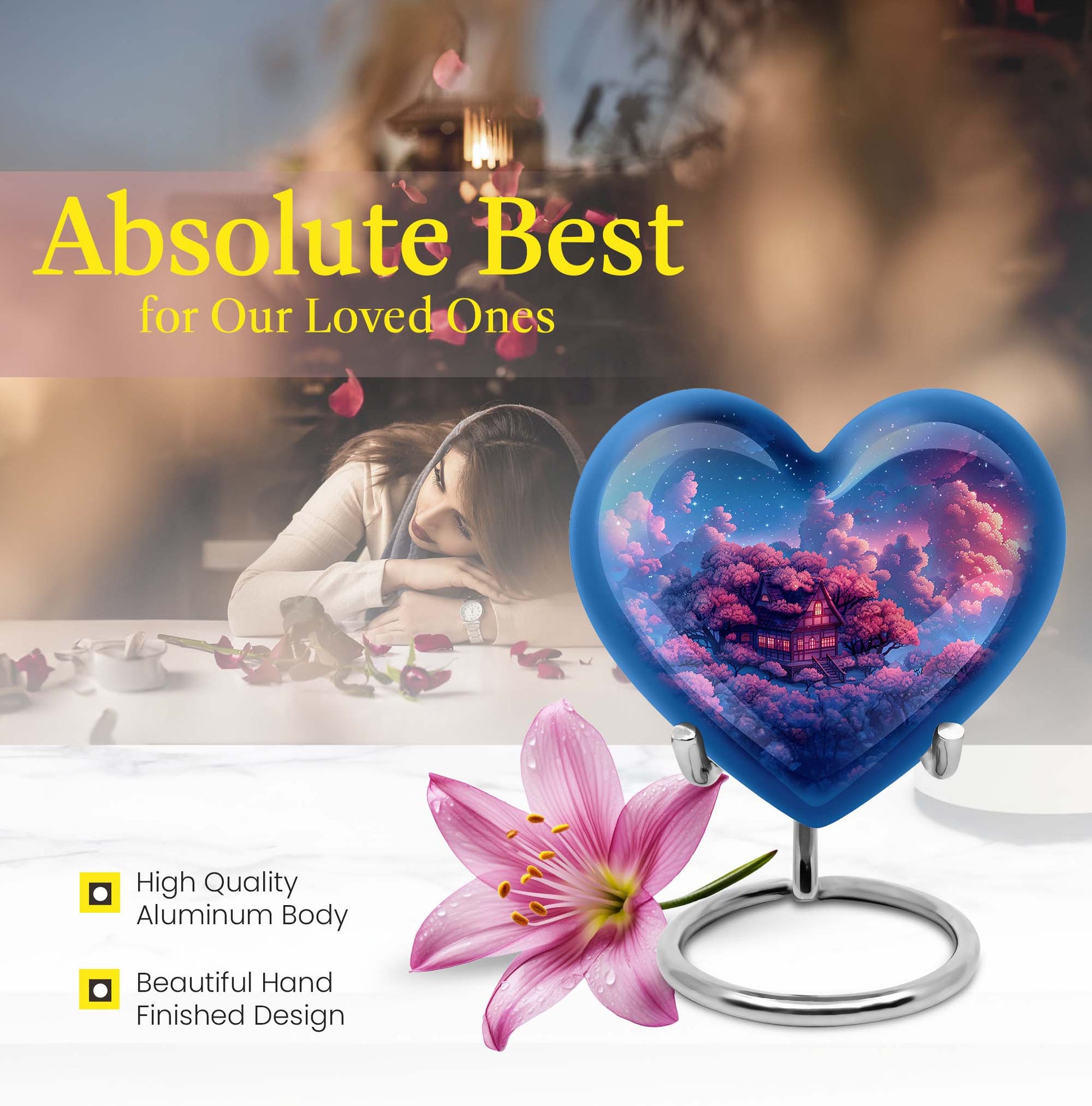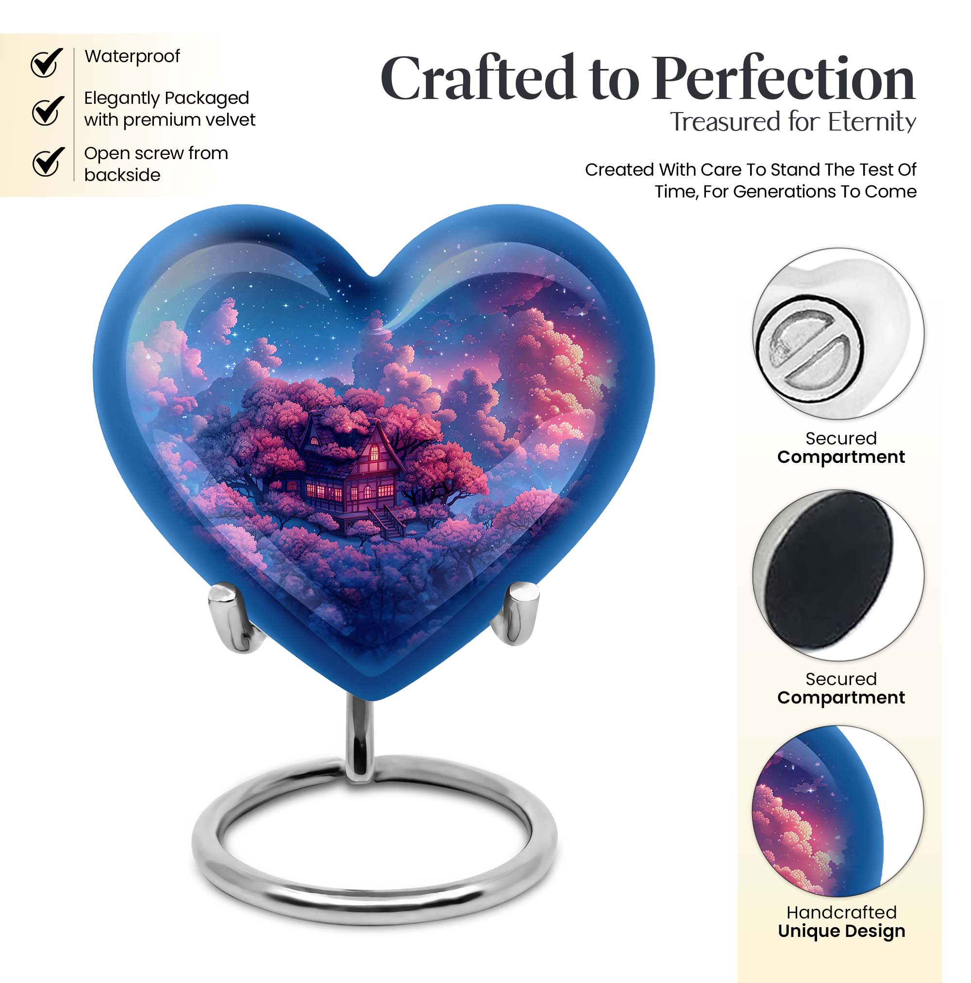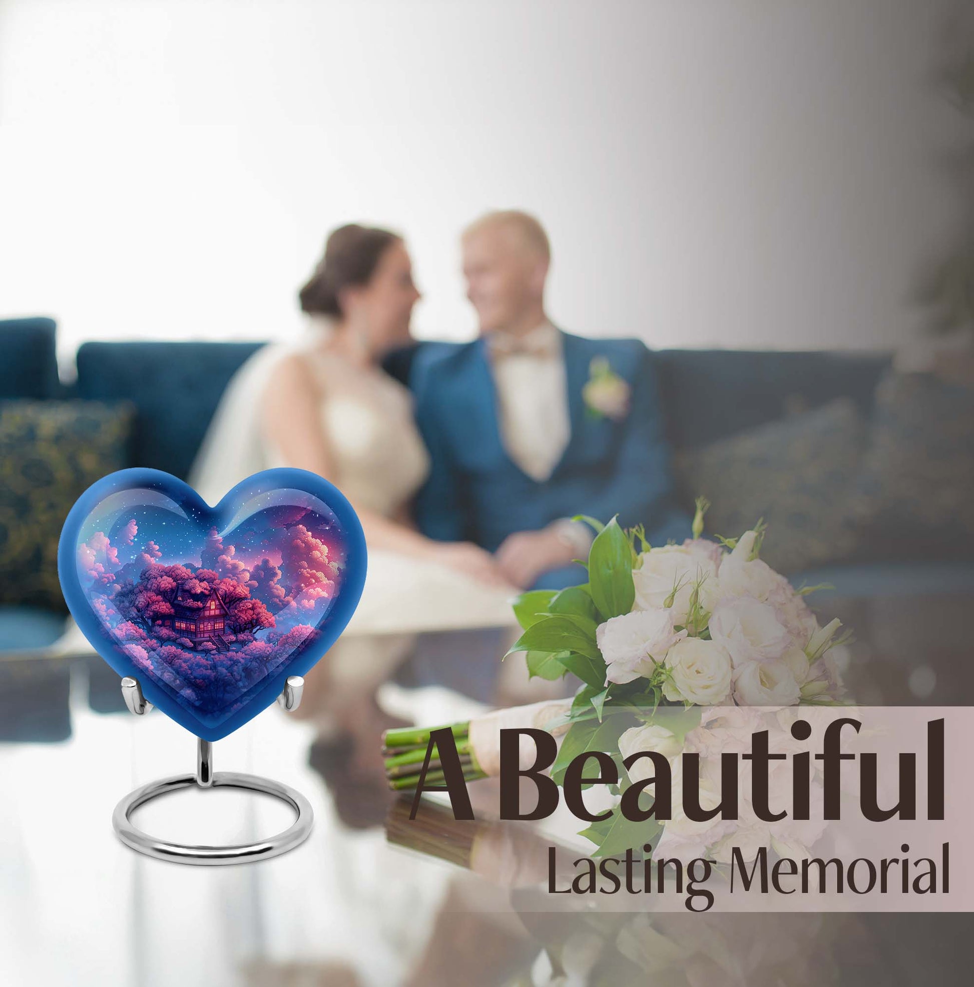 Discover a peaceful, dignified way to remember your loved ones with this quintessential 'Clouds Urn.' This large urn, crafted meticulously from high-quality aluminium, is designed for aged and mature buyers who appreciate the transcendent blend of religious and ceremonial symbols in memorial ceremony supplies. Of eye-catching detail is the heart-shaped urn, elegantly accentuated with a butterfly theme. The urn stands majestically at 10 inches, and weighs a respectable 3.3 pounds. Despite its beauty, the urn’s practical functionality isn’t compromised; it boasts a capacity of 200 cubic inches. For those who value discretion, the urn comes with a velvet pouch designed for the containment of ashes. This urn offers another special feature: you can personalize it with engraved names. The ‘cremation urn,’ is synonymous with funeral burial urns, creating an enduring testament to your devotion and respect for the departed.