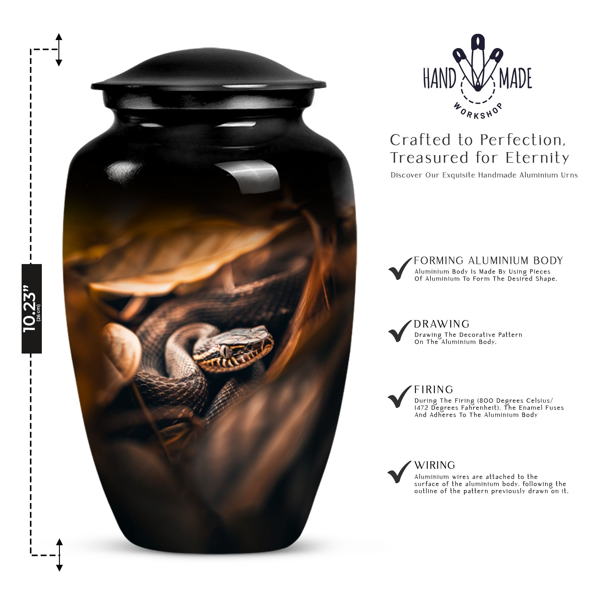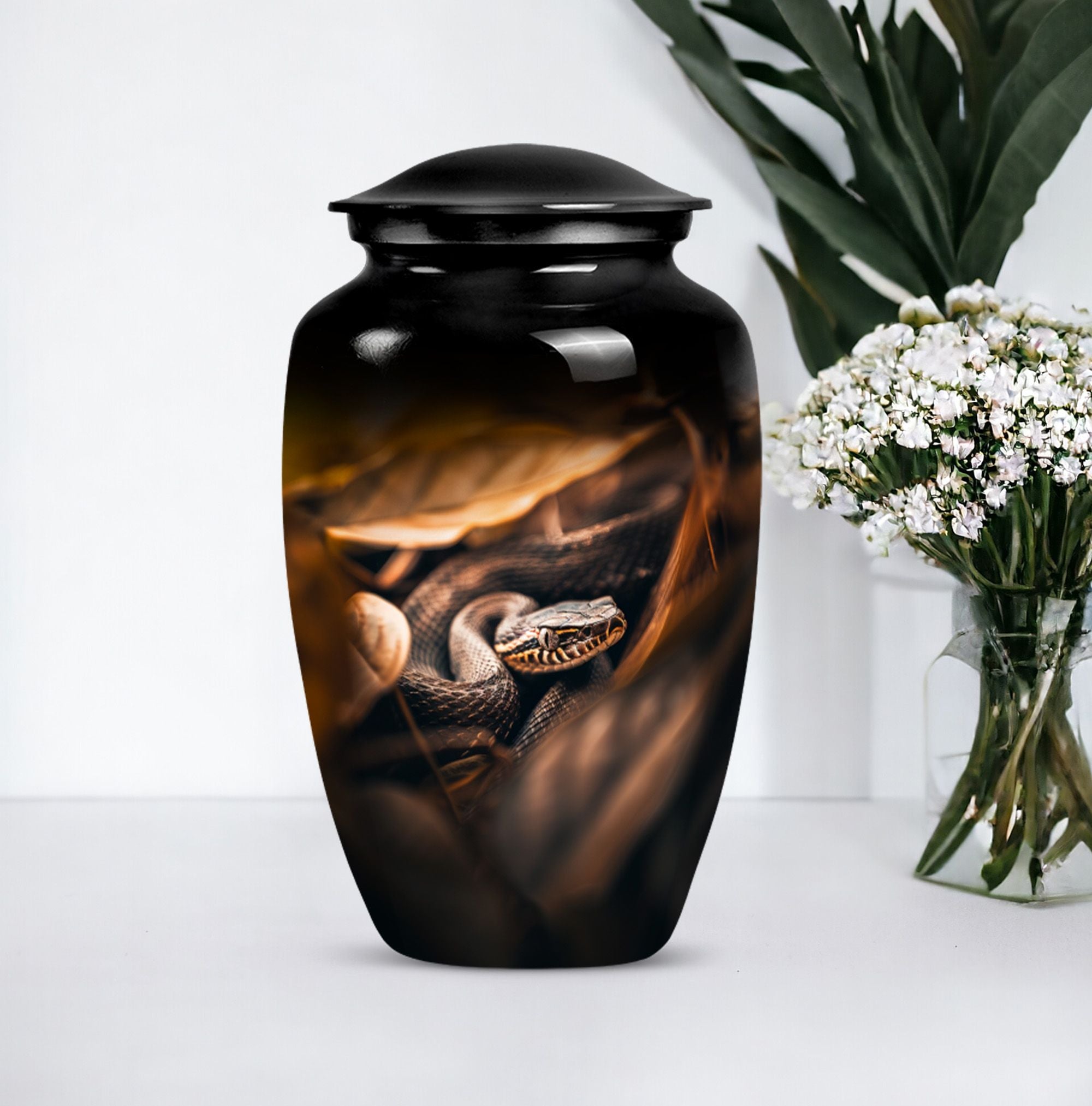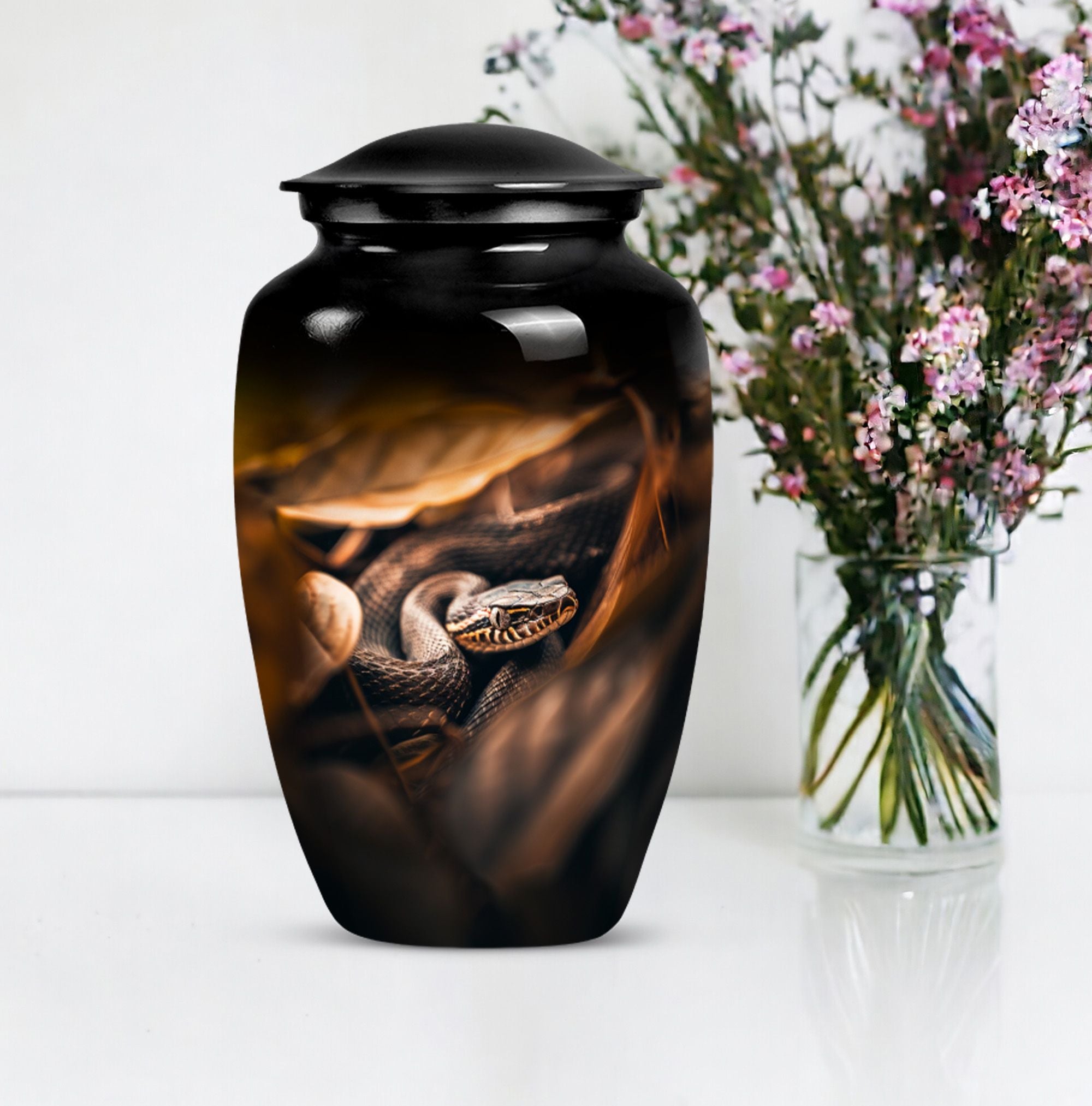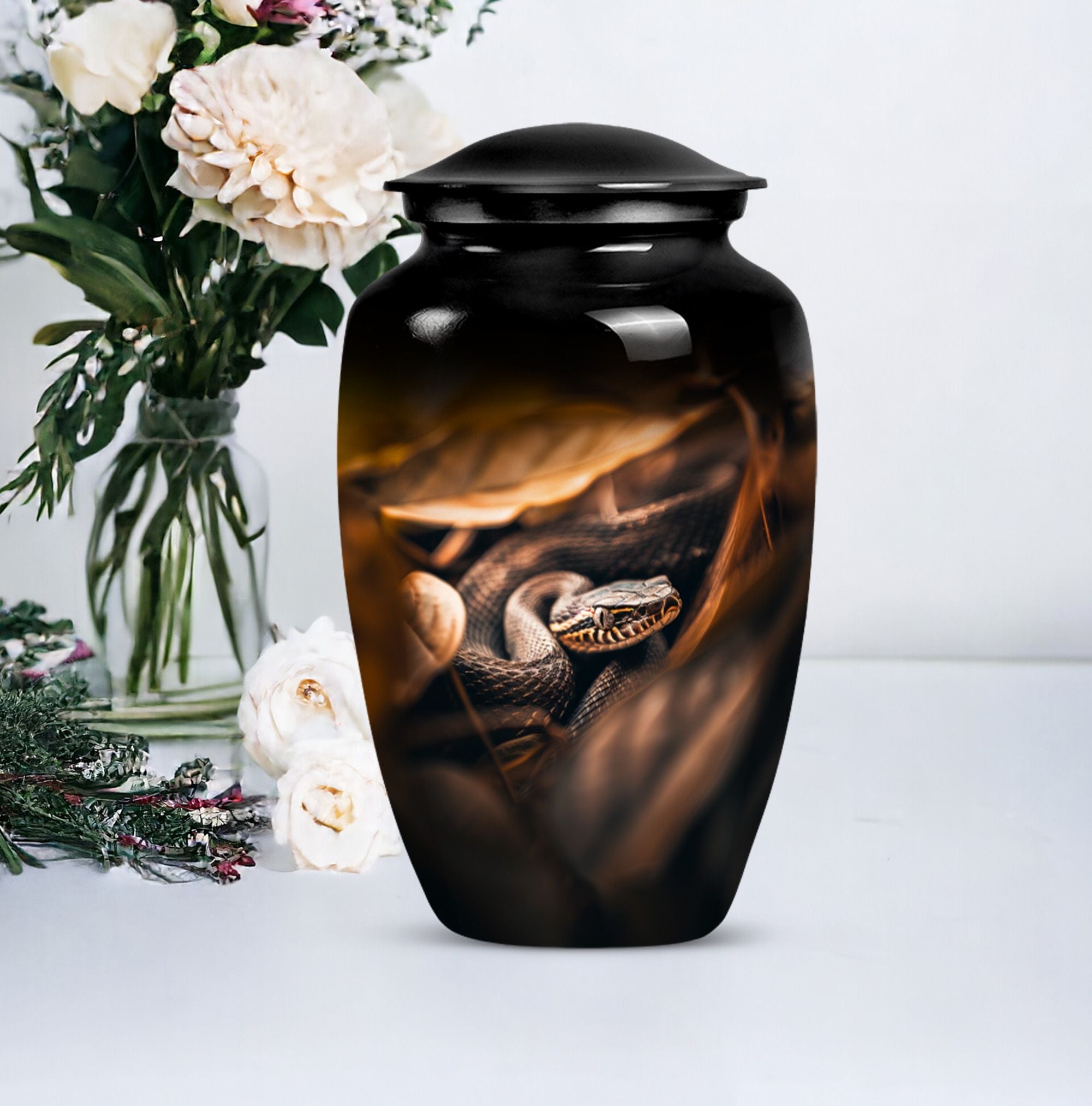 Cherish the memory of a loved one with our exquisite 10-inch, aluminium-made, large-capacity, Snake Urn. This abstract-themed Urn is not just a memorial human urn for ashes, but a true embodiment of reverential devotion and love. It is crafted to hold up to 200 cubic inches of ash, supporting the remains of an adult comfortably. Weighing a mere 3.3 pounds, this cremation urn allows you to securely hold onto treasured memories, without taking too much space. With a classic urn design, our offering aligns with traditional aesthetic styles that are cherished by the majority. As an extra touch, this urn is designed for customization, allowing for names to be delicately engraved onto it. Each package comes with a bonus - a velvet pouch for the containment and preservation of ashes, highlighting your honor towards your loved one. This urn marries affordability with premium quality, function, and emotional value, making it an ideal choice for those mourning the loss of a loved one.