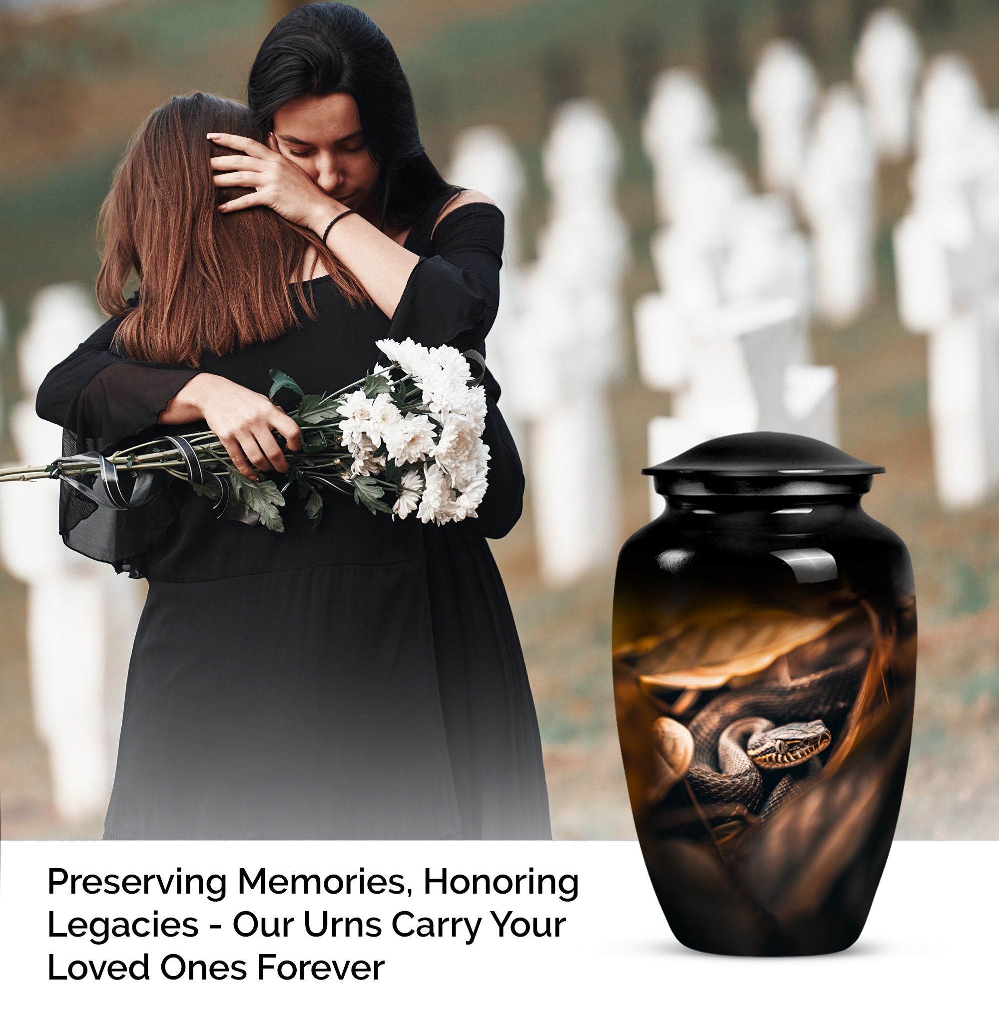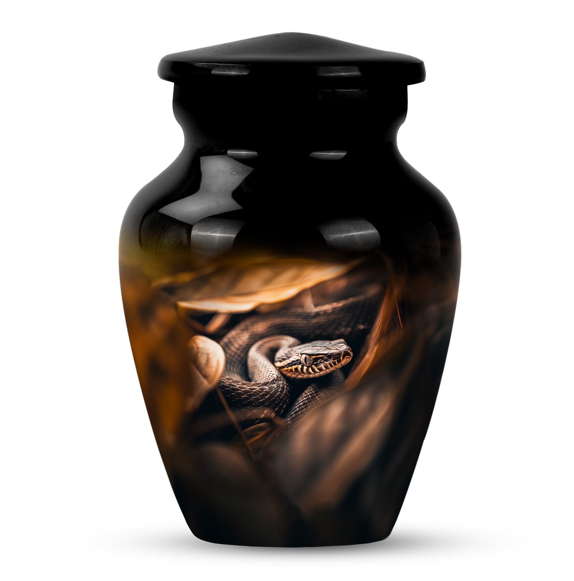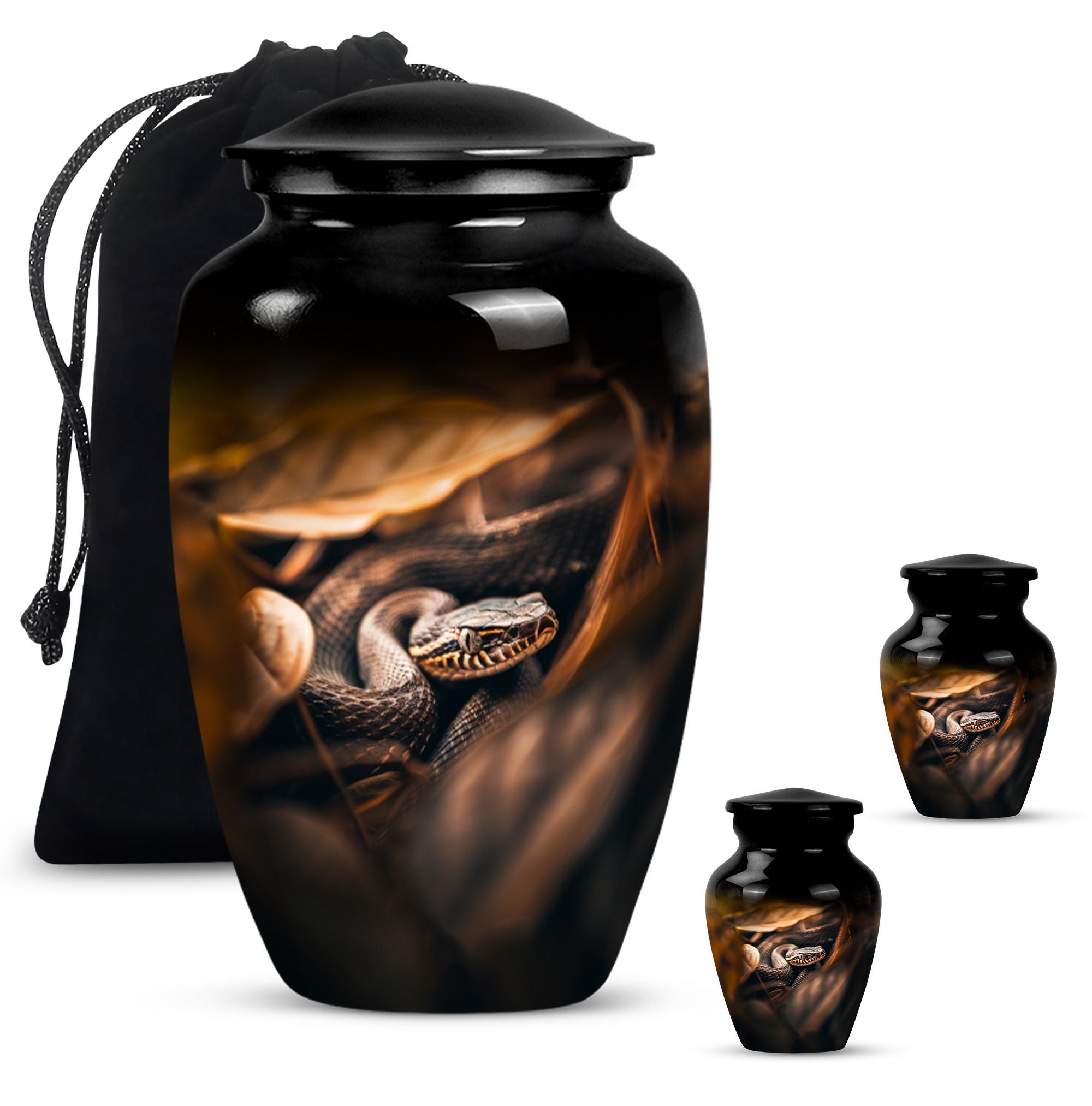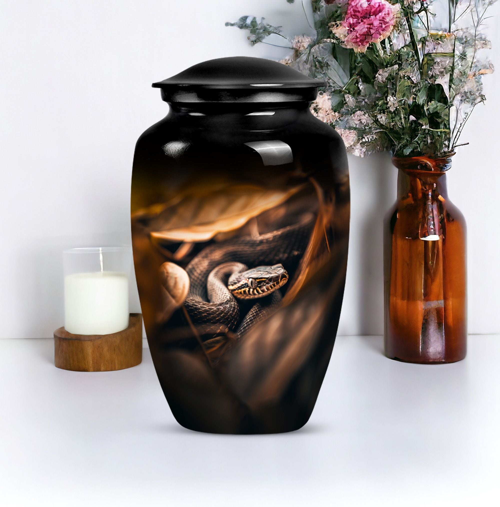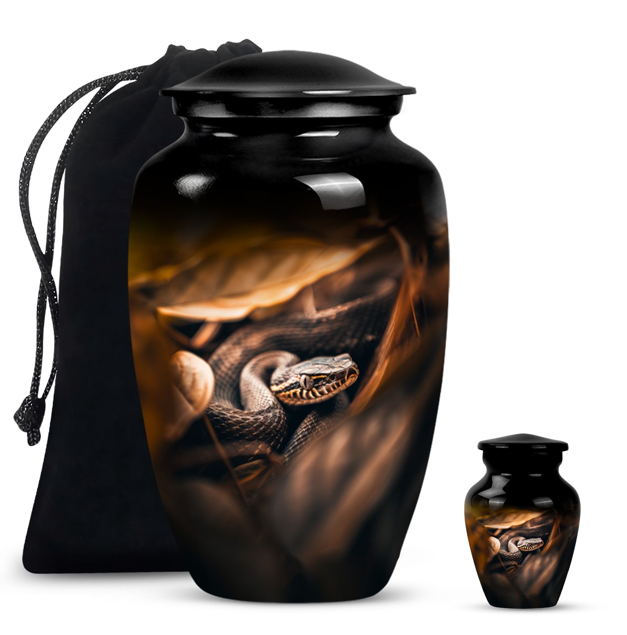 Cherish the memory of a loved one with our exquisite 10-inch, aluminium-made, large-capacity, Snake Urn. This abstract-themed Urn is not just a memorial human urn for ashes, but a true embodiment of reverential devotion and love. It is crafted to hold up to 200 cubic inches of ash, supporting the remains of an adult comfortably. Weighing a mere 3.3 pounds, this cremation urn allows you to securely hold onto treasured memories, without taking too much space. With a classic urn design, our offering aligns with traditional aesthetic styles that are cherished by the majority. As an extra touch, this urn is designed for customization, allowing for names to be delicately engraved onto it. Each package comes with a bonus - a velvet pouch for the containment and preservation of ashes, highlighting your honor towards your loved one. This urn marries affordability with premium quality, function, and emotional value, making it an ideal choice for those mourning the loss of a loved one.