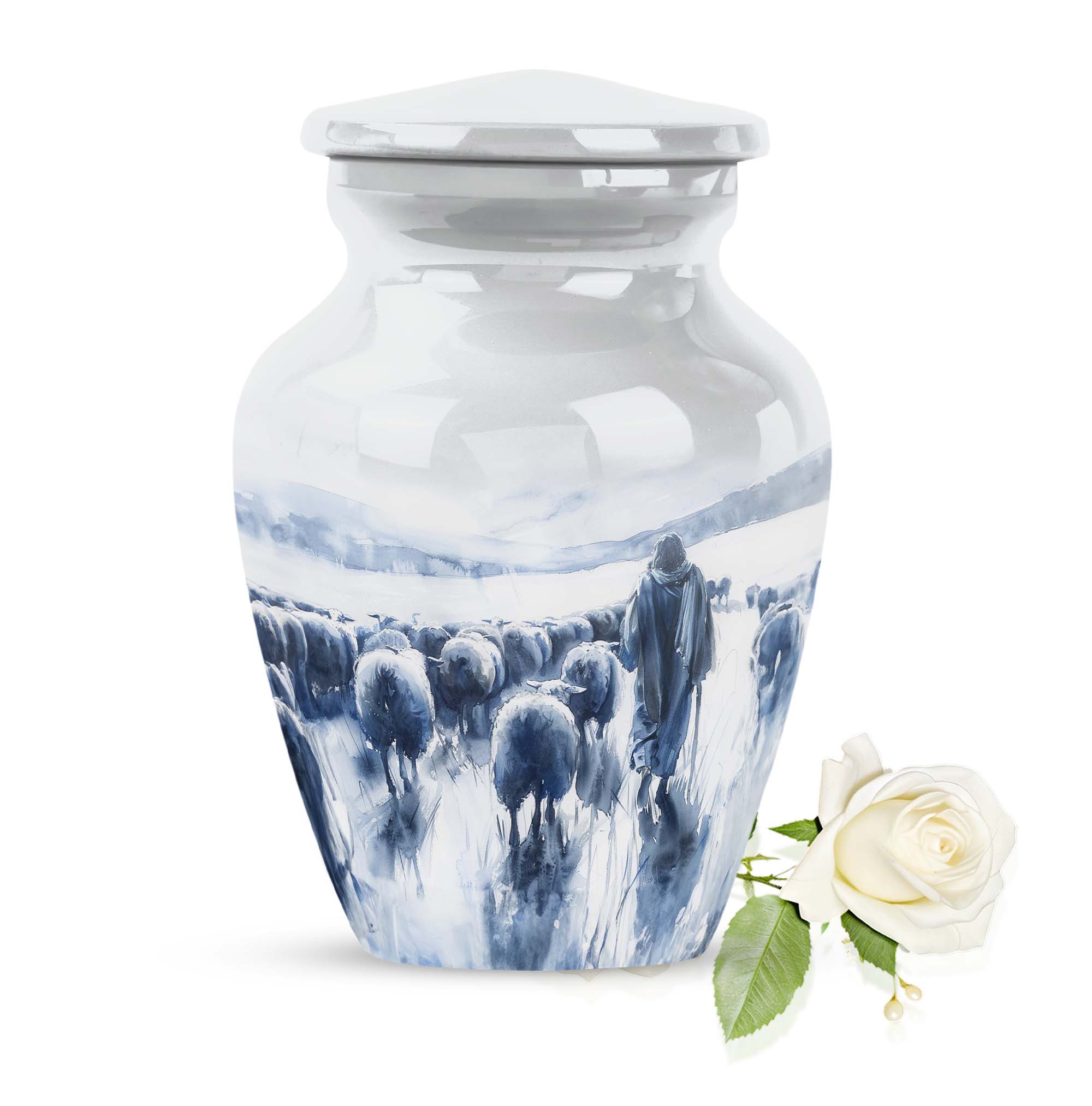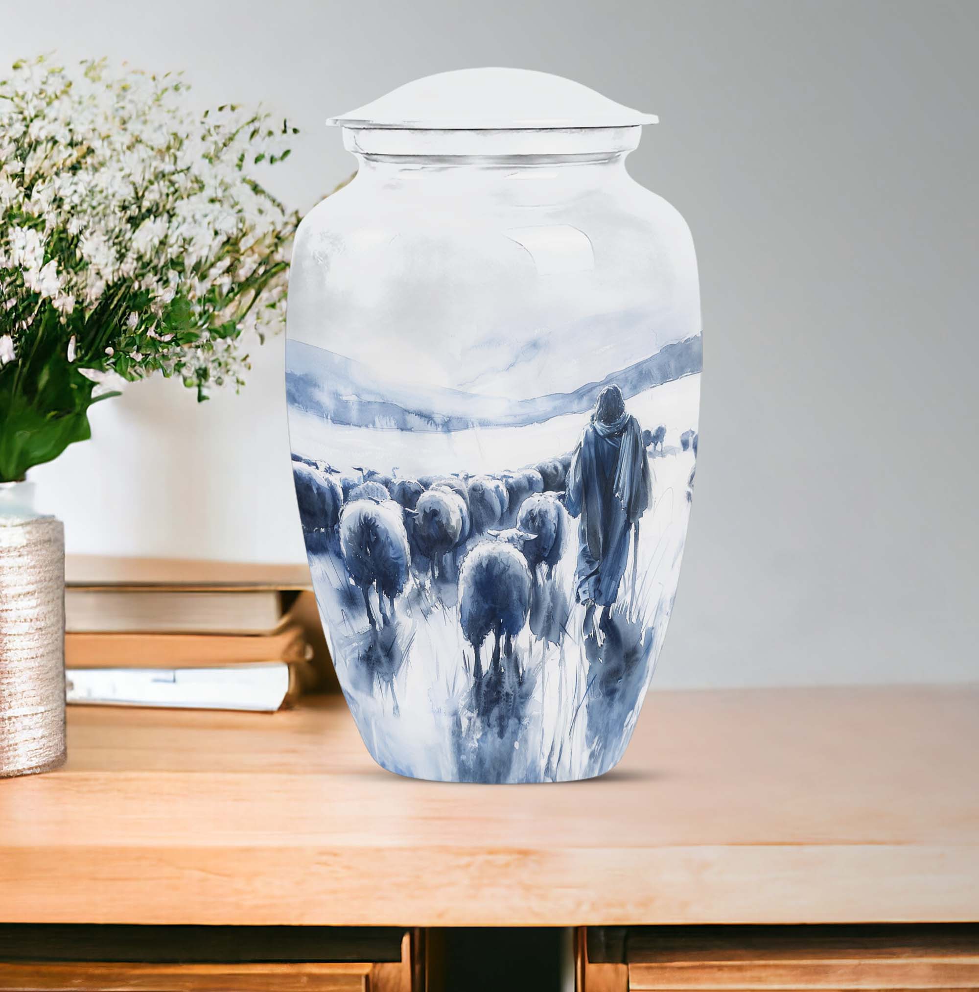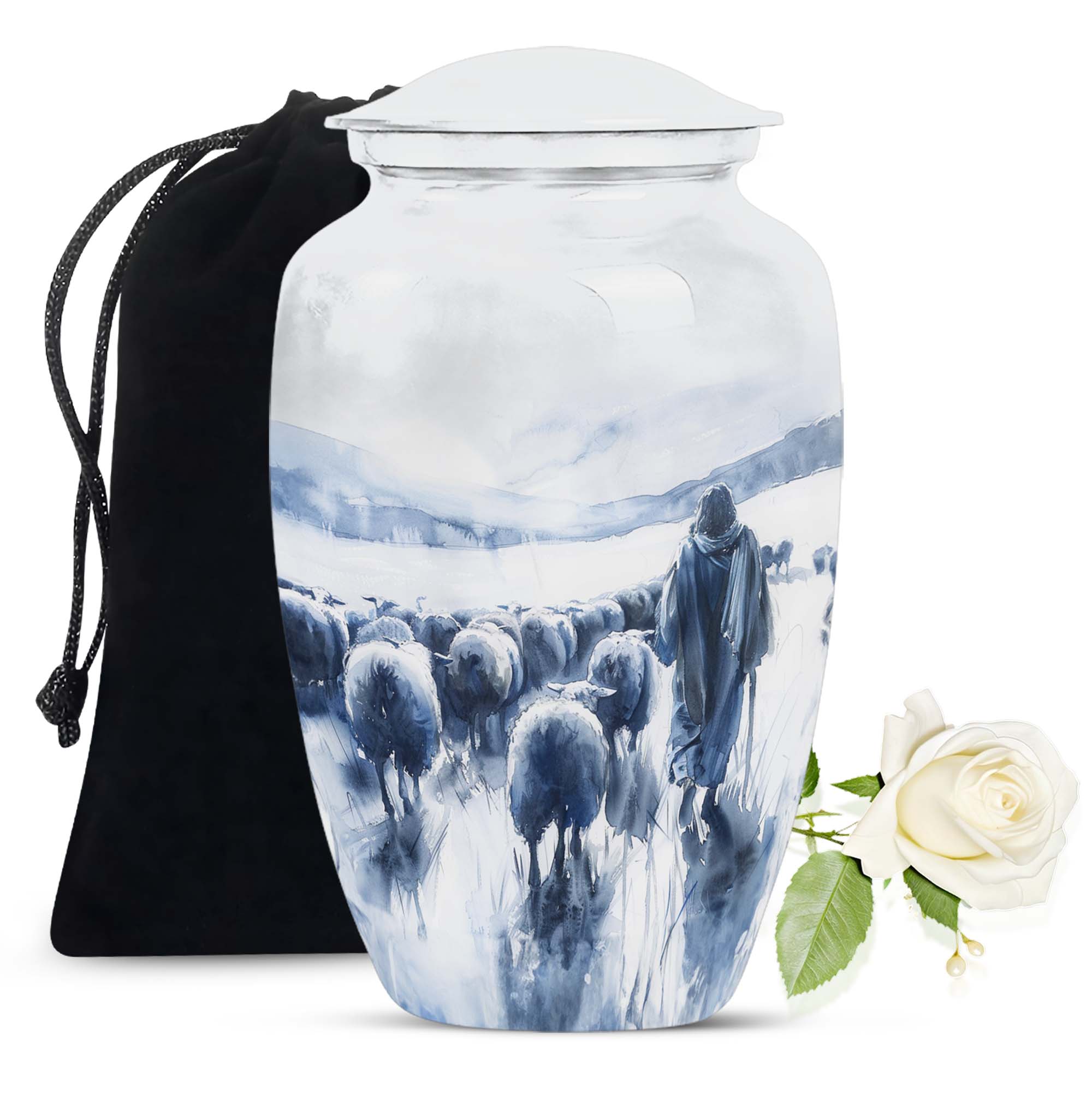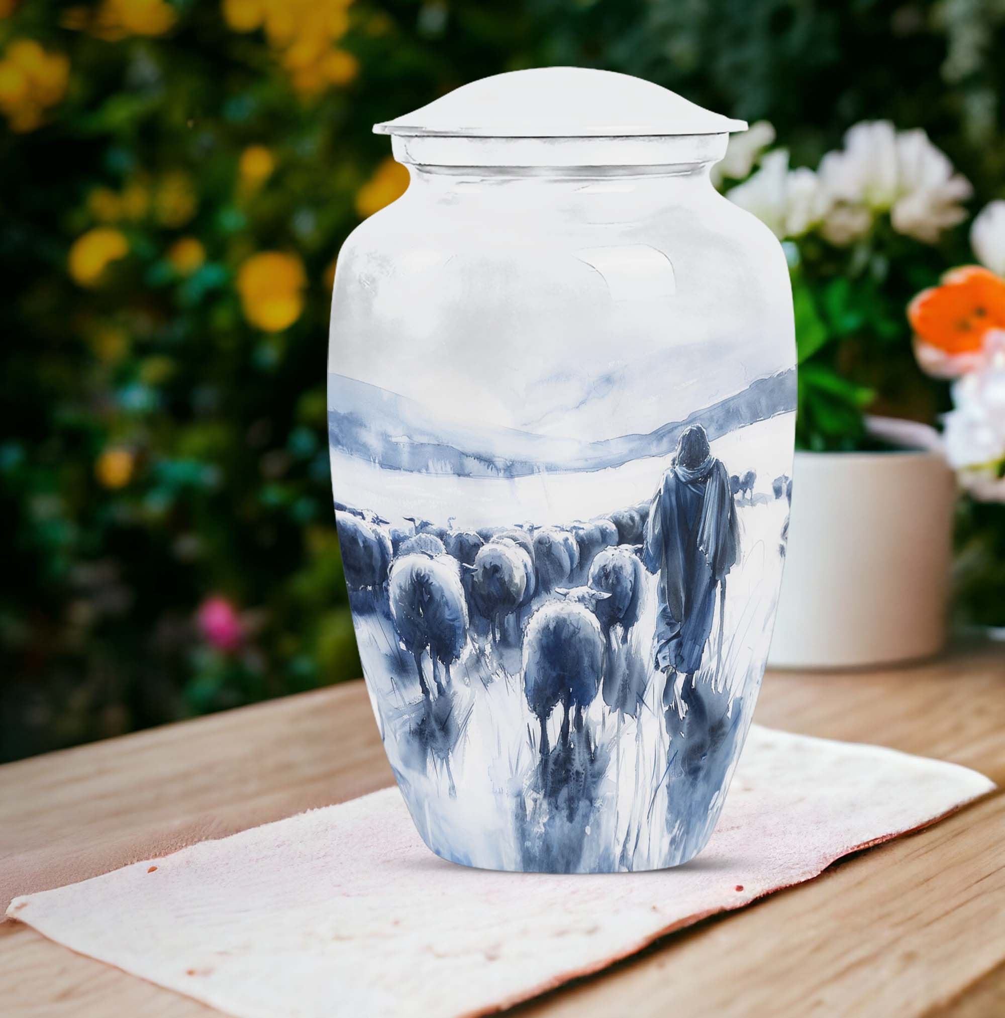 Our Shepherd Urn, a marvellous blend of simplicity and elegance, is perfect for those who are looking for funeral cremation urns for women. Crafted with superior quality aluminium, this large urn stands 10 inches tall and can comfortably contain up to 200 cubic inches of ashes. Its 3.3-pound weight is indicative of its robustness. This urn, which carries an abstract theme, adds a subtle grace to the solemnity of the memorial ceremony. The package also includes a velvet pouch, offering a dignified containment for the ashes. One can personalise it with engraved names, adding a special touch to the urn. The size, material, theme, personalisation feature of our Shepherd Urn make it a popular cremation urn choice. This urn goes beyond just its practical use, it helps you keep your loved ones close even in their absence. Add our Shepherd Urn to your memorial ceremony supplies for a unique, personalised, and thoughtful tribute.