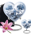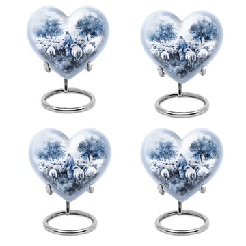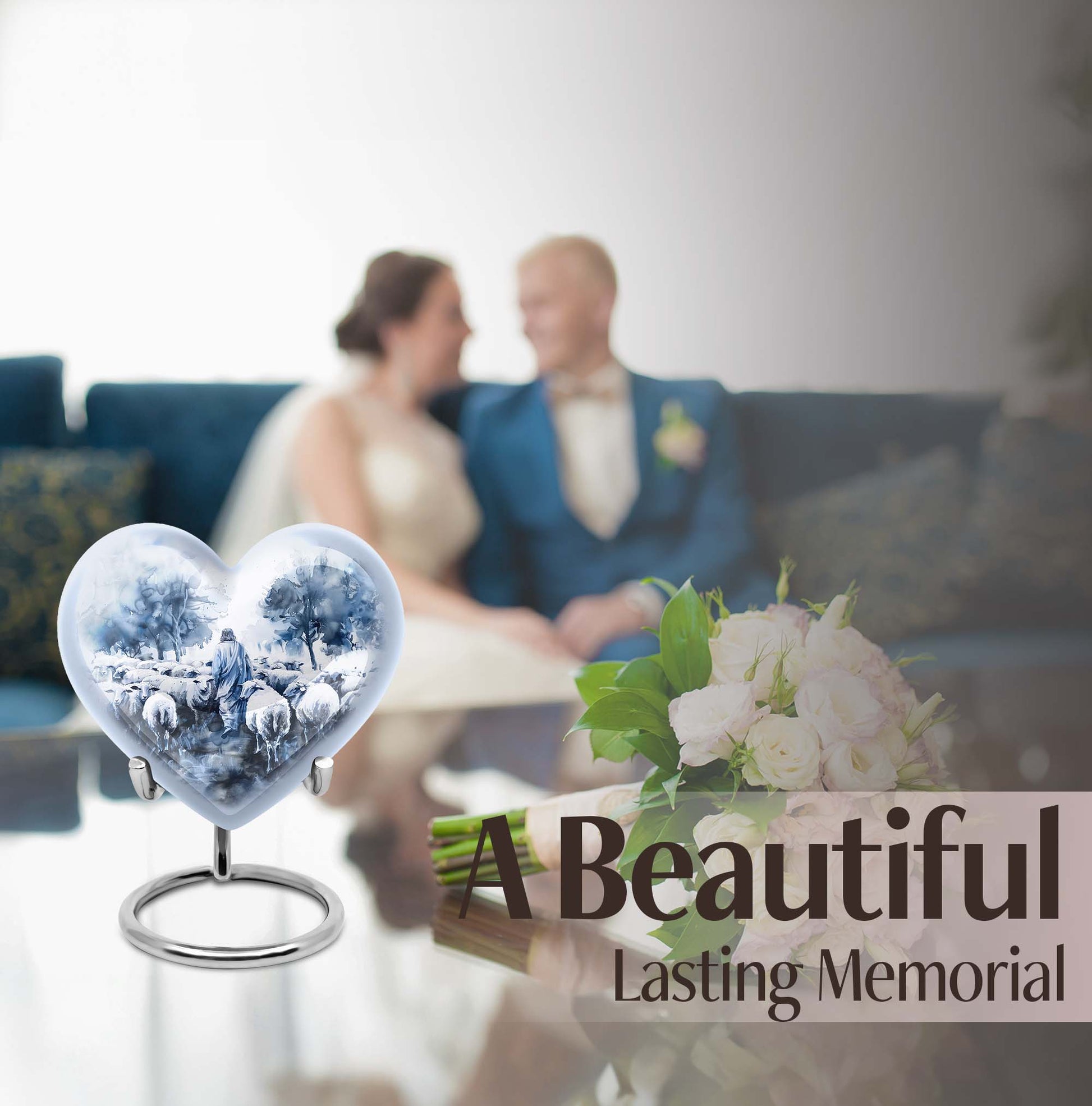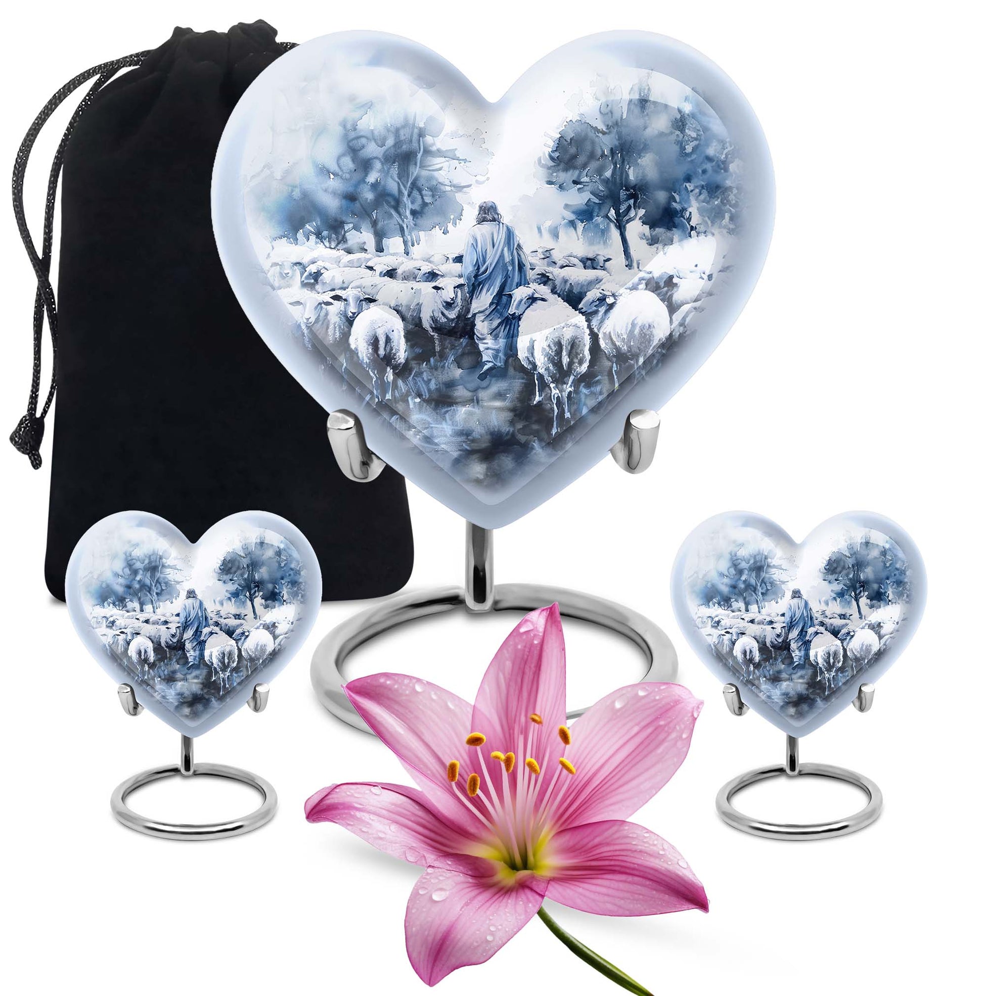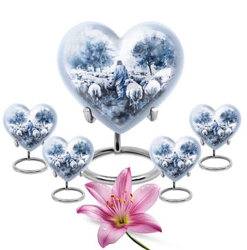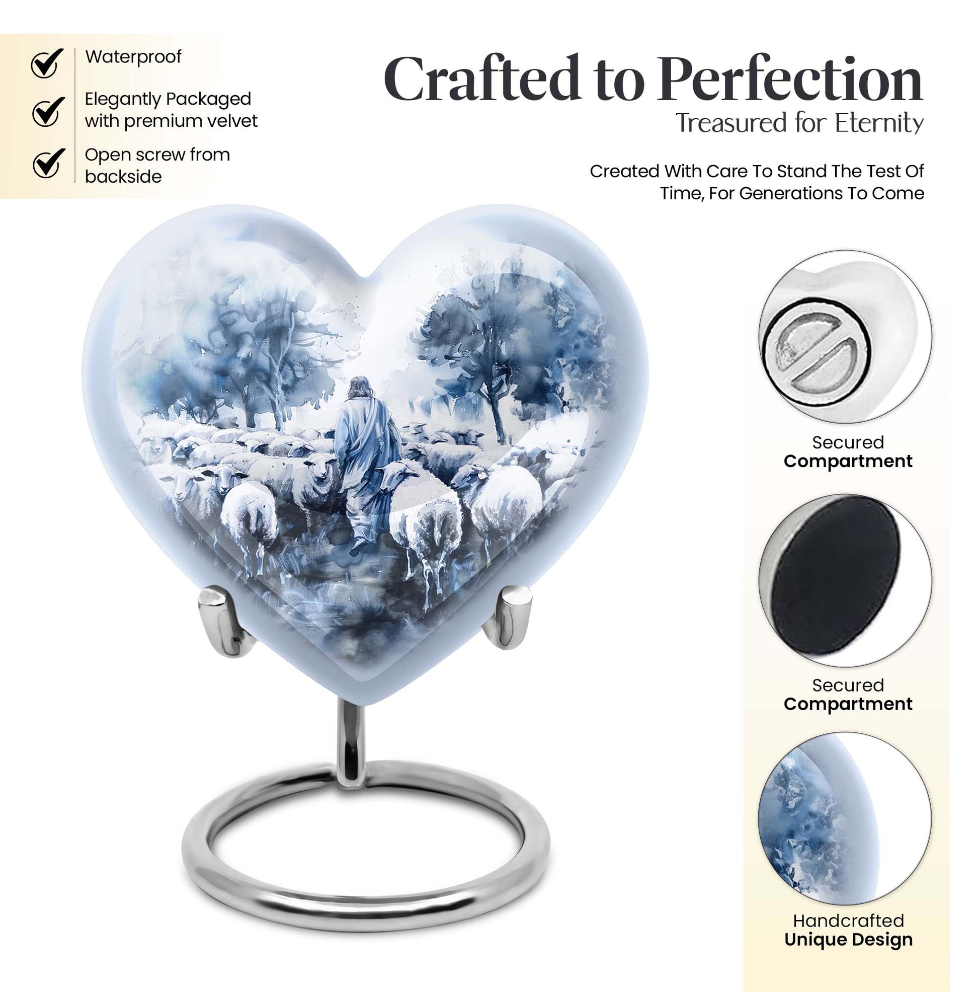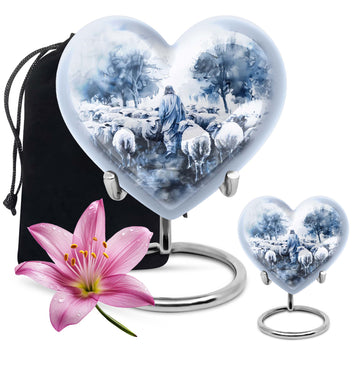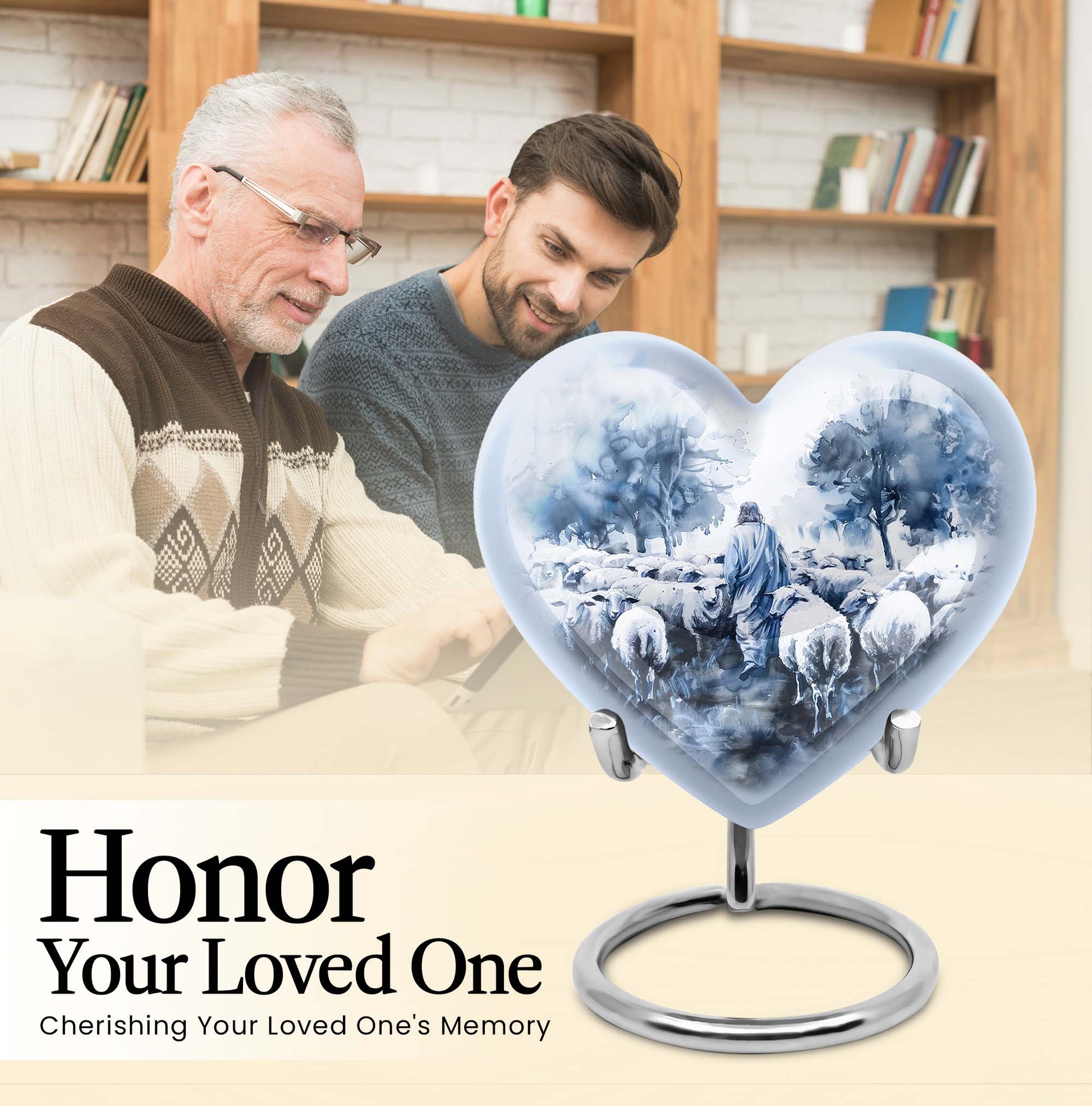Cherish the memory of your loved ones with this exquisite Shepherd Urn. Crafted from premium 'Aluminium', the Heart Urn is sturdy, weighing 3.3 pounds and standing at a height of 10 inches, it is an ideally large urn for cremation ashes. The urn offers an impressive capacity of 200 cubic inches, ensuring a secure space for your loved one's ashes. Adding to our commitment to honoring your cherished memories, this item comes with a soft, velvet pouch for dignified containment of the ashes. Engage with the unique abstract theme of the urn, which sets it apart from conventional designs. Personalize this cremation urn with engraved names to create a meaningful tribute to those missed. Perfect for adults and seniors interested in religious and ceremonial burial large urns, this ash adult funeral urn will serve as a resonant reminder of a life well-lived. Note, in terms of size, it measures 10 inches, making its presence a memorable one.