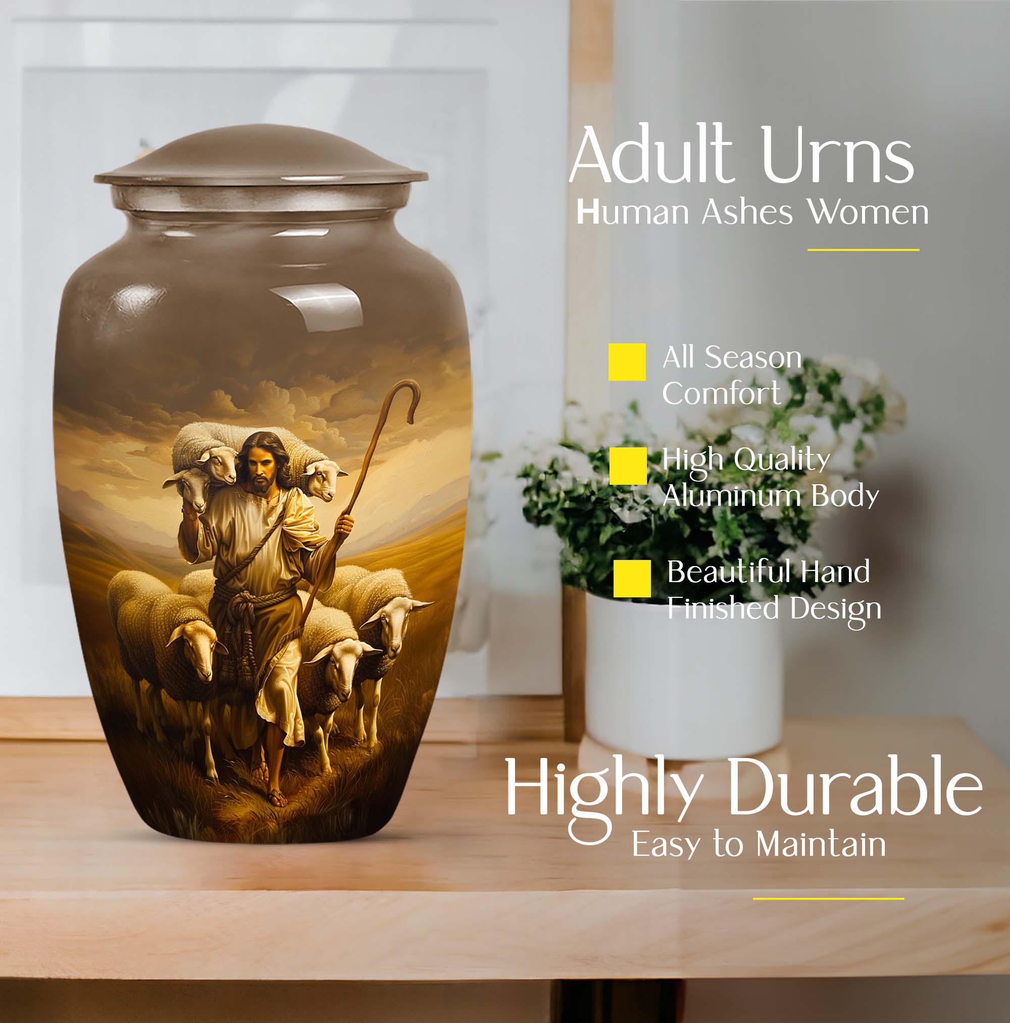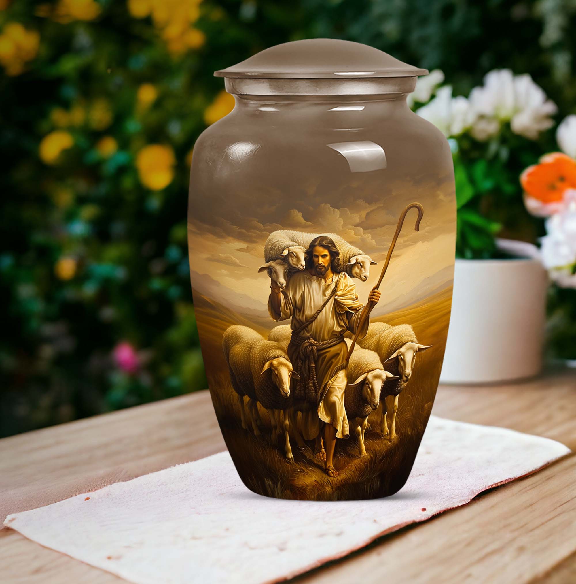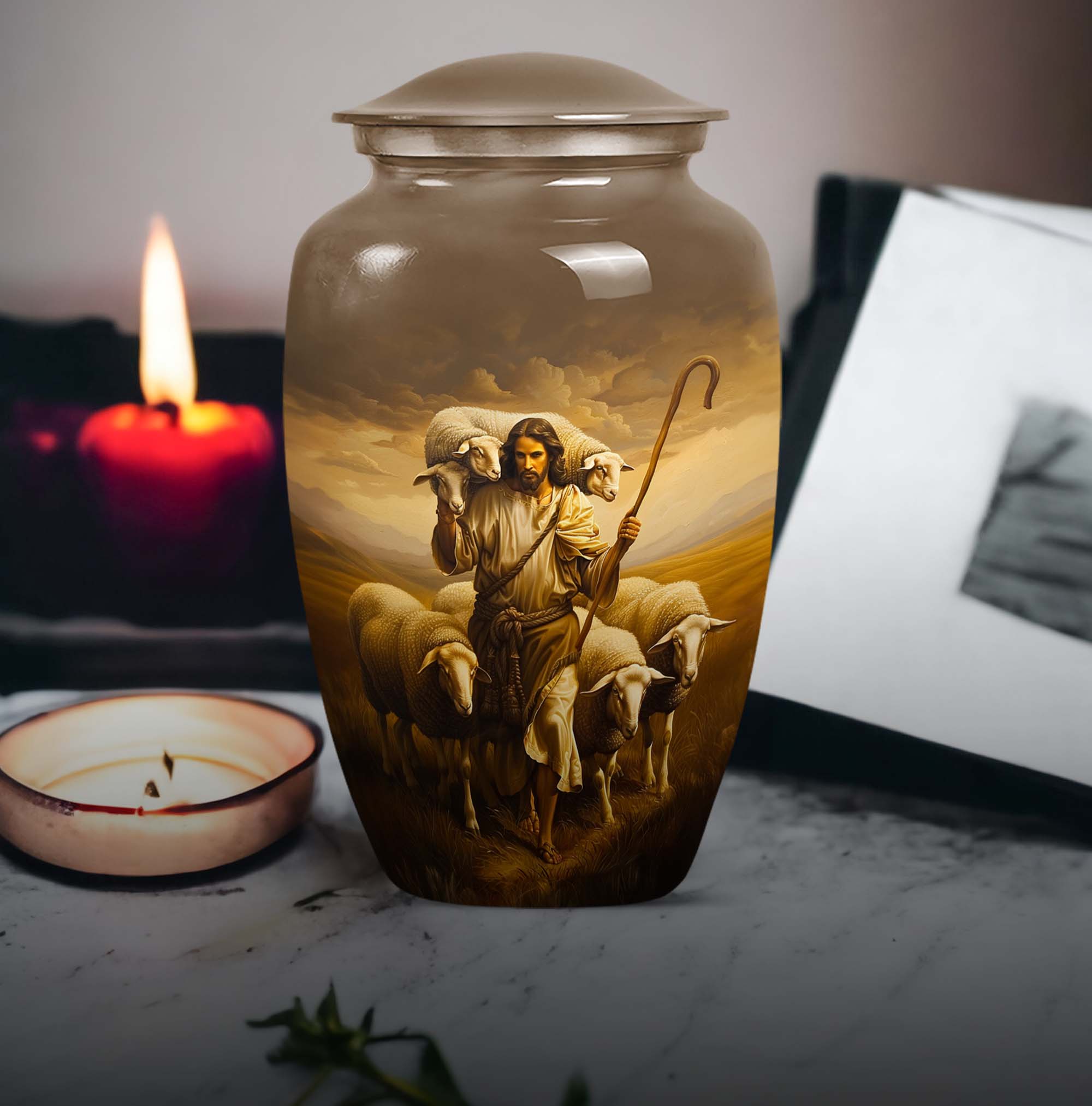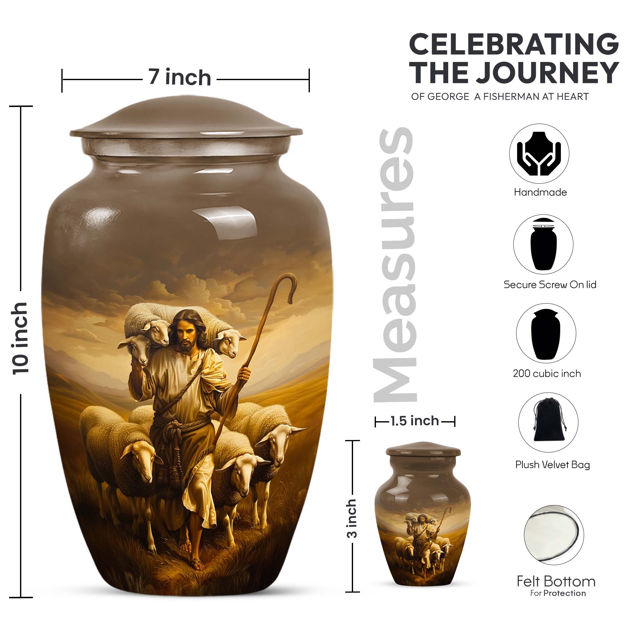 Introducing our captivating Shepherd Urn, a perfect memorial piece for cherishing the memory of your loved ones. Our large urns for ashes offer an enormous size of 10 inches, perfect for adult needs. The urn expresses an abstract theme, delicately hewn from solid aluminium, for long-lasting durability and elegance. This handcrafted item weighs a mere 3.3 pounds, providing a sturdy yet lightweight place of rest. Our large urns for ashes boast a generous capacity, holding up to 200 cubic inches, making it the ideal choice for funeral ceremonies. Every purchase comes complete with a lush velvet pouch, accommodating the safe containment of ashes. To make each urn unique, we provide a personalization service, where you can engrave the names on the urn. Please note that our products exclude any typical 'Classic Urn' design. Our Shepherd urns truly cater to artistics souls seeking unique, yet dignified memorial urns.