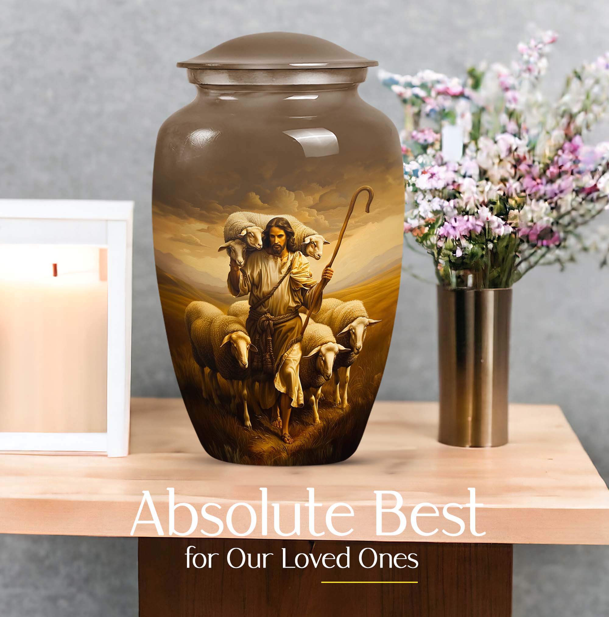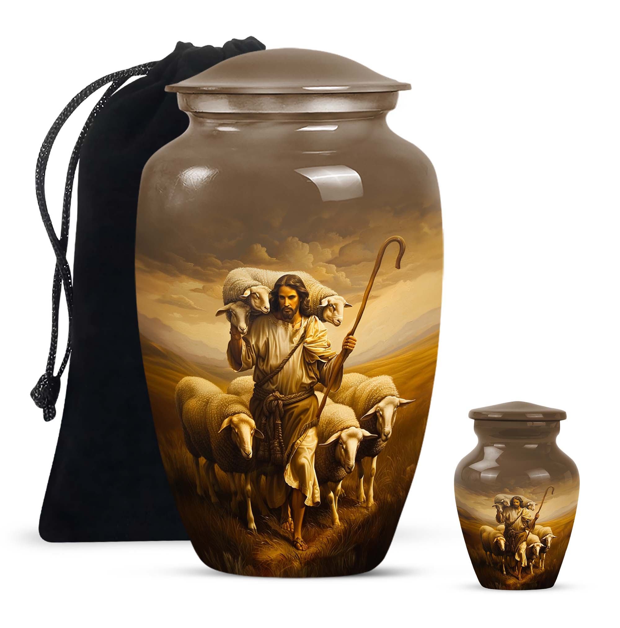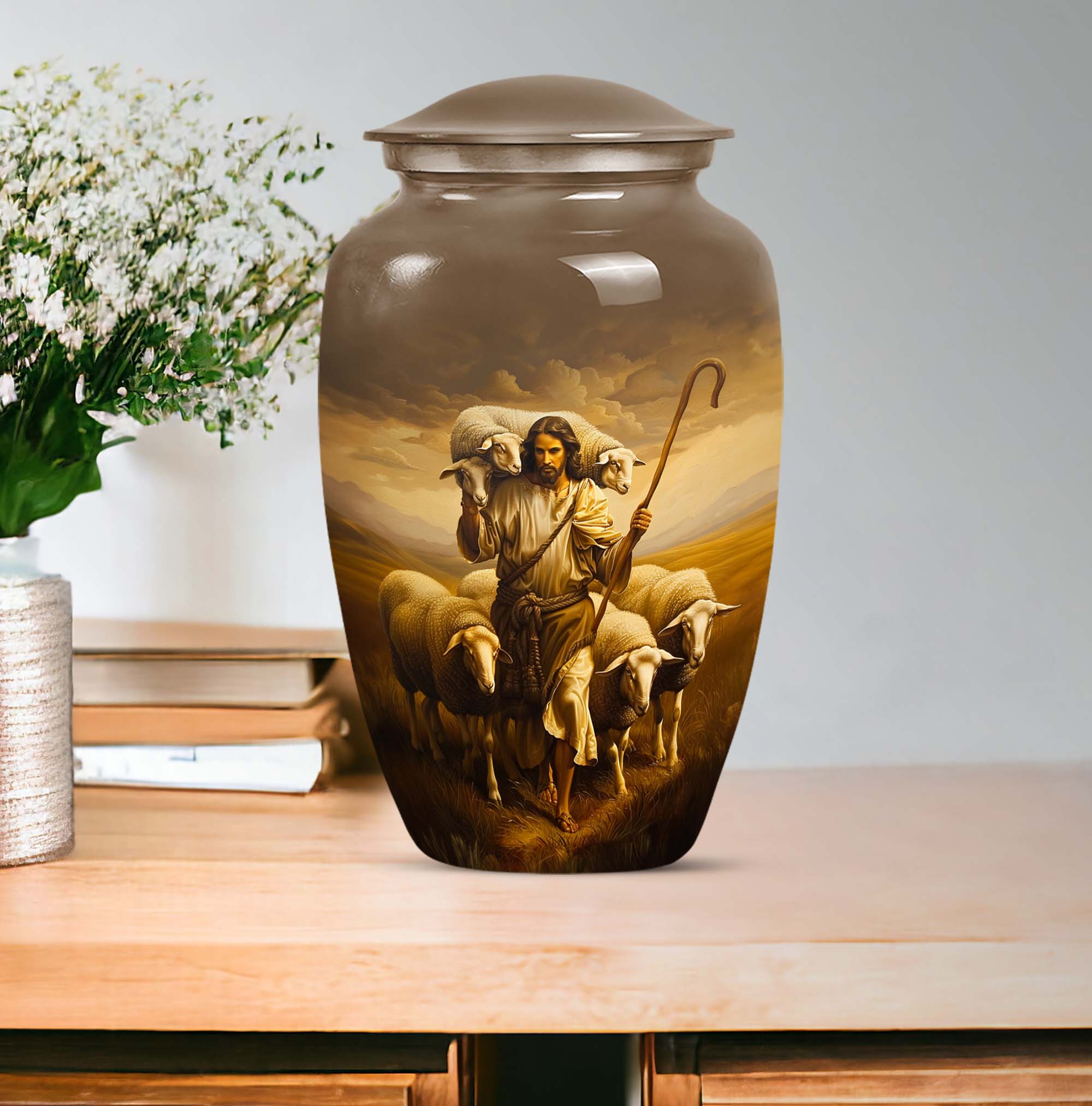 Introducing our captivating Shepherd Urn, a perfect memorial piece for cherishing the memory of your loved ones. Our large urns for ashes offer an enormous size of 10 inches, perfect for adult needs. The urn expresses an abstract theme, delicately hewn from solid aluminium, for long-lasting durability and elegance. This handcrafted item weighs a mere 3.3 pounds, providing a sturdy yet lightweight place of rest. Our large urns for ashes boast a generous capacity, holding up to 200 cubic inches, making it the ideal choice for funeral ceremonies. Every purchase comes complete with a lush velvet pouch, accommodating the safe containment of ashes. To make each urn unique, we provide a personalization service, where you can engrave the names on the urn. Please note that our products exclude any typical 'Classic Urn' design. Our Shepherd urns truly cater to artistics souls seeking unique, yet dignified memorial urns.
