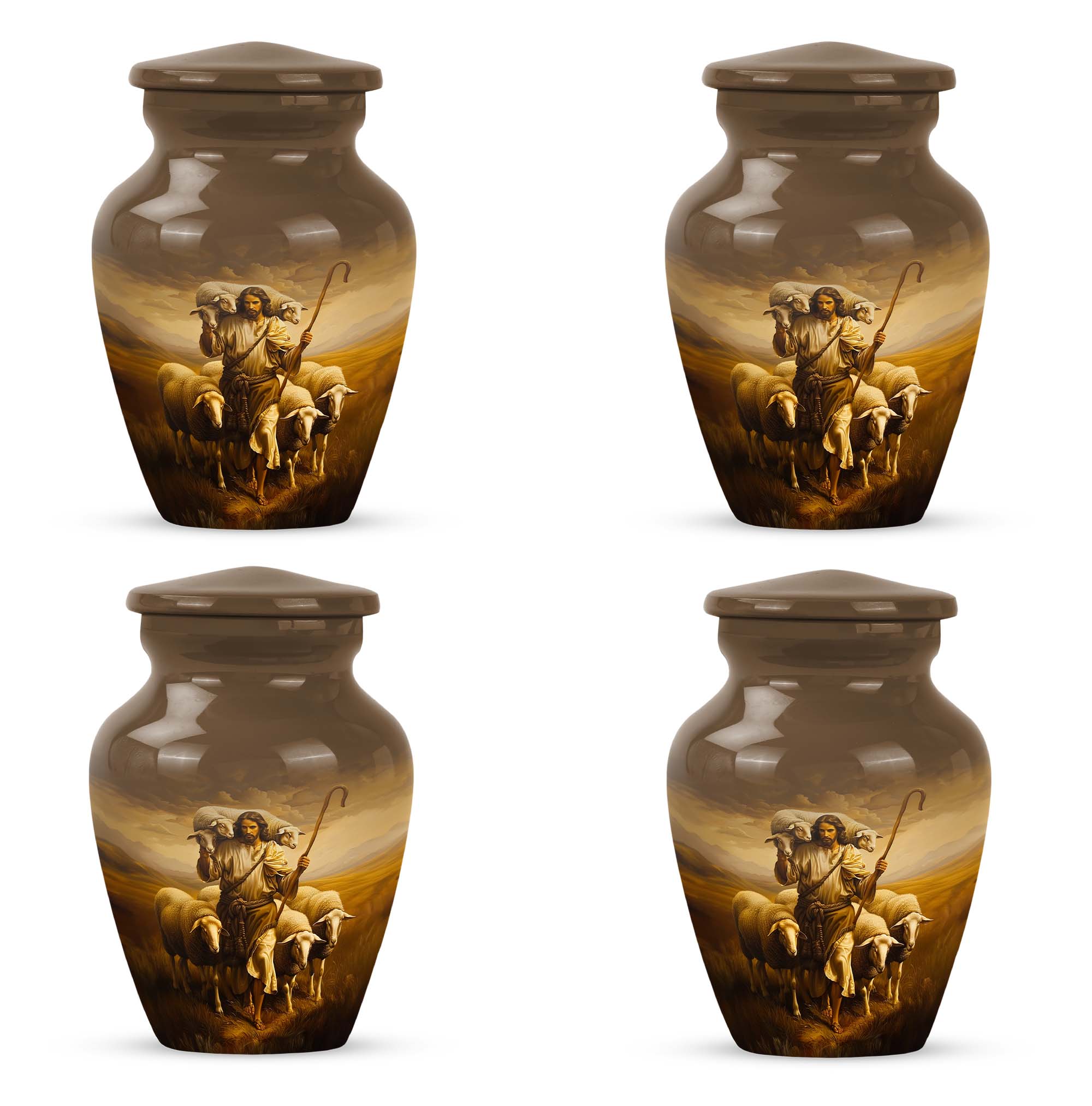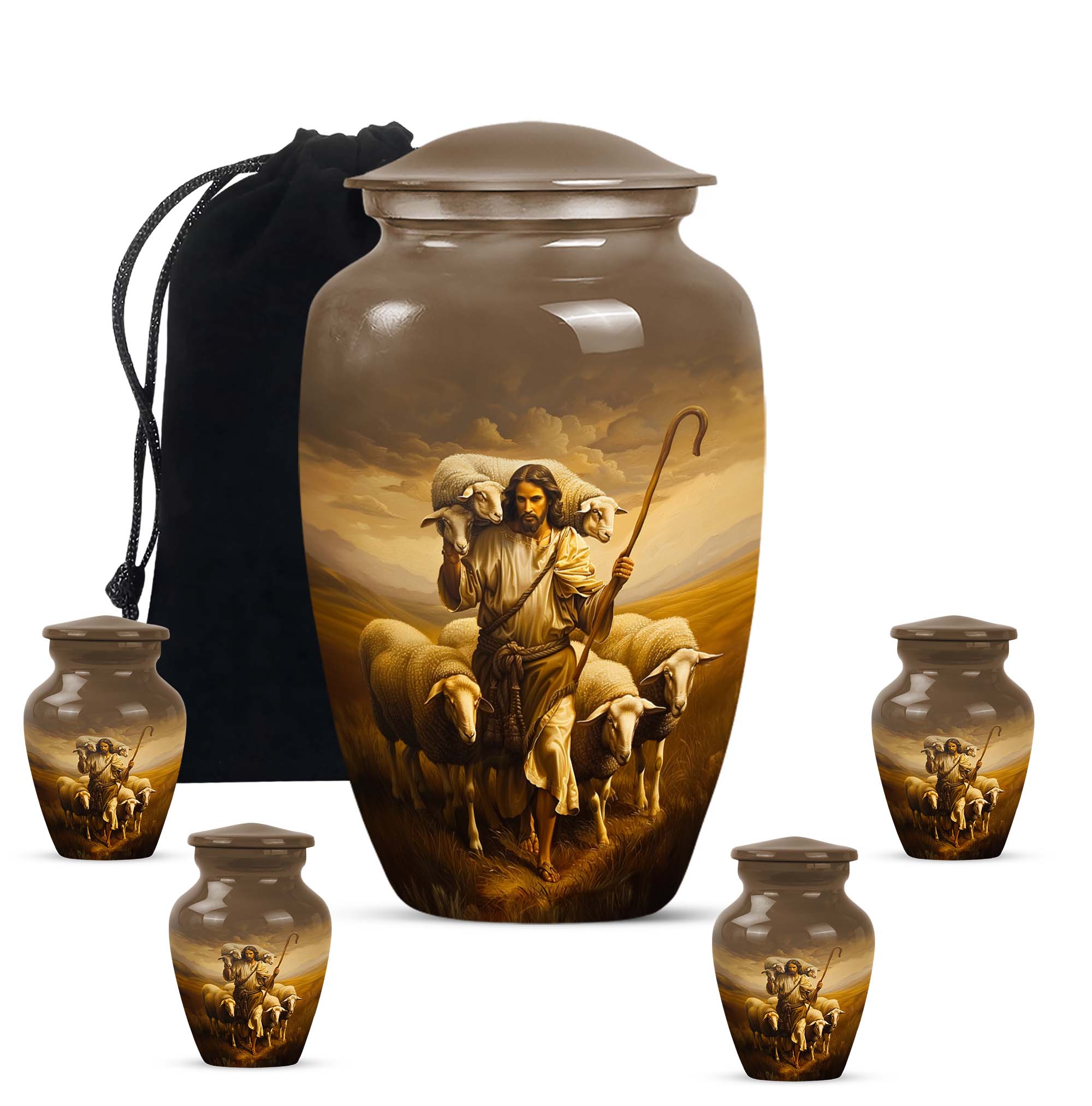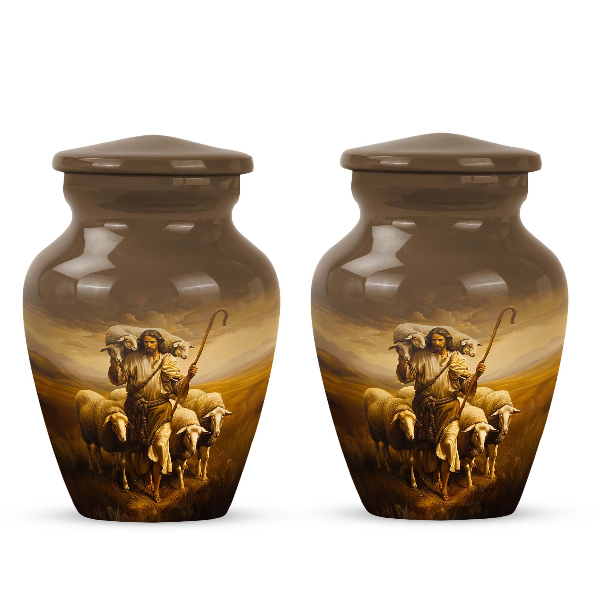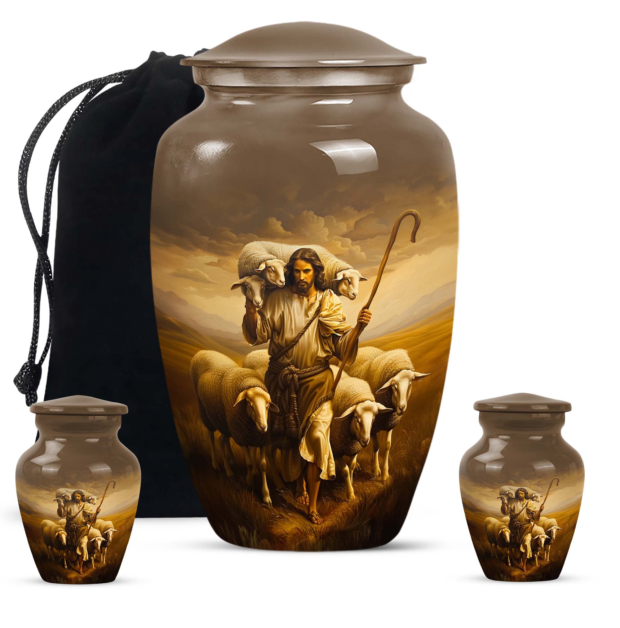 Introducing our captivating Shepherd Urn, a perfect memorial piece for cherishing the memory of your loved ones. Our large urns for ashes offer an enormous size of 10 inches, perfect for adult needs. The urn expresses an abstract theme, delicately hewn from solid aluminium, for long-lasting durability and elegance. This handcrafted item weighs a mere 3.3 pounds, providing a sturdy yet lightweight place of rest. Our large urns for ashes boast a generous capacity, holding up to 200 cubic inches, making it the ideal choice for funeral ceremonies. Every purchase comes complete with a lush velvet pouch, accommodating the safe containment of ashes. To make each urn unique, we provide a personalization service, where you can engrave the names on the urn. Please note that our products exclude any typical 'Classic Urn' design. Our Shepherd urns truly cater to artistics souls seeking unique, yet dignified memorial urns.