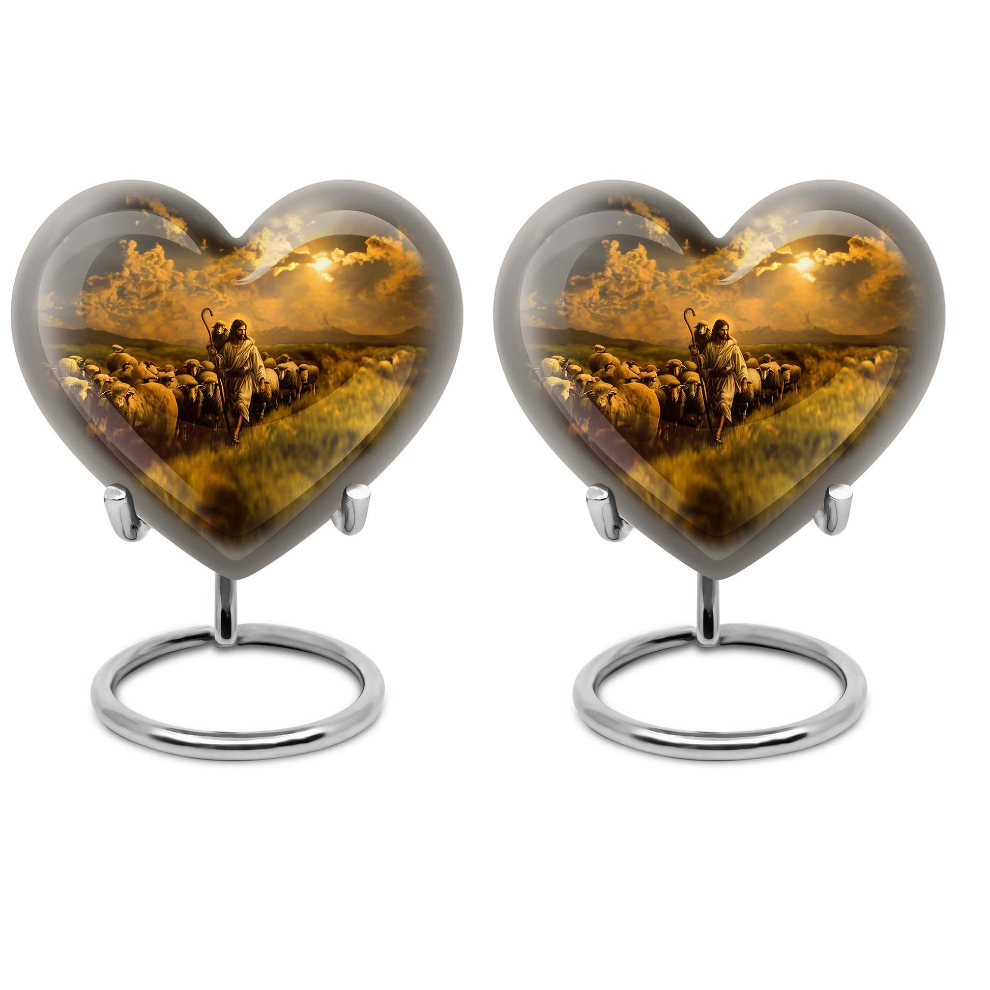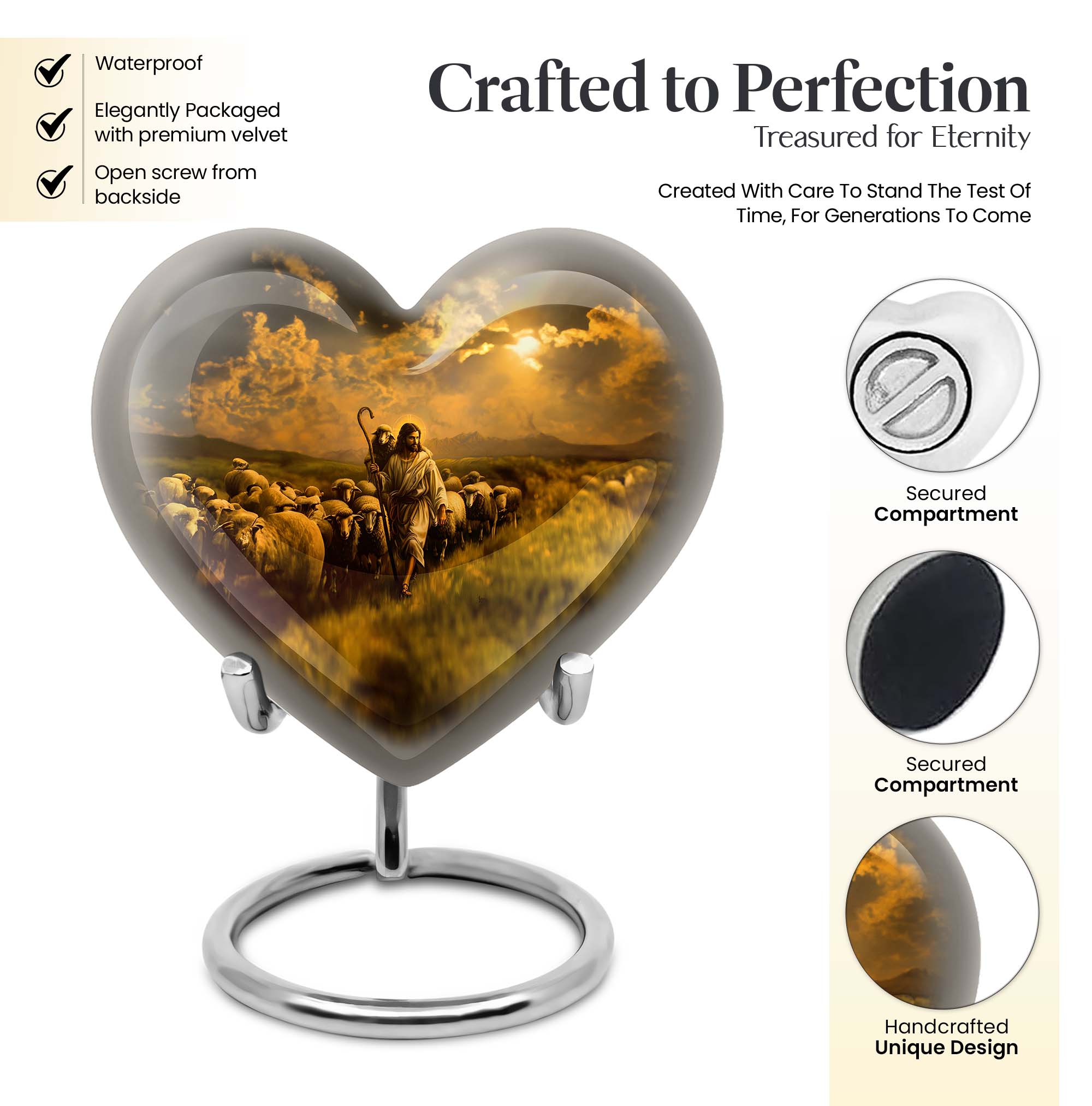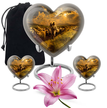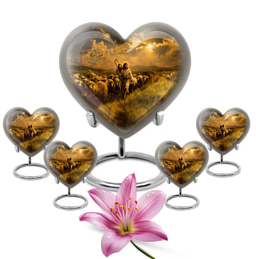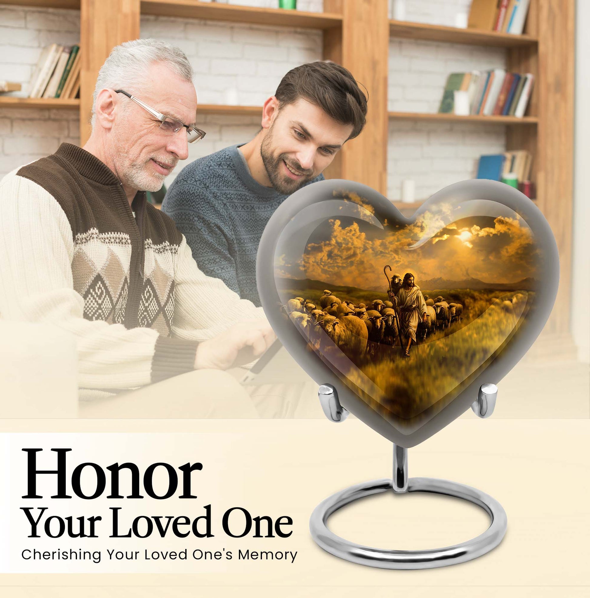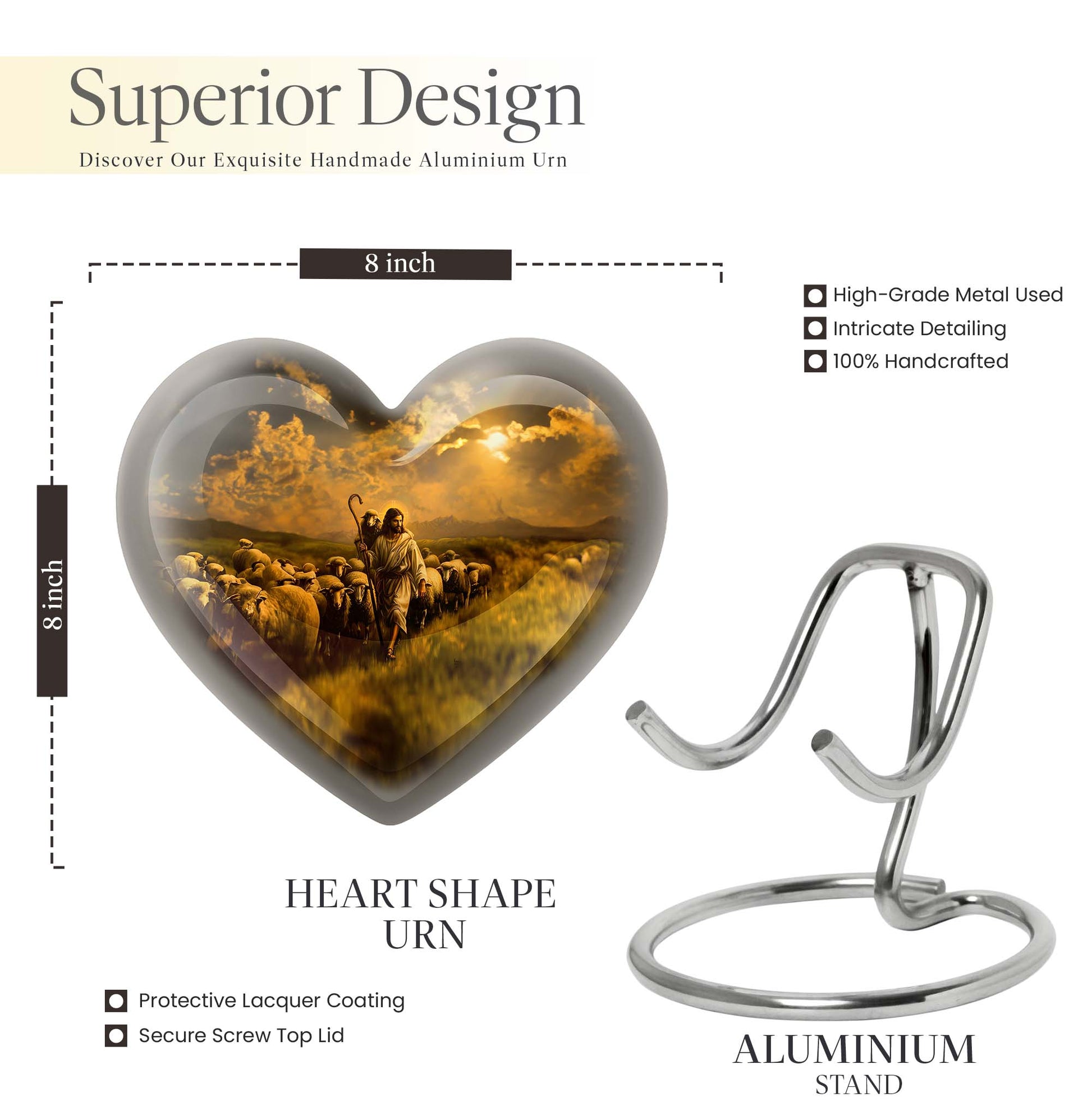 An elegant memorial to your loved ones, this Shepherd Urn provides comfort and remembrance in a unique manner. Designed for memorias of a lifetime, this 10-inch cremation urn for ashes is a prime example of supreme craftsmanship and extraordinary aesthetics. Weighing 3.3 pounds and designed innovatively, it's made of robust aluminum ensuring durability. It integrates an abstract theme which imbues a thoughtful design without being overly lavish. This large urn gracefully houses up to 200 cubic inches of ashes, ensuring a respectful and honorable resting place for your cherished one. Accompanied by an elegant velvet pouch, not only does it keep your loved one’s memory alive but also adds a heightened level of distinction to your memorial display. With the personalization option, you can engrave names on it, making the urn even more meaningful. The product does not limit itself to being just a funeral urn for adult ashes but also doubles as a multipurpose urn with a photo frame. The word 'shape urn' acquires a new definition with this offering. Remember and celebrate the memories of the departed with this unique Shepherd Urn.