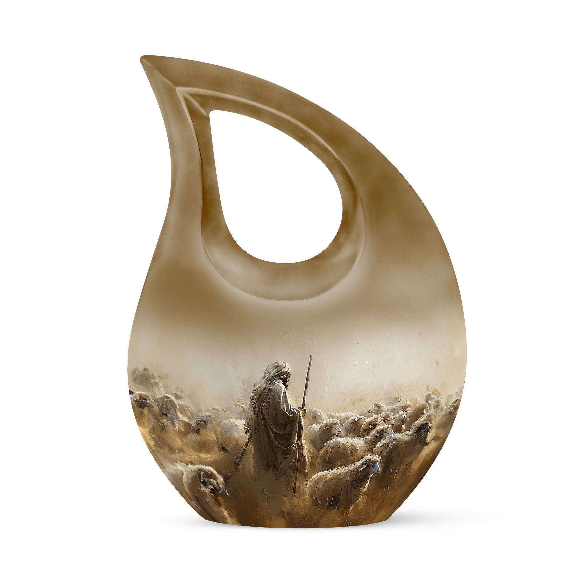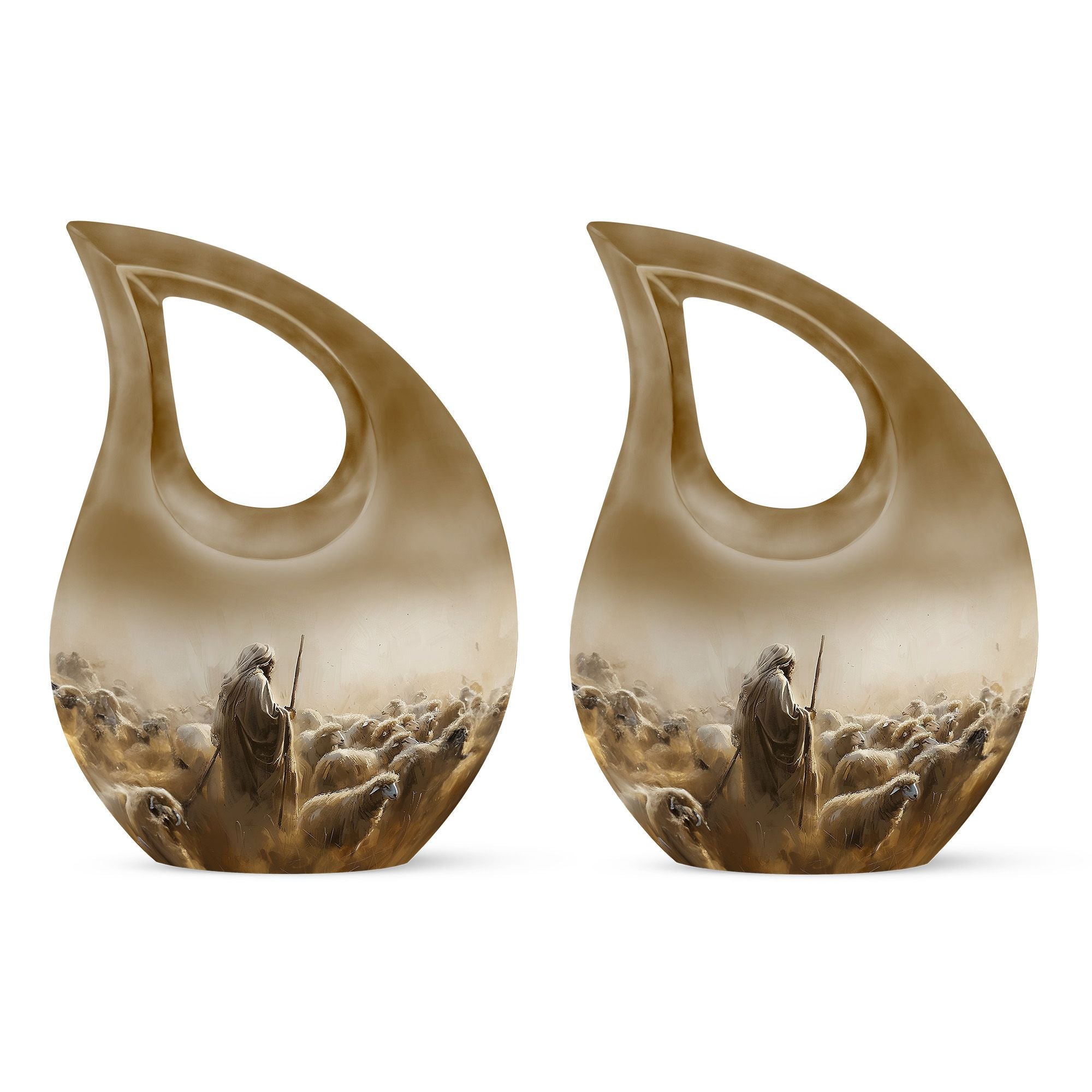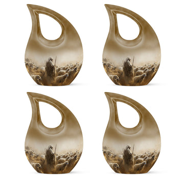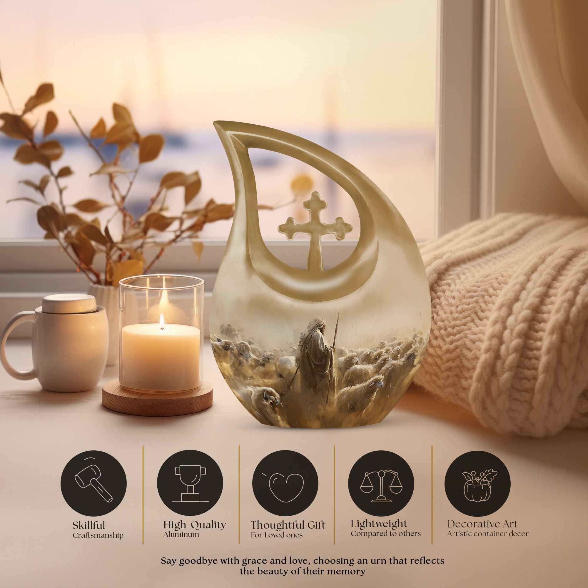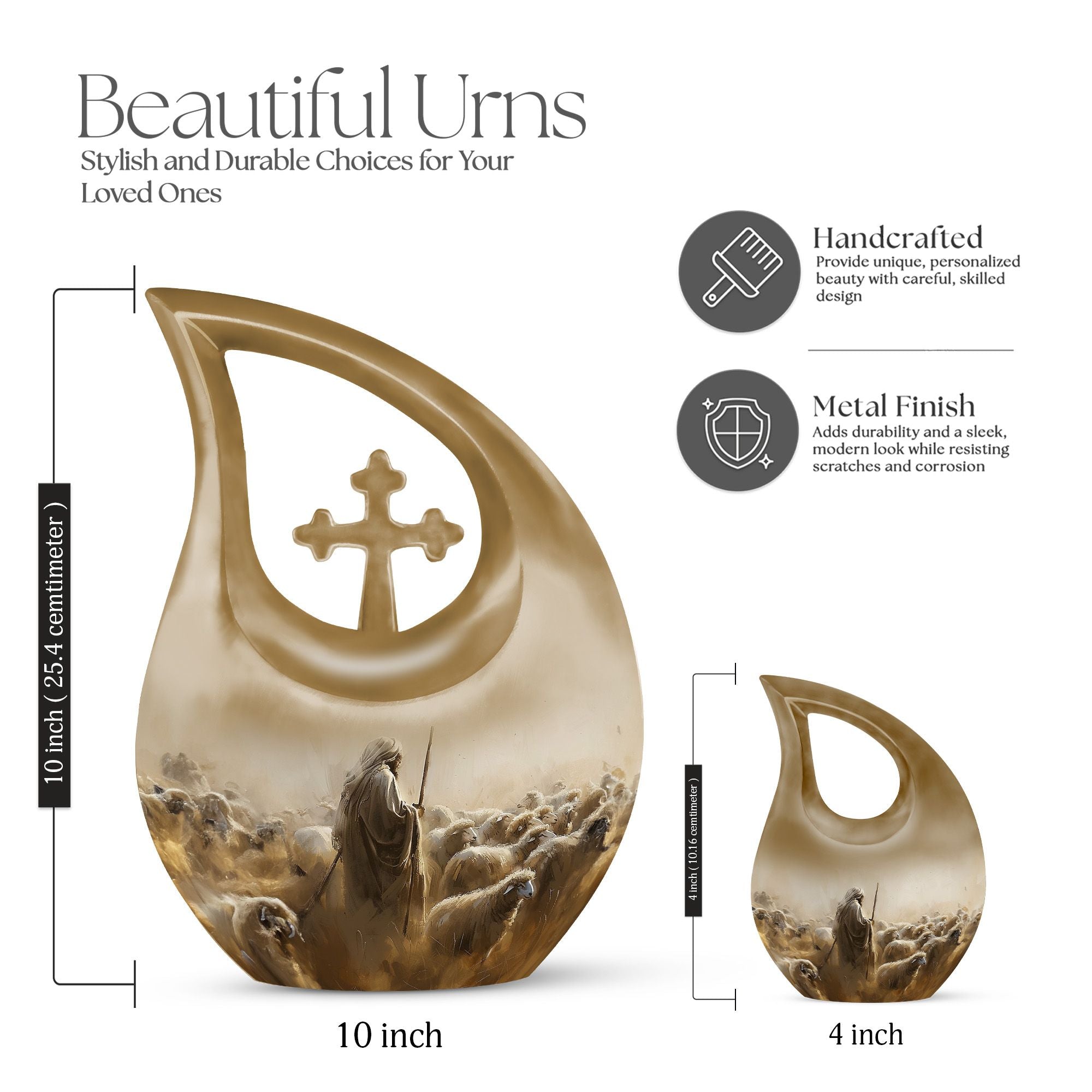 Honor the memory of your loved one with our 10-inch Shepherd Urn. Crafted from high-quality aluminium, this Keepsake Urn for Human Ashes provides a dignified and solemn place to preserve their remnants. The robust construction weighs a modest 3.3 pounds, ensuring durability and sturdiness. This Large Urn encapsulates a capacity of 200 cubic inches, allowing for a substantial amount of ashes to be stored. Its theme, the Shepherd, signifies gentleness, kindness, and care – truly celebrating the character of your treasured family member. Each urn comes with a velvet pouch that carefully contains the ashes. As a thoughtful touch, you have the option to personalize the urn with engraved names, creating a unique tribute to your loved one. This Shepherd Urn, with its angelic Cross Drop design, comfortably aligns with both modern and traditional décor. This tasteful memorial masterpiece in the Religious & Ceremonial category is an excellent choice for those looking for Urn Vases, Biodegradable Urns, or Small Urns for Human Ashes.