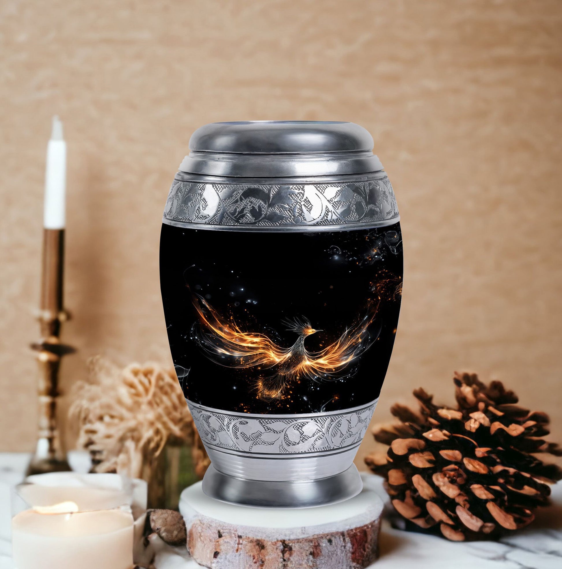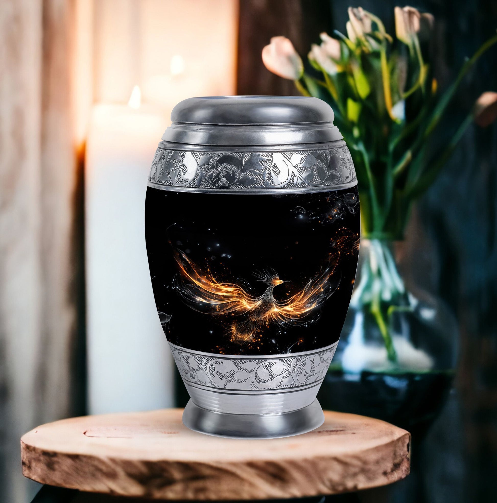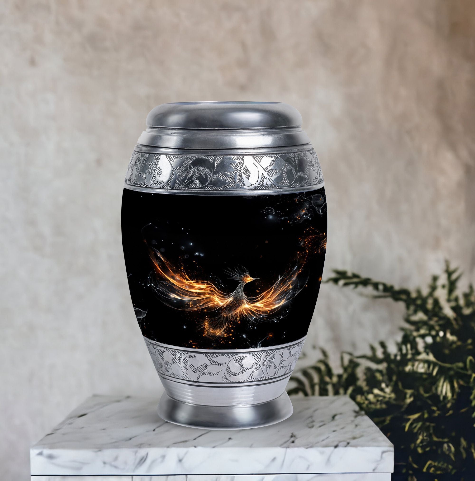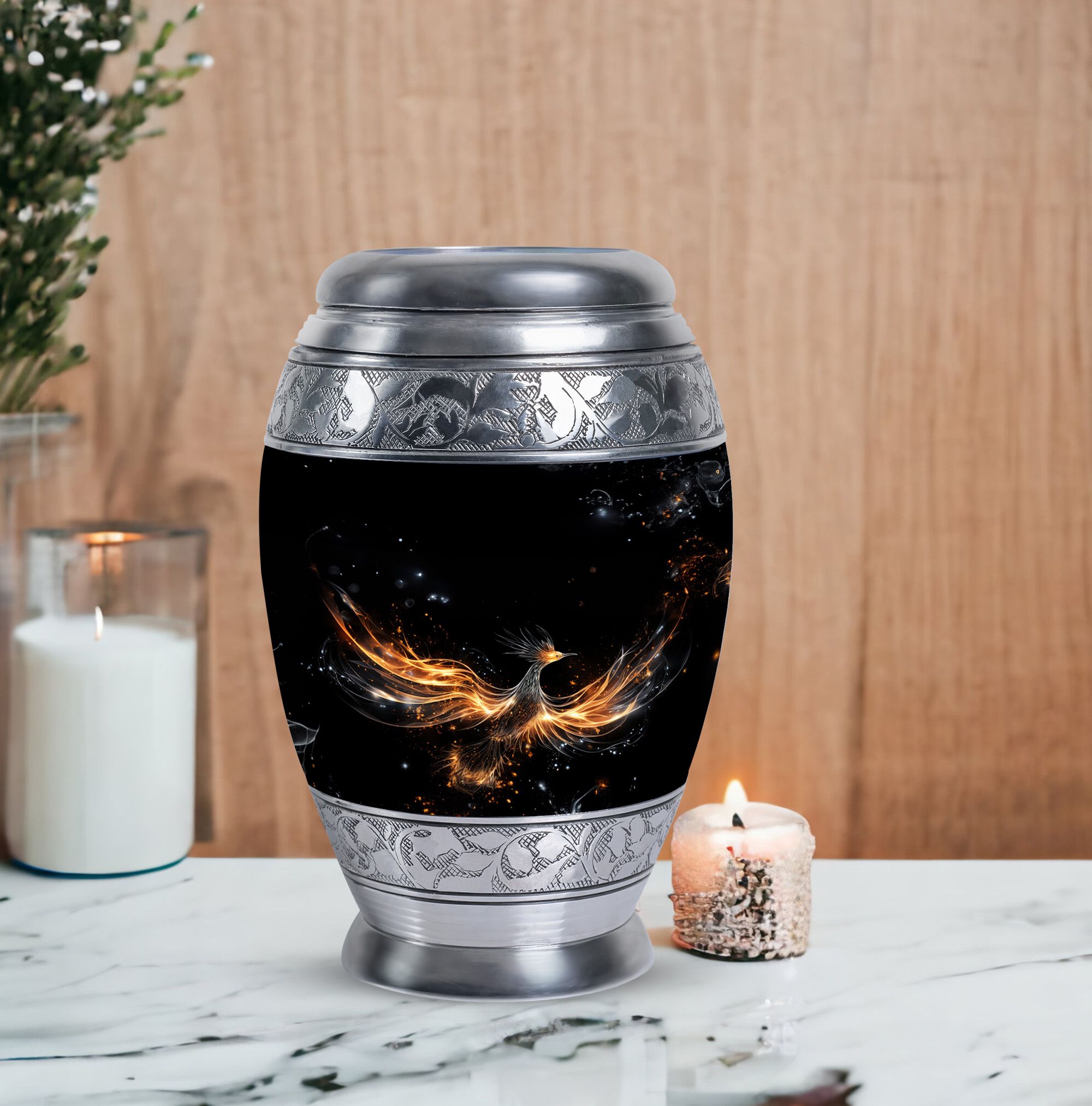 Find solace in honoring a loved one with our Shining Phoenix Urns for Human Ashes. Crafted from high-quality aluminium and designed to showcase an enduring symbol of a phoenix, this large urn delivers both a meaningful tribute and a sophisticated decor piece. Our cremation urn, weighing a sturdy 3.3 pounds, stands 10 inches in height and offers a capacity of 200 cubic inches, accommodating the remains of adults comfortably. Each one of our Memorial Urns is unique, giving you the option to personalize this durable metal cremation urn with engraved names, resonating a lasting memorial. Despite its substantial size, this urn is compact, making it suitable for any home or an intimate memorial spot. Included with your purchase is a velvet pouch for the containment and protection of the ashes. Our Personalized Urns for Human Ashes are designed user-focused, allowing you to immortalize your cherished memories in a respectful manner.