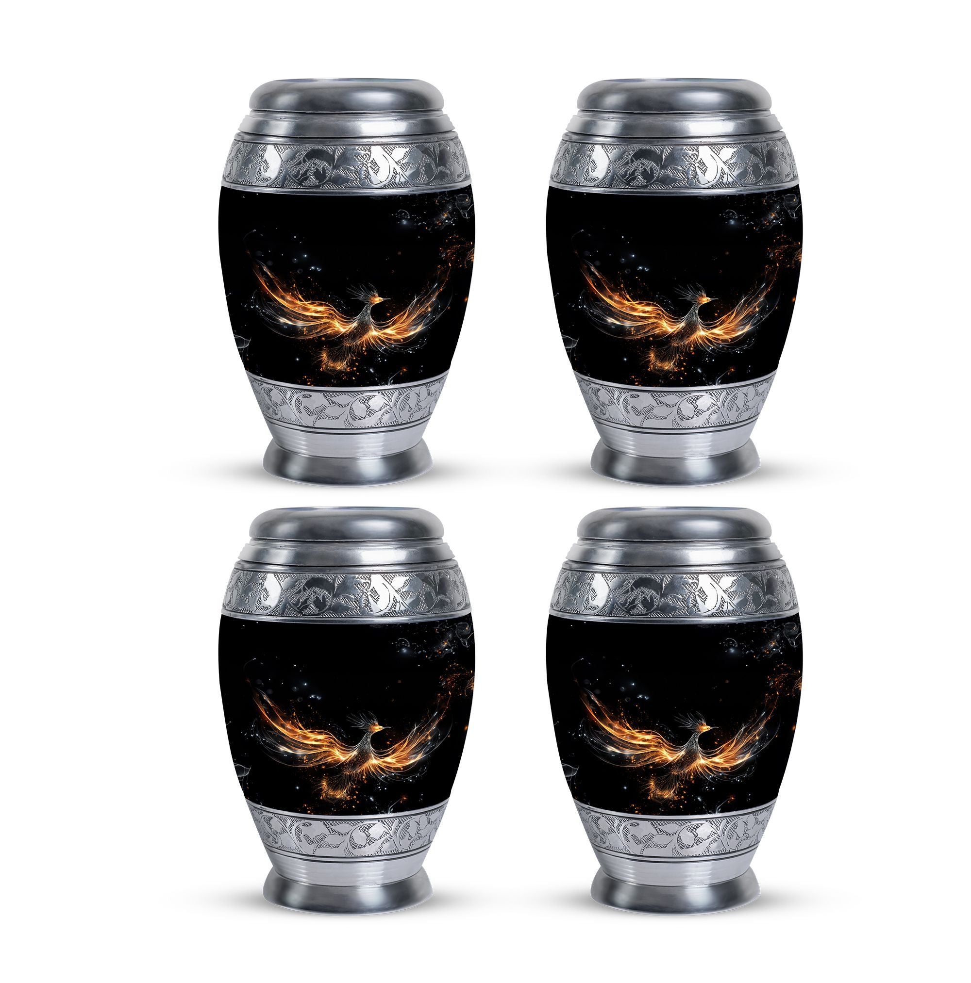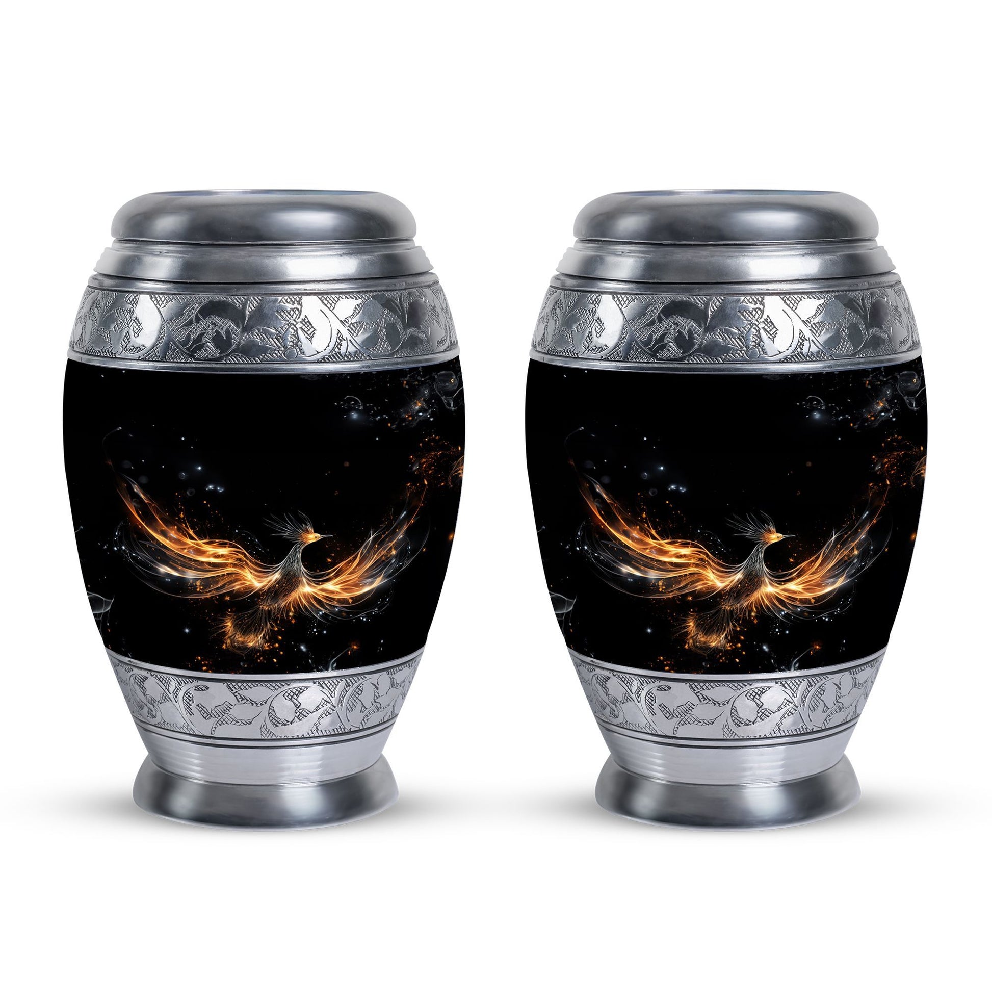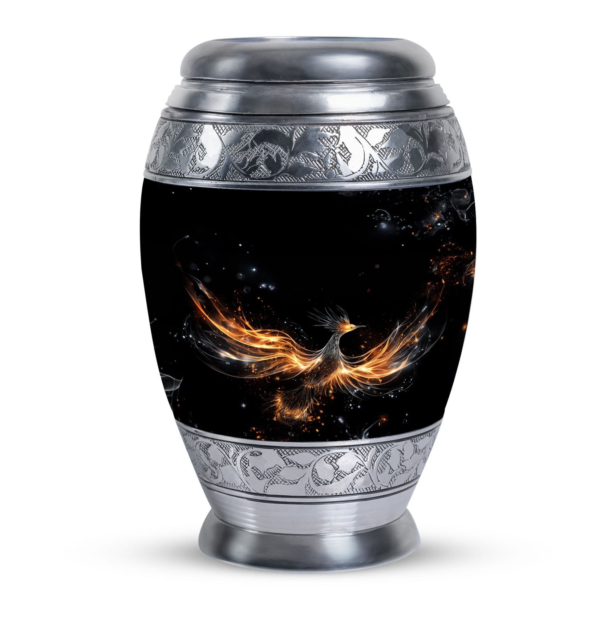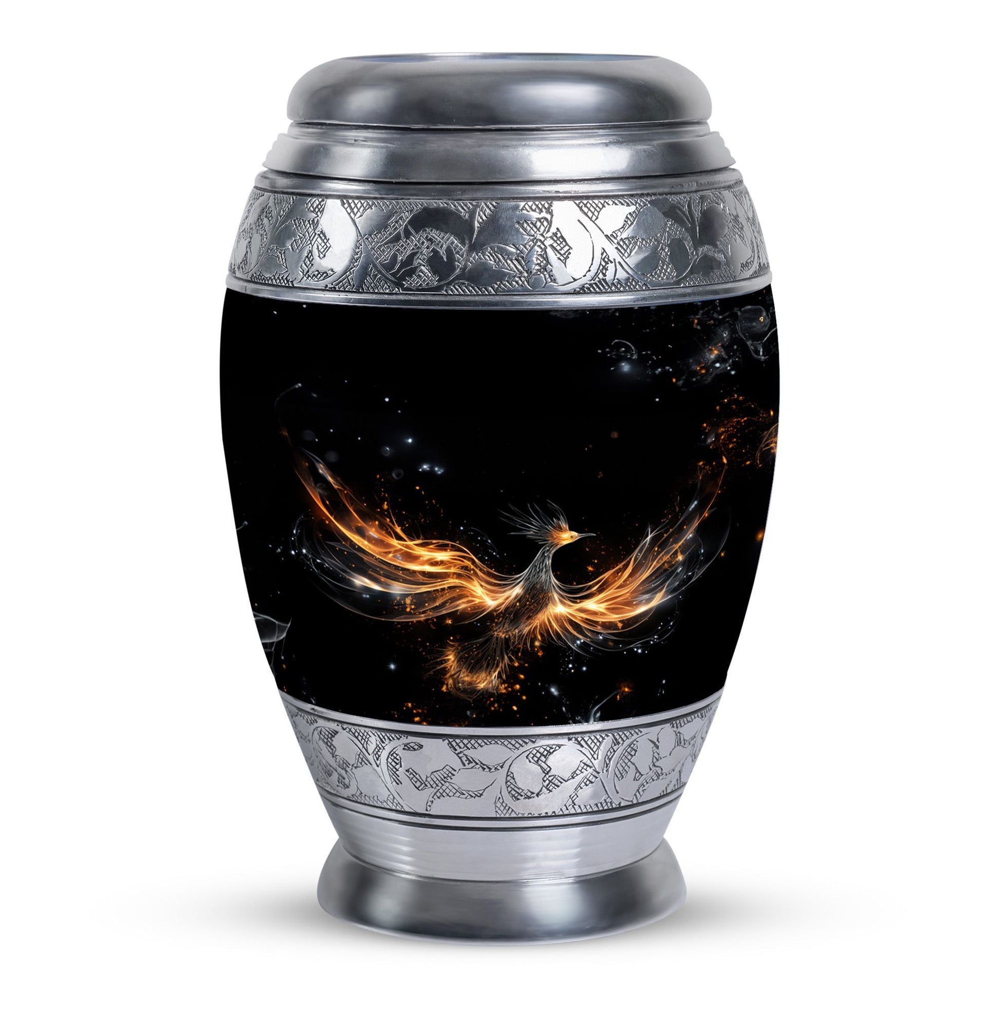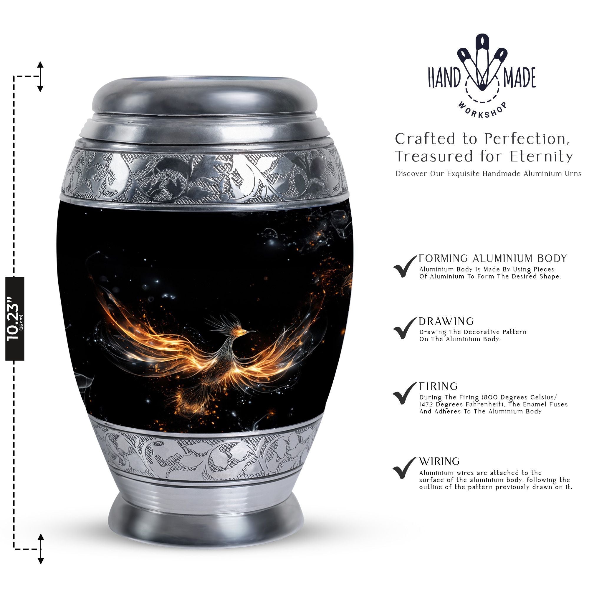Find solace in honoring a loved one with our Shining Phoenix Urns for Human Ashes. Crafted from high-quality aluminium and designed to showcase an enduring symbol of a phoenix, this large urn delivers both a meaningful tribute and a sophisticated decor piece. Our cremation urn, weighing a sturdy 3.3 pounds, stands 10 inches in height and offers a capacity of 200 cubic inches, accommodating the remains of adults comfortably. Each one of our Memorial Urns is unique, giving you the option to personalize this durable metal cremation urn with engraved names, resonating a lasting memorial. Despite its substantial size, this urn is compact, making it suitable for any home or an intimate memorial spot. Included with your purchase is a velvet pouch for the containment and protection of the ashes. Our Personalized Urns for Human Ashes are designed user-focused, allowing you to immortalize your cherished memories in a respectful manner.