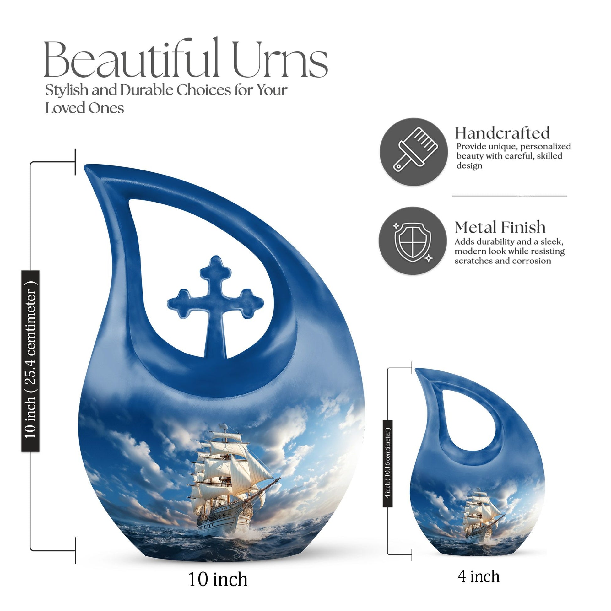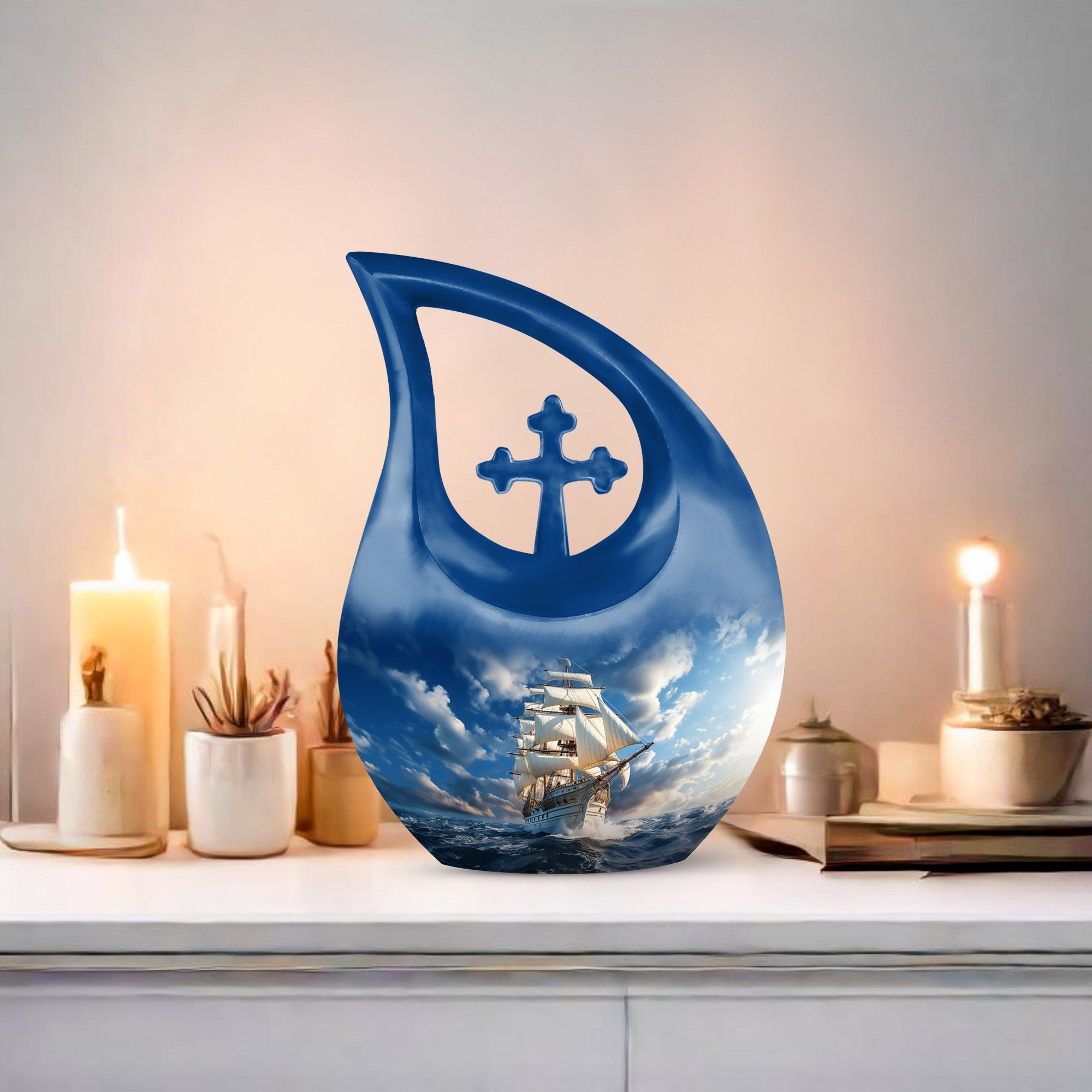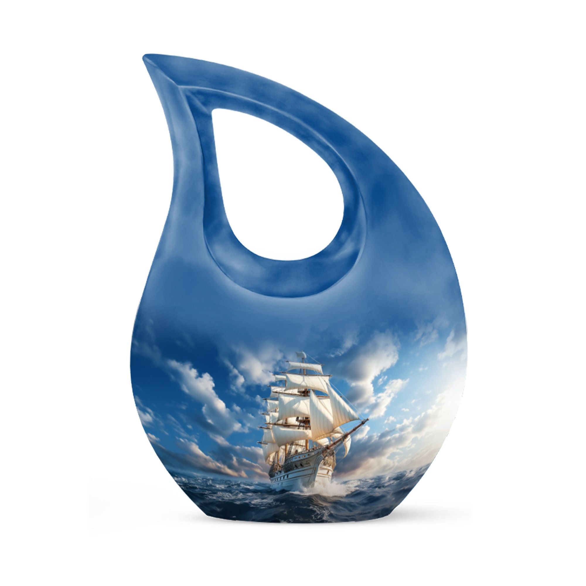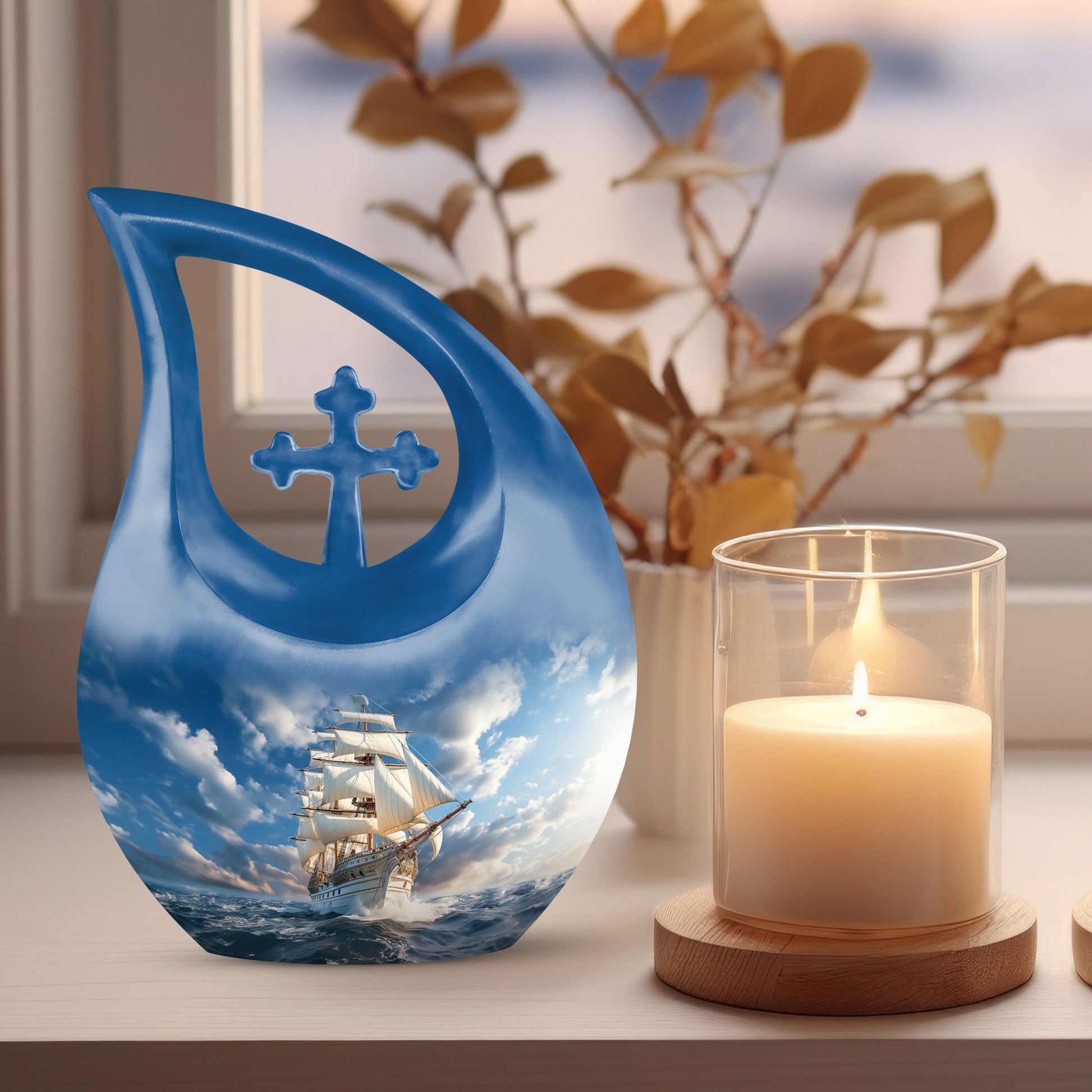 This large urn for ashes for women and adult large urn is perfect for families seeking a lasting tribute that reflects adventure, resilience, and serenity. The sailing ship’s journey across calm waters symbolizes a soul’s passage to peace — guided by love, carried by memories, and embraced by eternity.