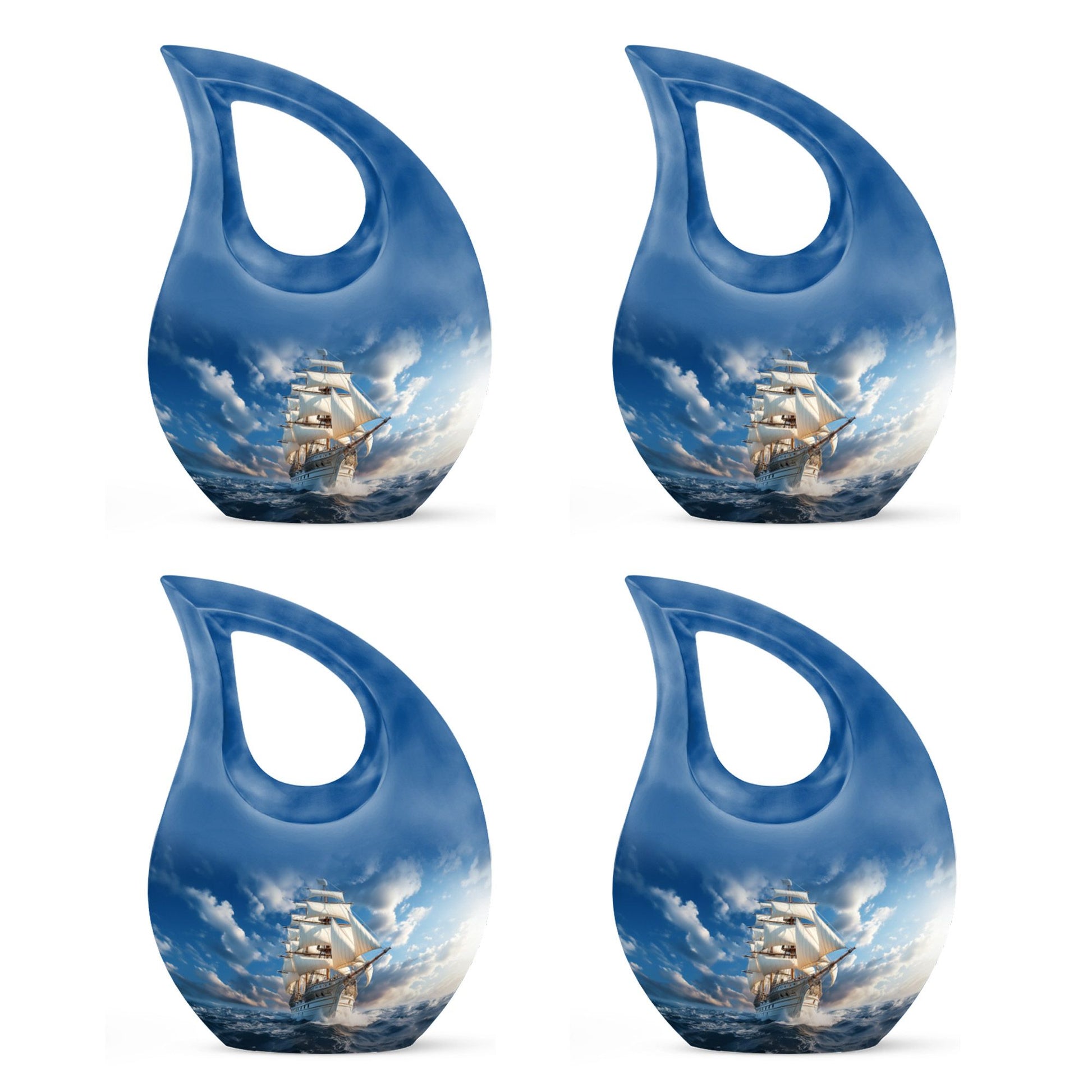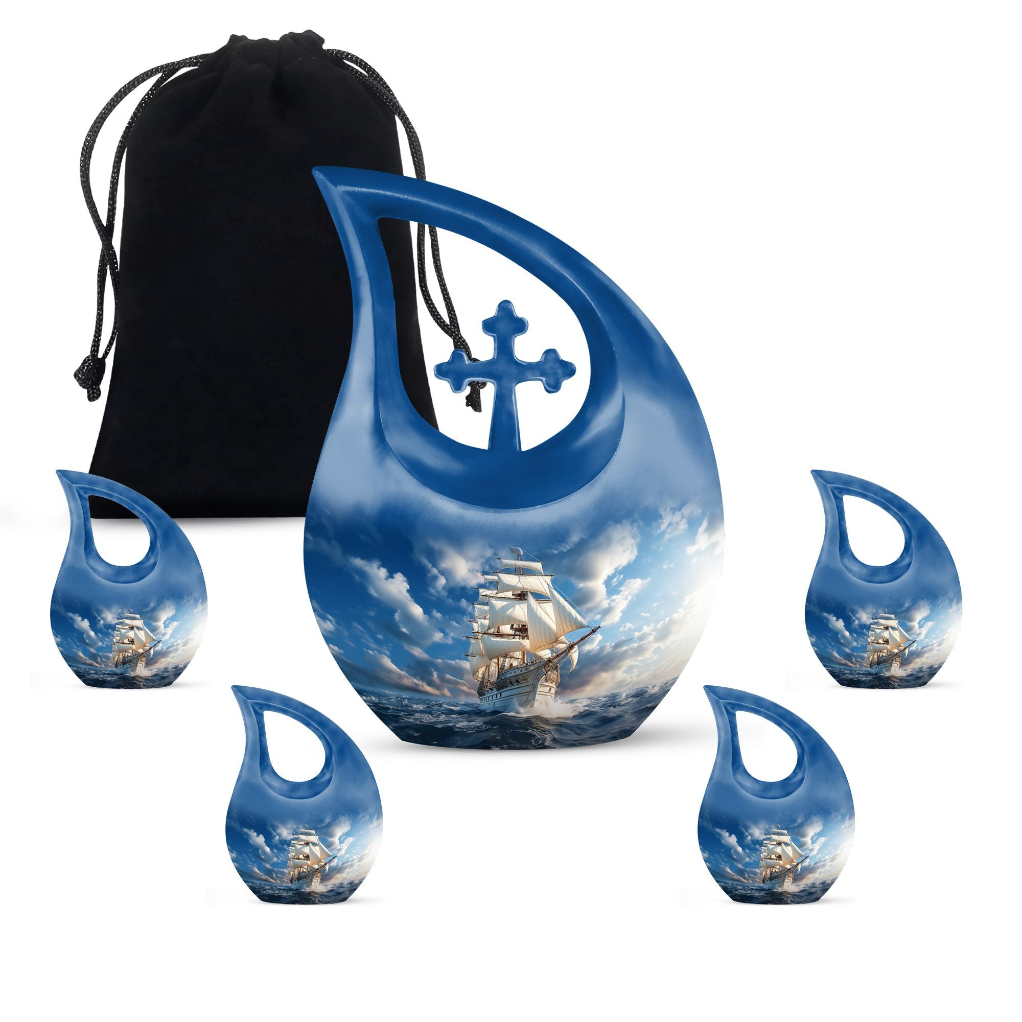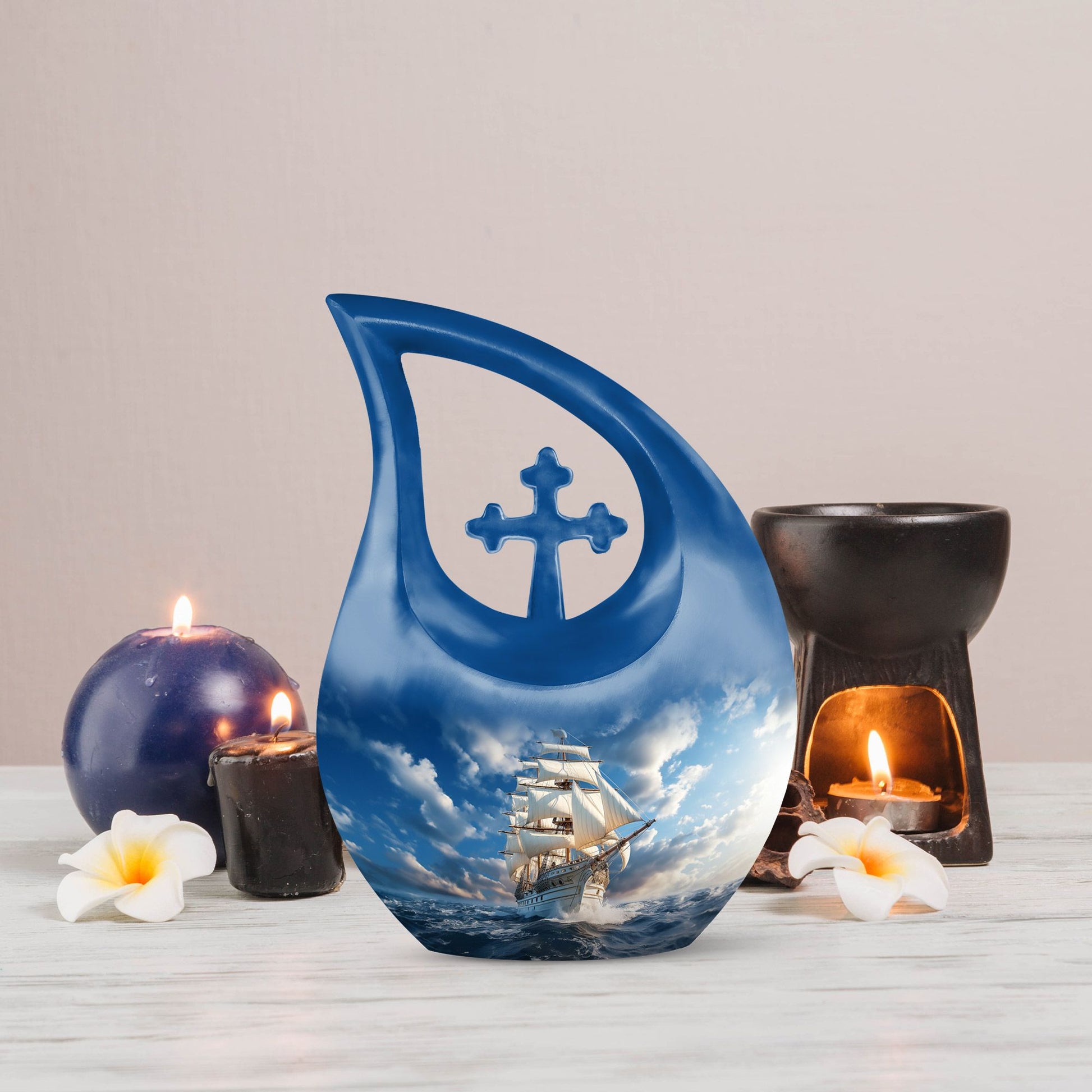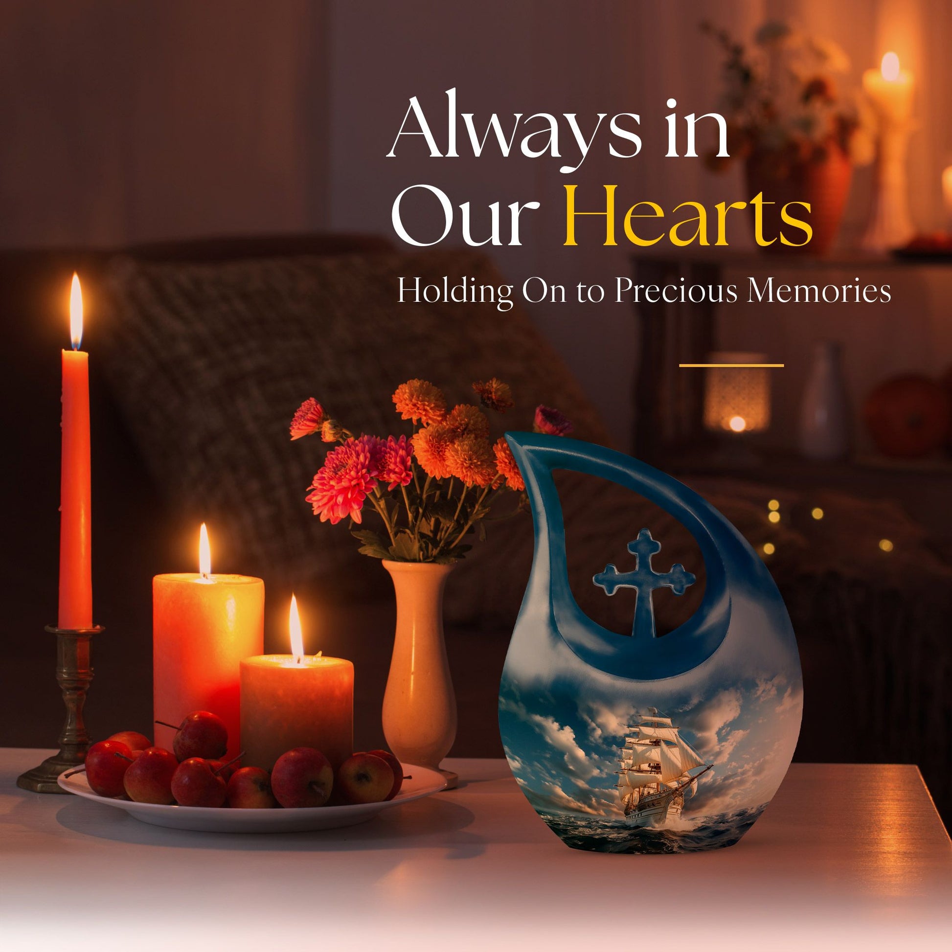 This large urn for ashes for women and adult large urn is perfect for families seeking a lasting tribute that reflects adventure, resilience, and serenity. The sailing ship’s journey across calm waters symbolizes a soul’s passage to peace — guided by love, carried by memories, and embraced by eternity.