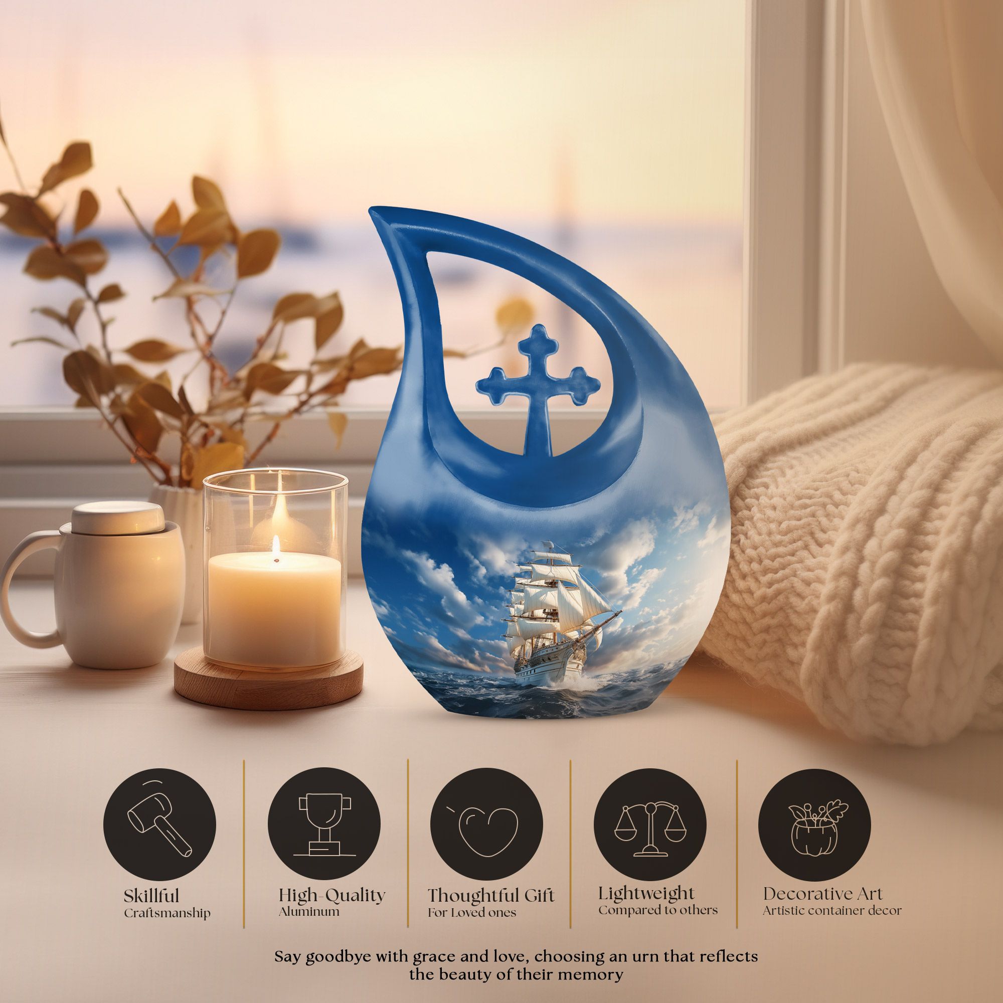 Crafted with precision from durable, high-quality aluminum, this large cremation urn features a soothing ocean-blue finish with a detailed ship motif that reflects tranquility and strength. Its secure screw-top lid ensures ashes remain safely preserved, whether displayed at home or used as a burial urn. Designed to last for generations, this large urn for human ashes blends artistic craftsmanship with deep emotional meaning.