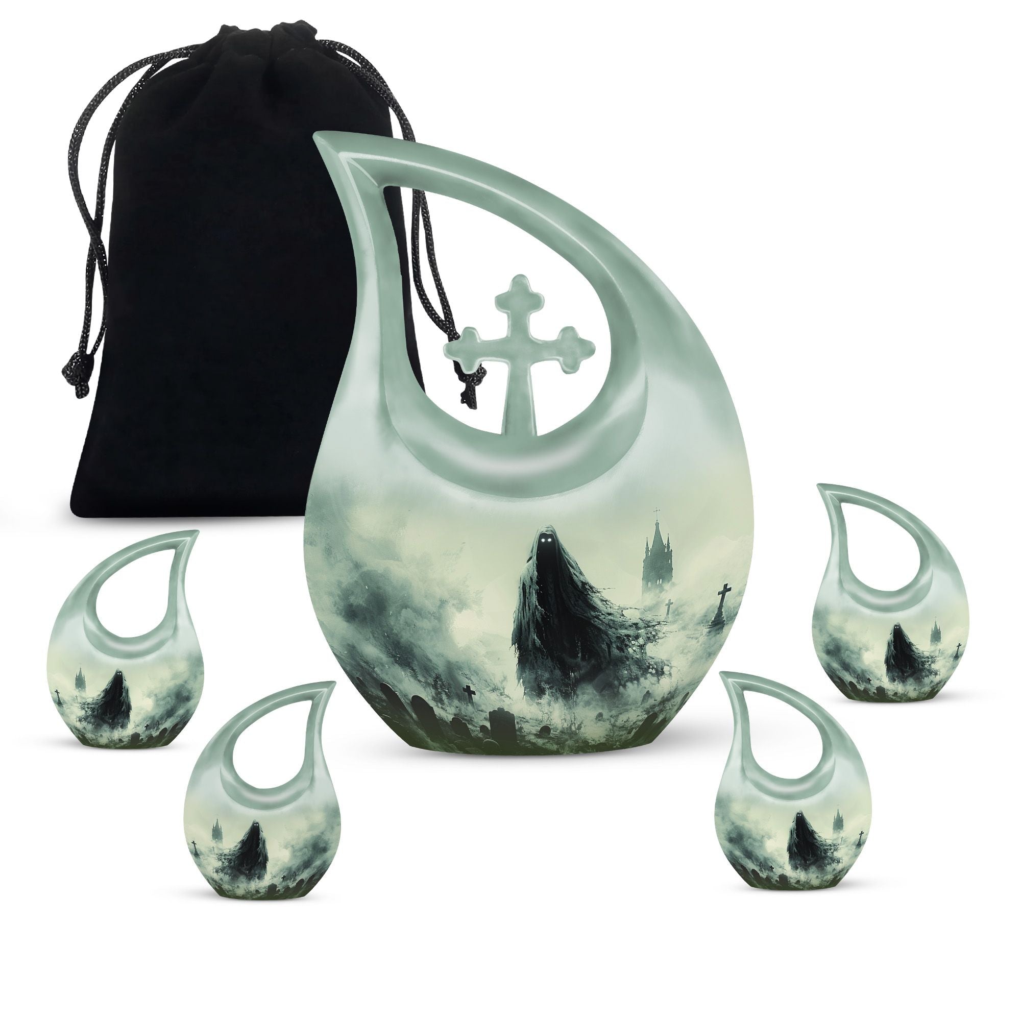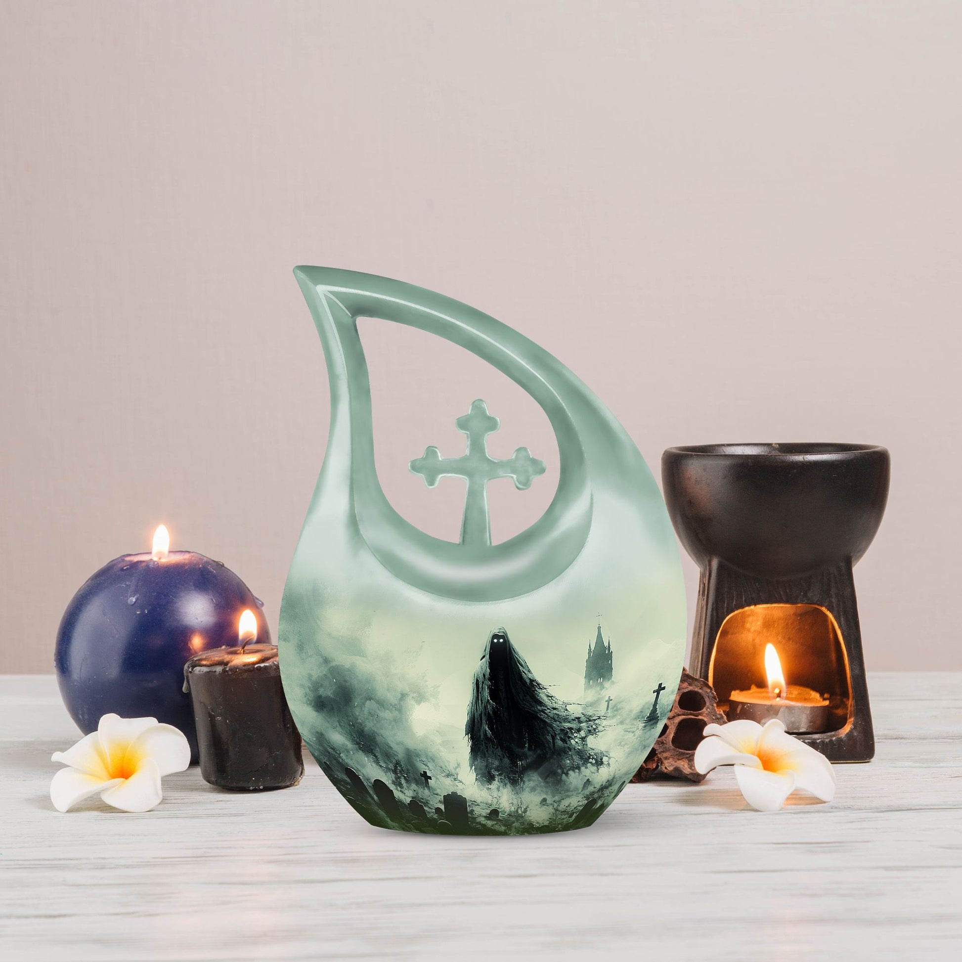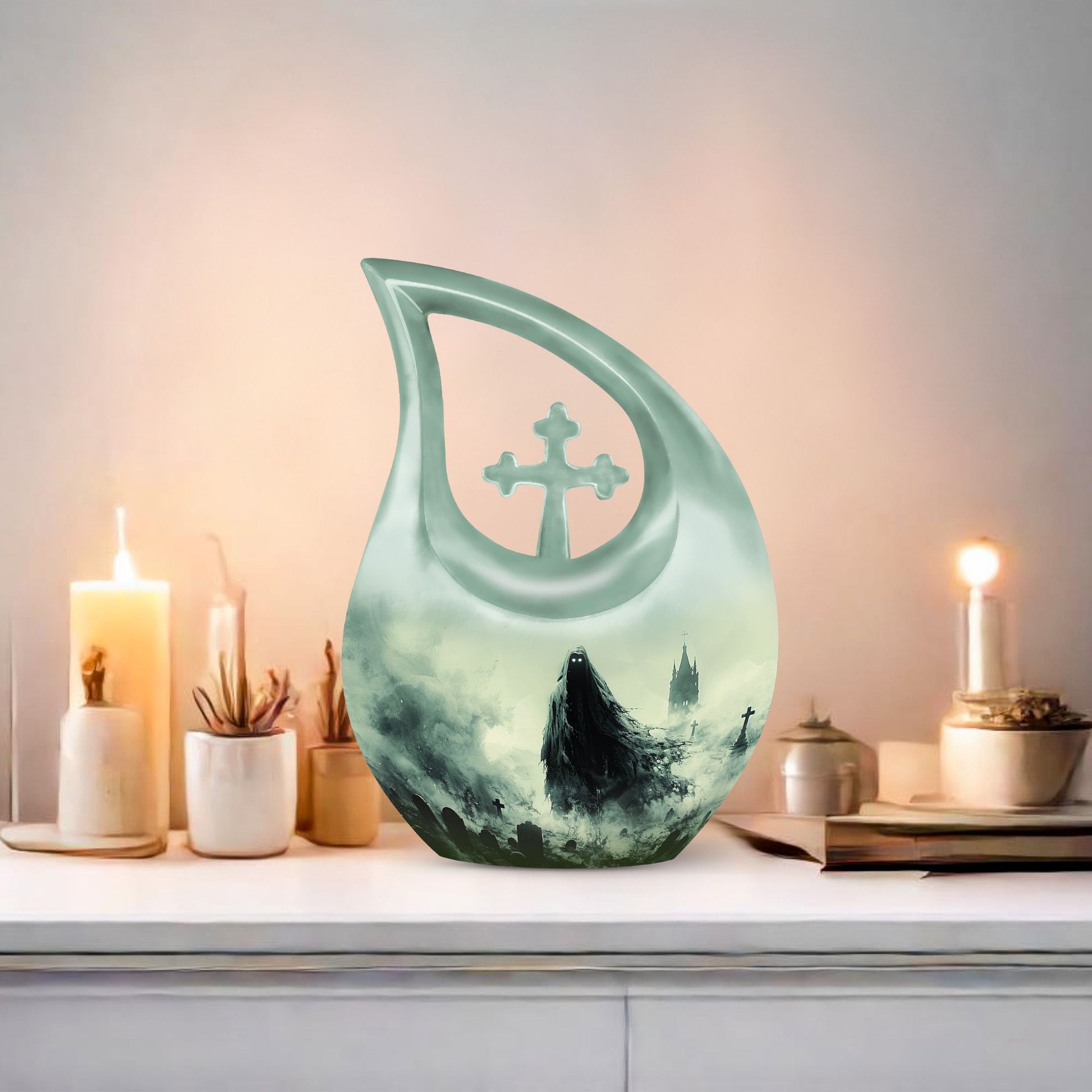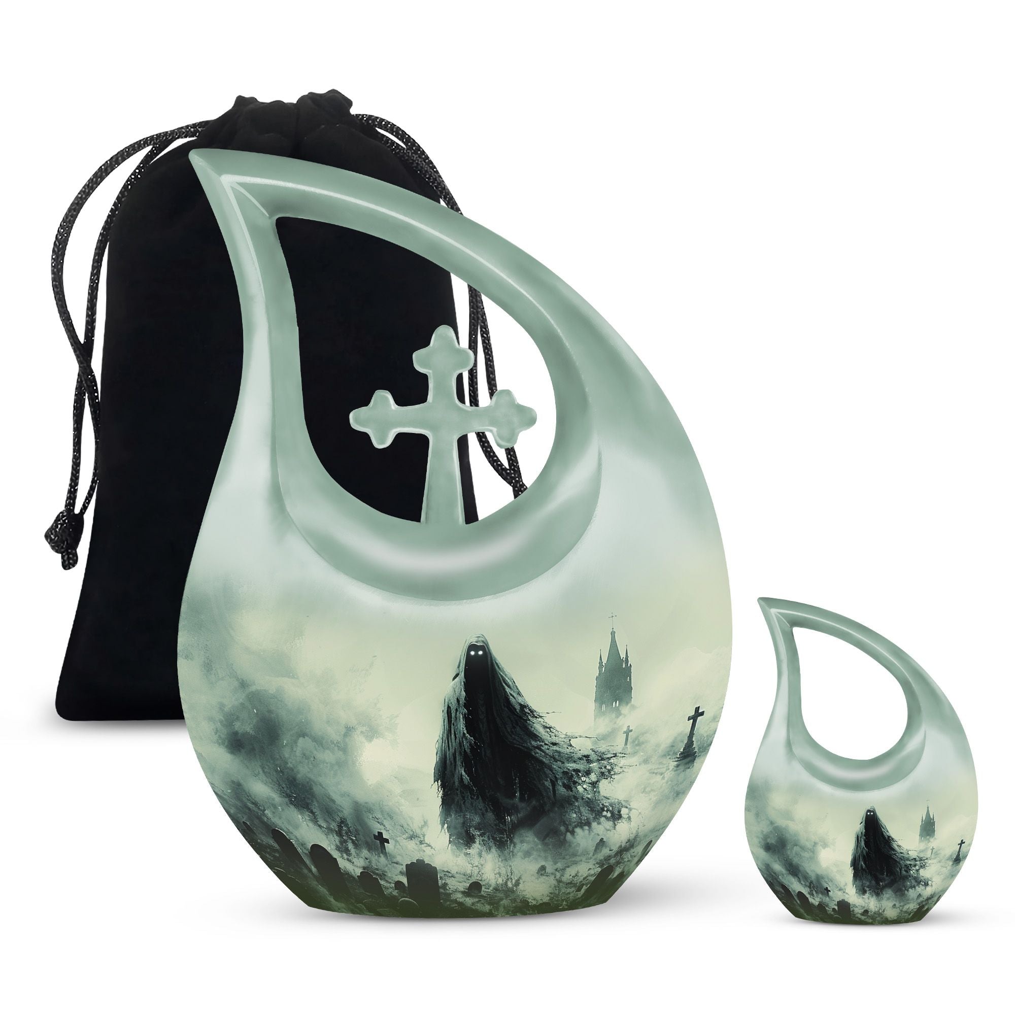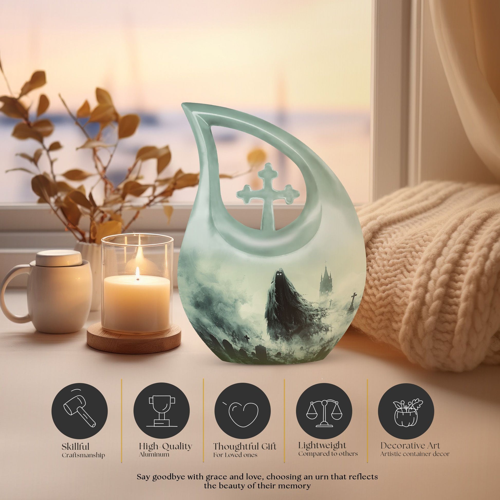 Introducing the 'Shrouded Requiem Urn', a thoughtful and beautiful solution to keep the cherished memory of your loved ones close to home. Carefully crafted from quality aluminium, this 10 Inch urn encapsulates elegance and durability. It weighs just 3.3 pounds, and its sizeable capacity of 200 cubic inches ensures it comfortably holds the ashes. The special 'Cross Drop' Urn design adds a touch of spiritual significance, making it an ideal choice for those seeking memorial urns with deep symbolic resonance. To add a personal touch, customize it with engraved names, making it even more special. The urn comes along with a velvet pouch, providing a dignified containment for the ashes. Whether it's large urns for human ashes or Urn mini you're looking for, this 'Cross Drop' design stands out amidst marble urns for sale. With 'Urns With Love', remember, celebrate and pay tribute to your beloved in style.