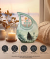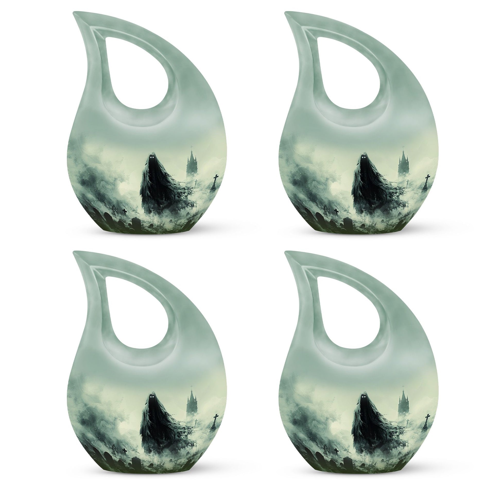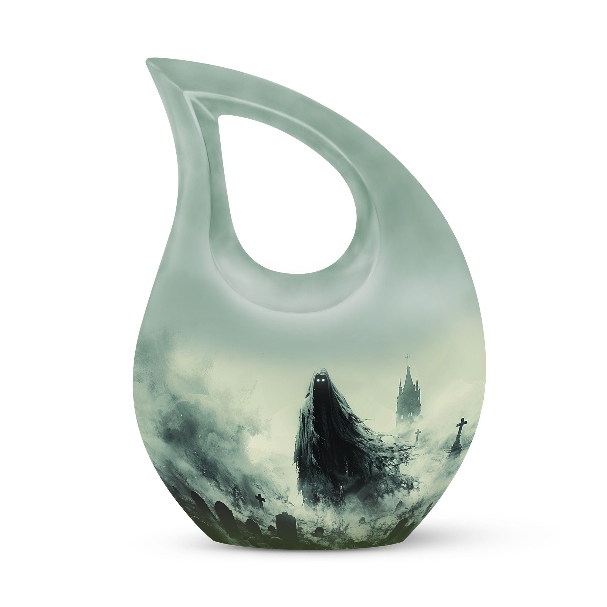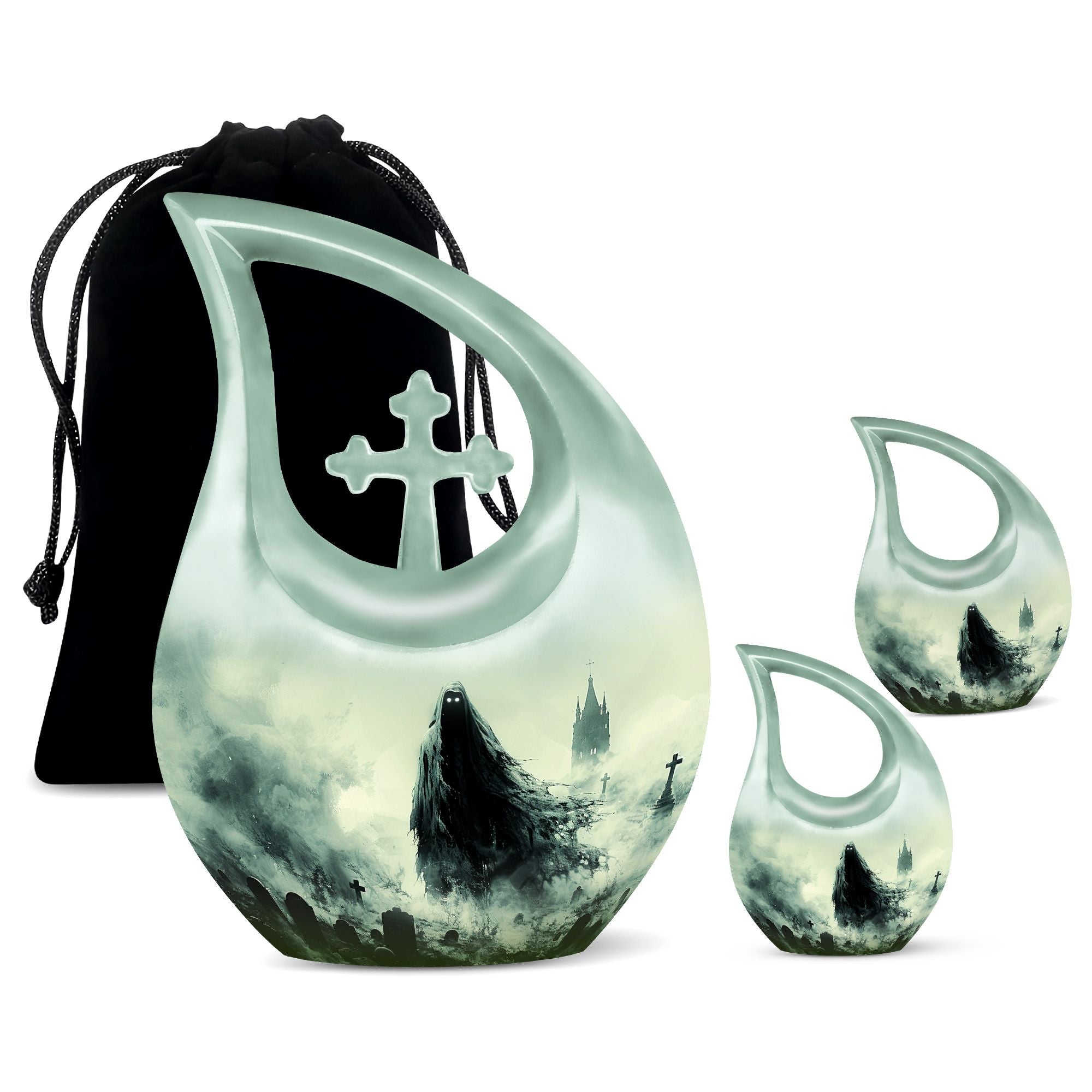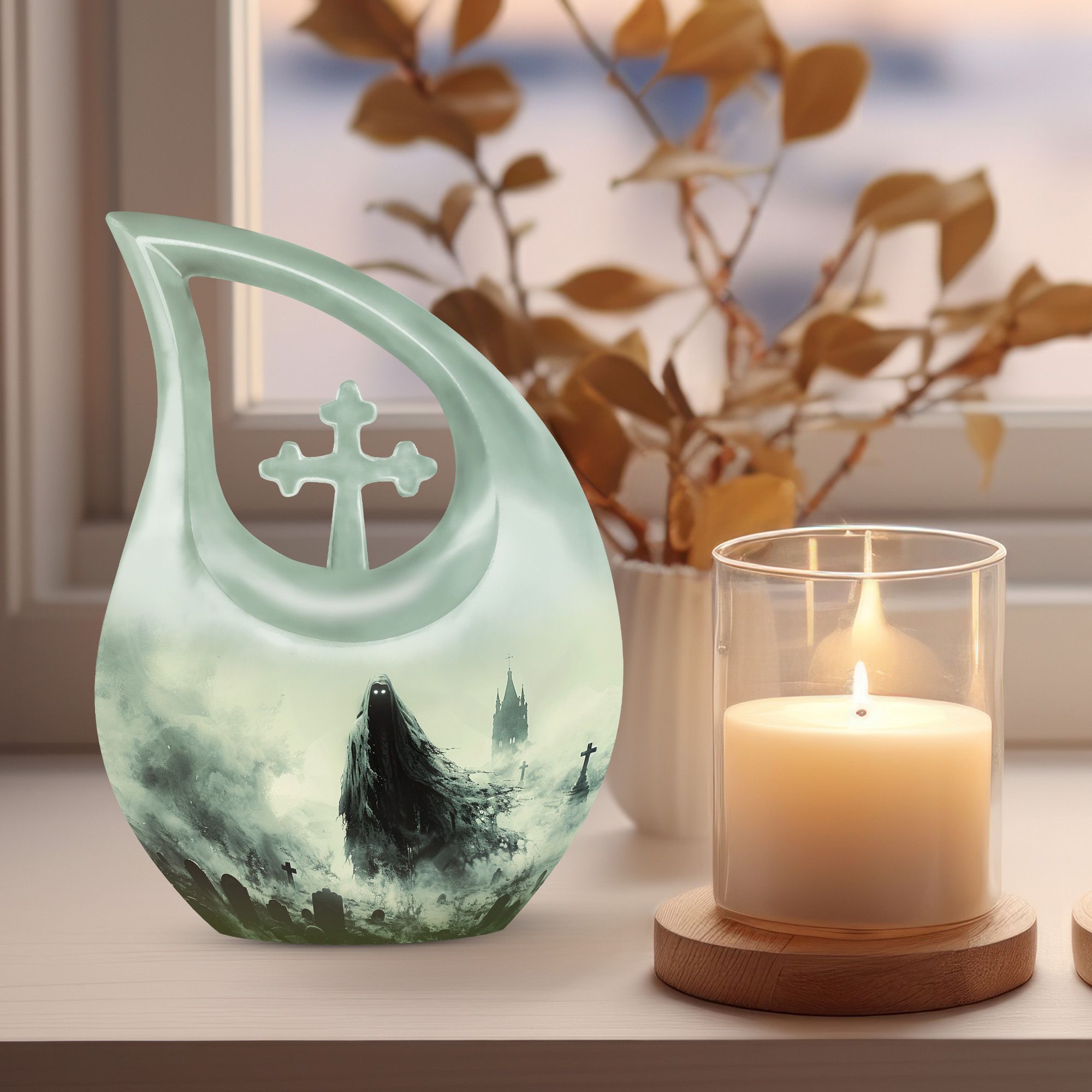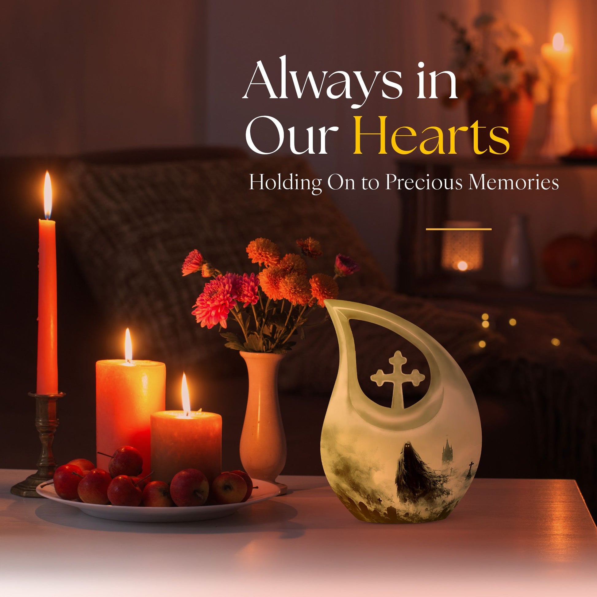 Introducing the 'Shrouded Requiem Urn', a thoughtful and beautiful solution to keep the cherished memory of your loved ones close to home. Carefully crafted from quality aluminium, this 10 Inch urn encapsulates elegance and durability. It weighs just 3.3 pounds, and its sizeable capacity of 200 cubic inches ensures it comfortably holds the ashes. The special 'Cross Drop' Urn design adds a touch of spiritual significance, making it an ideal choice for those seeking memorial urns with deep symbolic resonance. To add a personal touch, customize it with engraved names, making it even more special. The urn comes along with a velvet pouch, providing a dignified containment for the ashes. Whether it's large urns for human ashes or Urn mini you're looking for, this 'Cross Drop' design stands out amidst marble urns for sale. With 'Urns With Love', remember, celebrate and pay tribute to your beloved in style.
