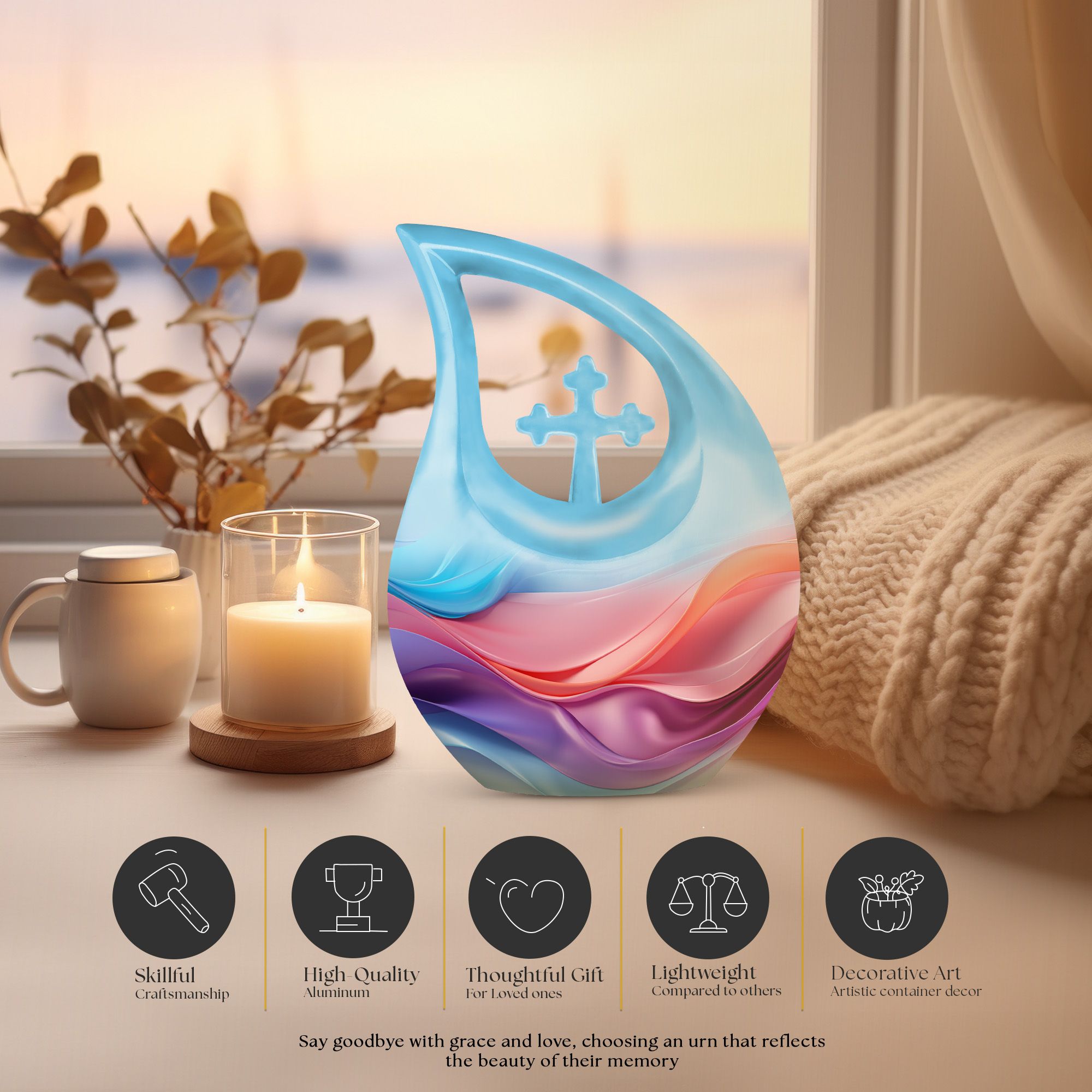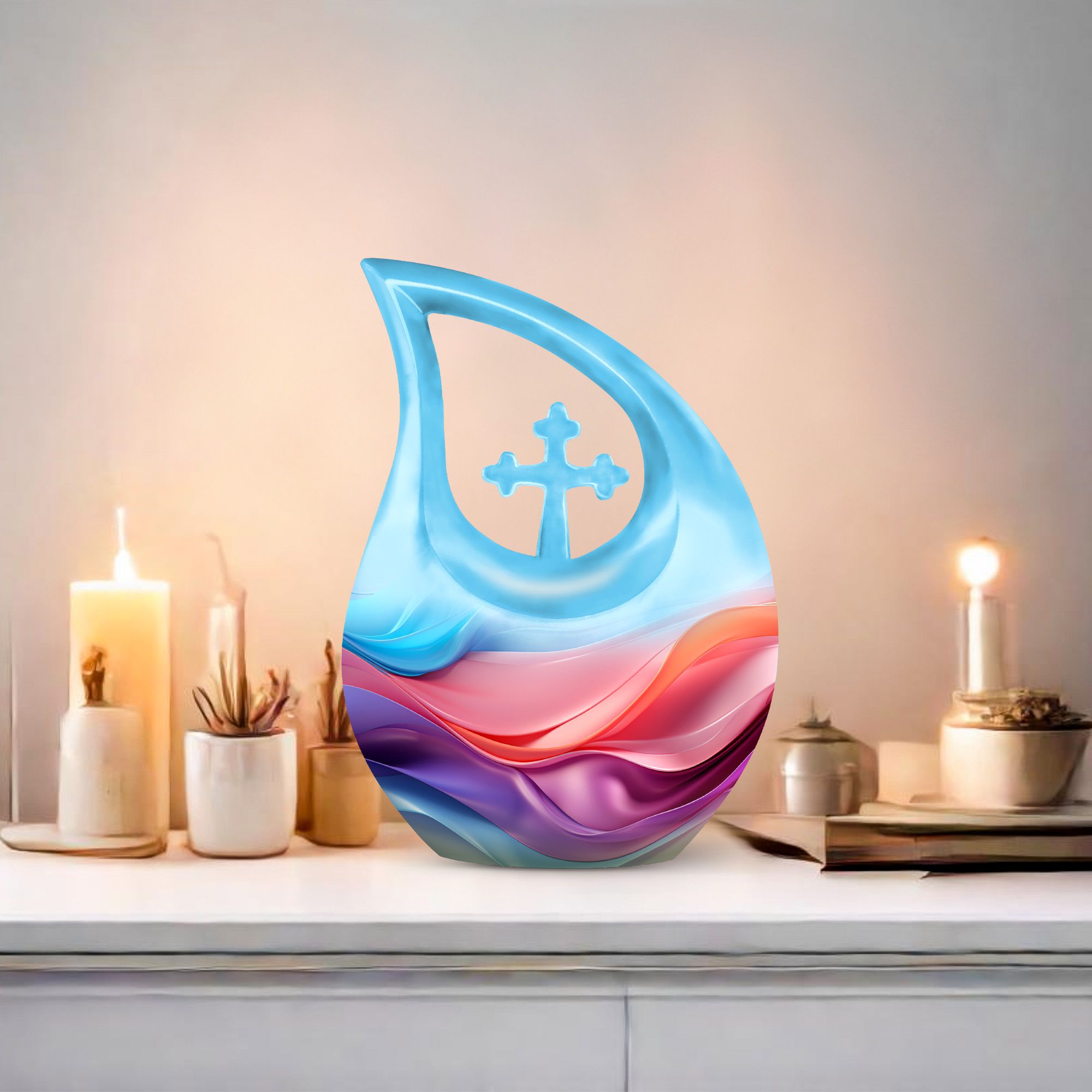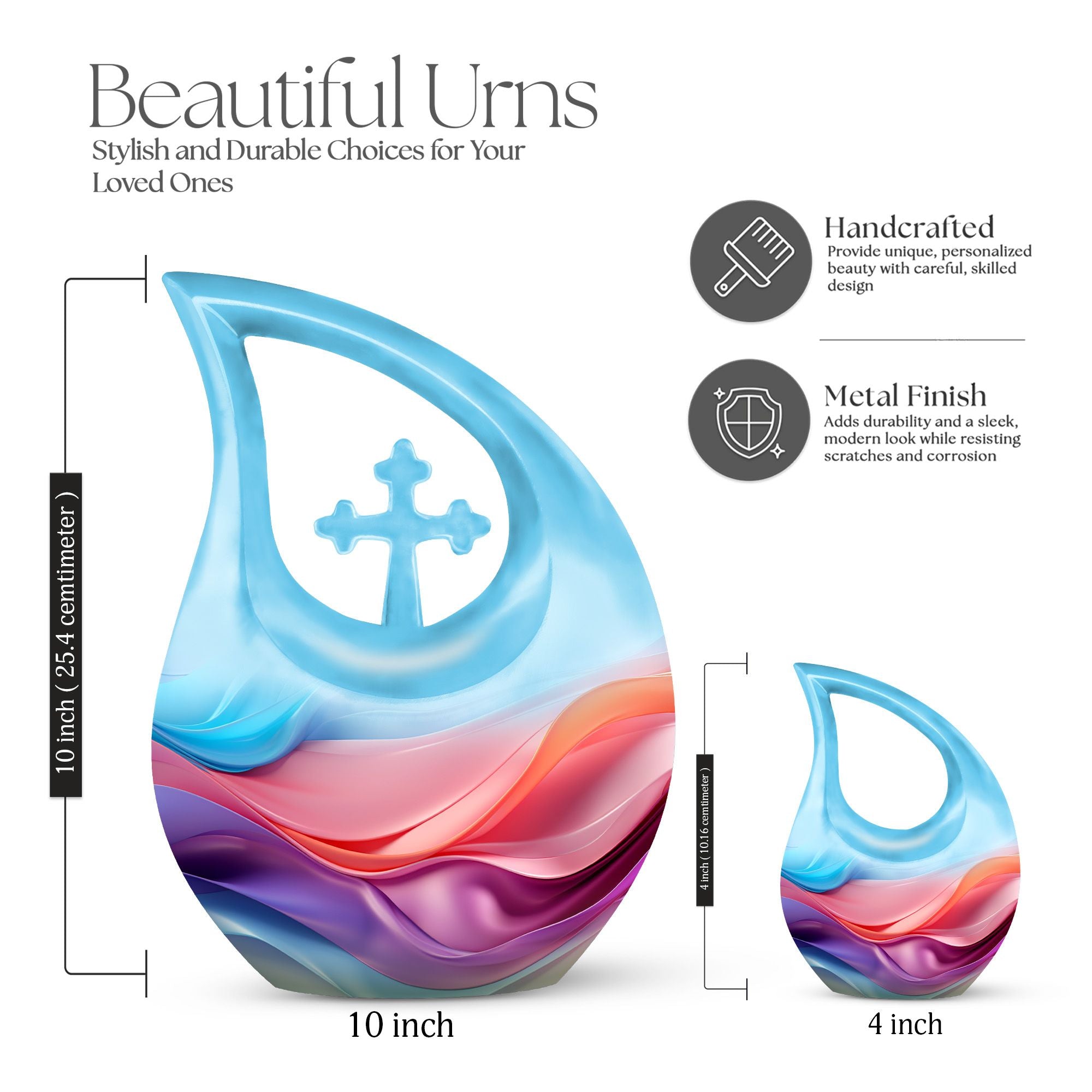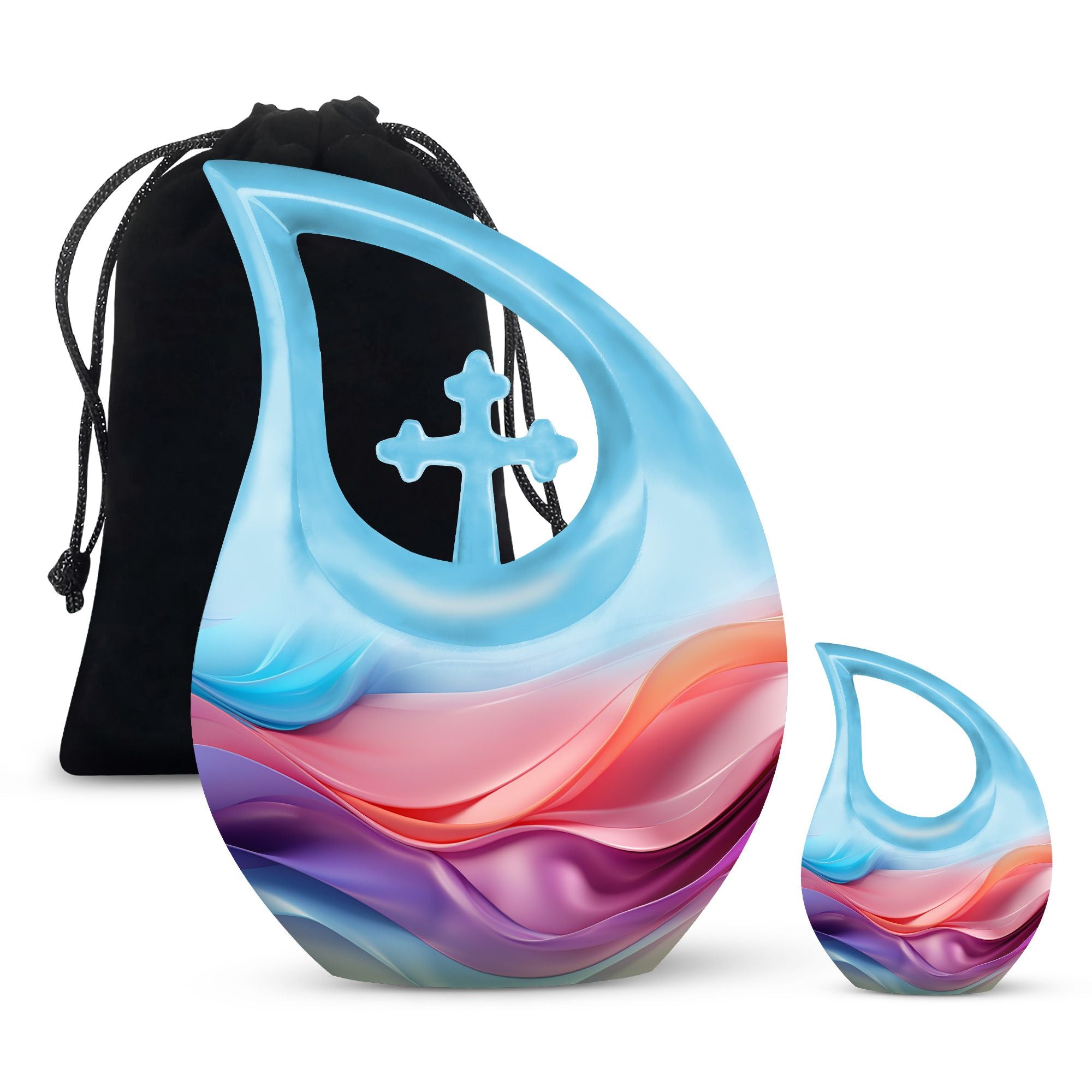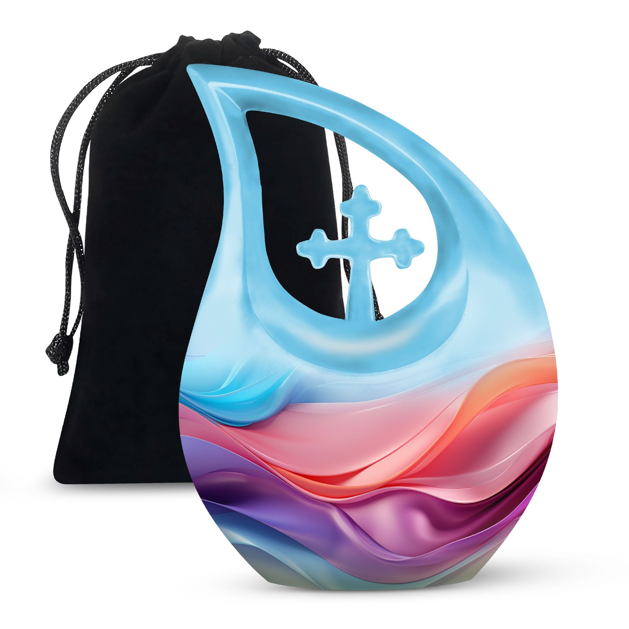 Securely honor the memory of a loved one with our beautiful Silken Waves Urn. This 10-inch large urn, meticulously crafted from sturdy aluminum, serves as an eloquent memorial item. The eminent cross drop-themed urn showcases an understated elegance that gracefully conveys your love and loss. With a capacity of 200 cubic inches, our urn offers considerable room for ashes, while weighing in at a modest 3.3 pounds for ease of placement. For an additional touch of reverence, you are welcome to dignify the urn with personalized names through our custom engraving service. Our urn package also comes with a velvet pouch to safely hold the ashes. Lay your search to rest; whether you're looking for mini urns for ashes, urn vaults, or cheap funeral urns, our Silken Waves Urn caters to your needs in a distinct, yet sophisticated manner, making your memorial experience unforgettable.