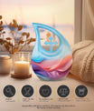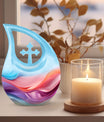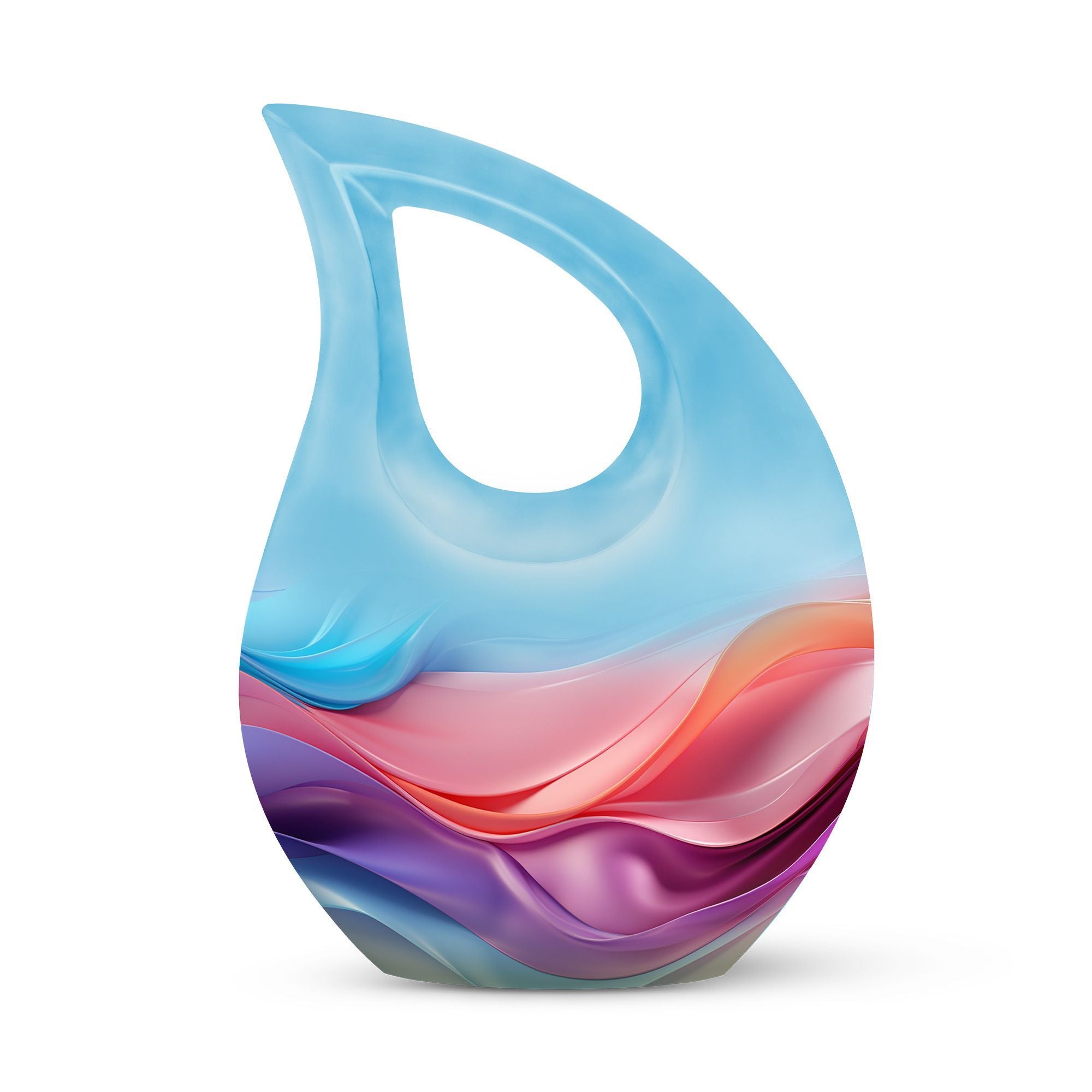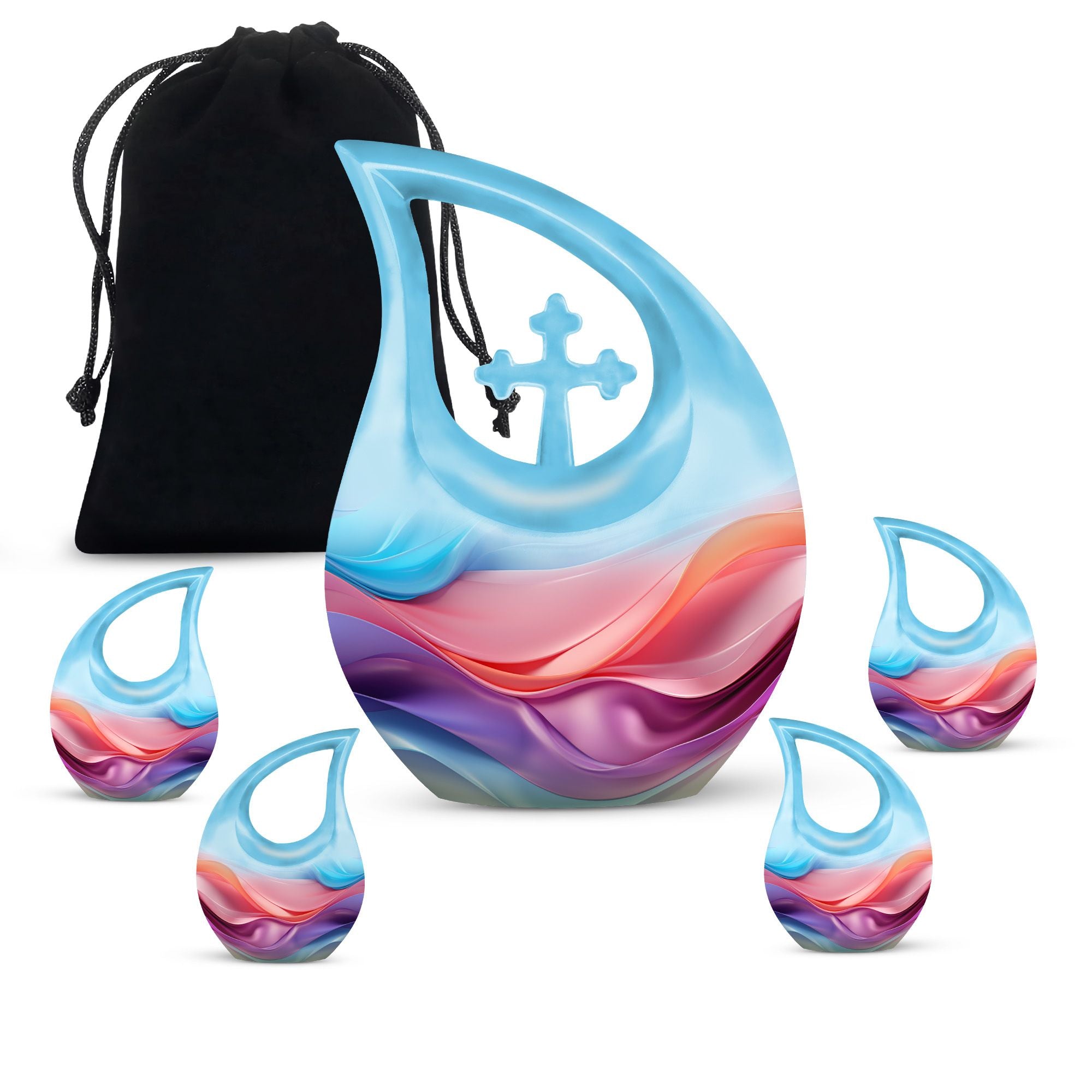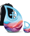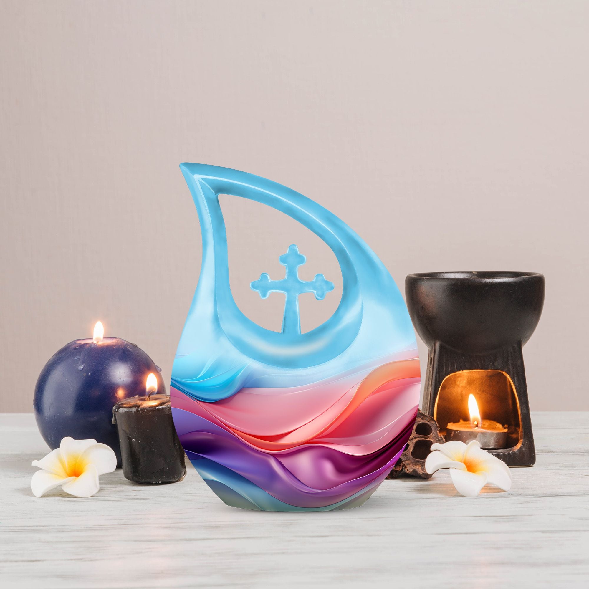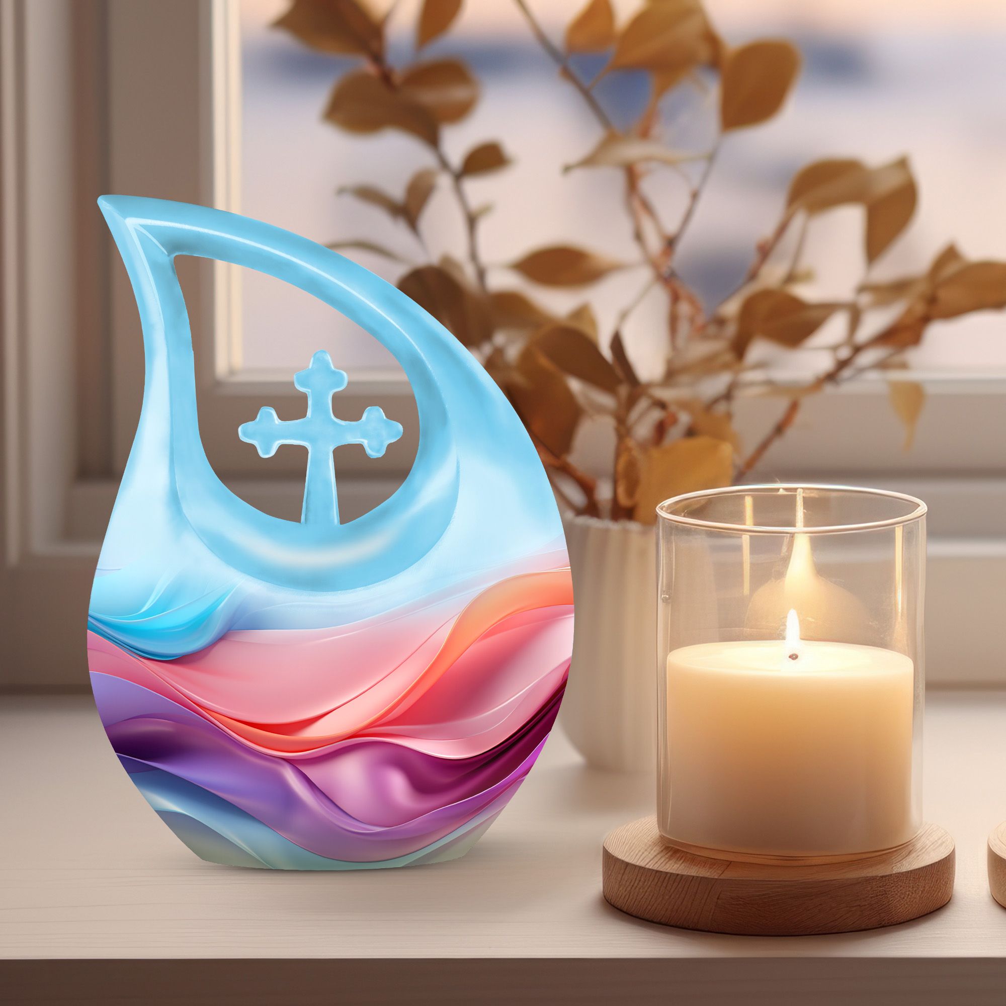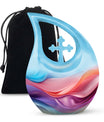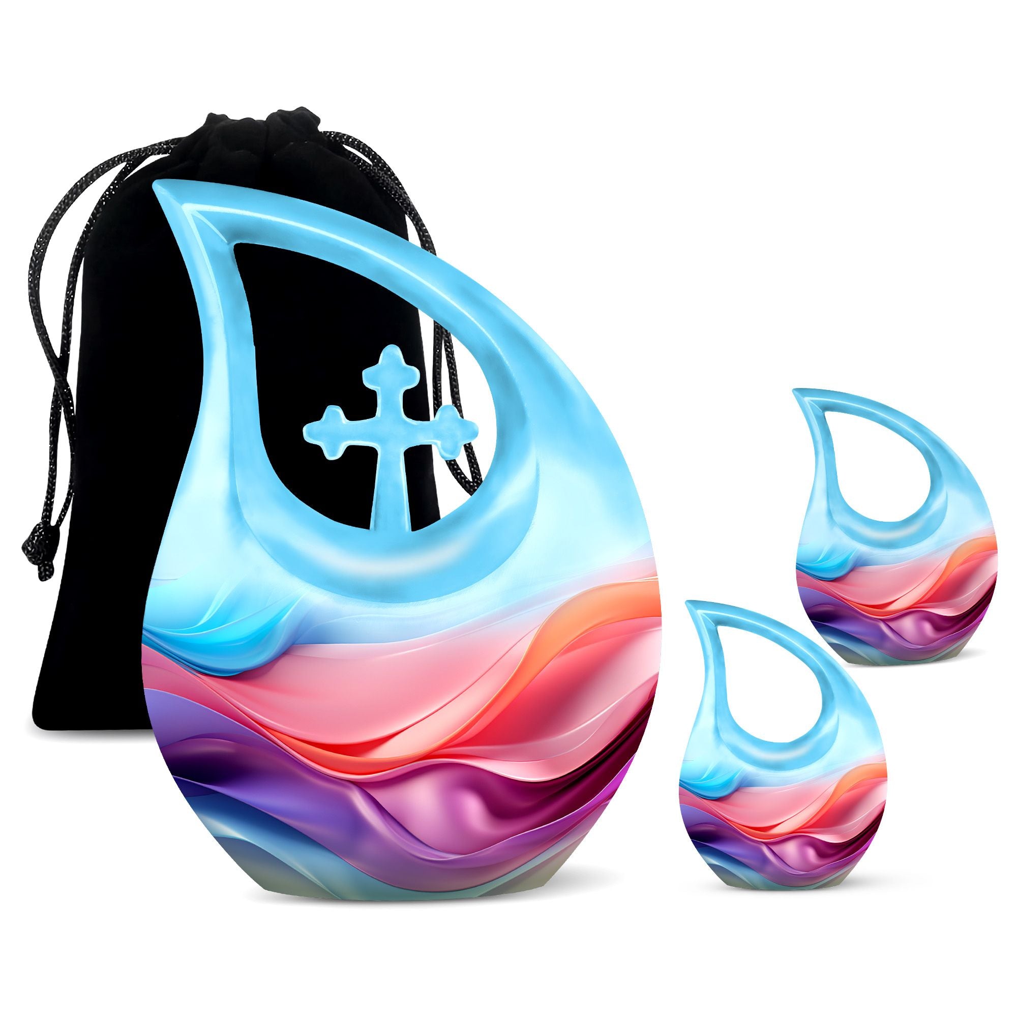 Securely honor the memory of a loved one with our beautiful Silken Waves Urn. This 10-inch large urn, meticulously crafted from sturdy aluminum, serves as an eloquent memorial item. The eminent cross drop-themed urn showcases an understated elegance that gracefully conveys your love and loss. With a capacity of 200 cubic inches, our urn offers considerable room for ashes, while weighing in at a modest 3.3 pounds for ease of placement. For an additional touch of reverence, you are welcome to dignify the urn with personalized names through our custom engraving service. Our urn package also comes with a velvet pouch to safely hold the ashes. Lay your search to rest; whether you're looking for mini urns for ashes, urn vaults, or cheap funeral urns, our Silken Waves Urn caters to your needs in a distinct, yet sophisticated manner, making your memorial experience unforgettable.