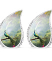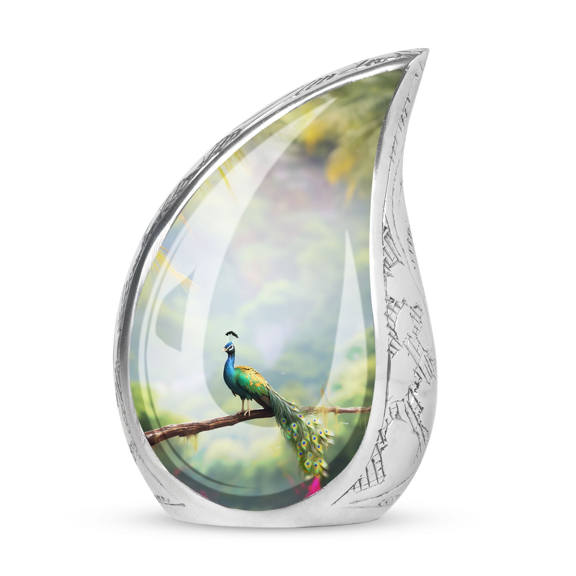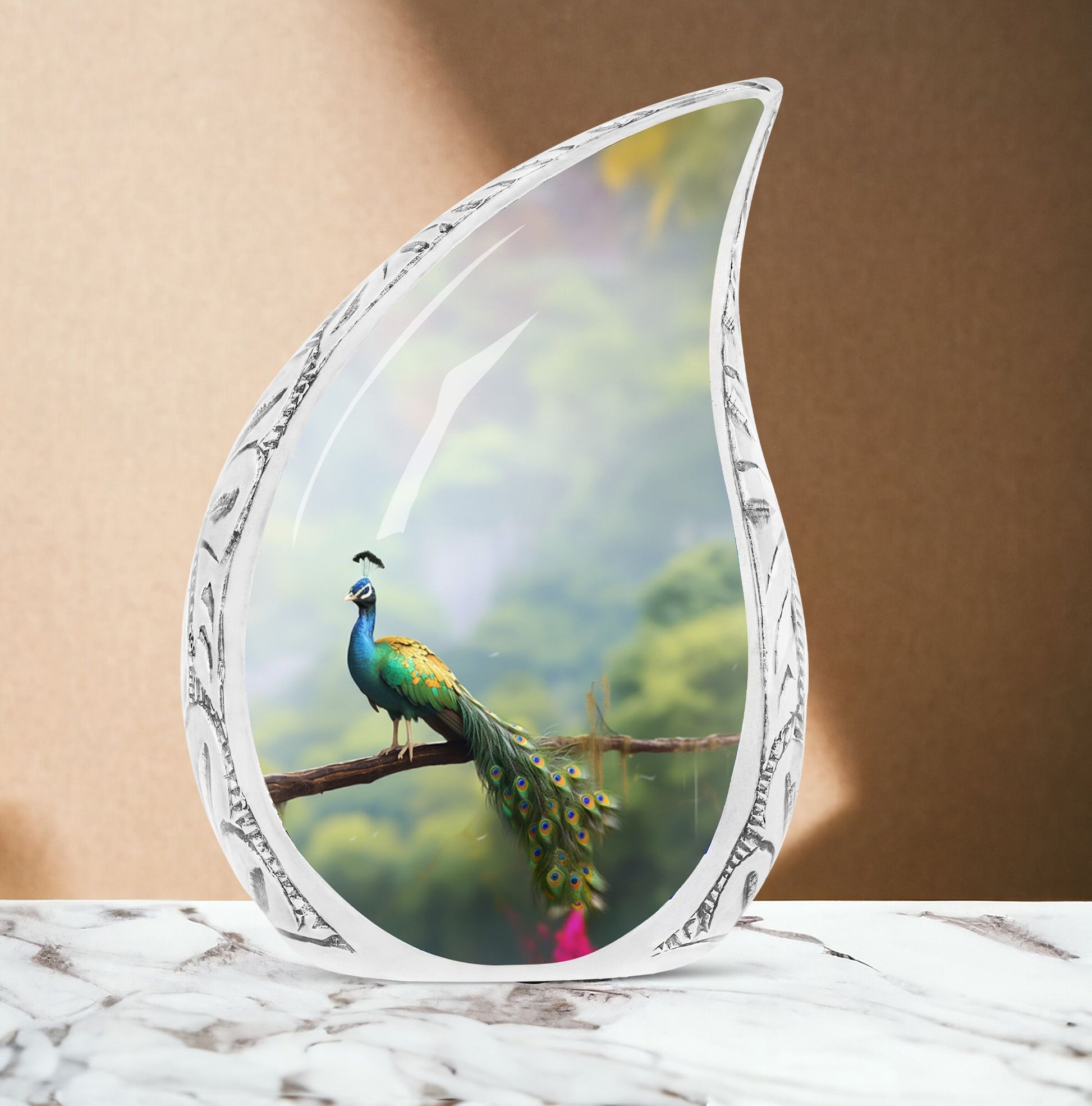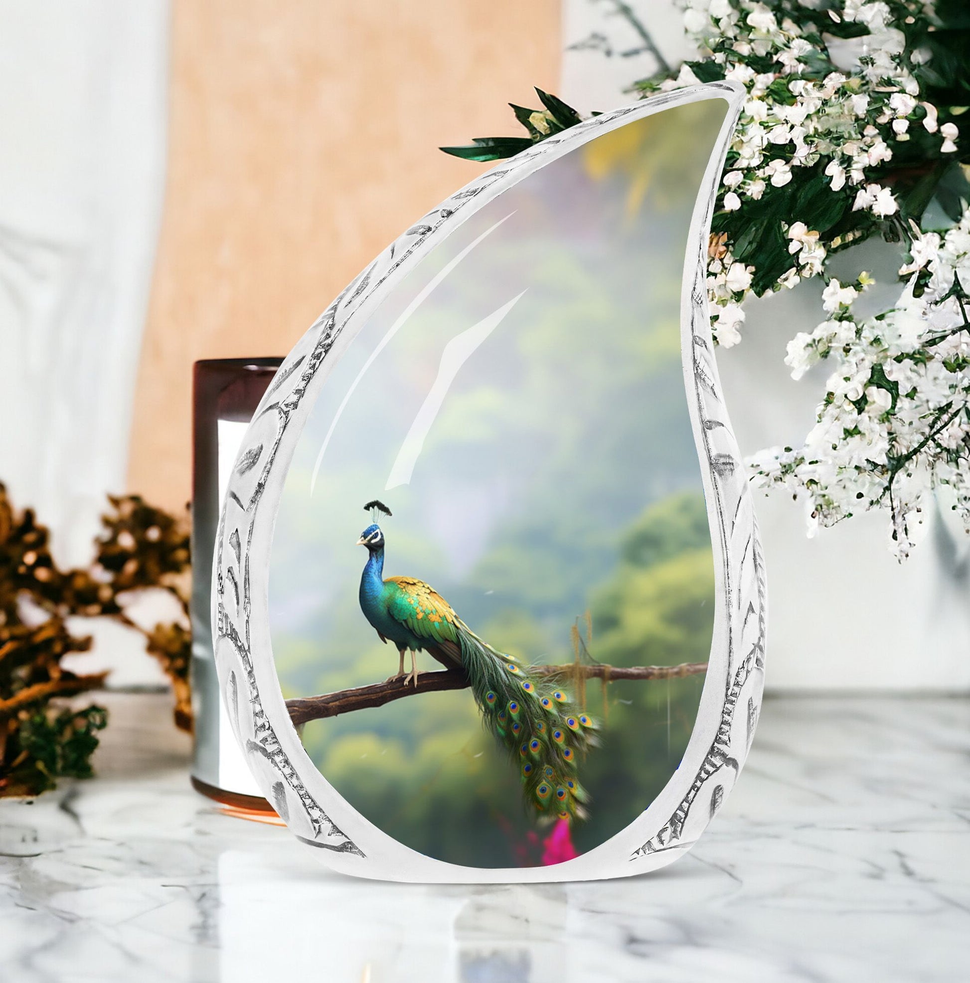 Destined to grace any sacred setting, our Peacock Urn for Ashes provides a respectful and elegant home for those irreplaceable reminders of cherished ones. Fabricated from the finest aluminum, this 3-inch, classic urn has the sturdiness of 3.3 pounds, offering substantial support for up to 200 cubic inches of cherished remains. Its captivating 10-inch height and size categorize it as one of our large urns, ensuring it commands the attention and respect it deserves. A velvet pouch accompanies the urn for secure containment of the ashes. We also offer a hallmark of customization – the opportunity to personalize it with engraving the names of your loved ones, injecting a touch of warmth and closeness. This urn makes a fitting addition to any memorial ceremony supplies, a repository befitting the importance of the departed soul.