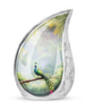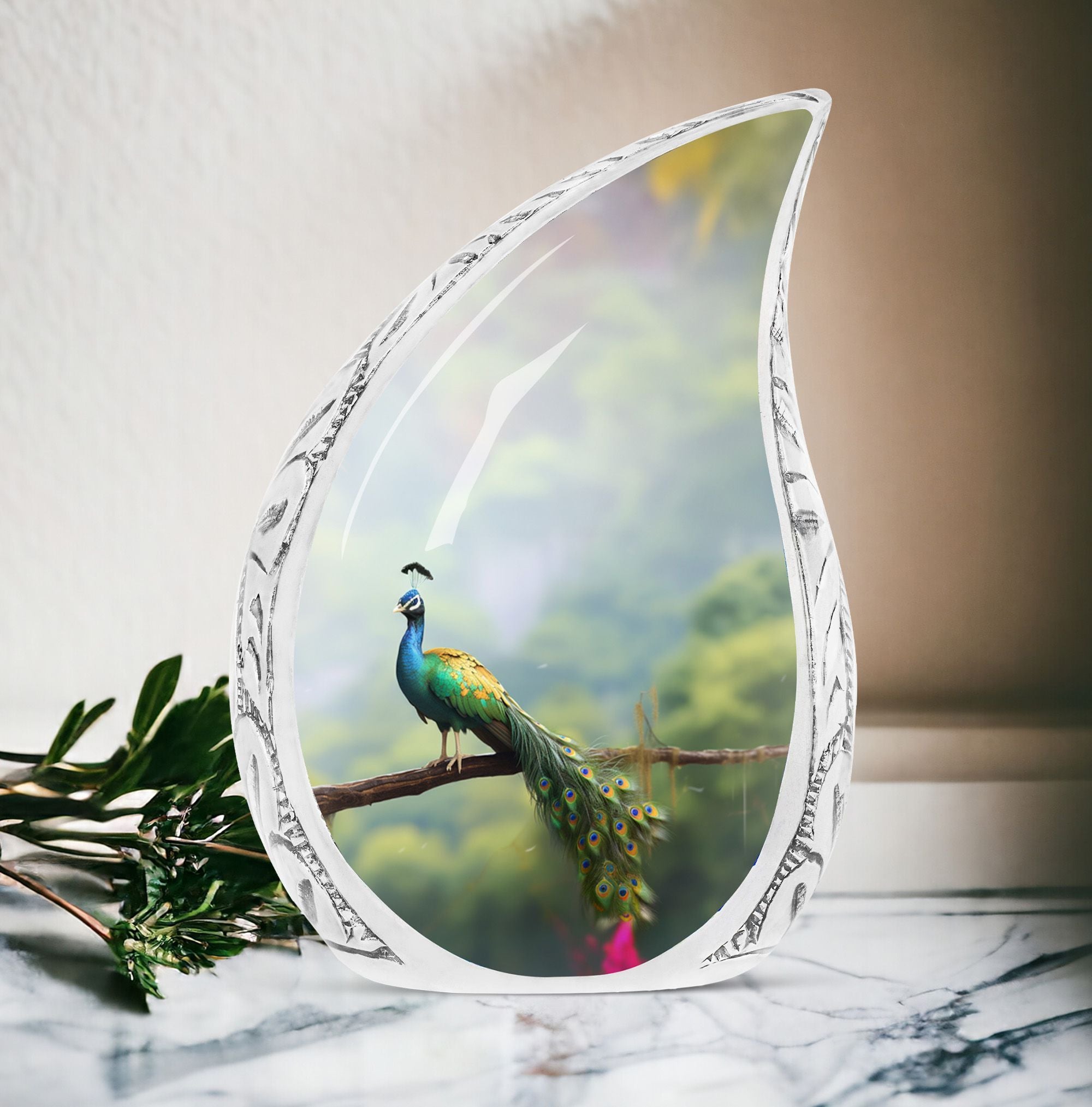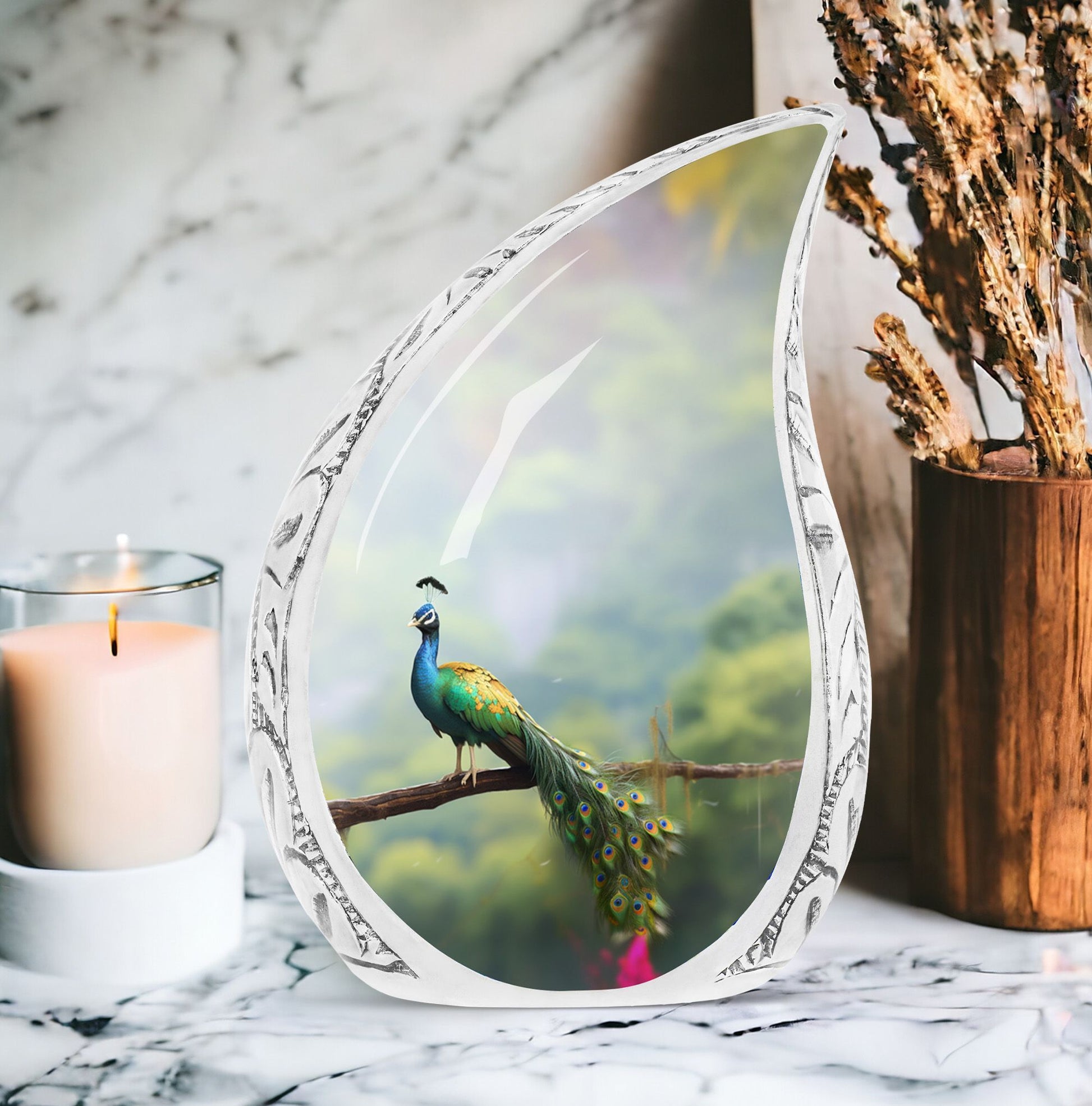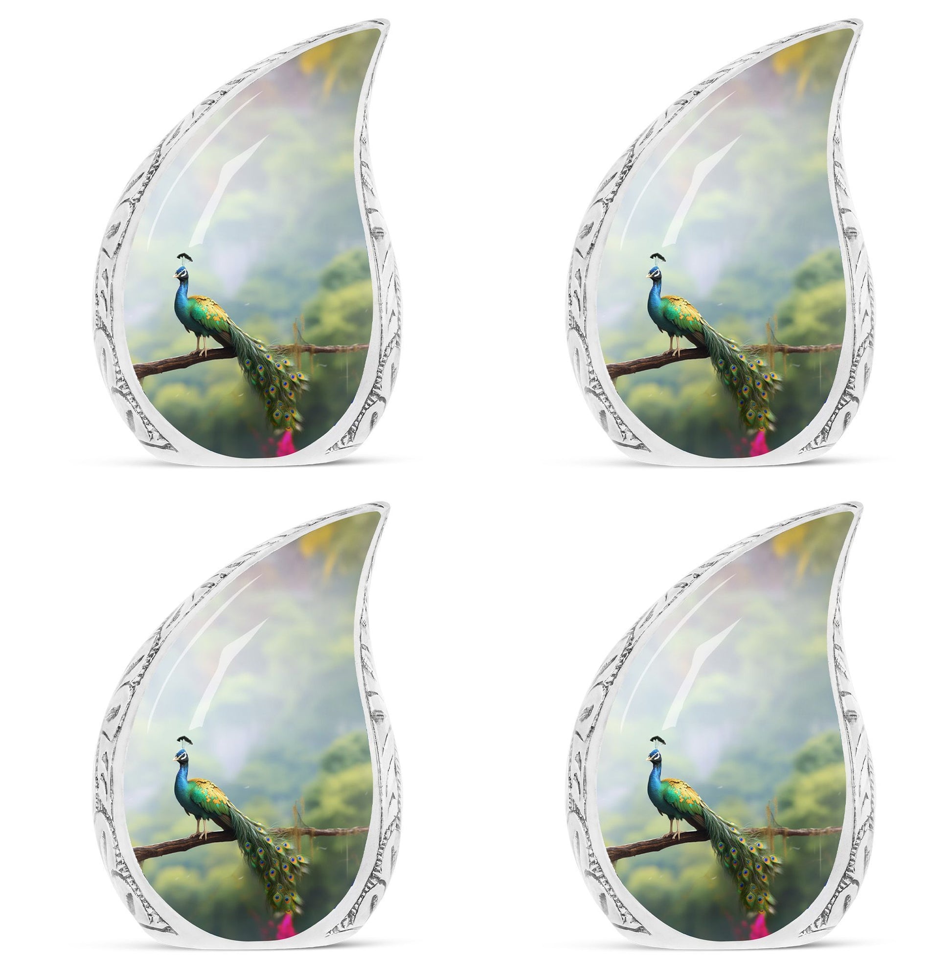 Destined to grace any sacred setting, our Peacock Urn for Ashes provides a respectful and elegant home for those irreplaceable reminders of cherished ones. Fabricated from the finest aluminum, this 3-inch, classic urn has the sturdiness of 3.3 pounds, offering substantial support for up to 200 cubic inches of cherished remains. Its captivating 10-inch height and size categorize it as one of our large urns, ensuring it commands the attention and respect it deserves. A velvet pouch accompanies the urn for secure containment of the ashes. We also offer a hallmark of customization – the opportunity to personalize it with engraving the names of your loved ones, injecting a touch of warmth and closeness. This urn makes a fitting addition to any memorial ceremony supplies, a repository befitting the importance of the departed soul.