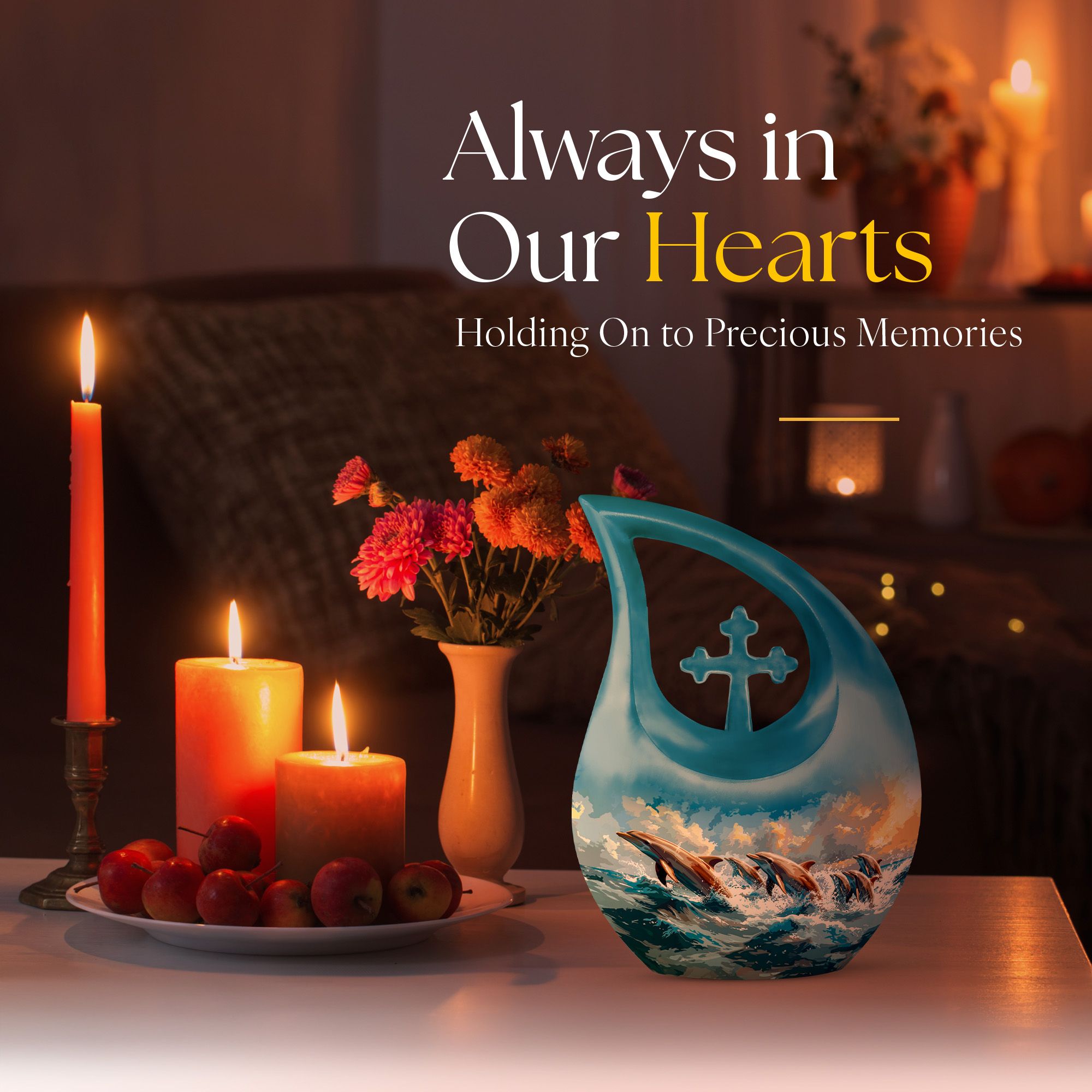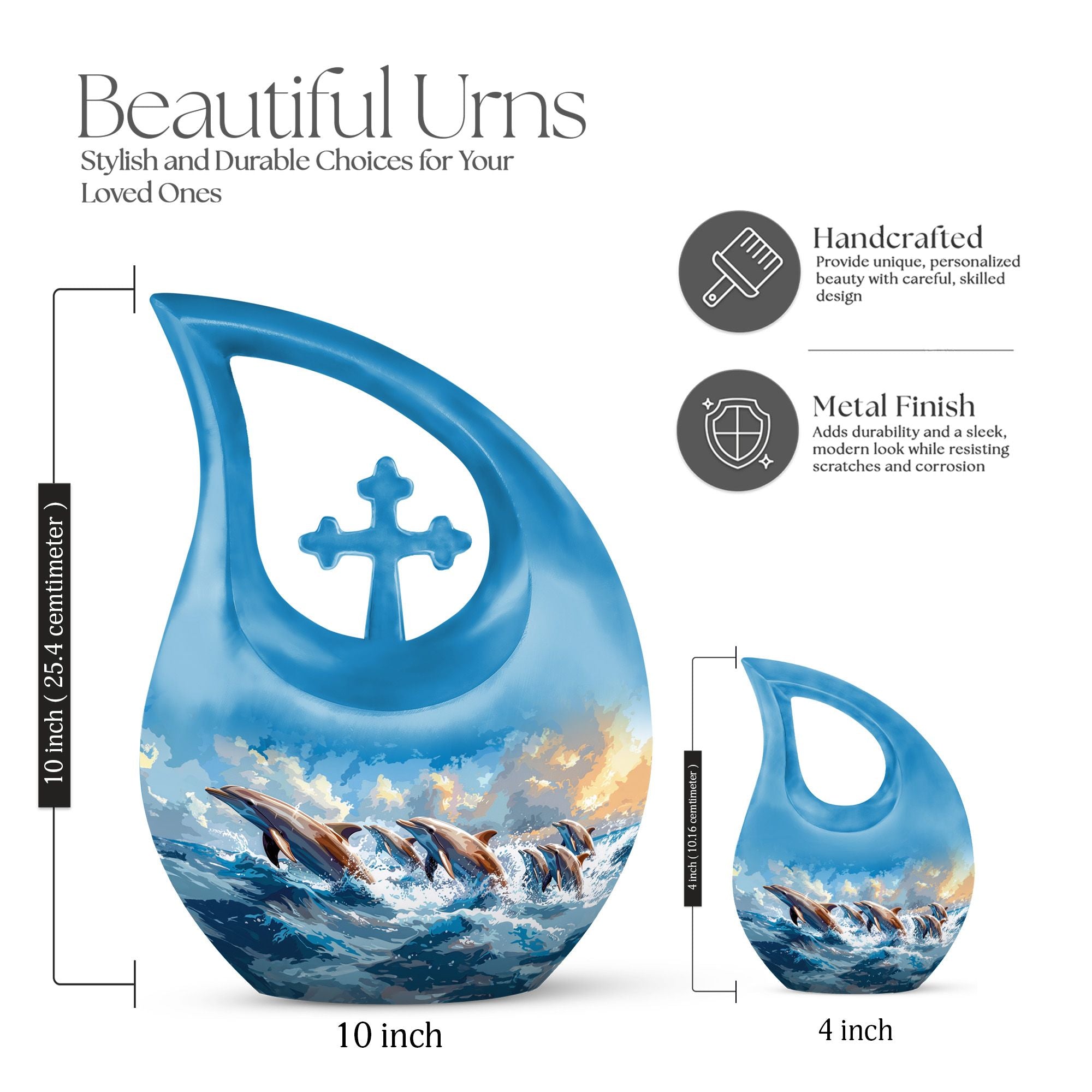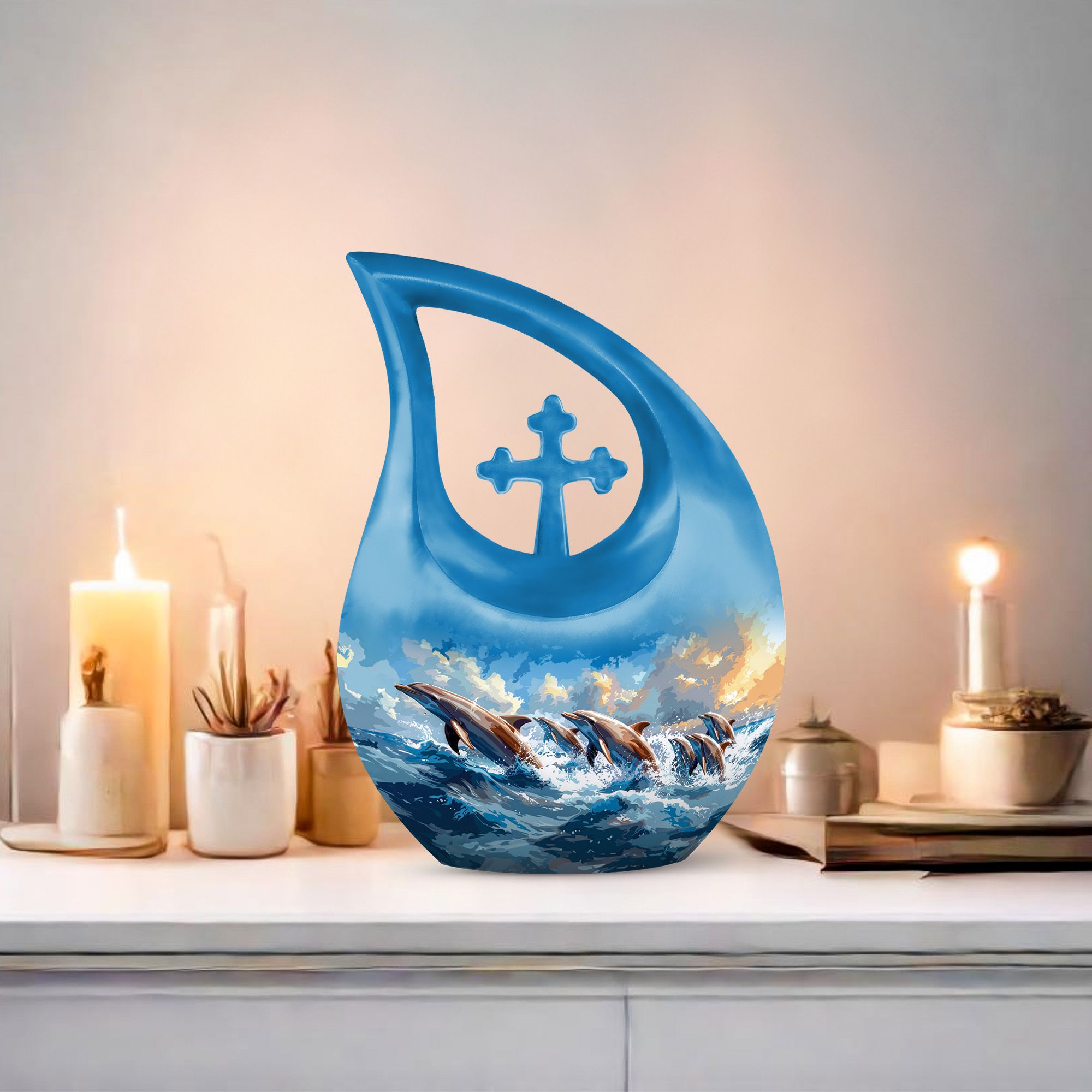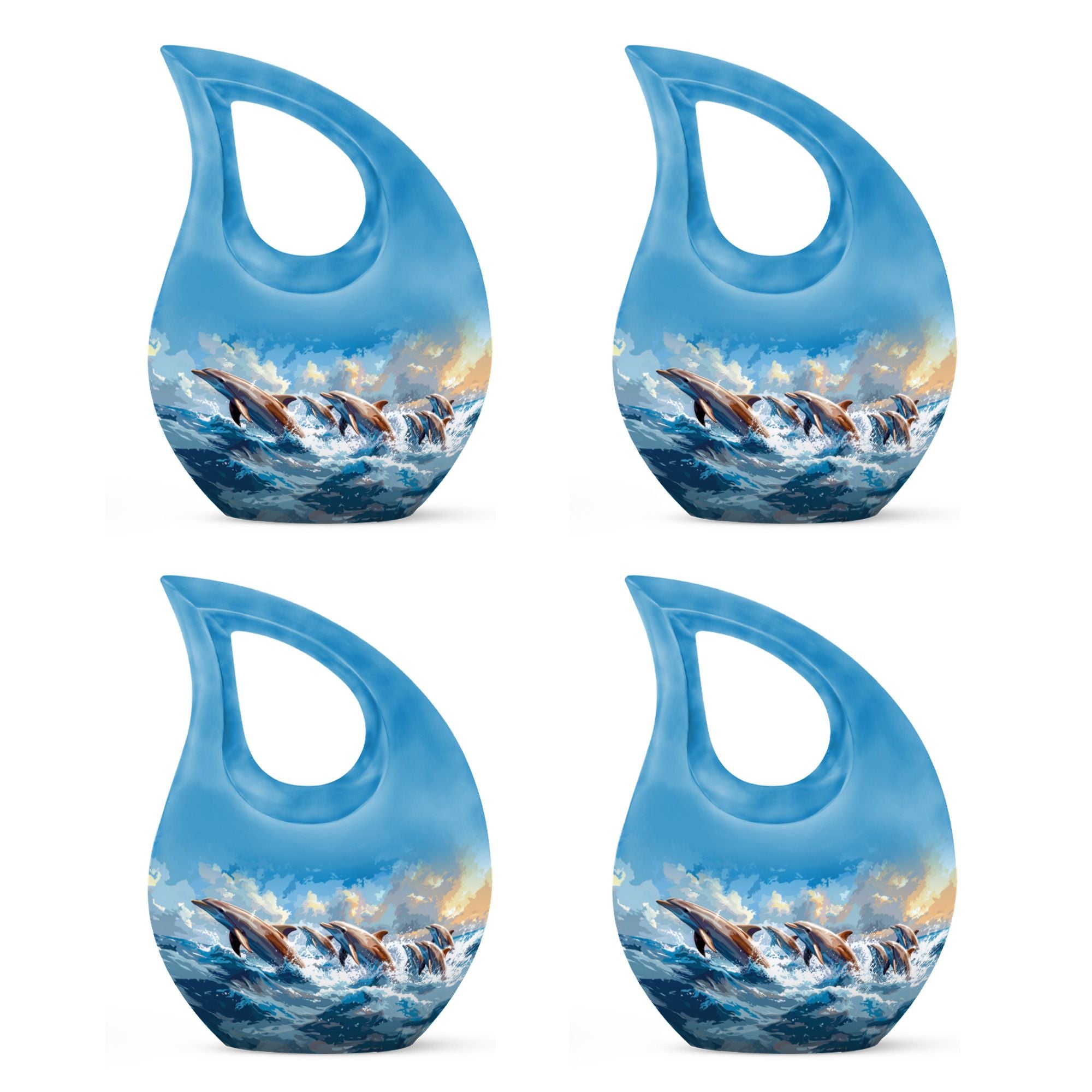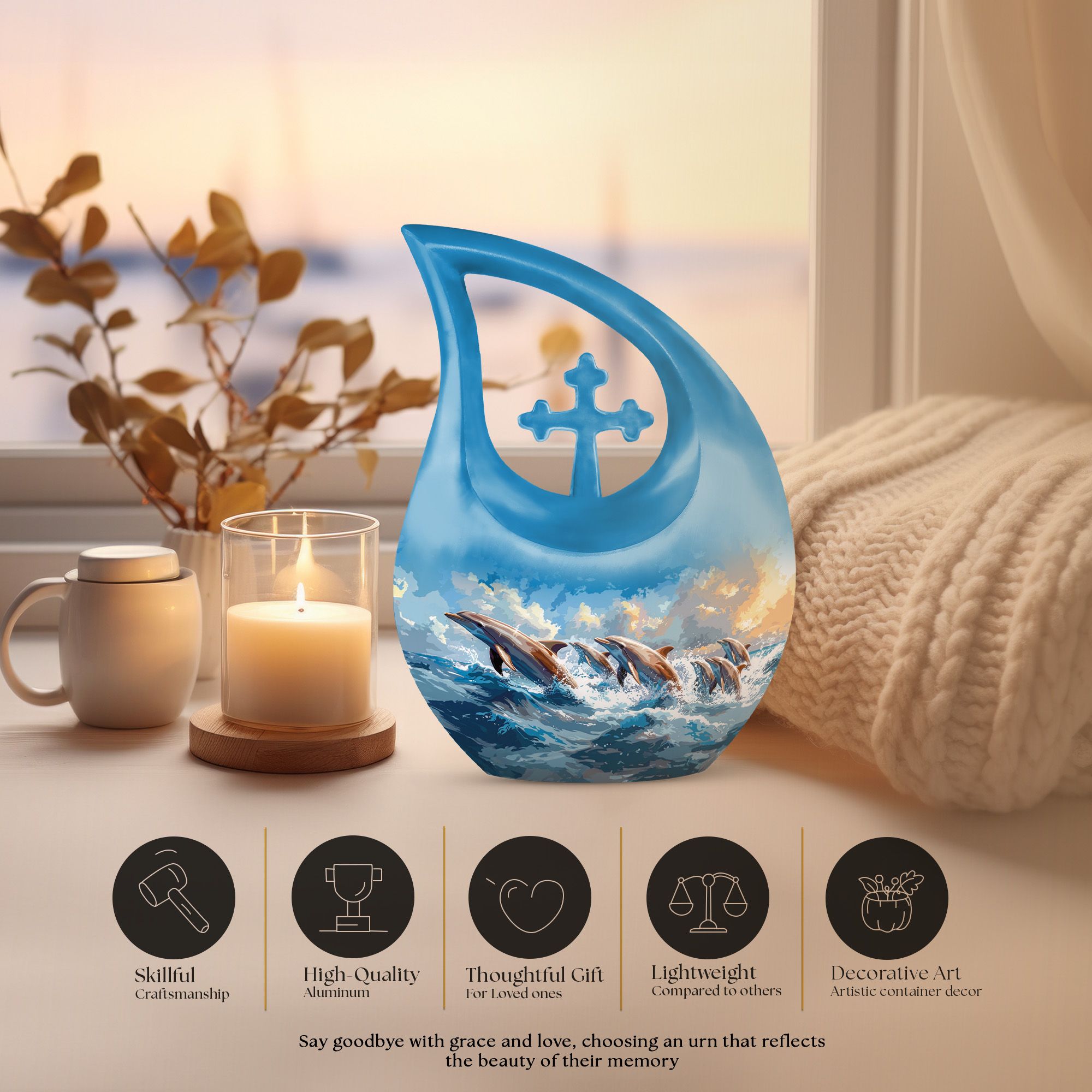 Keep the loving memory of your departed alive and close to home with our expertly crafted Skyward Dolphin Leap Urn. An elegantly proportioned vessel, measuring 10 inches in height, it has a capacity to safely contain 200 cubic inches of your loved one's ashes. This large urn, weighing a sturdy 3.3 pounds, is made from finely finished aluminium, reflecting the unique theme of Skyward Dolphin Leap. This luxury cremation urn beautifully symbolizes the soul's journey towards peace and freedom. It's not just an urn, but a work of art that can seamlessly blend with the decor of your home. Moreover, you can personalize it by engraving names. This luxury urn also includes a velvet pouch for dignified containment and easy transportation of ashes. Among memorial urns, this is a different yet highly profound choice for both adults and seniors. Besides, it's also an excellent choice for those looking for unusual, nice, or personalized urns for human or pet ashes.