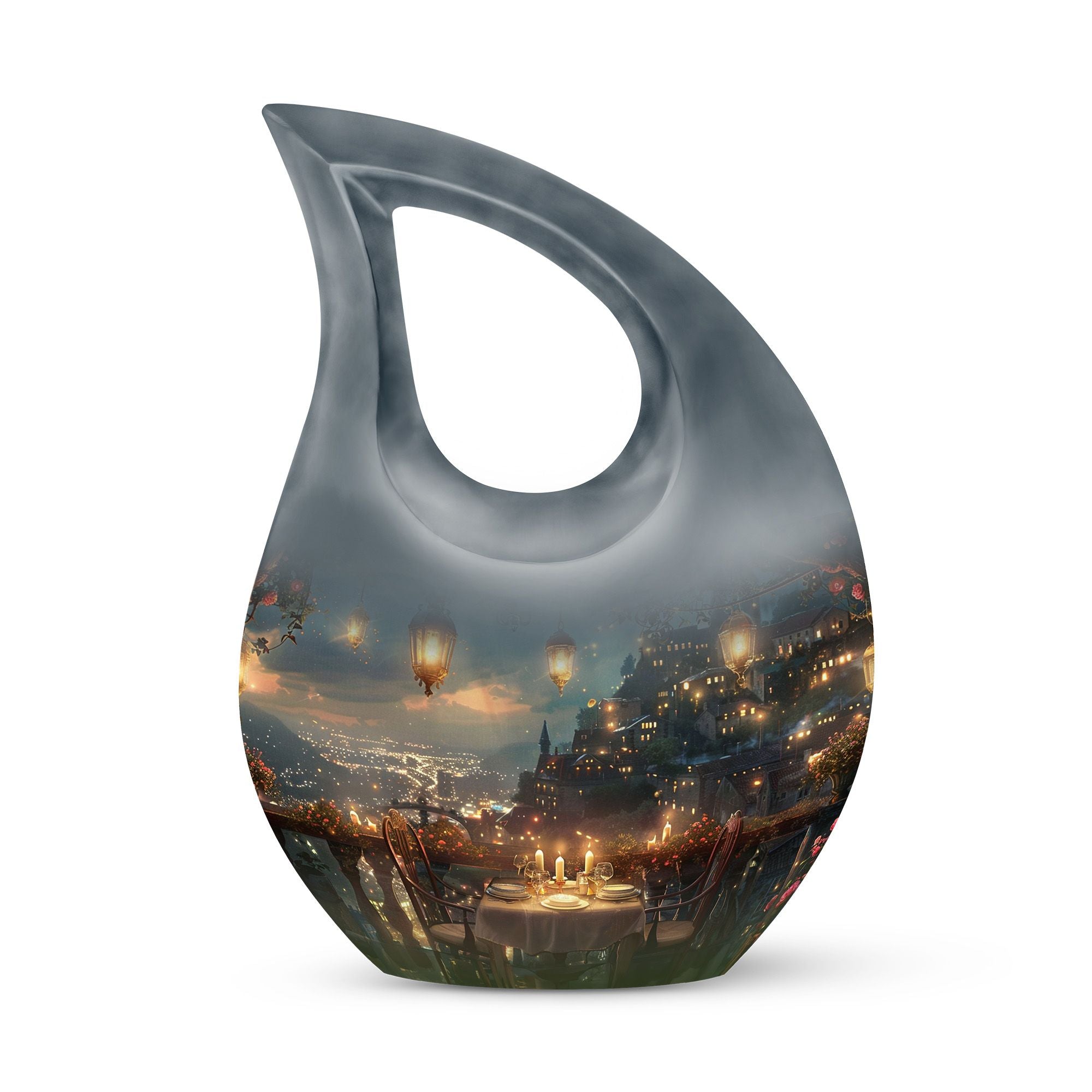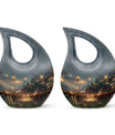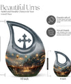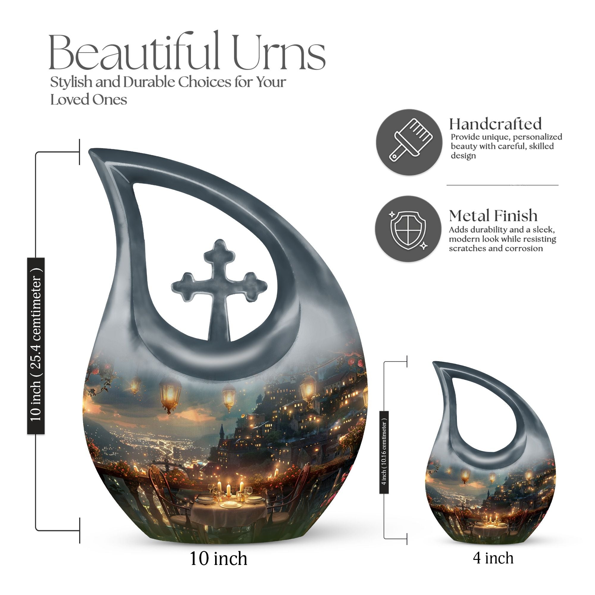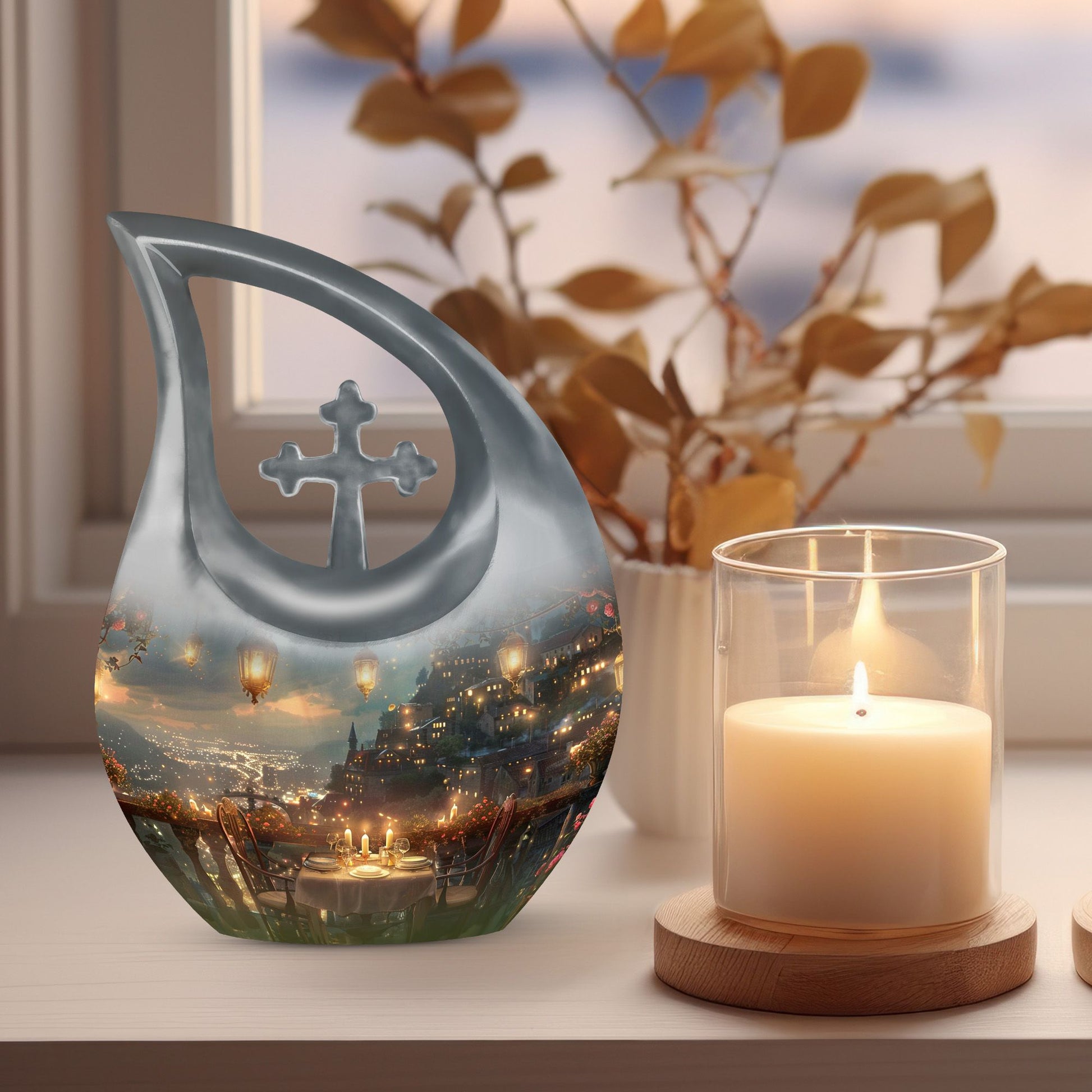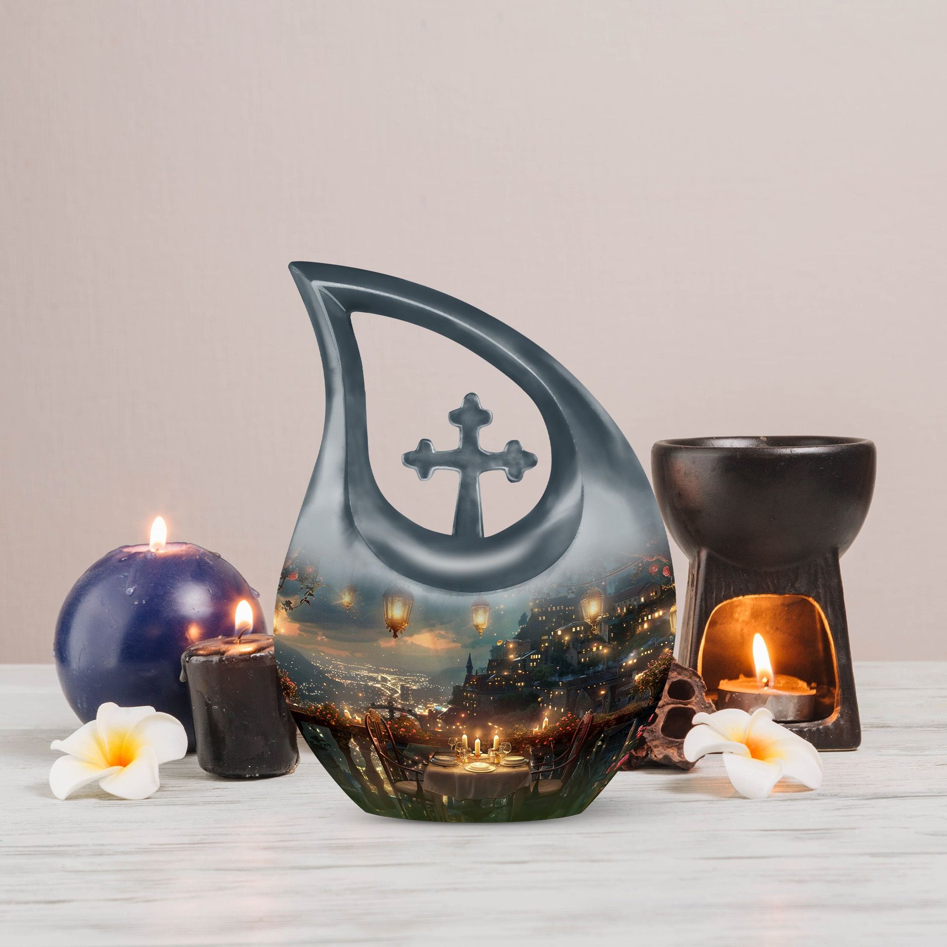 Specially crafted for individuals seeking a distinctive way to remember a beloved one, our 'A Romantic Dinner Urn' is an elegant and meaningful keepsake. Sized generously at 10 inches and light in weight at 3.3 pounds, this memorial urn offers ample space with a capacity of 200 cubic inches. Made from top-quality aluminium, it impeccably showcases the 'Cross Drop' symbol, creating a serene and divine ambiance. This impressive piece comes with a velvet pouch for holding ashes securely and respectfully. What sets our urn apart is the unique facility to customize and personalize it with engraved names, making it even more special and intimate. Additionally, the 'A Romantic Dinner' theme adds a touch of warmth and love to the urn. Search phrases like 'Mini Keepsake Urns', 'Urn Box For Ashes', 'Urns For Two', 'Metal Urns For Sale' are synonymous with this product. Commemorate your loved one with this beautiful memorial urn, a true testament to a life well-lived.