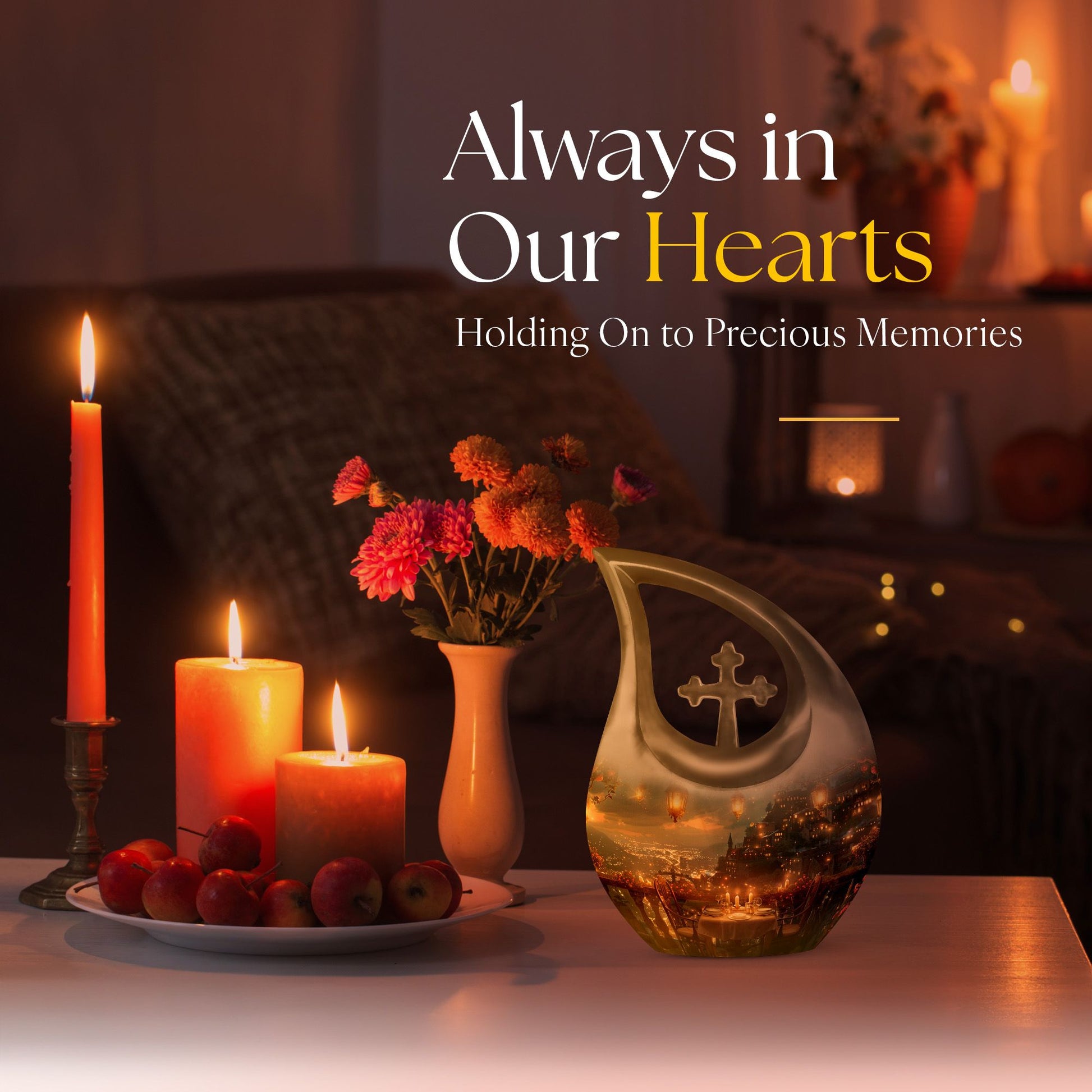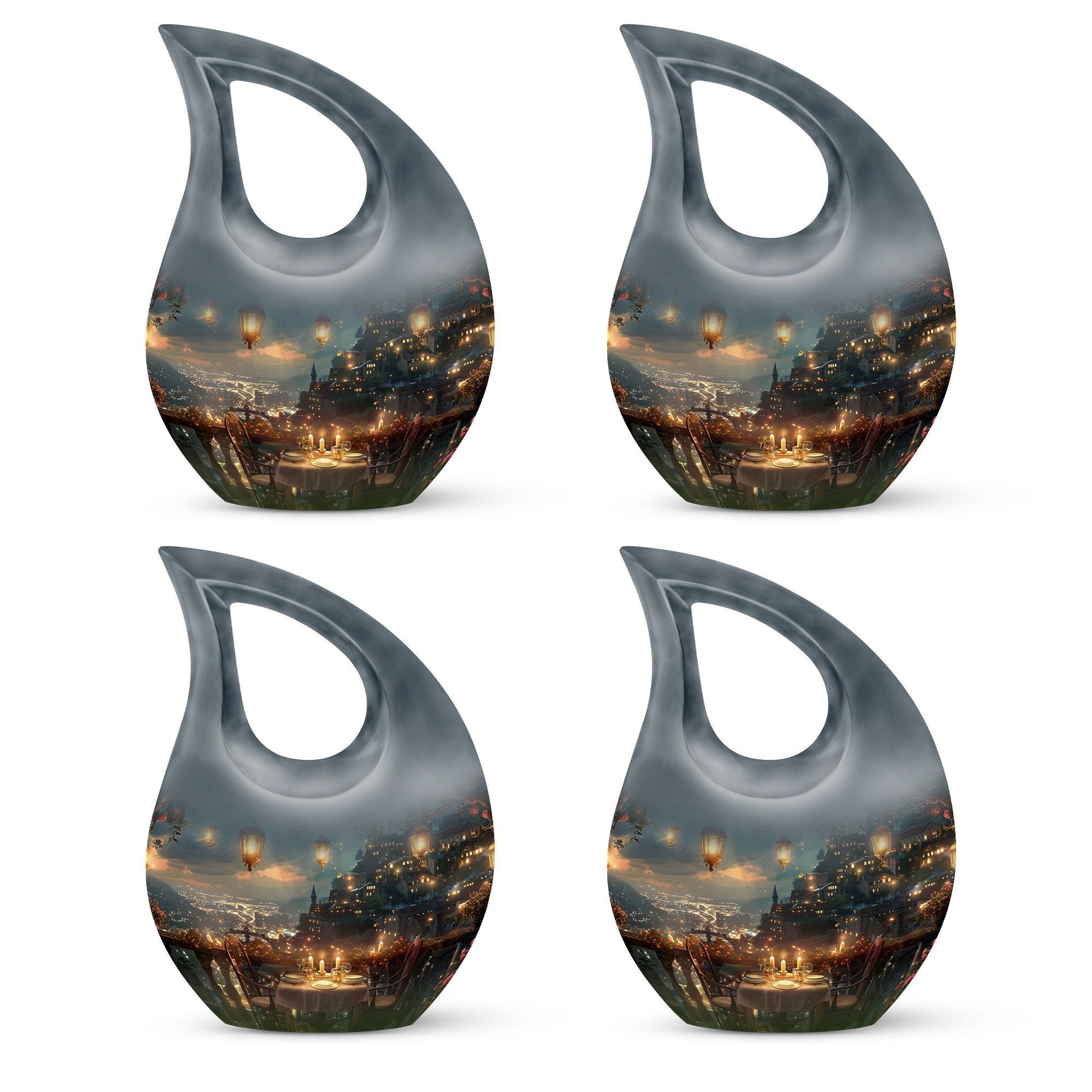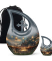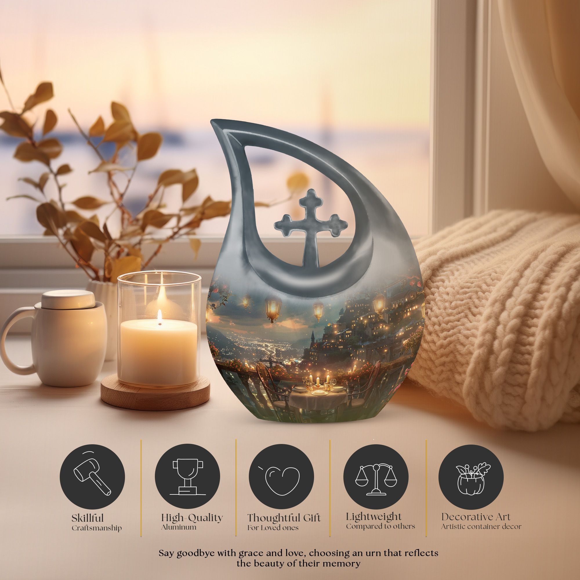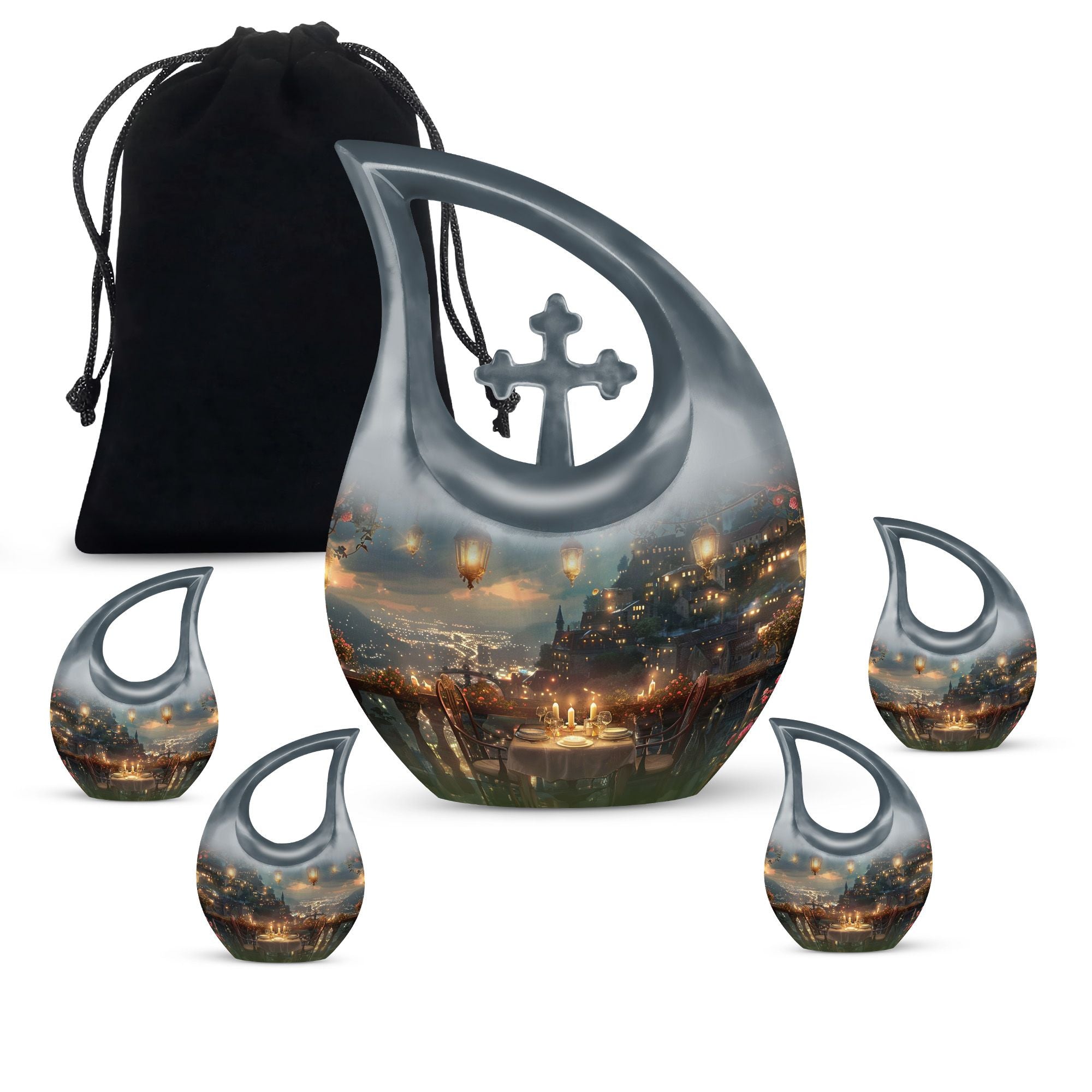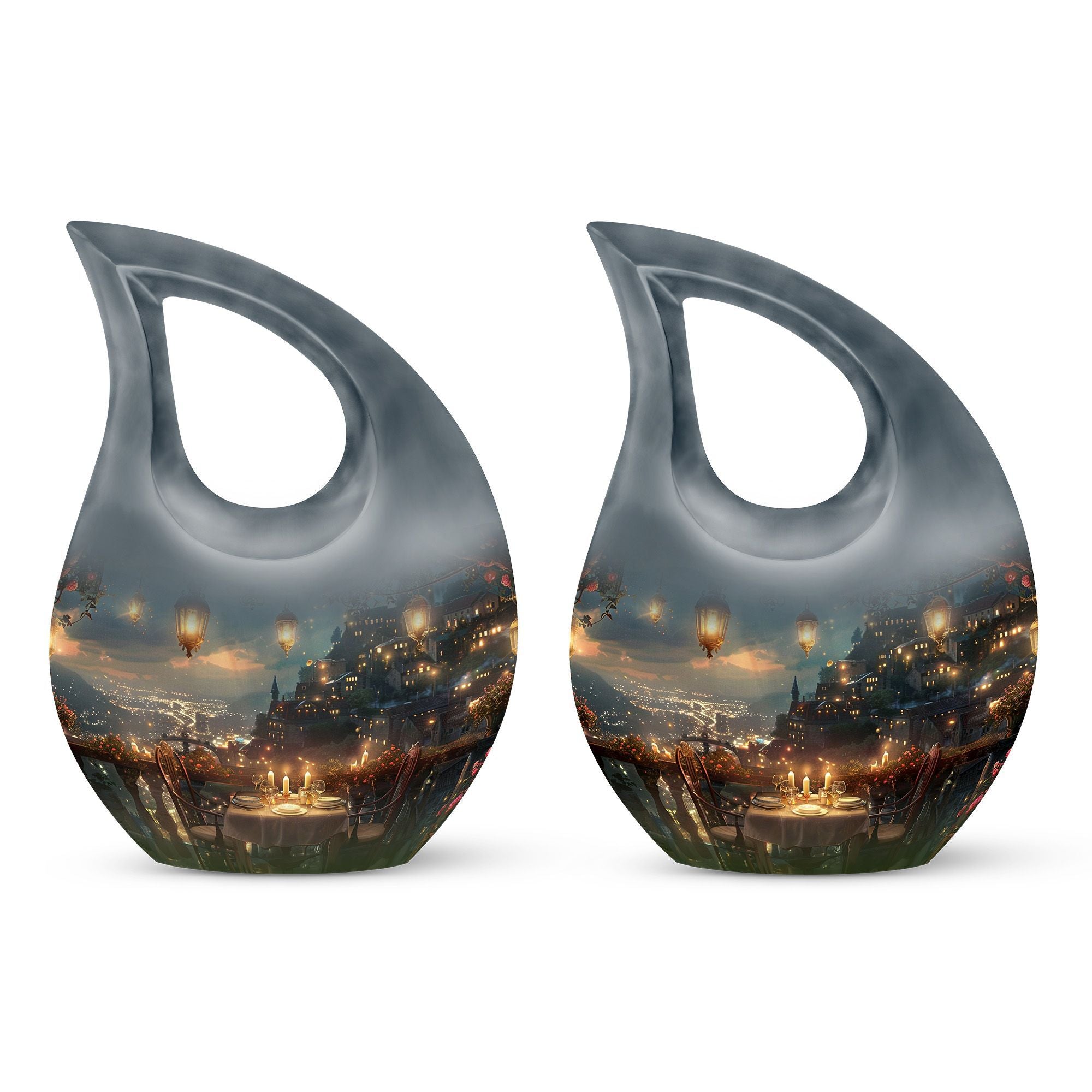Specially crafted for individuals seeking a distinctive way to remember a beloved one, our 'A Romantic Dinner Urn' is an elegant and meaningful keepsake. Sized generously at 10 inches and light in weight at 3.3 pounds, this memorial urn offers ample space with a capacity of 200 cubic inches. Made from top-quality aluminium, it impeccably showcases the 'Cross Drop' symbol, creating a serene and divine ambiance. This impressive piece comes with a velvet pouch for holding ashes securely and respectfully. What sets our urn apart is the unique facility to customize and personalize it with engraved names, making it even more special and intimate. Additionally, the 'A Romantic Dinner' theme adds a touch of warmth and love to the urn. Search phrases like 'Mini Keepsake Urns', 'Urn Box For Ashes', 'Urns For Two', 'Metal Urns For Sale' are synonymous with this product. Commemorate your loved one with this beautiful memorial urn, a true testament to a life well-lived.