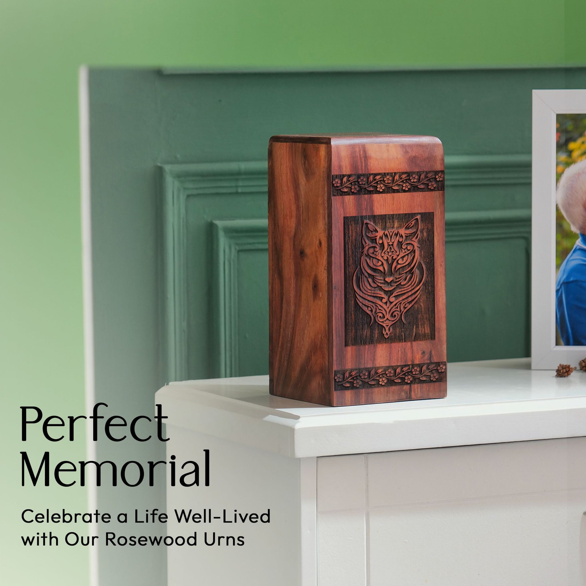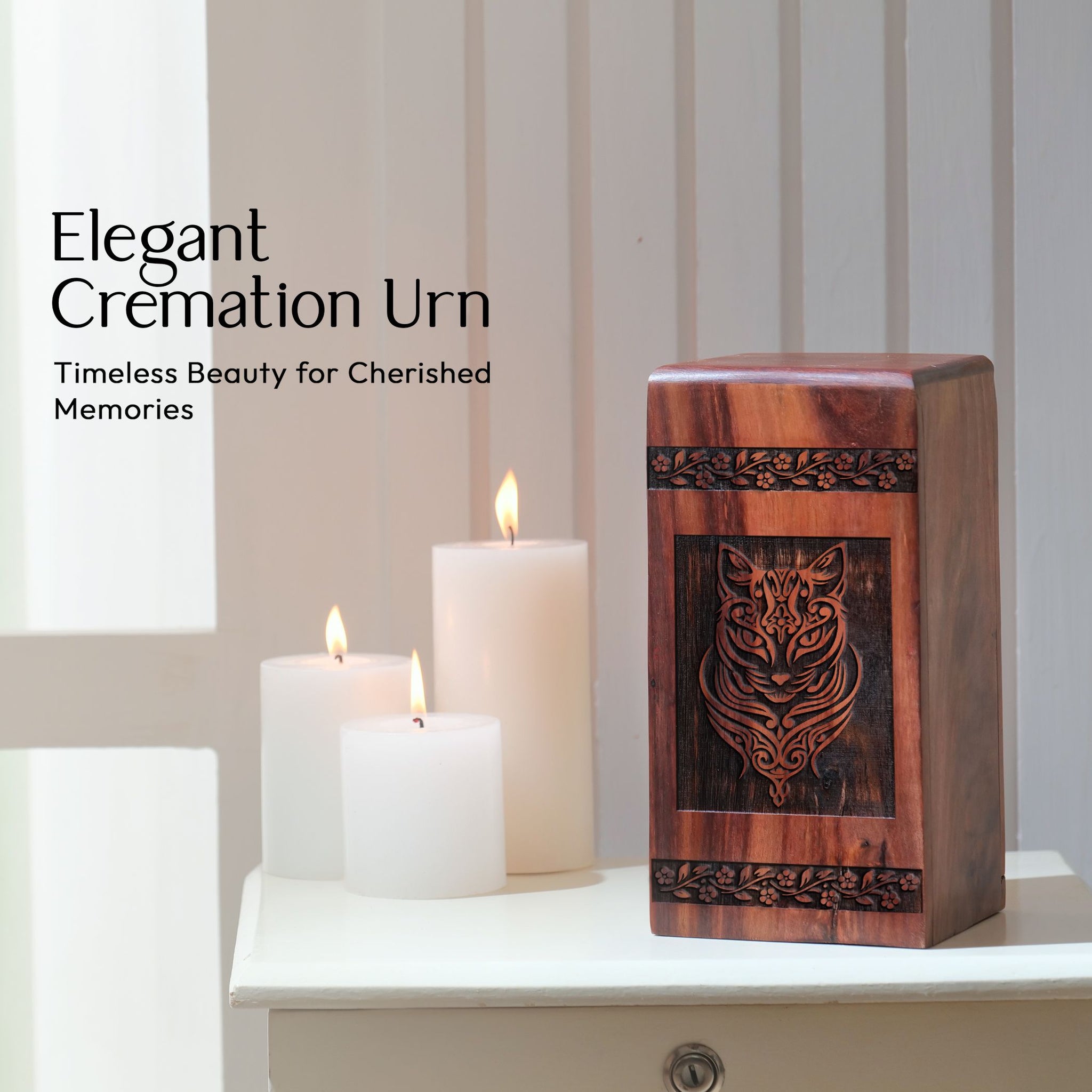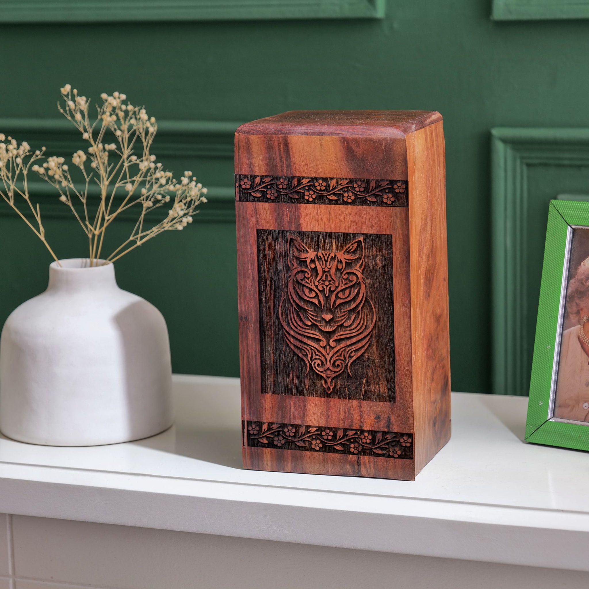 Usher in a sense of tranquillity and remembrance with our Wooden Cat Urns for Ashes, a small yet elegant memento adeptly crafted for the purpose of preserving the memory of your departed feline friend. These urns' sublime craftsmanship encapsulates the enduring bond between man and pet, making it a fitting tribute. They are not just cremation urns, but vessels that guard the timeless spirit of your beloved feline companion. Each urn is specially designed to serve not just as resting places for your pet's ashes, but also as a sentimental keepsake. In remembrance of your irreplaceable furry friend, these cremation urns cater to all adults, providing immense comfort during times of remembrance. With the Urns For Men range, male adults can find an aesthetic urn catering to their style, where the strength and resilience of masculinity reflect through quality craftsmanship. Experience the unparalleled blend of emotion and artistry with these cremation urns for adult ashes. They hold not just physical remnants, but the eternal bond, love, and memories of a life well lived.