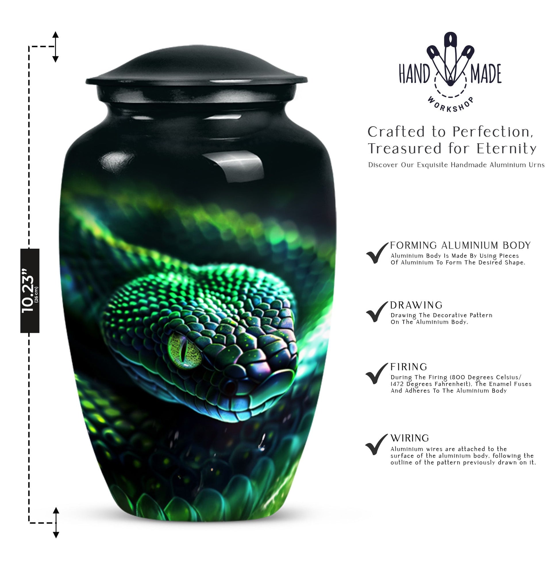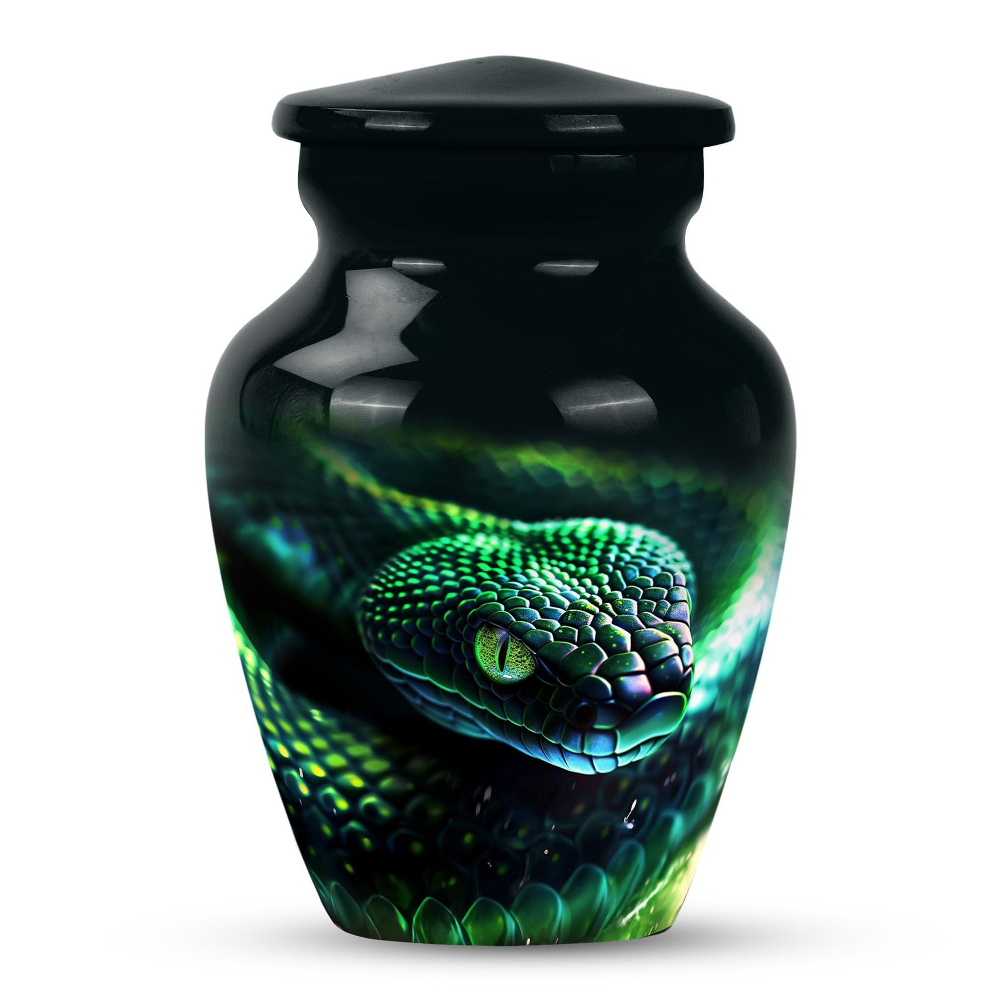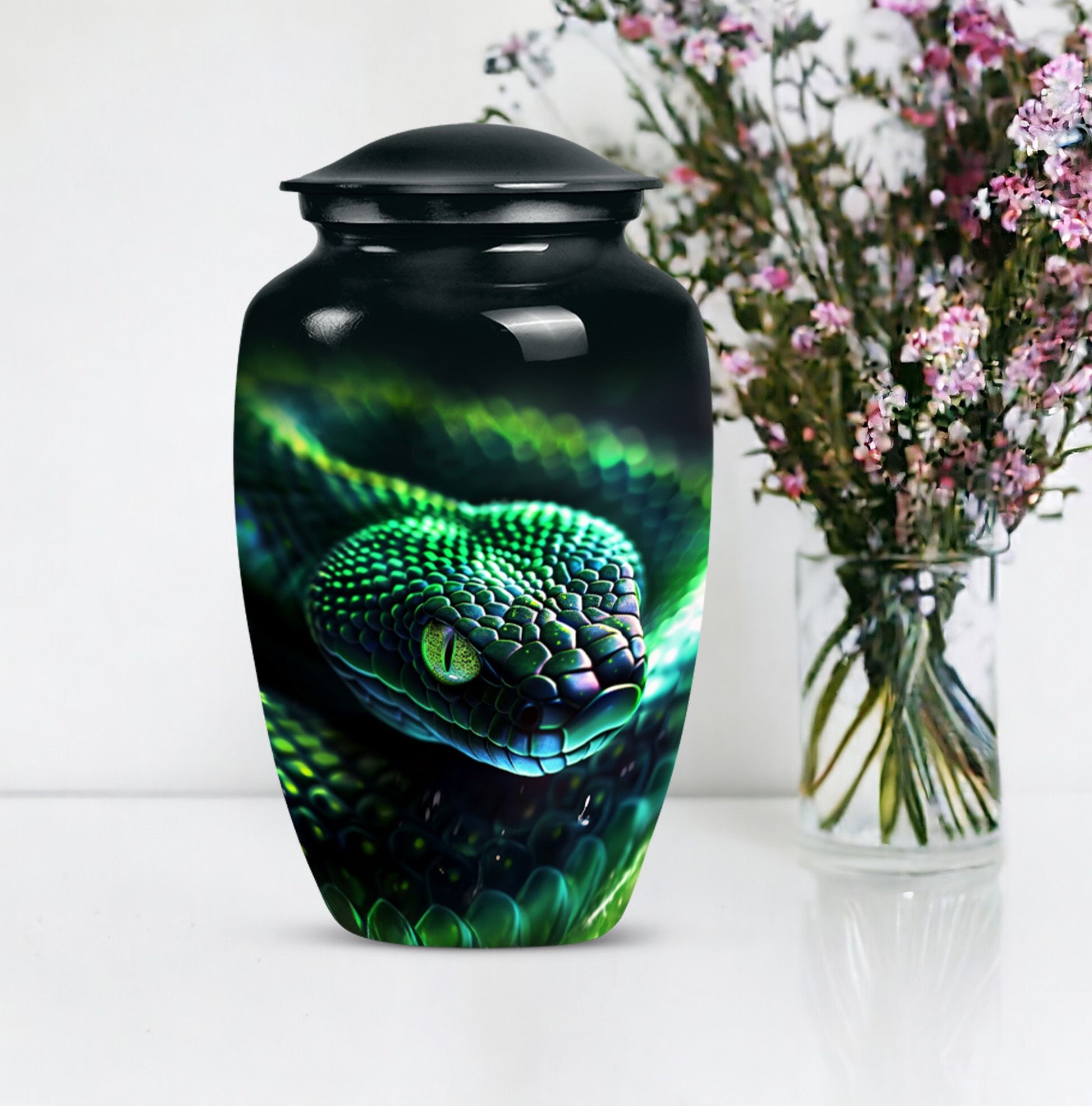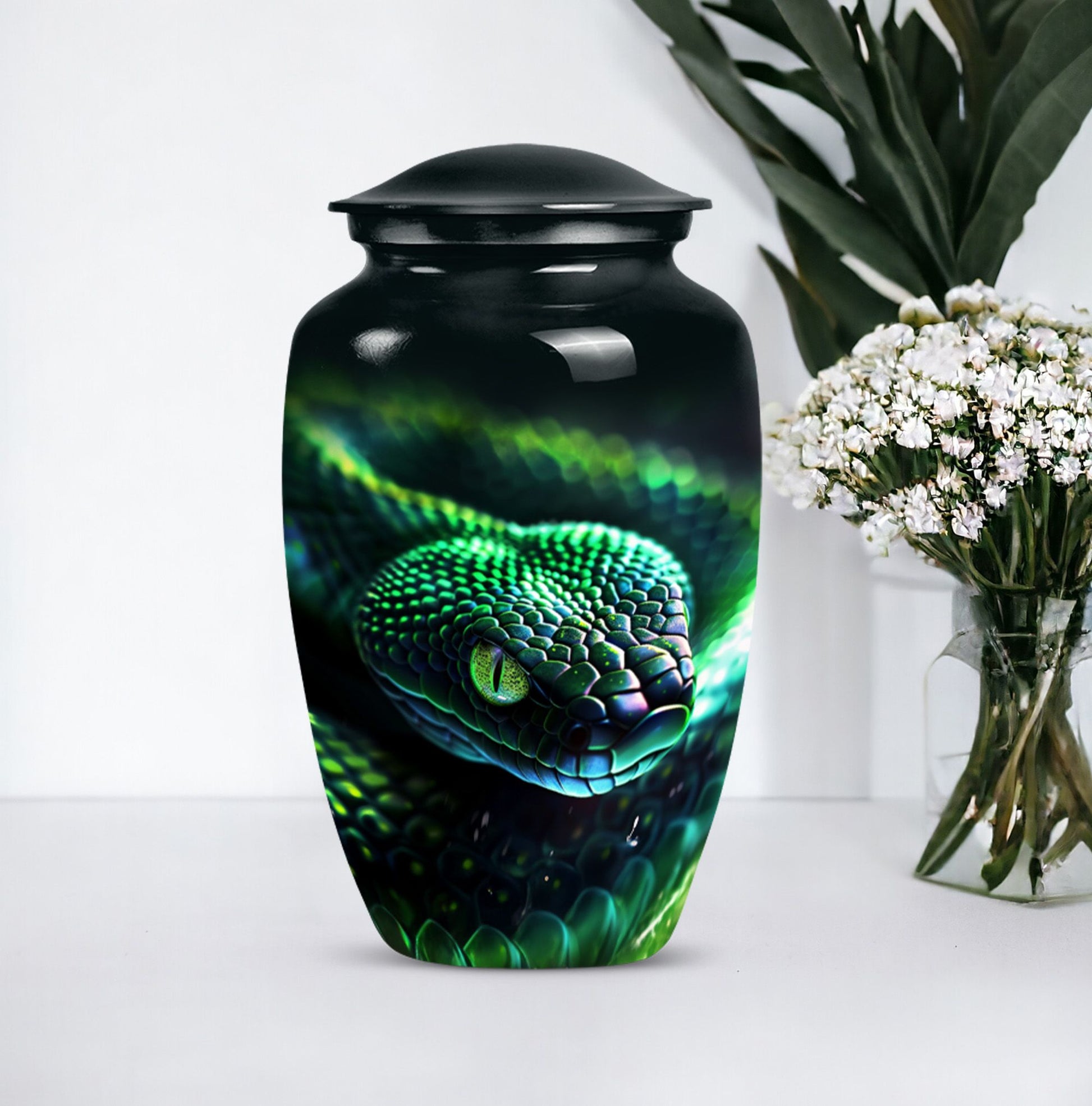 Honor your loved ones with dignity using our beautifully constructed snake urn, a distinctive choice among burial medium size urns. Crafted from high-quality aluminium, this large urn exudes an air of abstract-themed elegance. Weighing 3.3 pounds and standing 10 inches tall, it's roomy with a capacity to hold 200 cubic inches of remains. Our snake urn bridges function and form, with an appealing aesthetic that offers comfort during the grieving process. Each urn comes with a velvet pouch, enhancing the safe containment and preservation of ashes. Add a touch of personal significance with our offered customization - engrave the names of your dear ones on the urn. This exquisite resting place is perfect not just for men but can also serve as cremation urns for women. Uniquely artistic, it equally complements a ground burial or indoor memorial display. Buy this snake urn and add a beautiful touch to your memorial ceremony, while ensuring your departed loved one rests in peace and style.