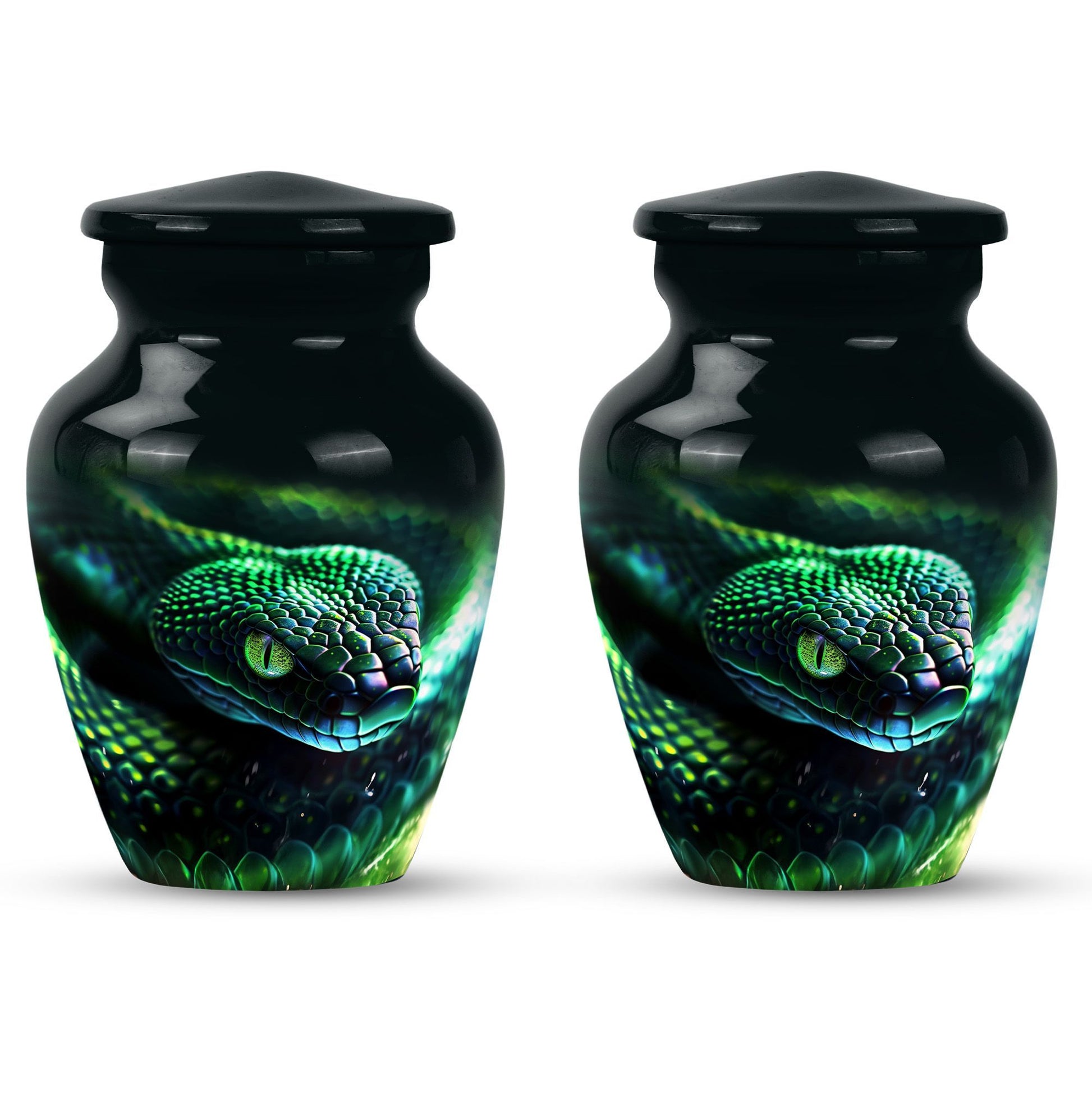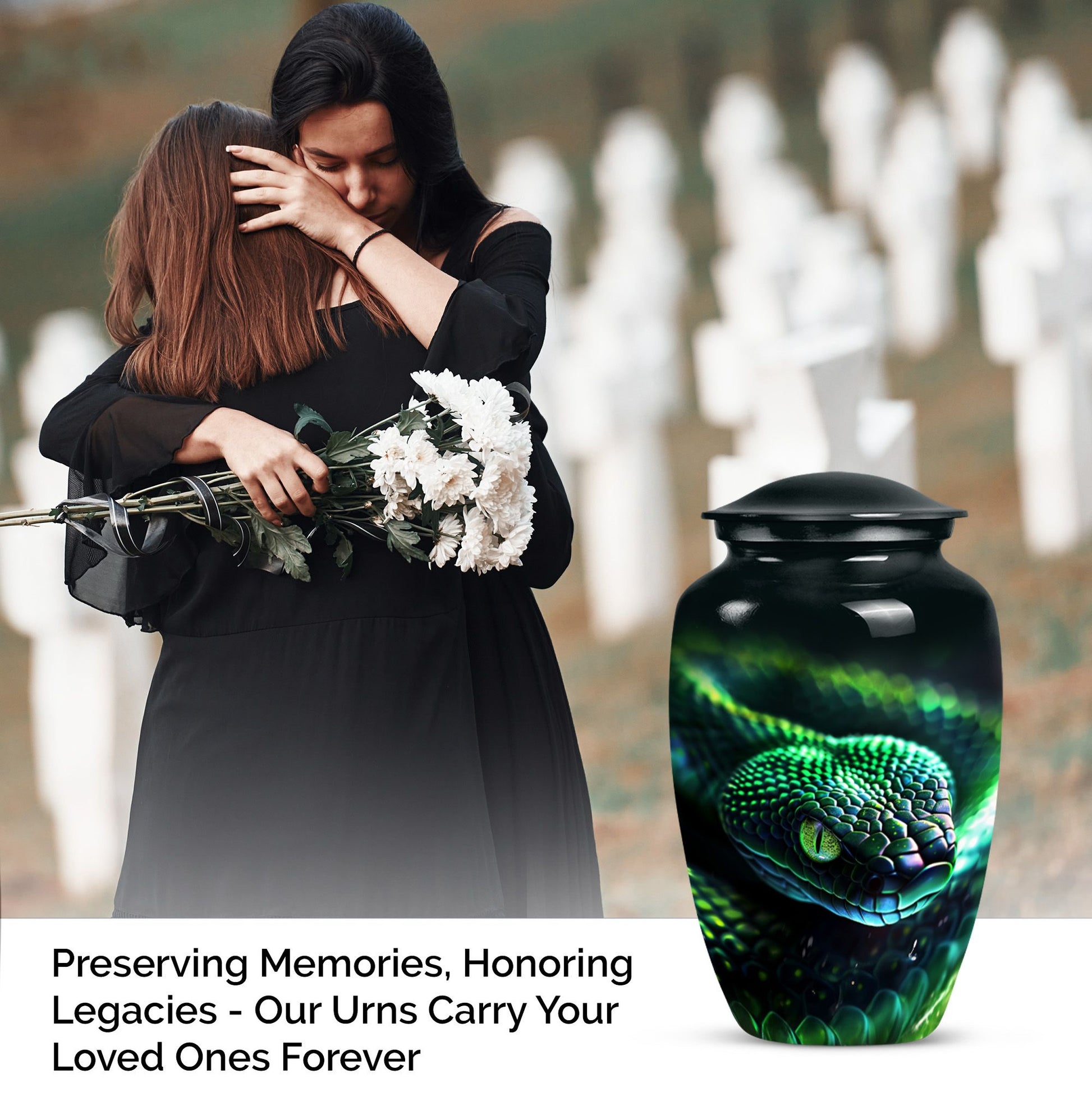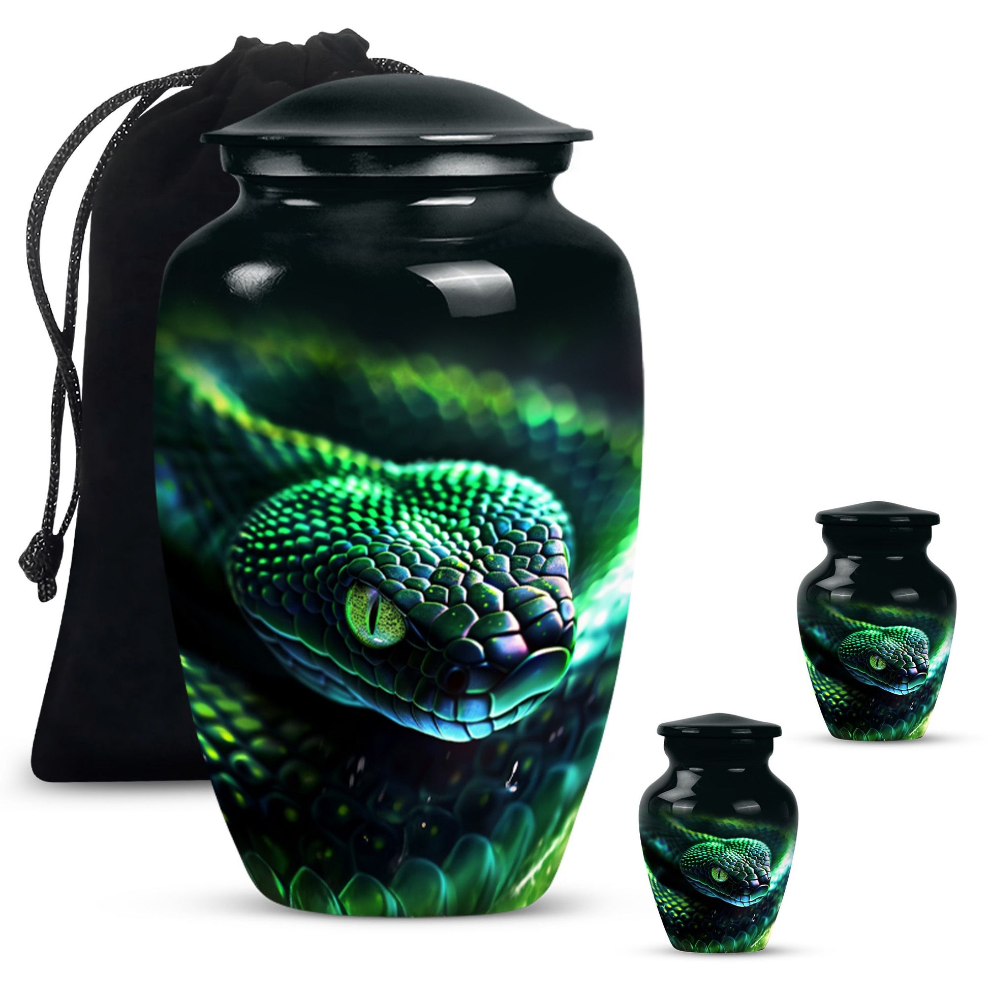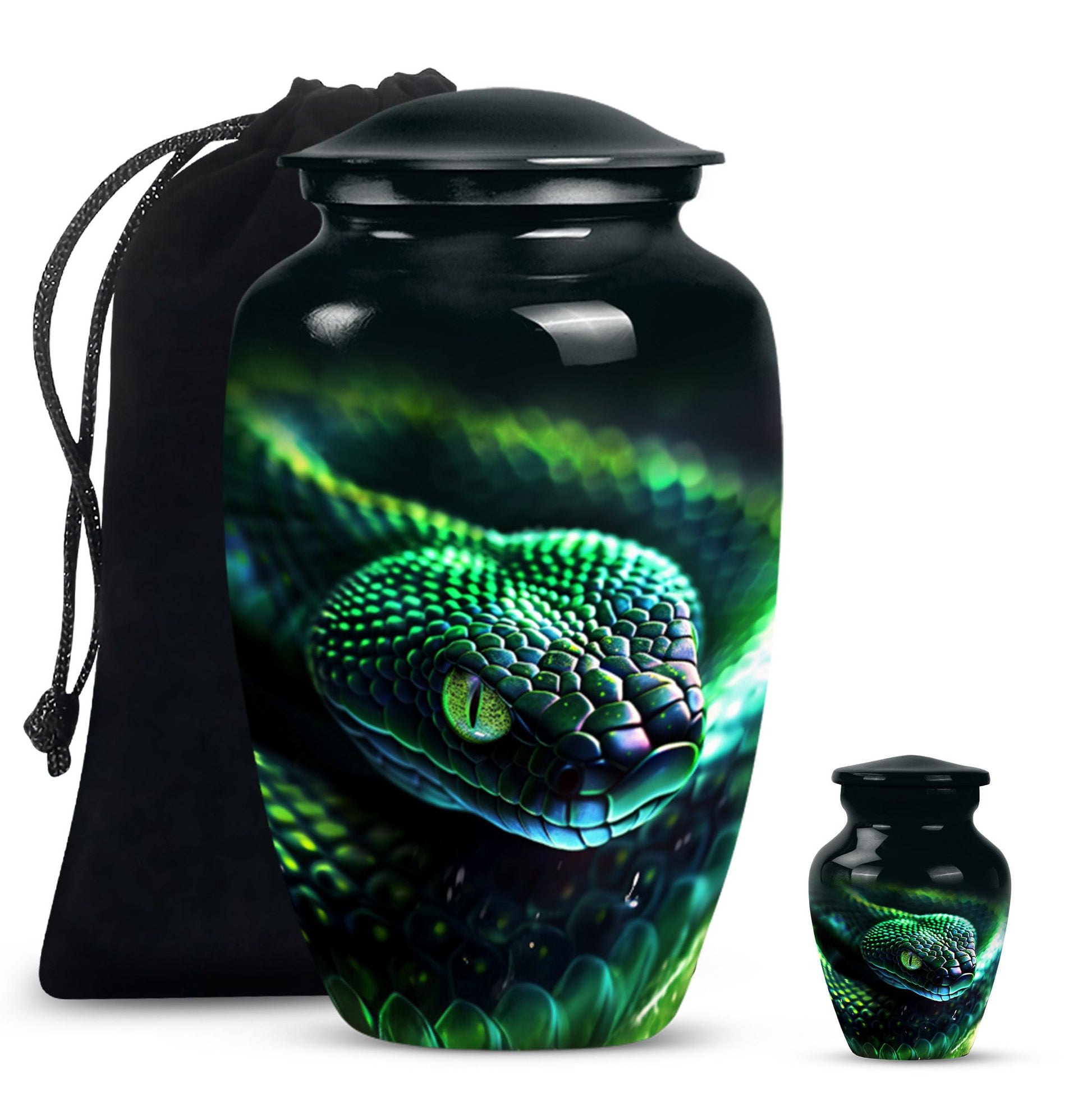 Honor your loved ones with dignity using our beautifully constructed snake urn, a distinctive choice among burial medium size urns. Crafted from high-quality aluminium, this large urn exudes an air of abstract-themed elegance. Weighing 3.3 pounds and standing 10 inches tall, it's roomy with a capacity to hold 200 cubic inches of remains. Our snake urn bridges function and form, with an appealing aesthetic that offers comfort during the grieving process. Each urn comes with a velvet pouch, enhancing the safe containment and preservation of ashes. Add a touch of personal significance with our offered customization - engrave the names of your dear ones on the urn. This exquisite resting place is perfect not just for men but can also serve as cremation urns for women. Uniquely artistic, it equally complements a ground burial or indoor memorial display. Buy this snake urn and add a beautiful touch to your memorial ceremony, while ensuring your departed loved one rests in peace and style.