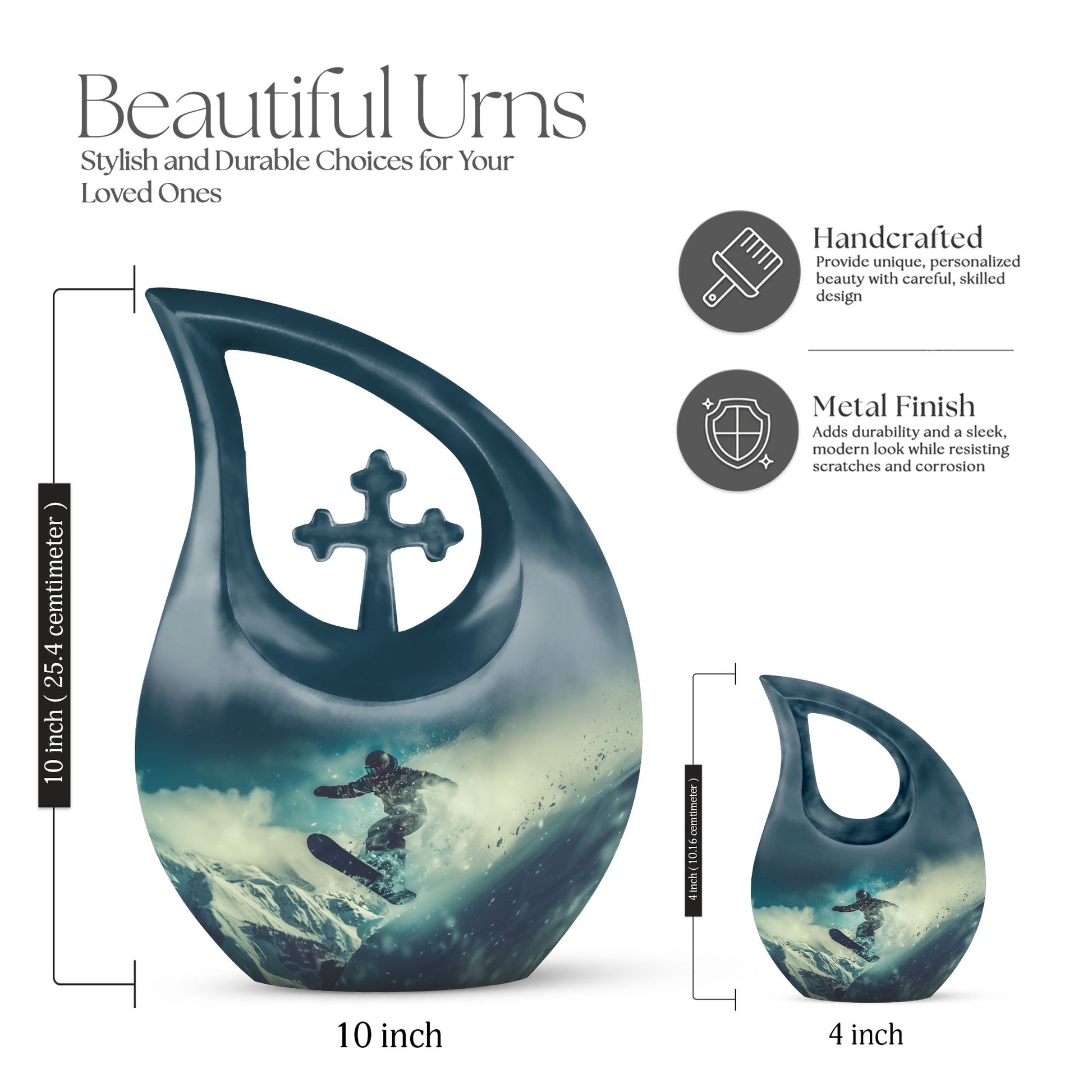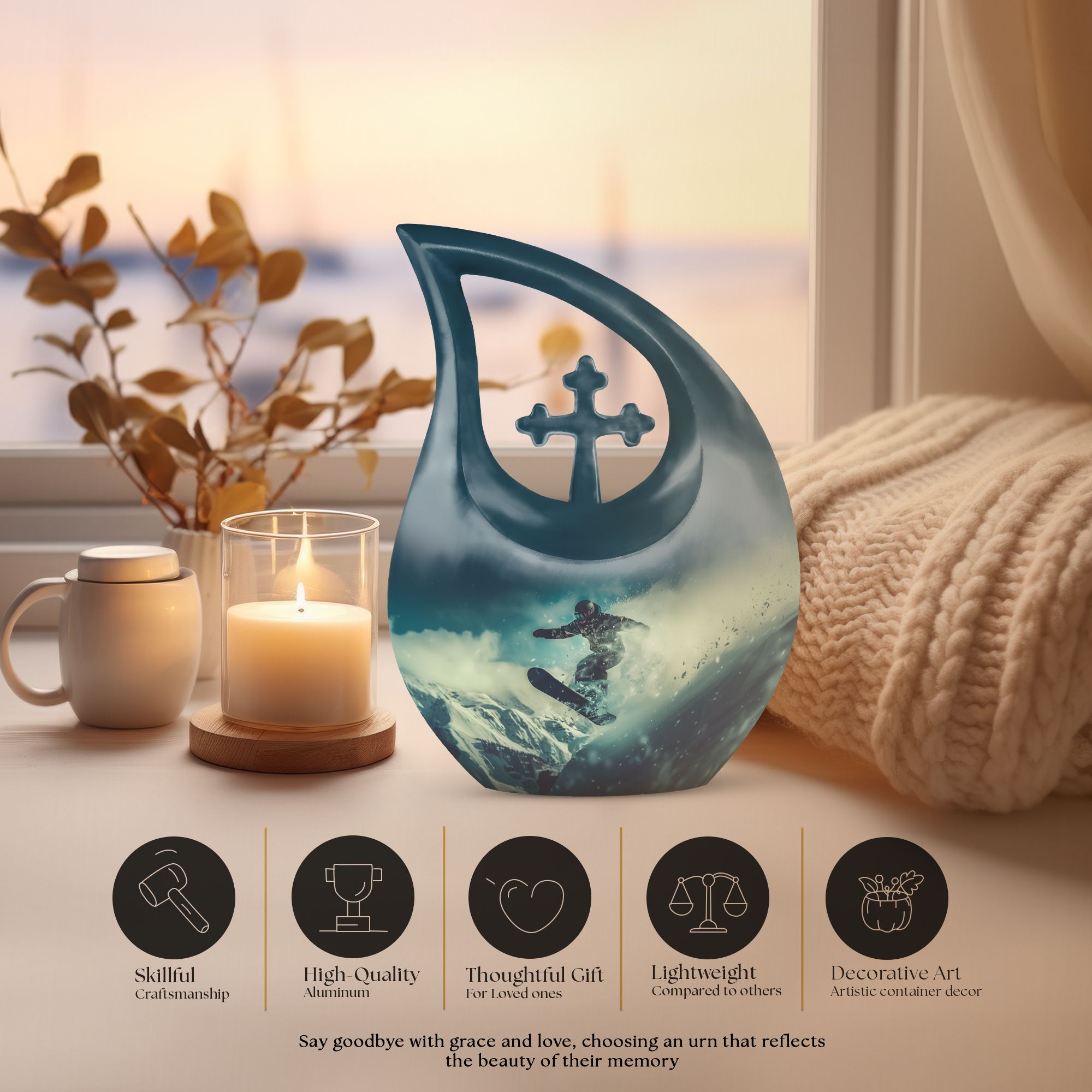 Made from durable aluminum, this full-size 10 inch urn features a serene snowboarding scene, symbolizing courage, exhilaration, and the beauty of a life well-lived. Its secure screw-top lid ensures lasting protection, making it ideal whether you are searching for cremation urns for ashes for women, cremation keepsakes for men, adult urns for women, or an urn for women & men that beautifully complements the lifestyle and personality of your loved one. Companion pieces such as a mini urn for ashes for women or keepsakes for women can be paired for shared remembrance.