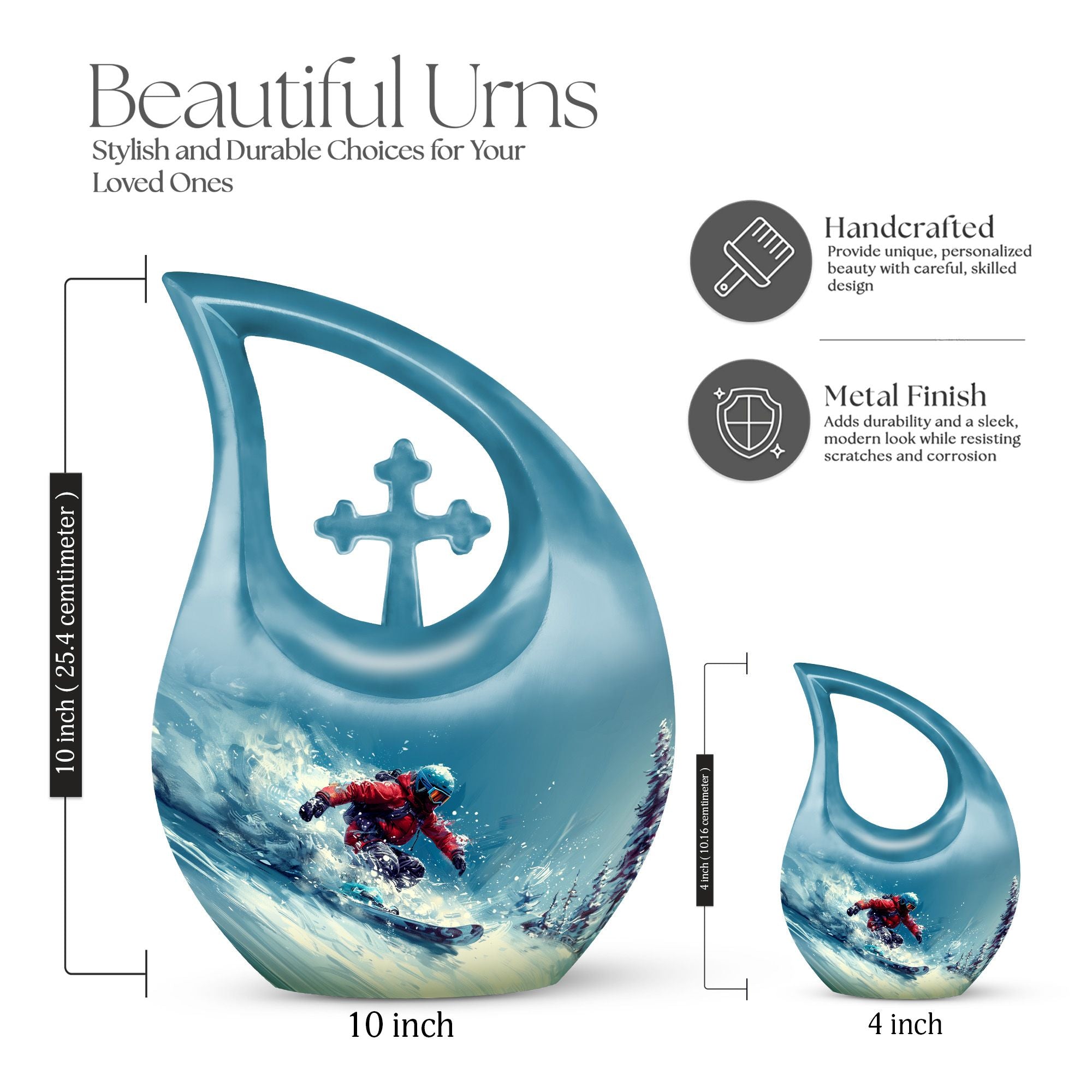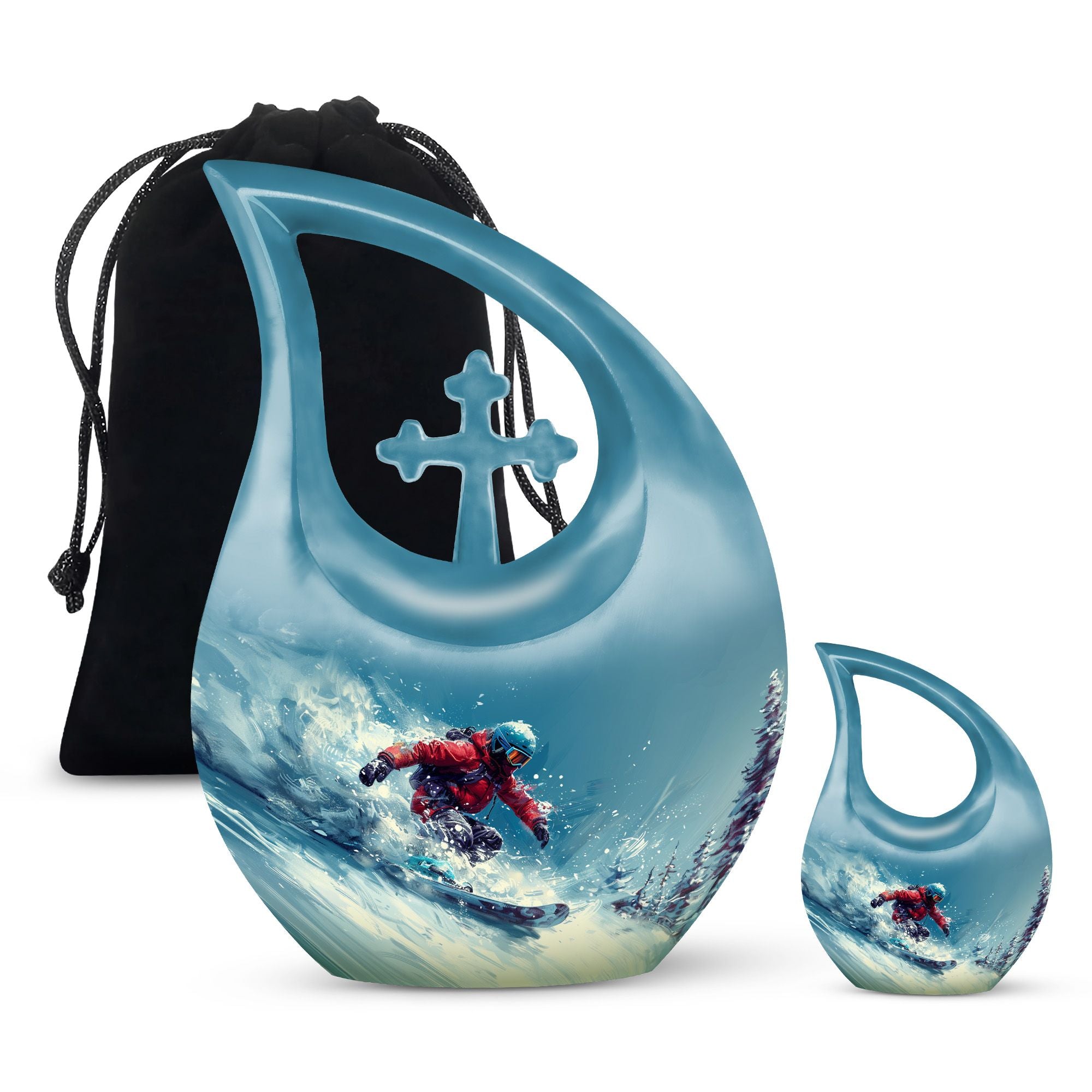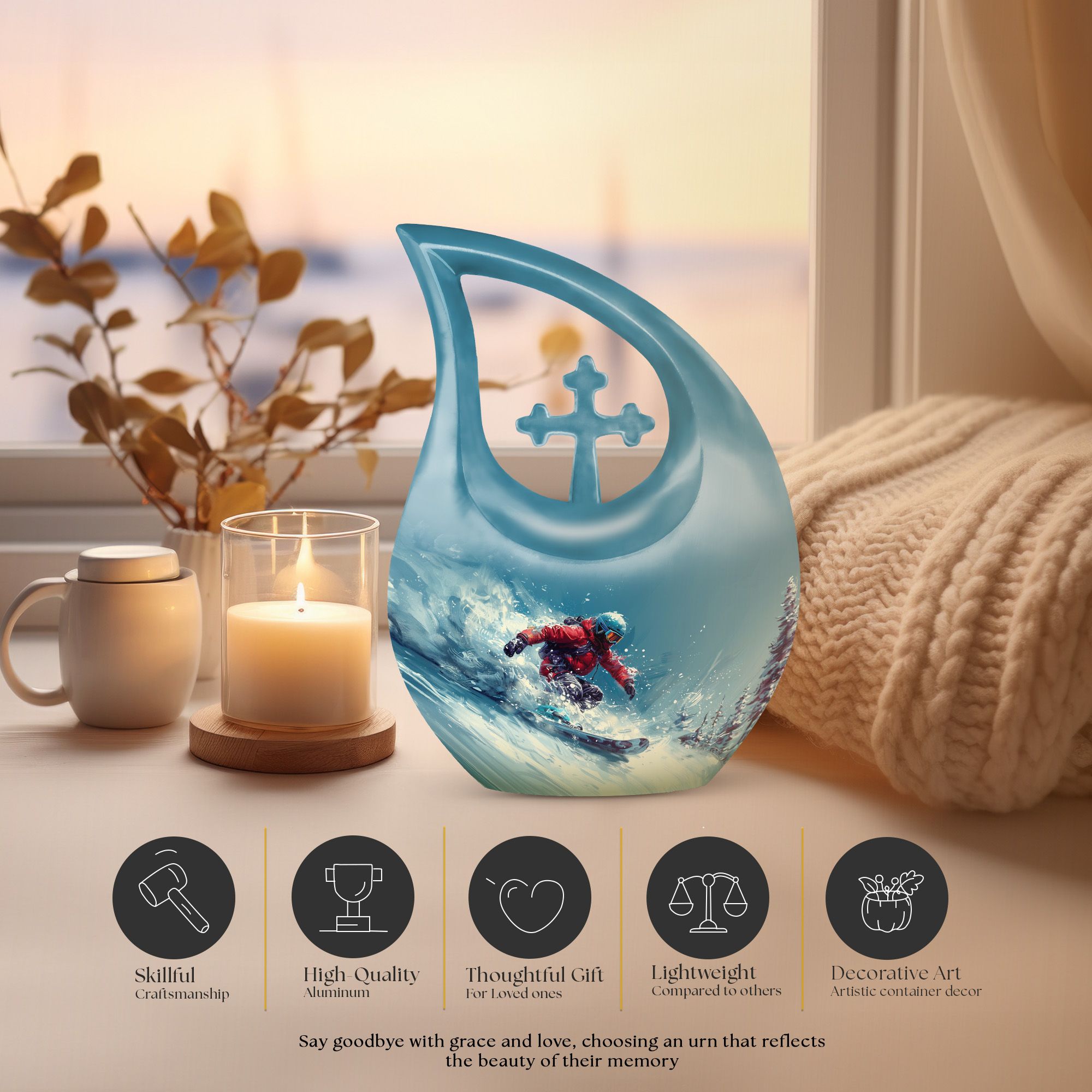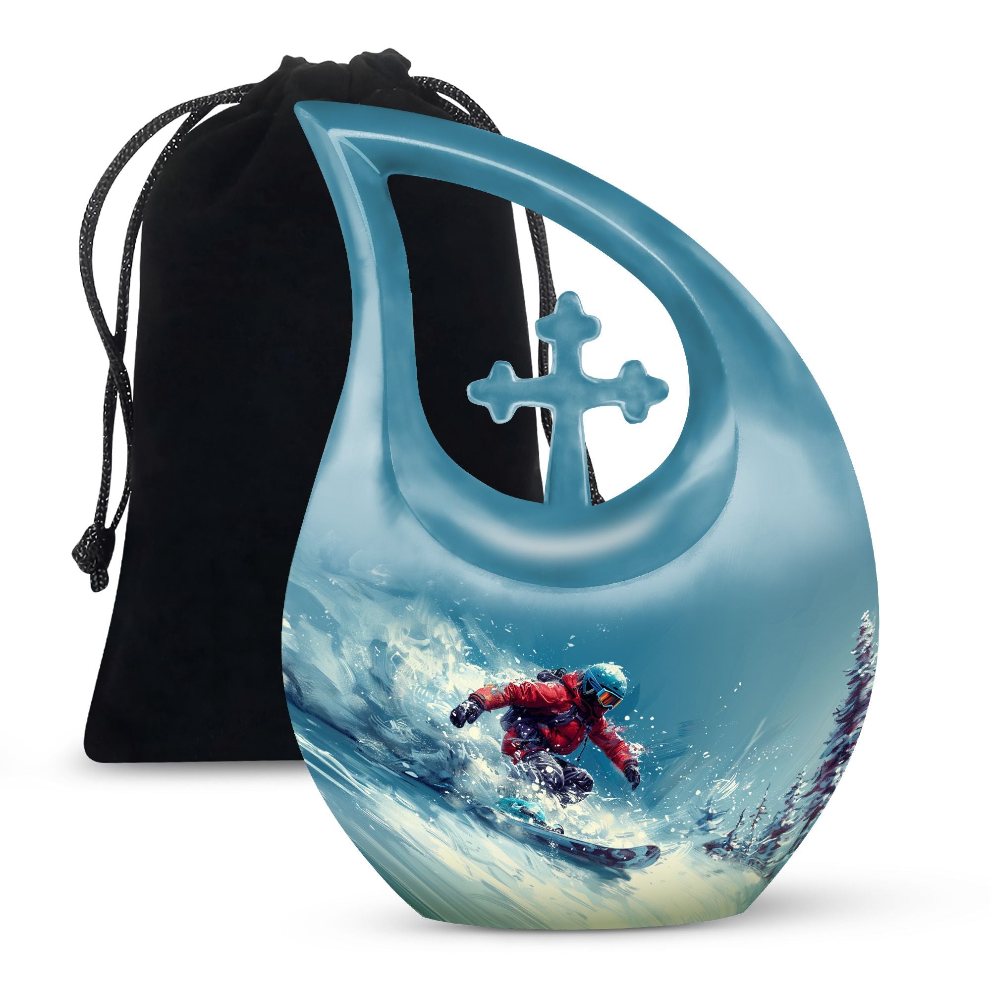 Honor the memory of your loved ones with our 'Snowboarding The Alpine Urn,' an exquisite selection among personalized urns for adults. Handcrafted from aluminium, this 10-inch memorial urn embodies a unique blend of elegance and durability. It features a symbolic cross-drop theme that signifies everlasting love and respect. Our urn is large enough to hold up to 200 cubic inches of ashes and weighs around 3.3 pounds. Each urn comes with a velvet pouch to securely hold the ashes, ensuring they remain untouched. Besides, you have the option to personalize this urn by engraving names on it – an enduring testament of your undying connection. This urn is an elegant alternative to expensive variants and is also compatible as a companion urn for 2 adults. If cremation boxes or cremation urns specifically for mom are what you are seeking, our alpine urn is an excellent option. A tribute to the departed soul, it reflects the joy of snowboarding the alpine and the thrill cherished in their heart.