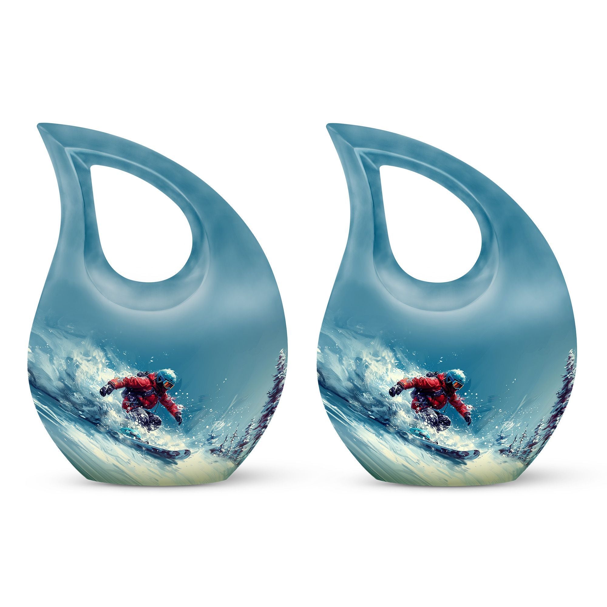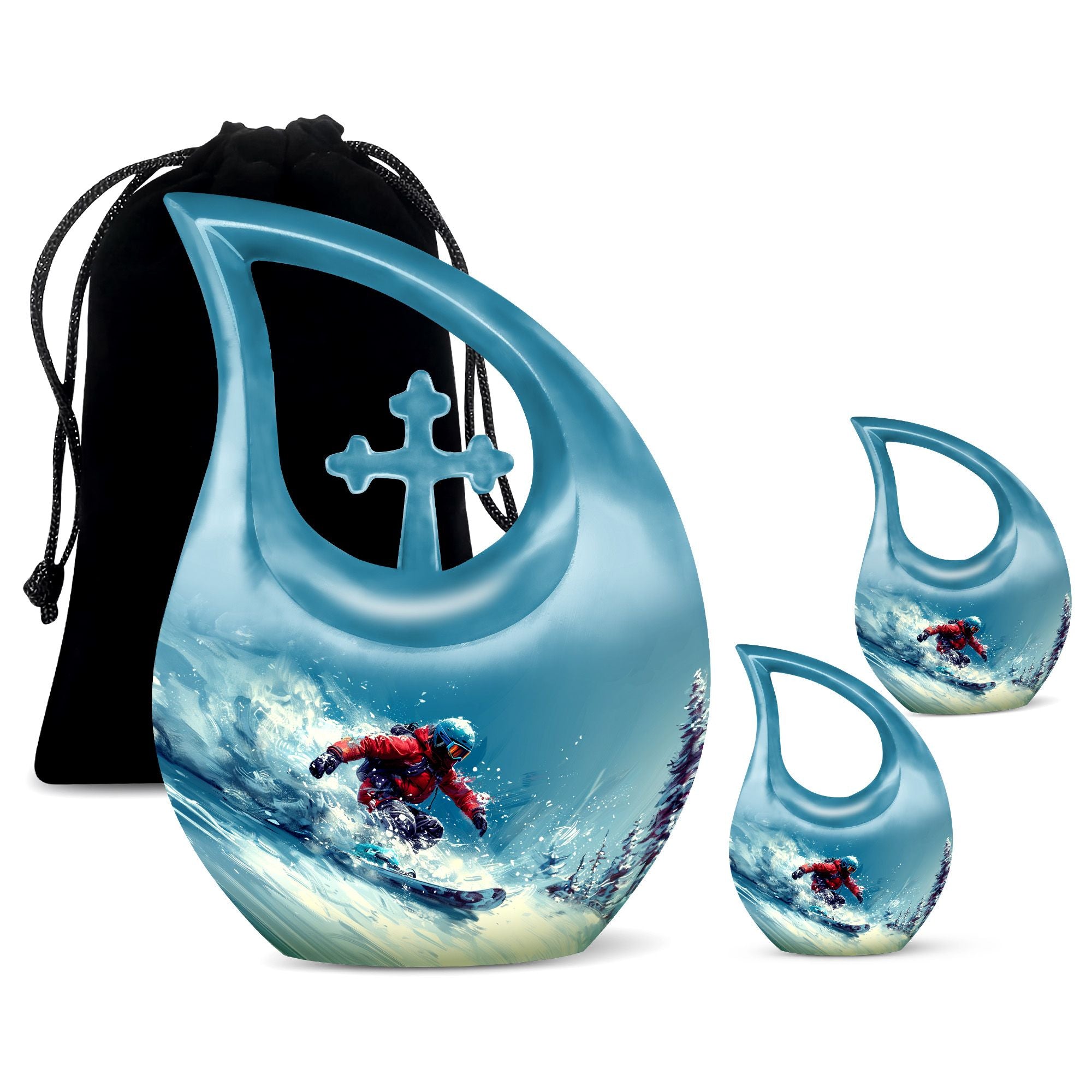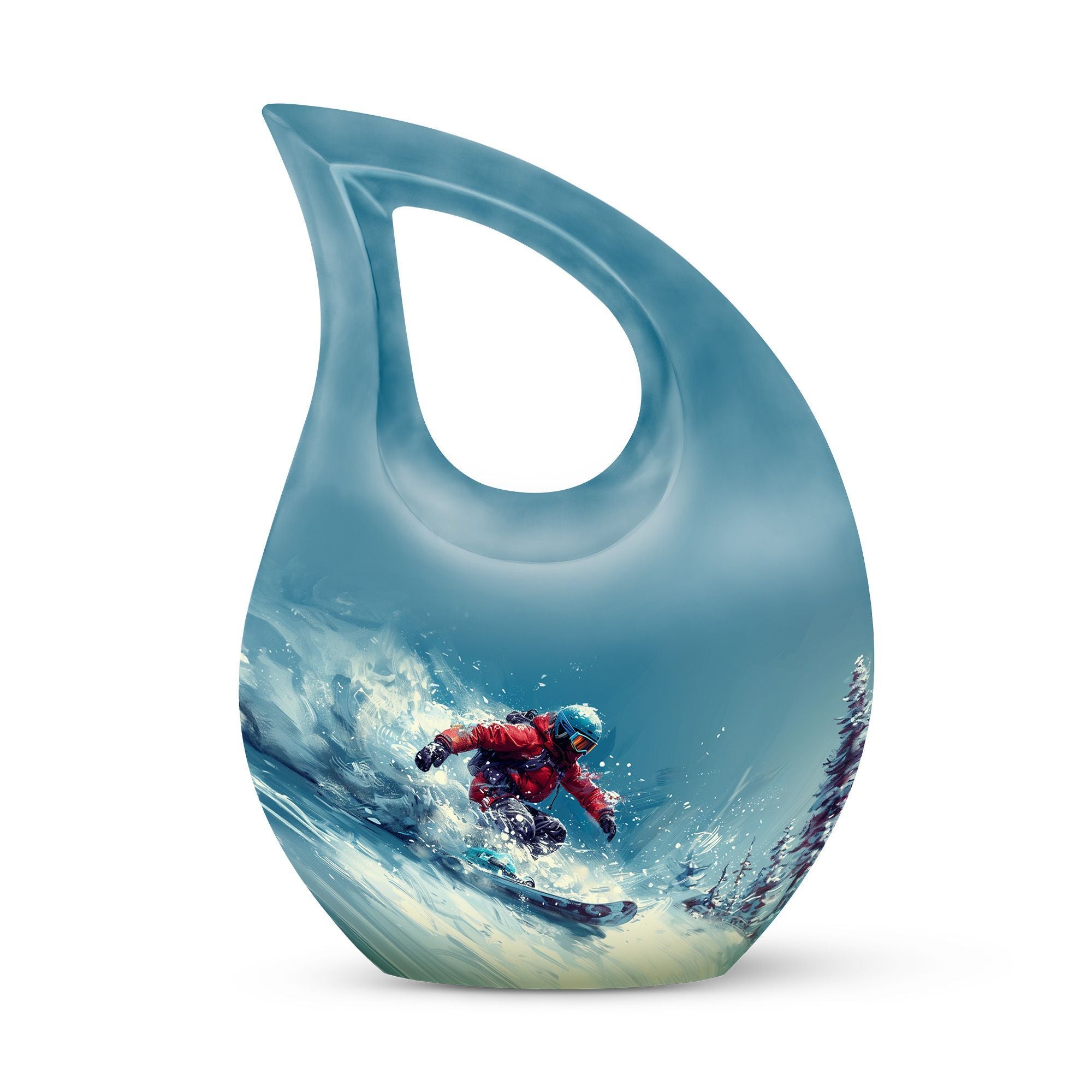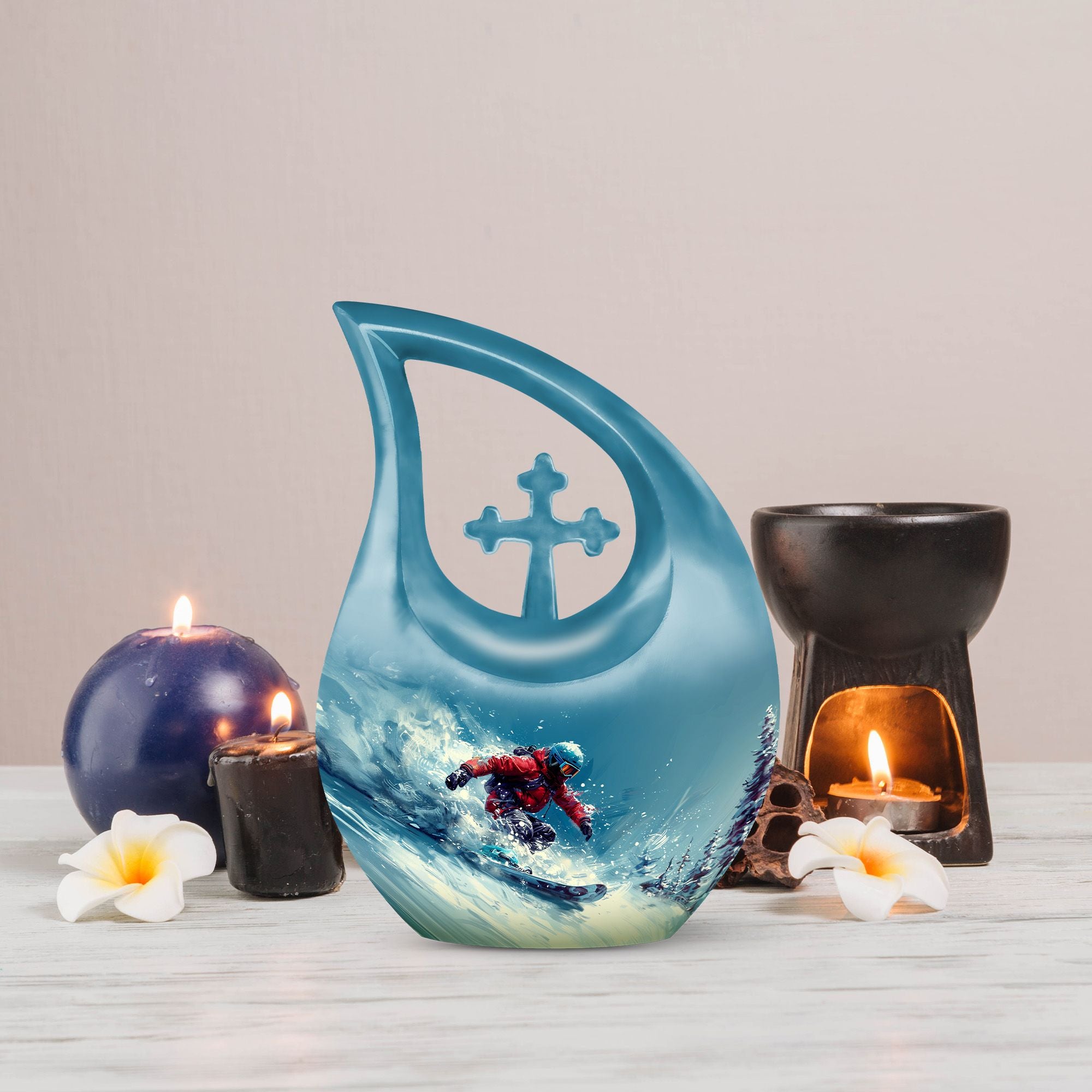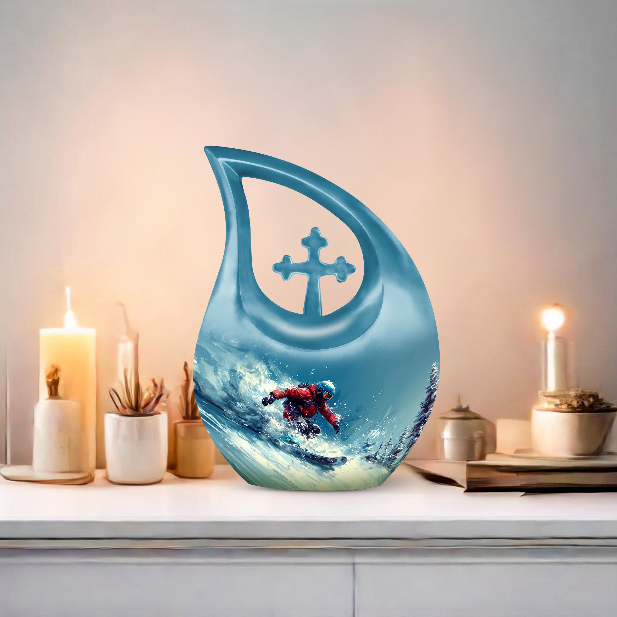Honor the memory of your loved ones with our 'Snowboarding The Alpine Urn,' an exquisite selection among personalized urns for adults. Handcrafted from aluminium, this 10-inch memorial urn embodies a unique blend of elegance and durability. It features a symbolic cross-drop theme that signifies everlasting love and respect. Our urn is large enough to hold up to 200 cubic inches of ashes and weighs around 3.3 pounds. Each urn comes with a velvet pouch to securely hold the ashes, ensuring they remain untouched. Besides, you have the option to personalize this urn by engraving names on it – an enduring testament of your undying connection. This urn is an elegant alternative to expensive variants and is also compatible as a companion urn for 2 adults. If cremation boxes or cremation urns specifically for mom are what you are seeking, our alpine urn is an excellent option. A tribute to the departed soul, it reflects the joy of snowboarding the alpine and the thrill cherished in their heart.