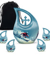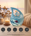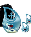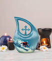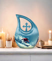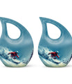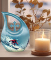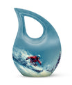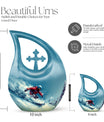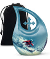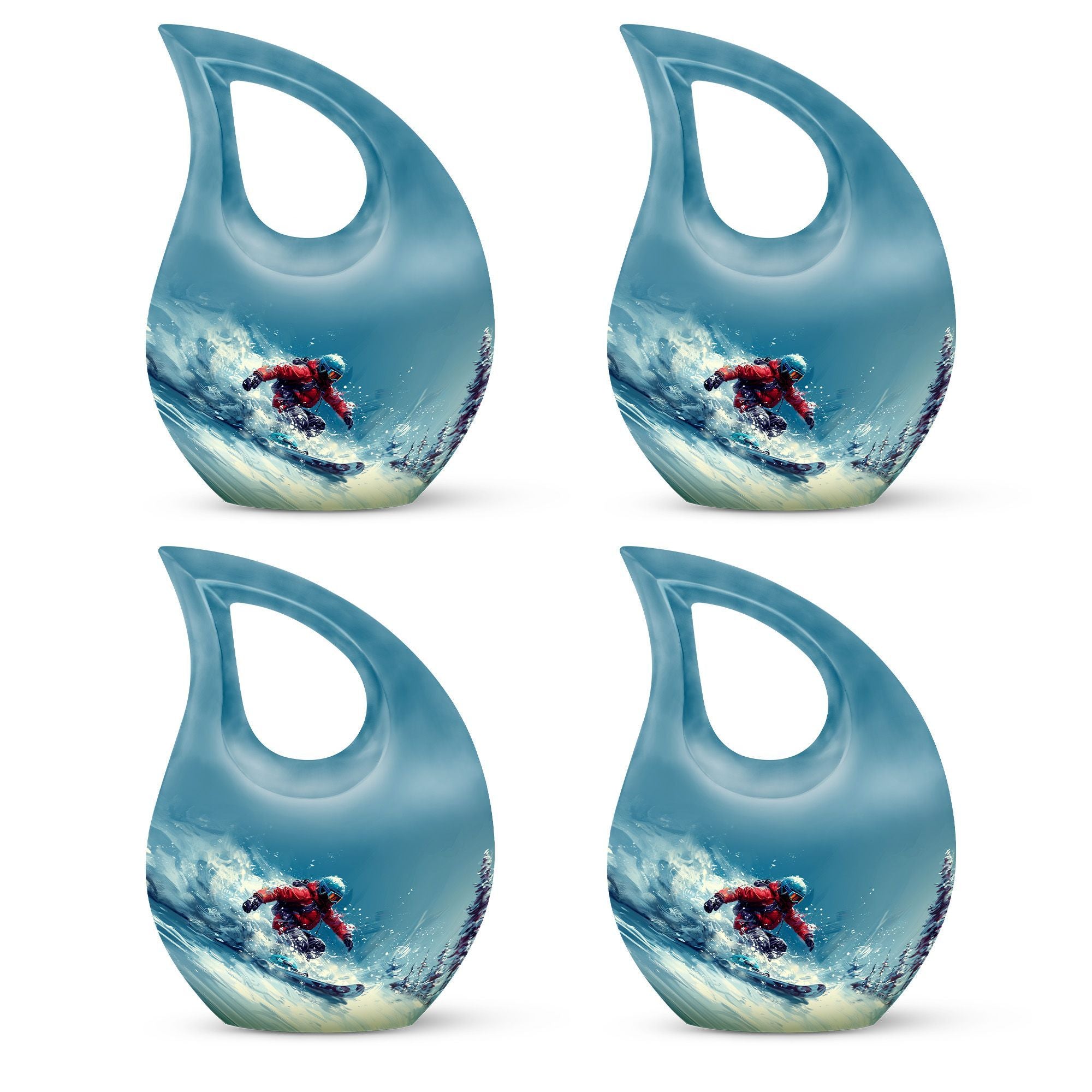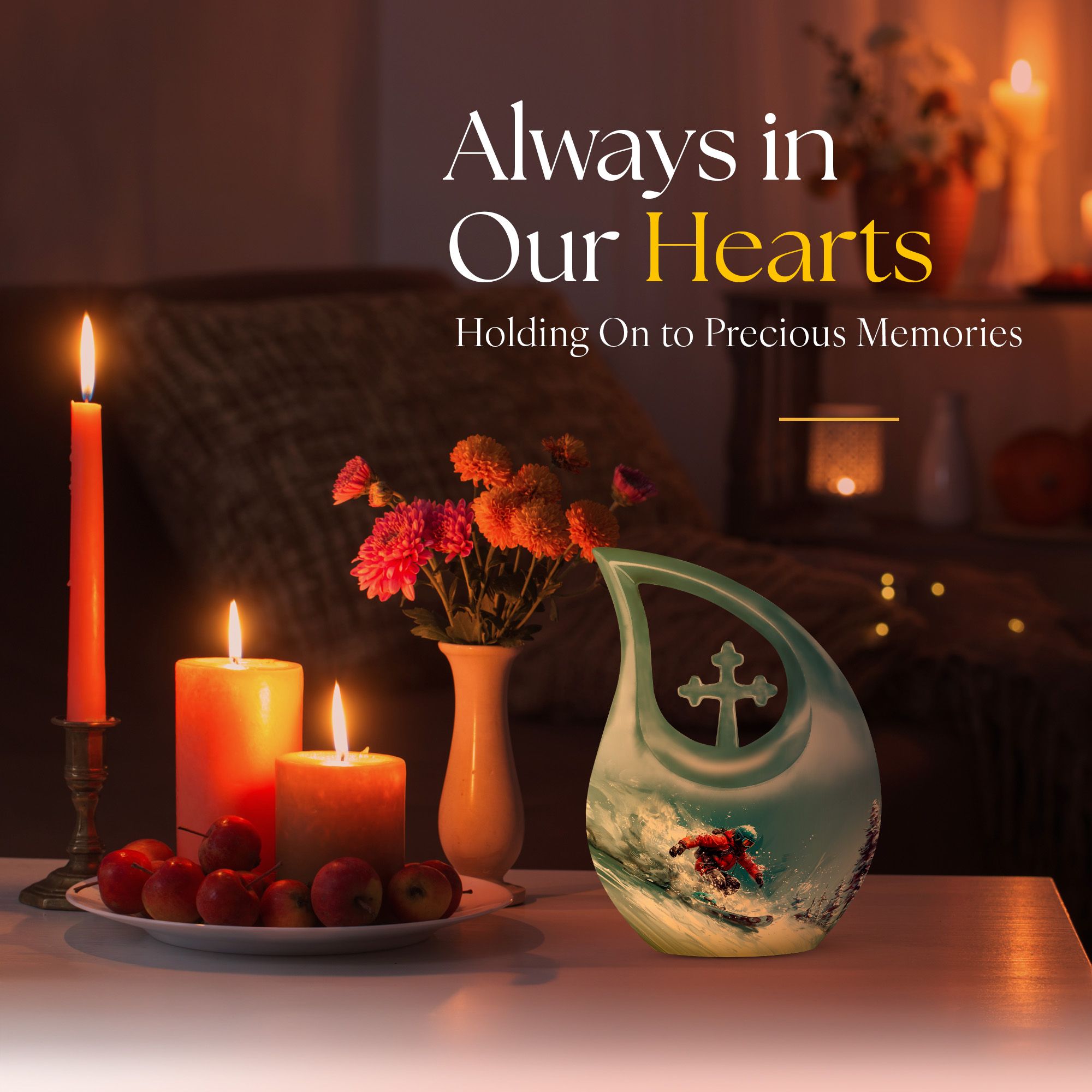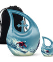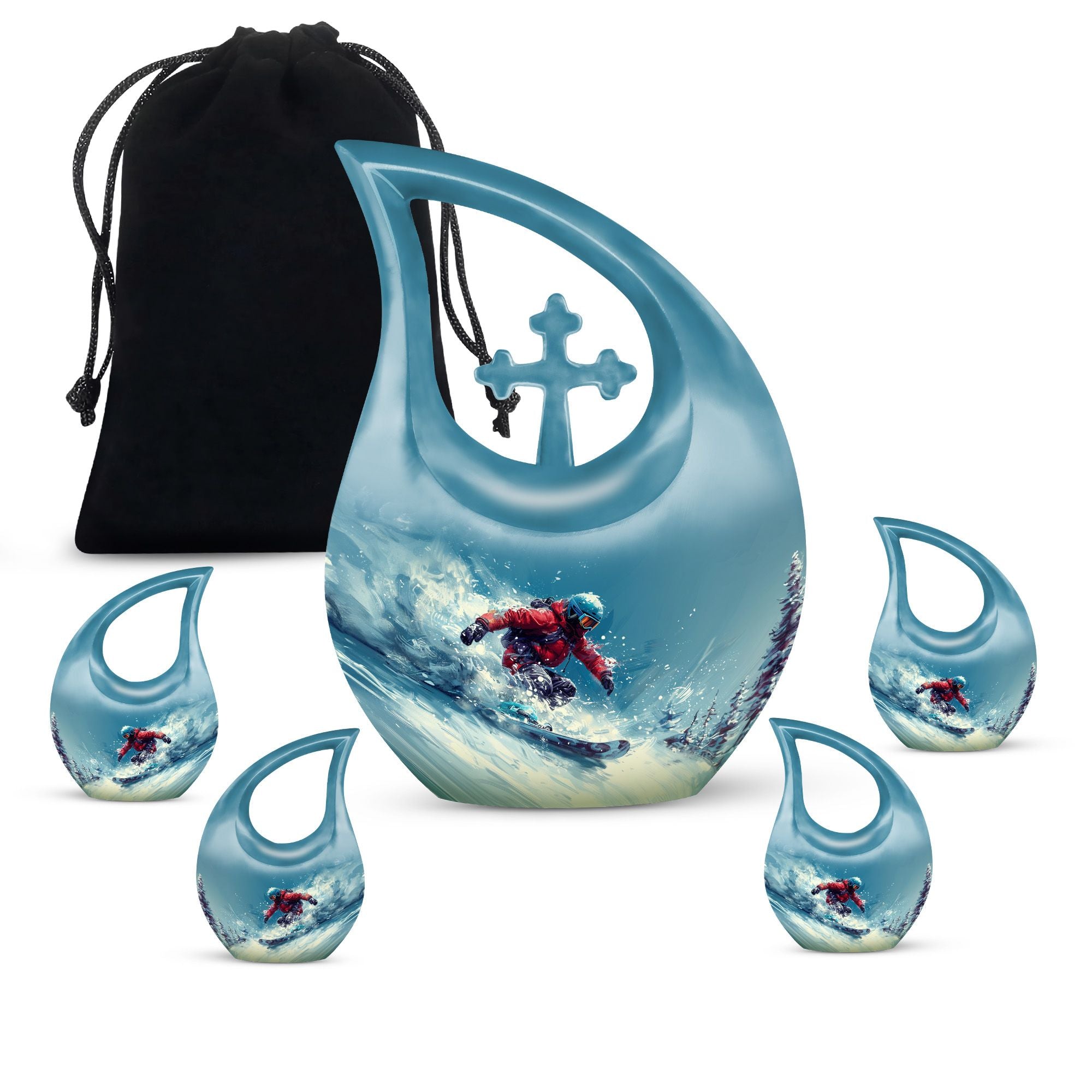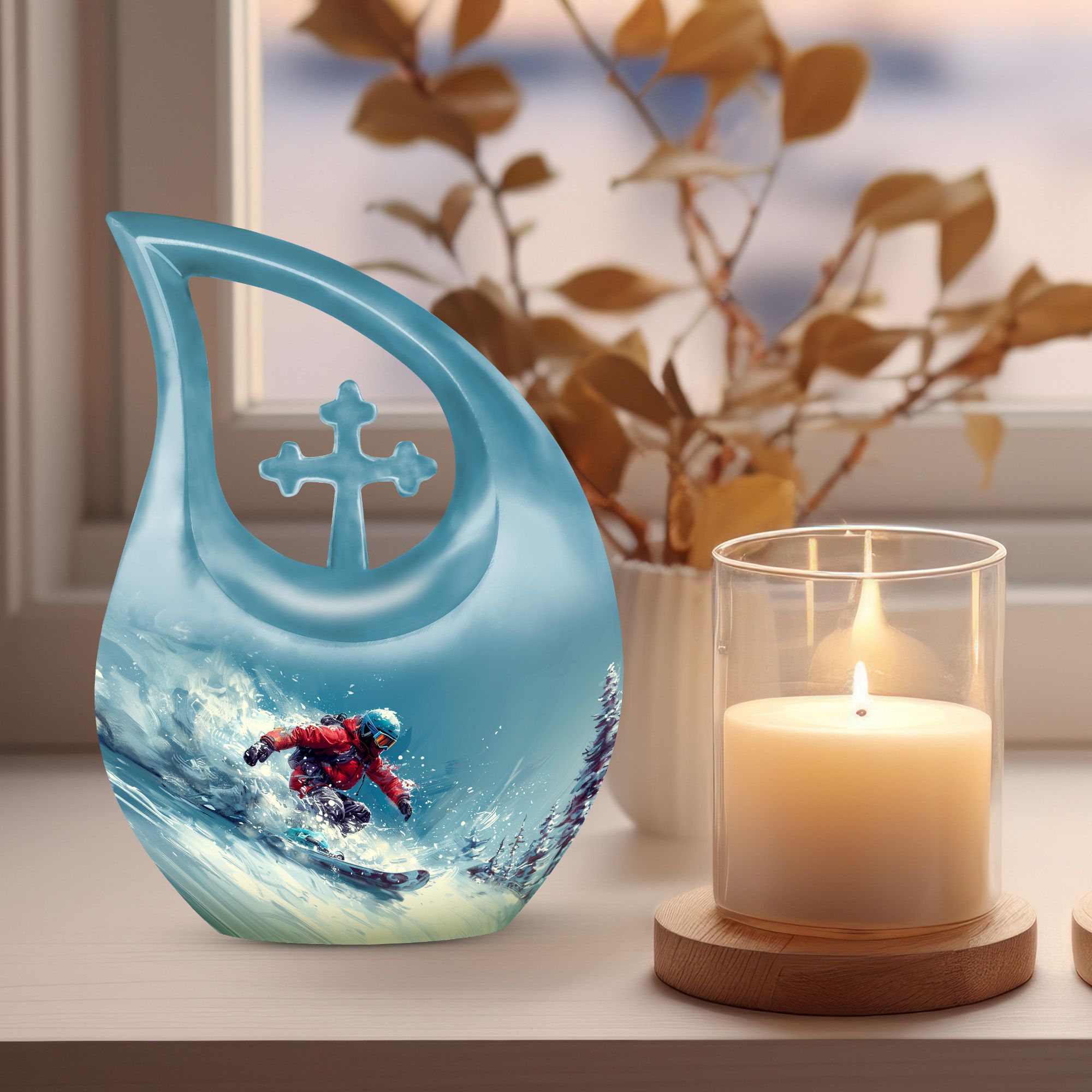 Honor the memory of your loved ones with our 'Snowboarding The Alpine Urn,' an exquisite selection among personalized urns for adults. Handcrafted from aluminium, this 10-inch memorial urn embodies a unique blend of elegance and durability. It features a symbolic cross-drop theme that signifies everlasting love and respect. Our urn is large enough to hold up to 200 cubic inches of ashes and weighs around 3.3 pounds. Each urn comes with a velvet pouch to securely hold the ashes, ensuring they remain untouched. Besides, you have the option to personalize this urn by engraving names on it – an enduring testament of your undying connection. This urn is an elegant alternative to expensive variants and is also compatible as a companion urn for 2 adults. If cremation boxes or cremation urns specifically for mom are what you are seeking, our alpine urn is an excellent option. A tribute to the departed soul, it reflects the joy of snowboarding the alpine and the thrill cherished in their heart.
