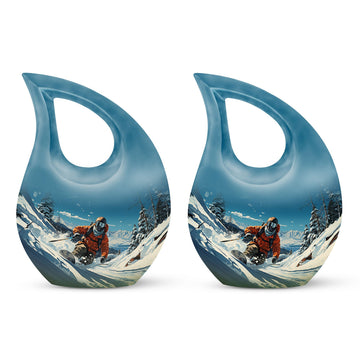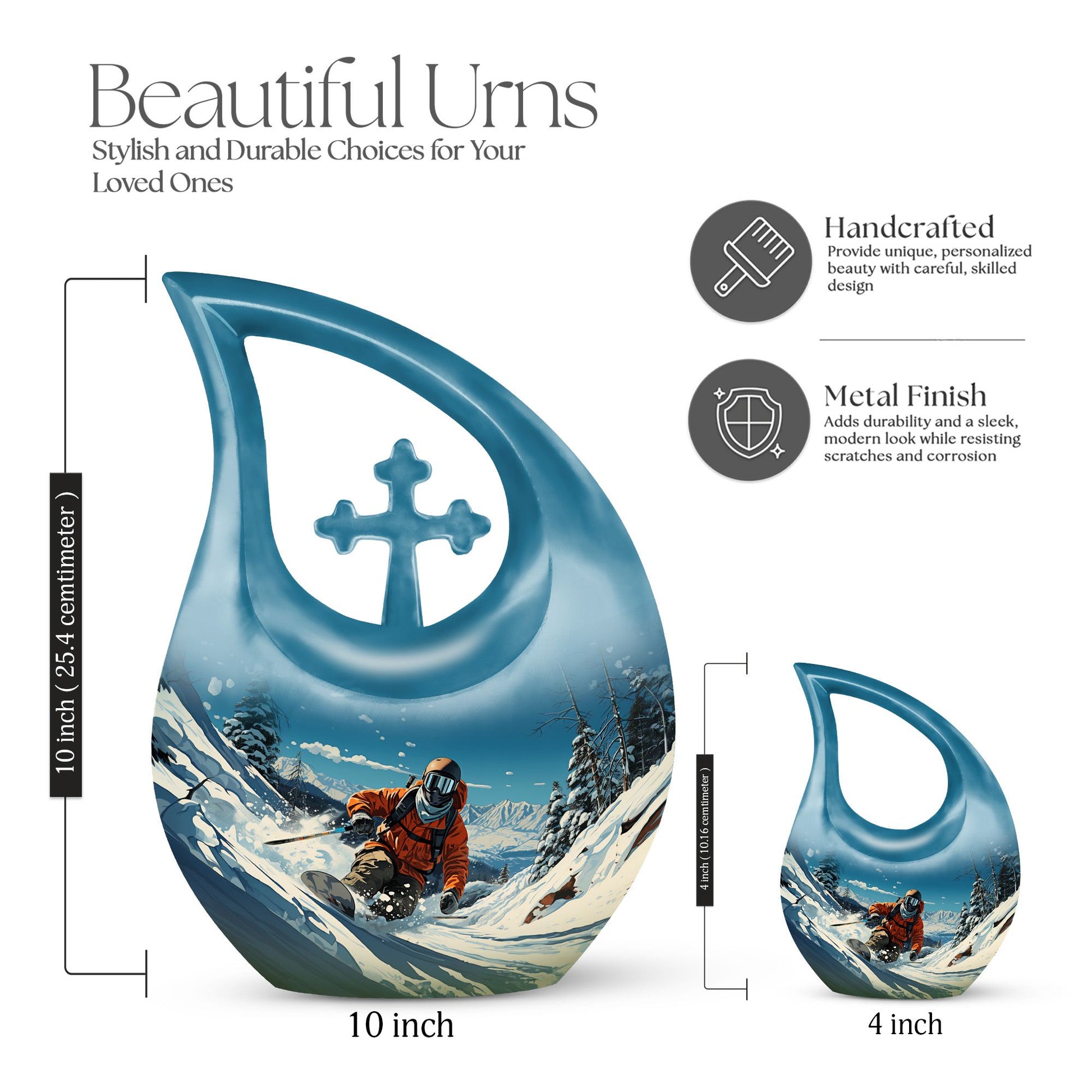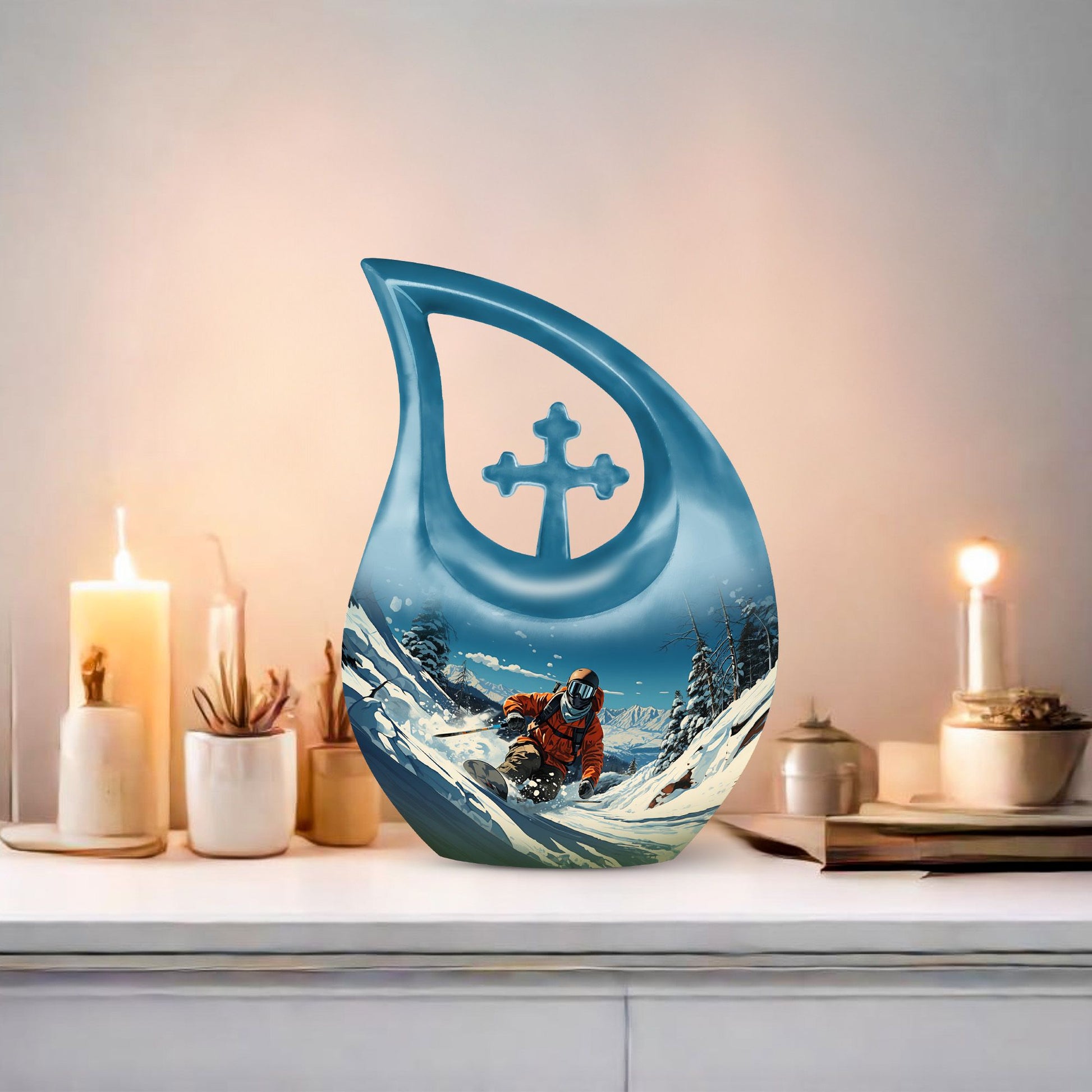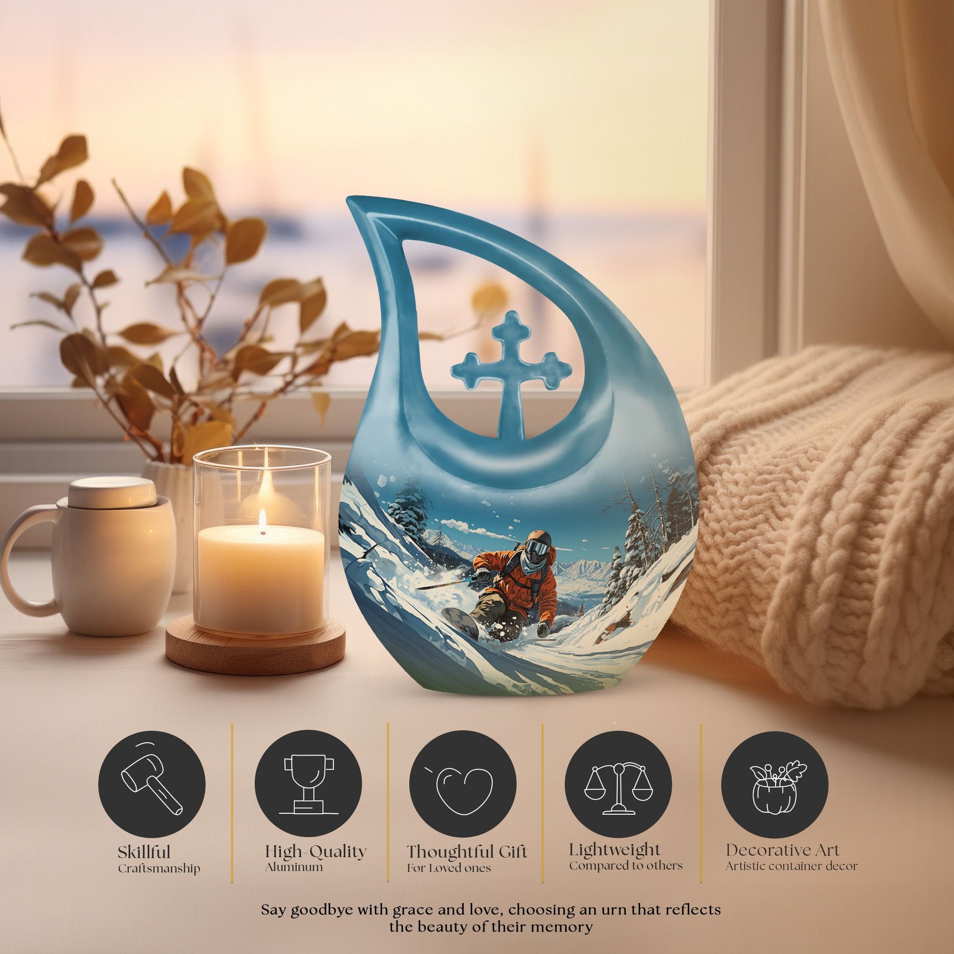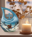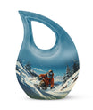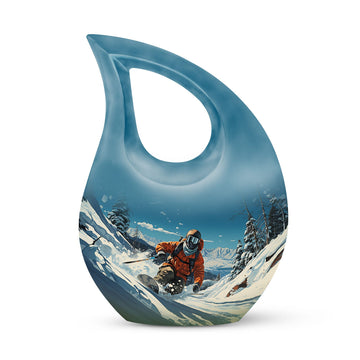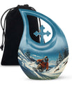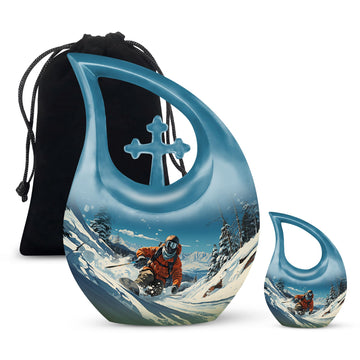 Capture the spirit of your loved one's love for the winter season with our 'Snowboarding The Winter Urn'. This 10-inch tall urn is meticulously crafted from durable aluminium, making it a long-lasting tribute to your dearly departed. It's large enough to store up to 200 cubic inches of cremation ashes and weighs a substantial 3.3 pounds, reinforcing the urn's quality. The urn comes complete with a velvet pouch for respectful containment of the ashes. Adding a unique personal touch, this cremation urn offers customization options, allowing you to engrave names and personalize your memorial. This exceptional urn doesn't only serve as a memorial but also as an homage to your loved one's passion for winter and snowboarding. Ideal for those searching 'memorial urns' or 'urns for cremation ashes', this urn also fits perfect for consumers interested in 'ashes into keepsakes' or unique urns for husband.' Let this winter-themed urn provide a comforting presence as you remember and honor your loved one.