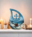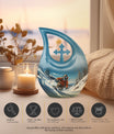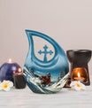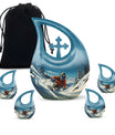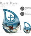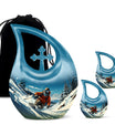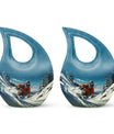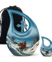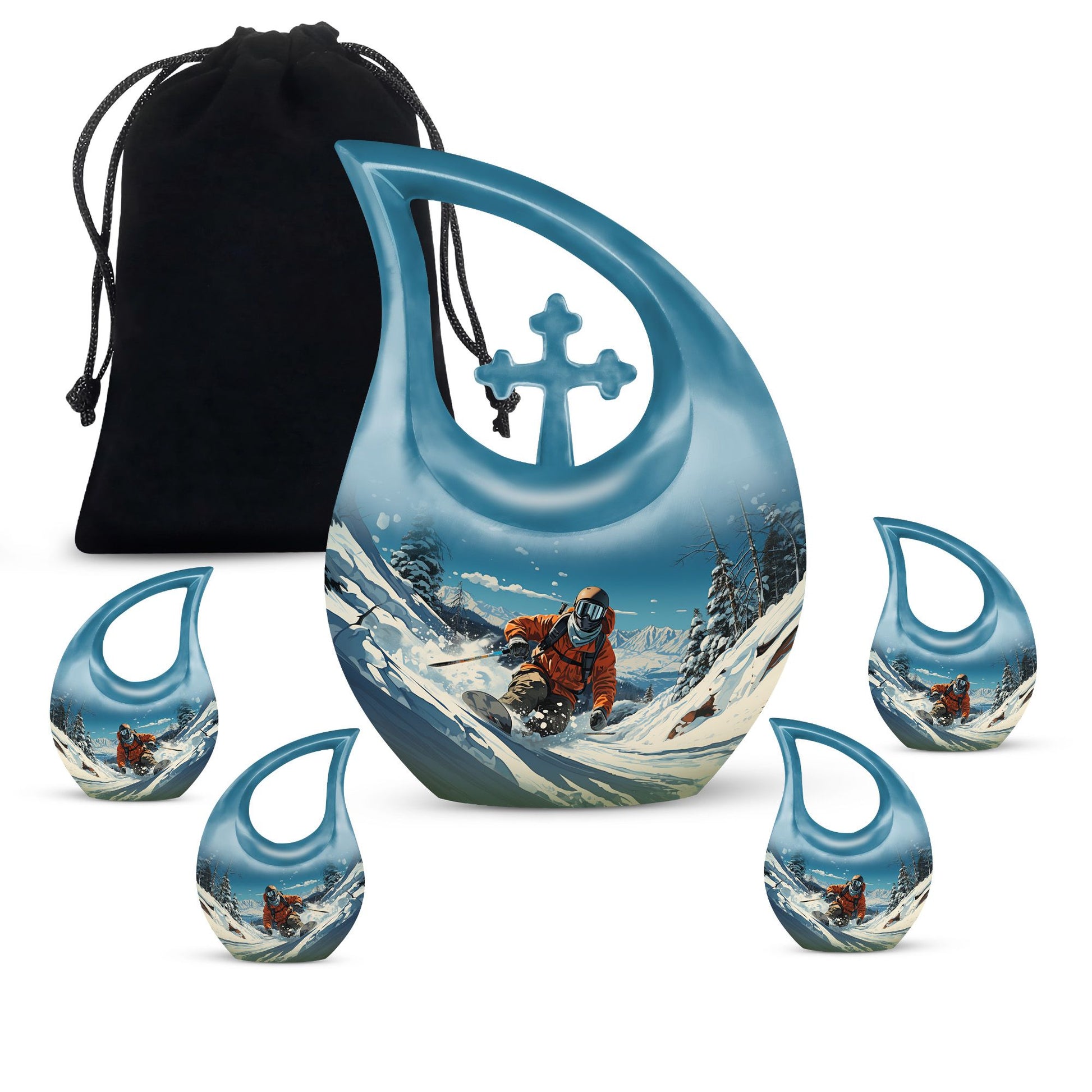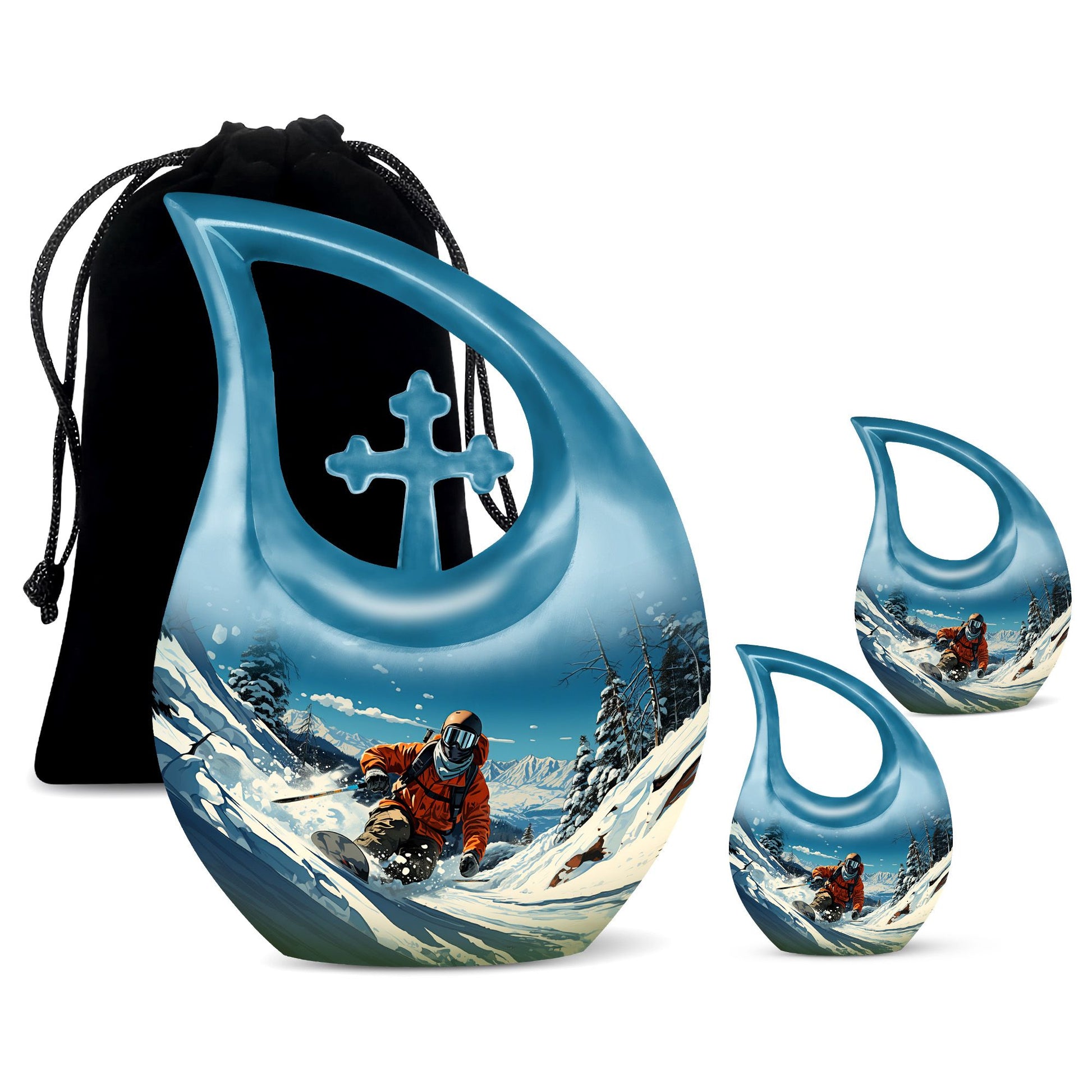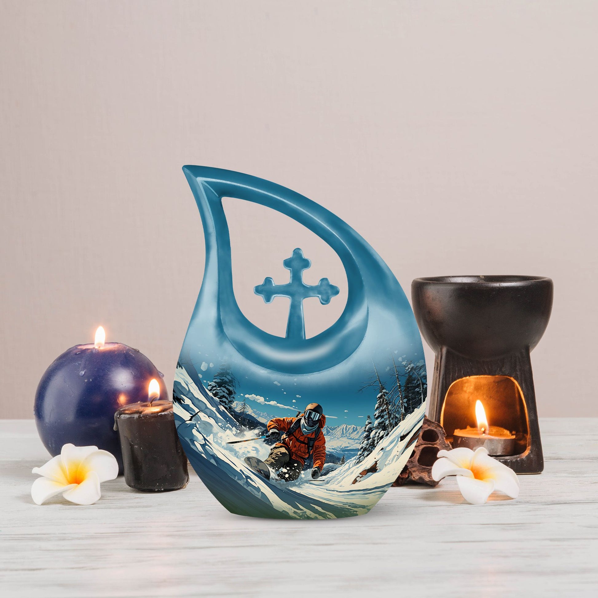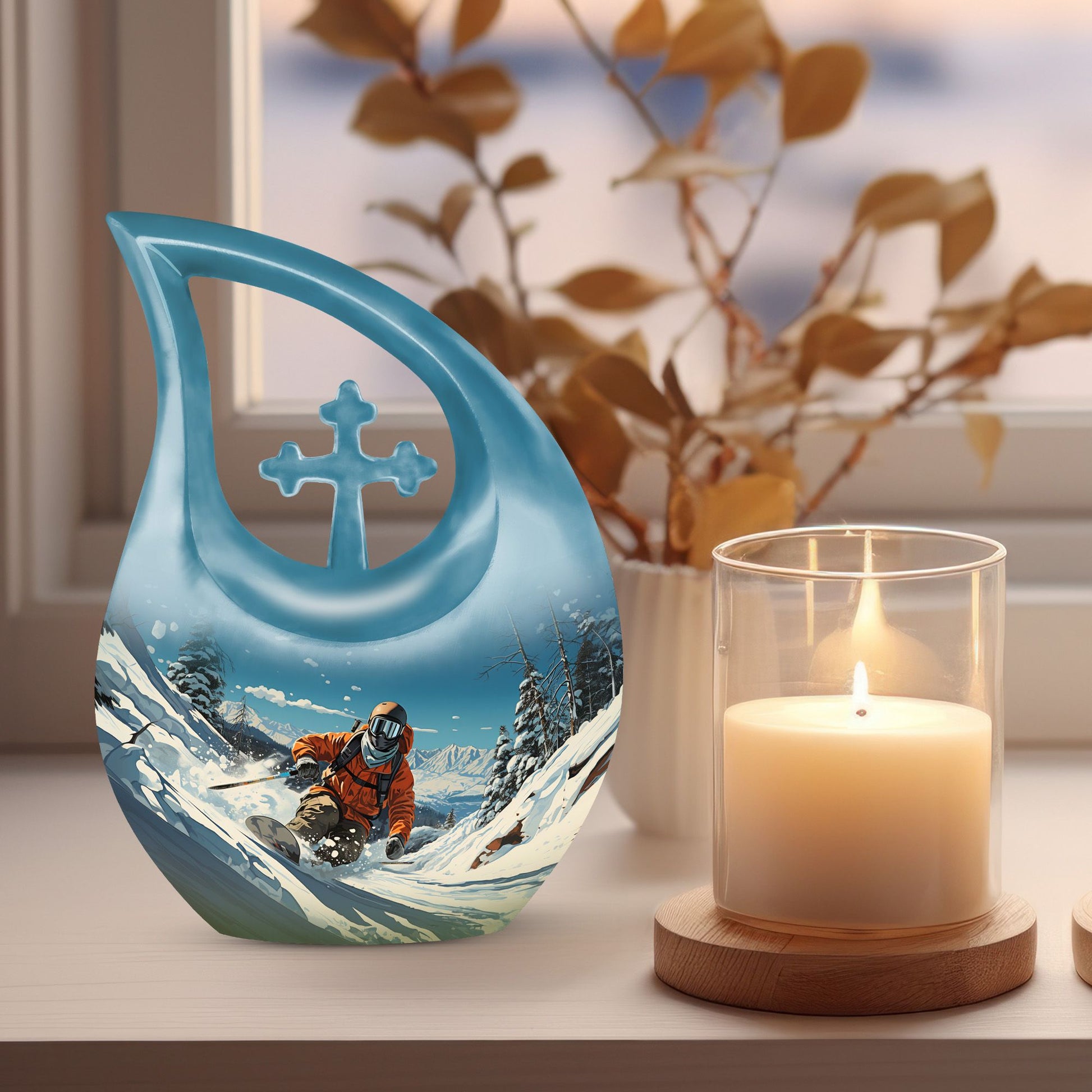 Capture the spirit of your loved one's love for the winter season with our 'Snowboarding The Winter Urn'. This 10-inch tall urn is meticulously crafted from durable aluminium, making it a long-lasting tribute to your dearly departed. It's large enough to store up to 200 cubic inches of cremation ashes and weighs a substantial 3.3 pounds, reinforcing the urn's quality. The urn comes complete with a velvet pouch for respectful containment of the ashes. Adding a unique personal touch, this cremation urn offers customization options, allowing you to engrave names and personalize your memorial. This exceptional urn doesn't only serve as a memorial but also as an homage to your loved one's passion for winter and snowboarding. Ideal for those searching 'memorial urns' or 'urns for cremation ashes', this urn also fits perfect for consumers interested in 'ashes into keepsakes' or unique urns for husband.' Let this winter-themed urn provide a comforting presence as you remember and honor your loved one.